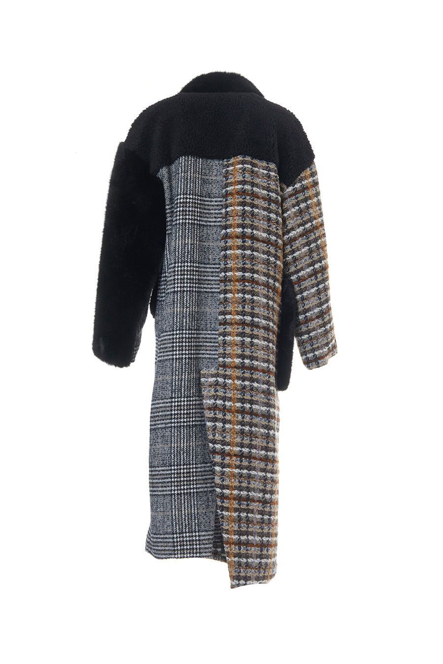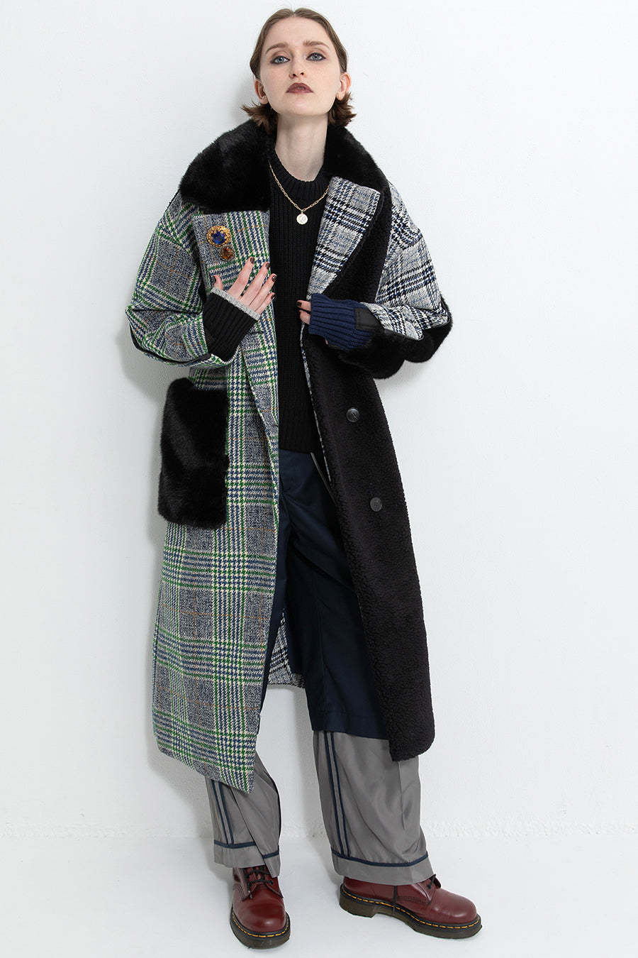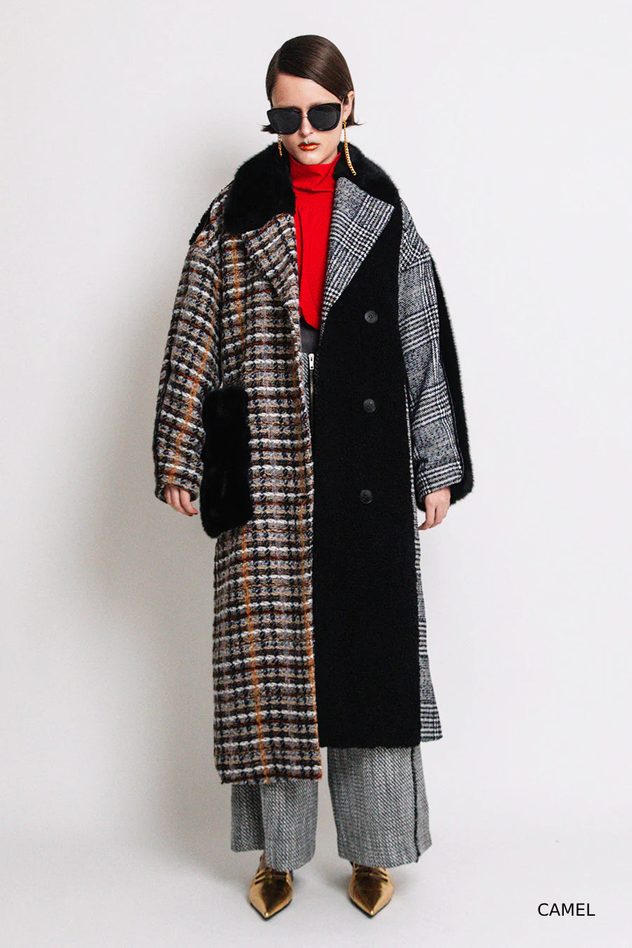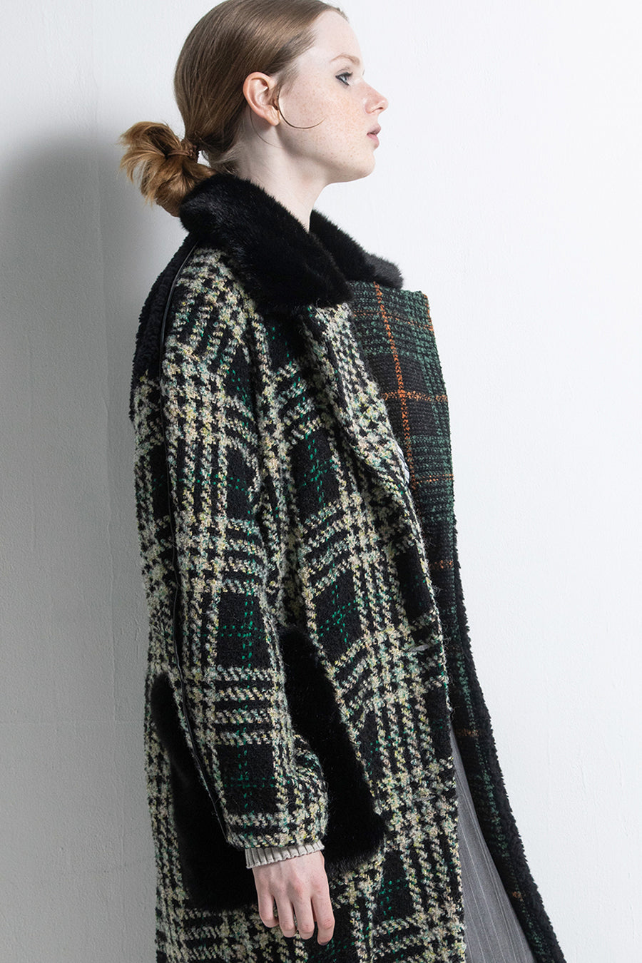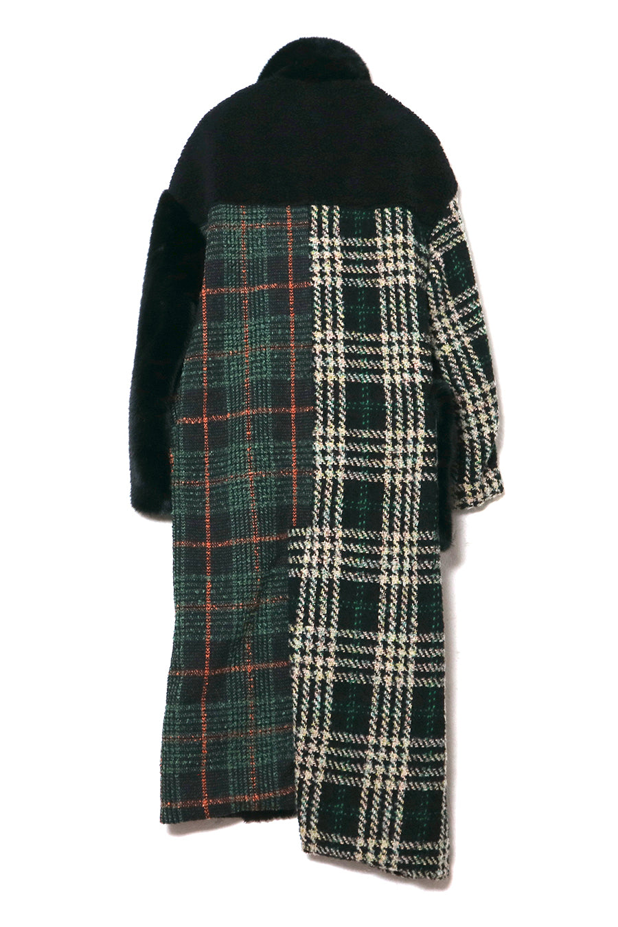 ツイードチェック、ヘリンボーンツイード、シャギー、ロービングなどと、異素材のエコファーやボアの4素材をコンビネーションしたロングコート。