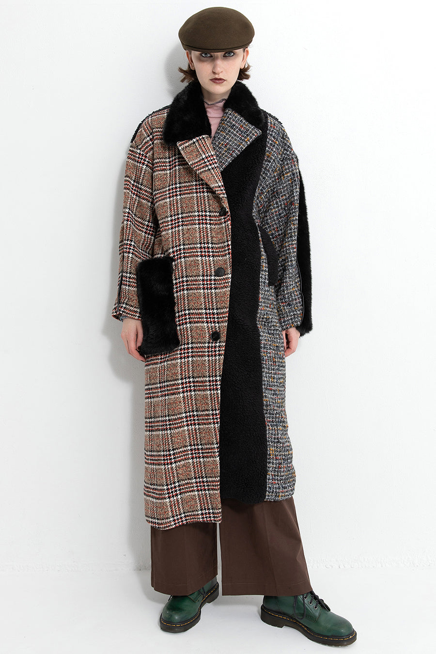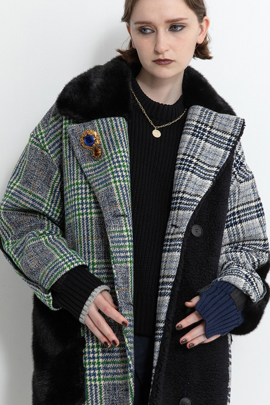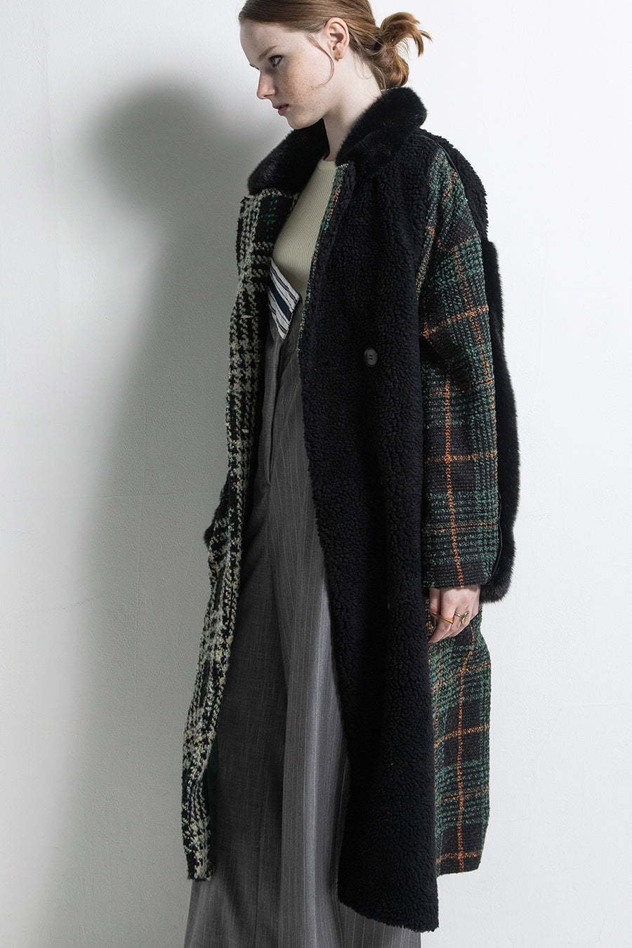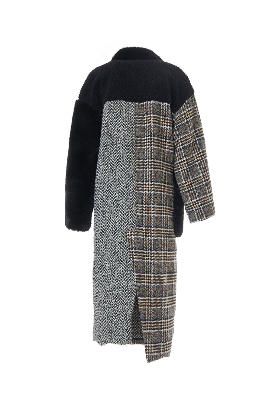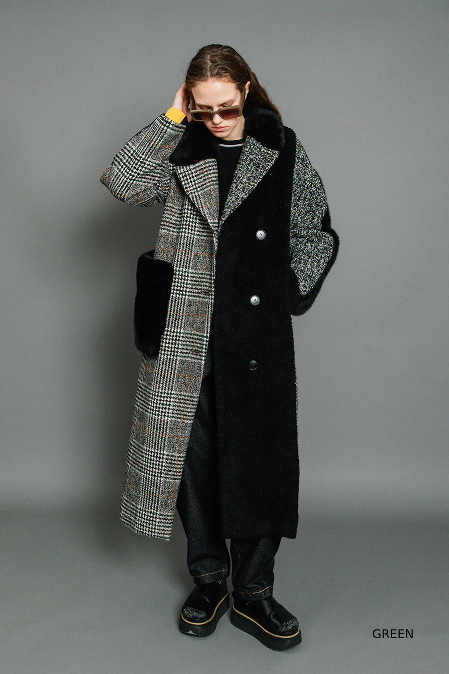 ツイードチェック、ヘリンボーンツイード、シャギー、ロービングなどと、異素材のエコファーやボアの4素材をコンビネーションしたロングコート。