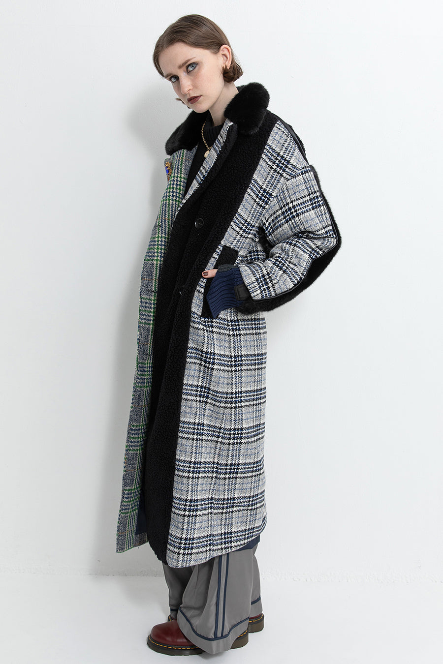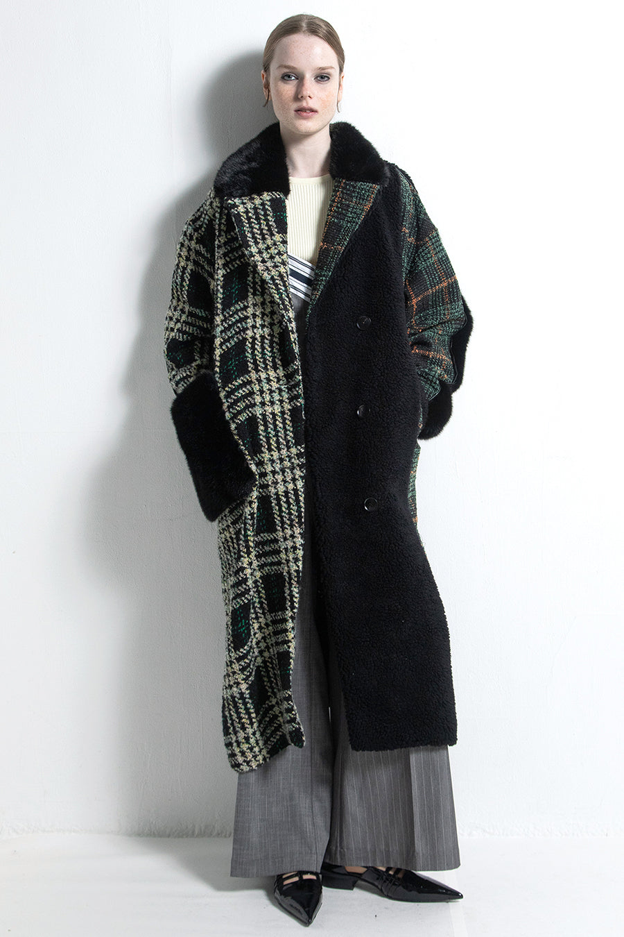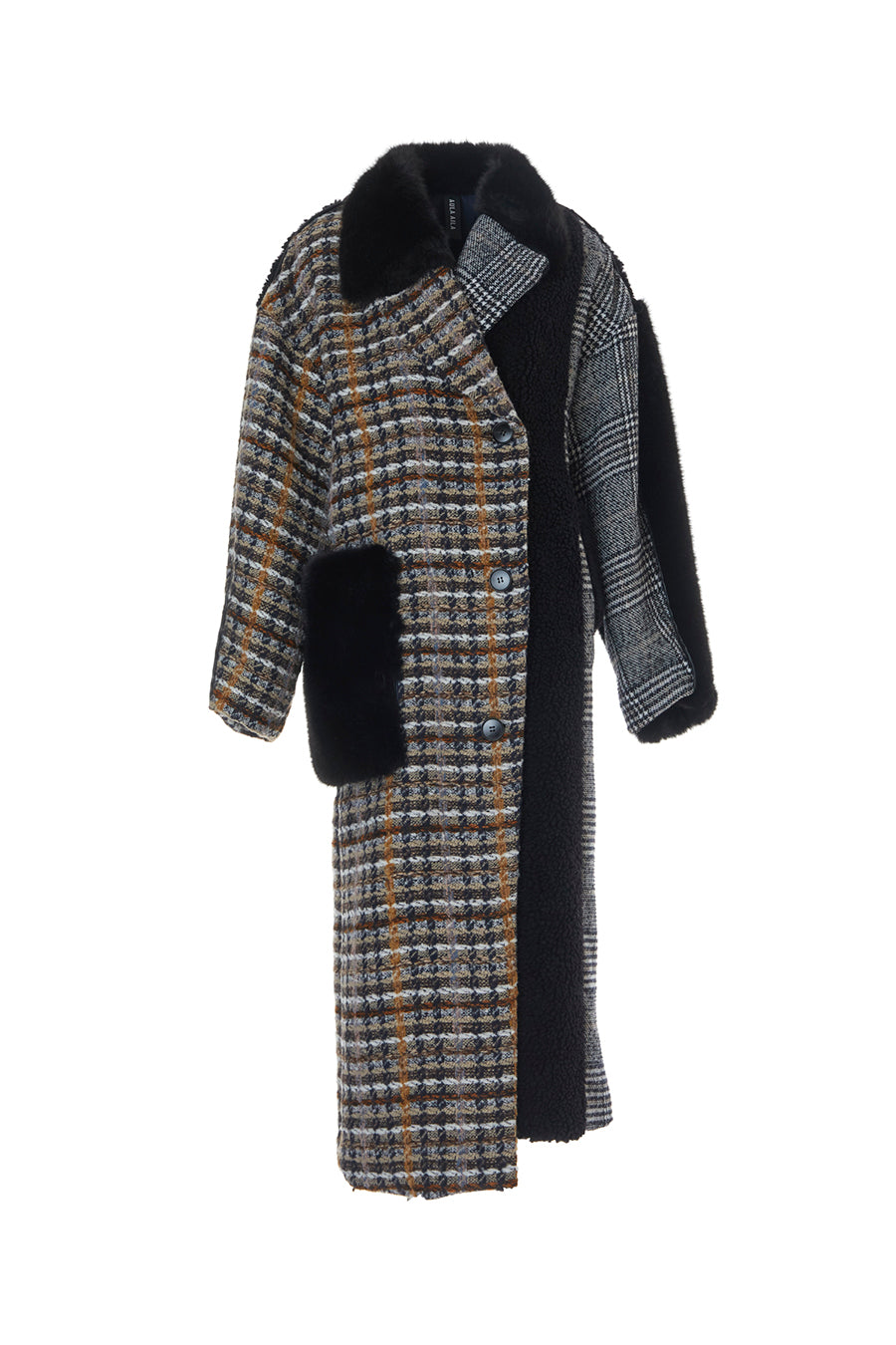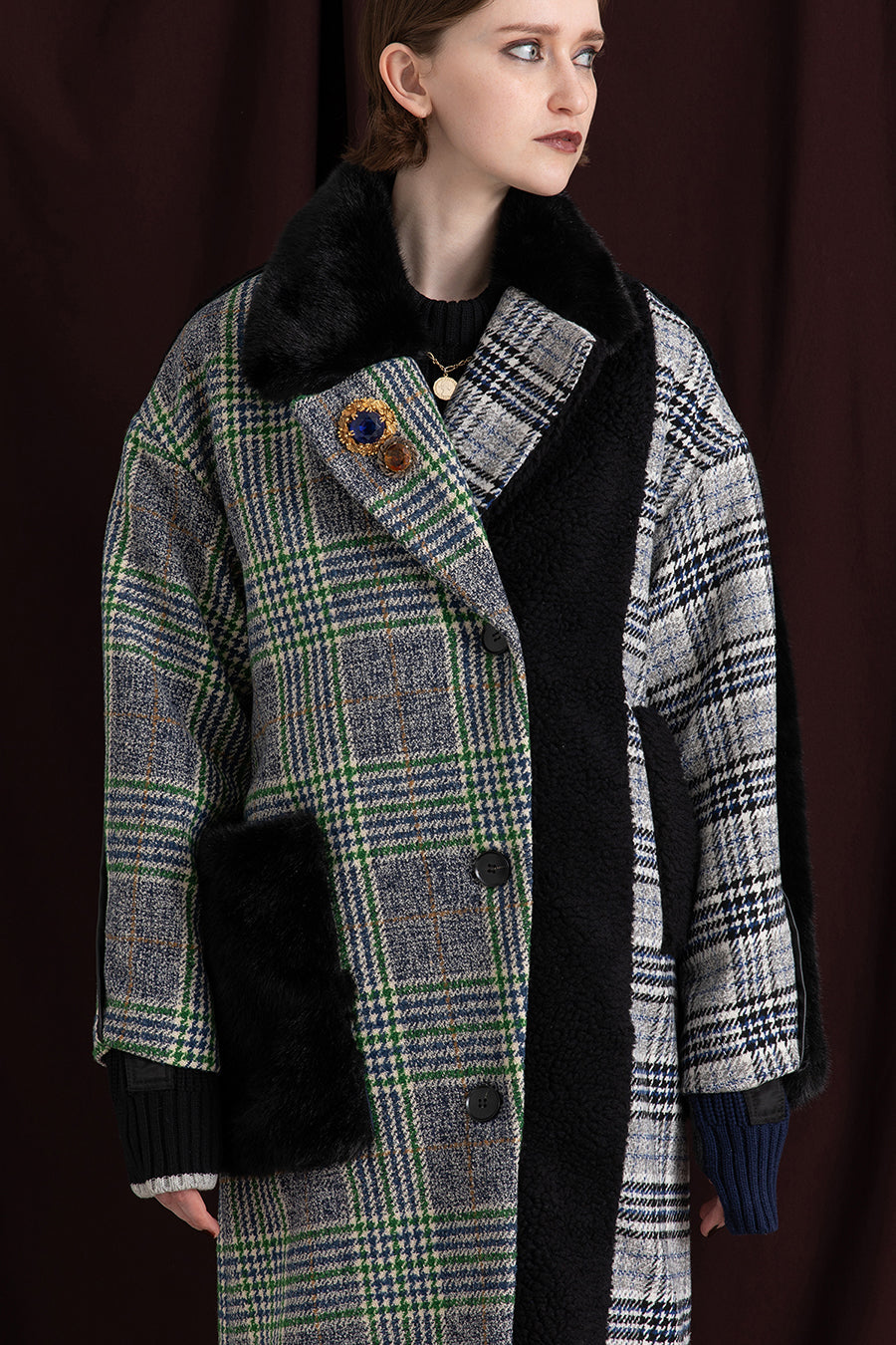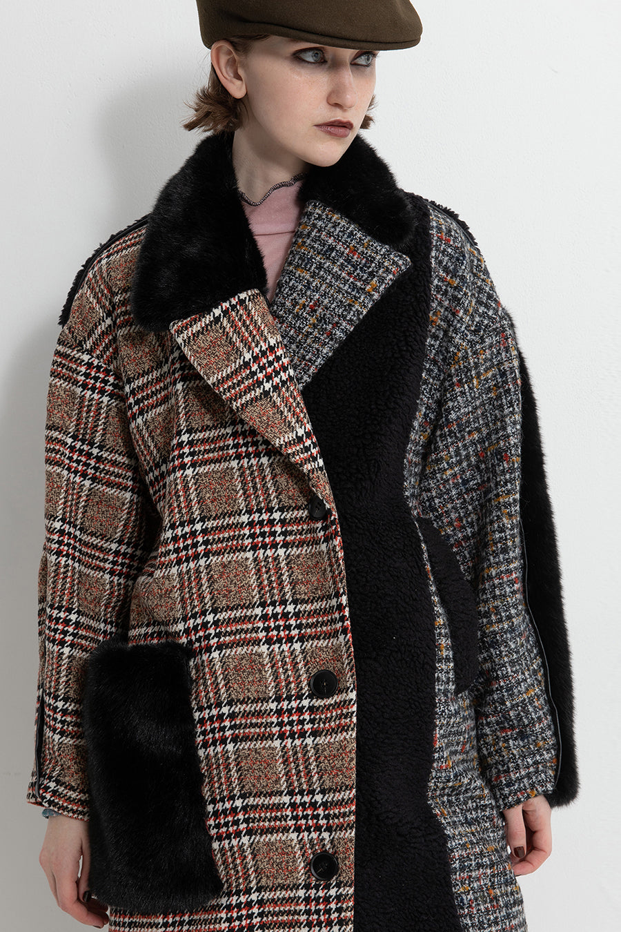 ツイードチェック、ヘリンボーンツイード、シャギー、ロービングなどと、異素材のエコファーやボアの4素材をコンビネーションしたロングコート。
