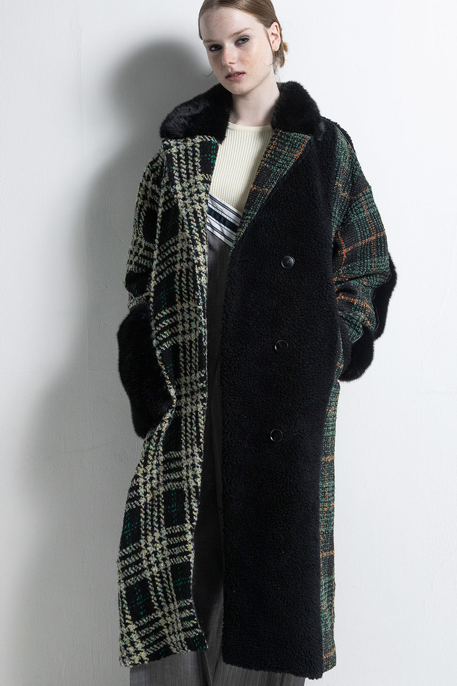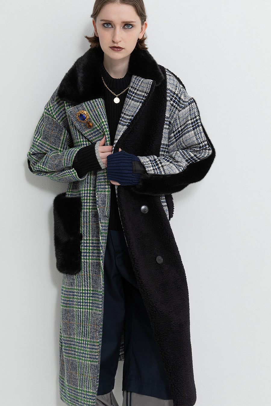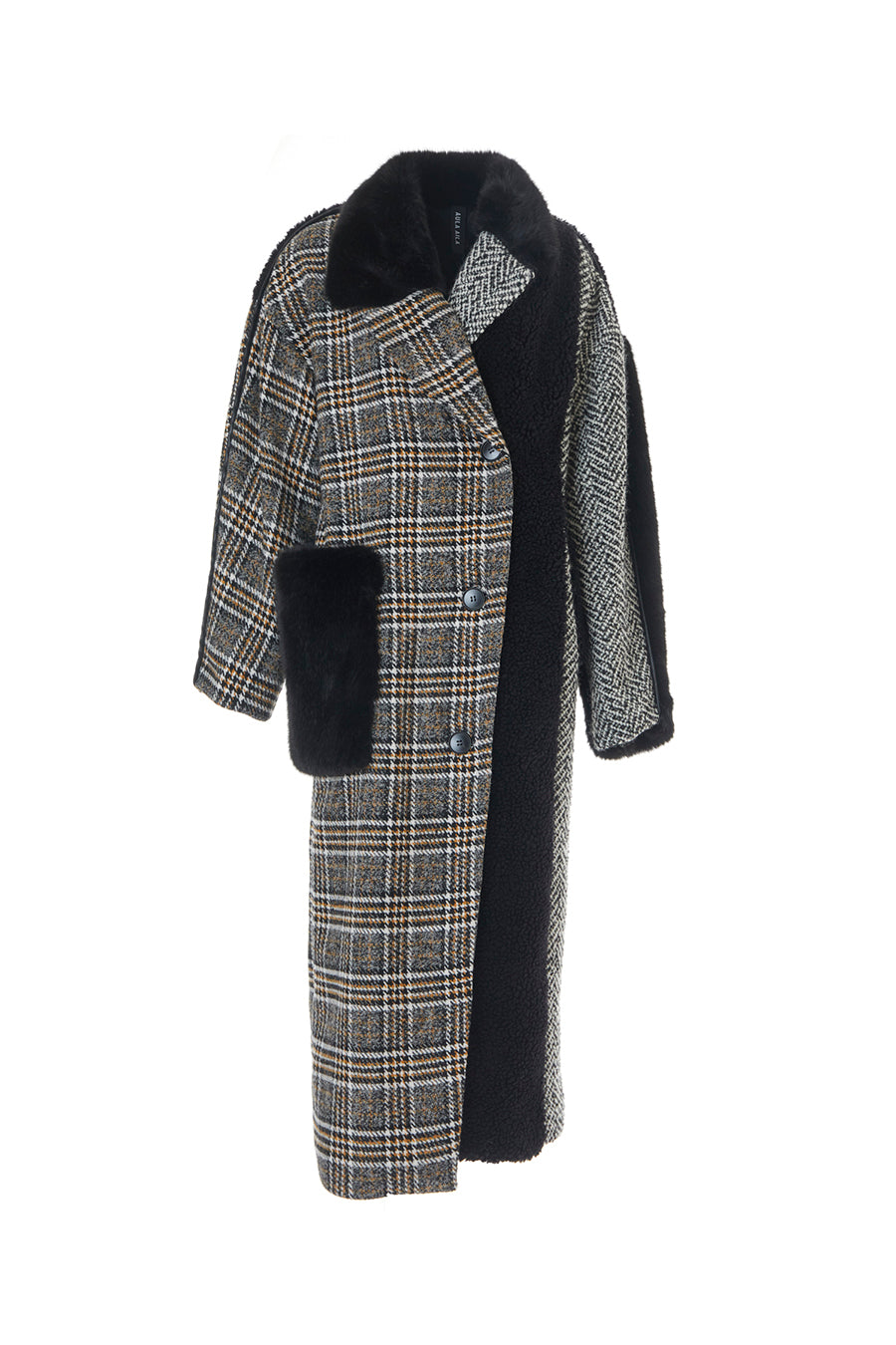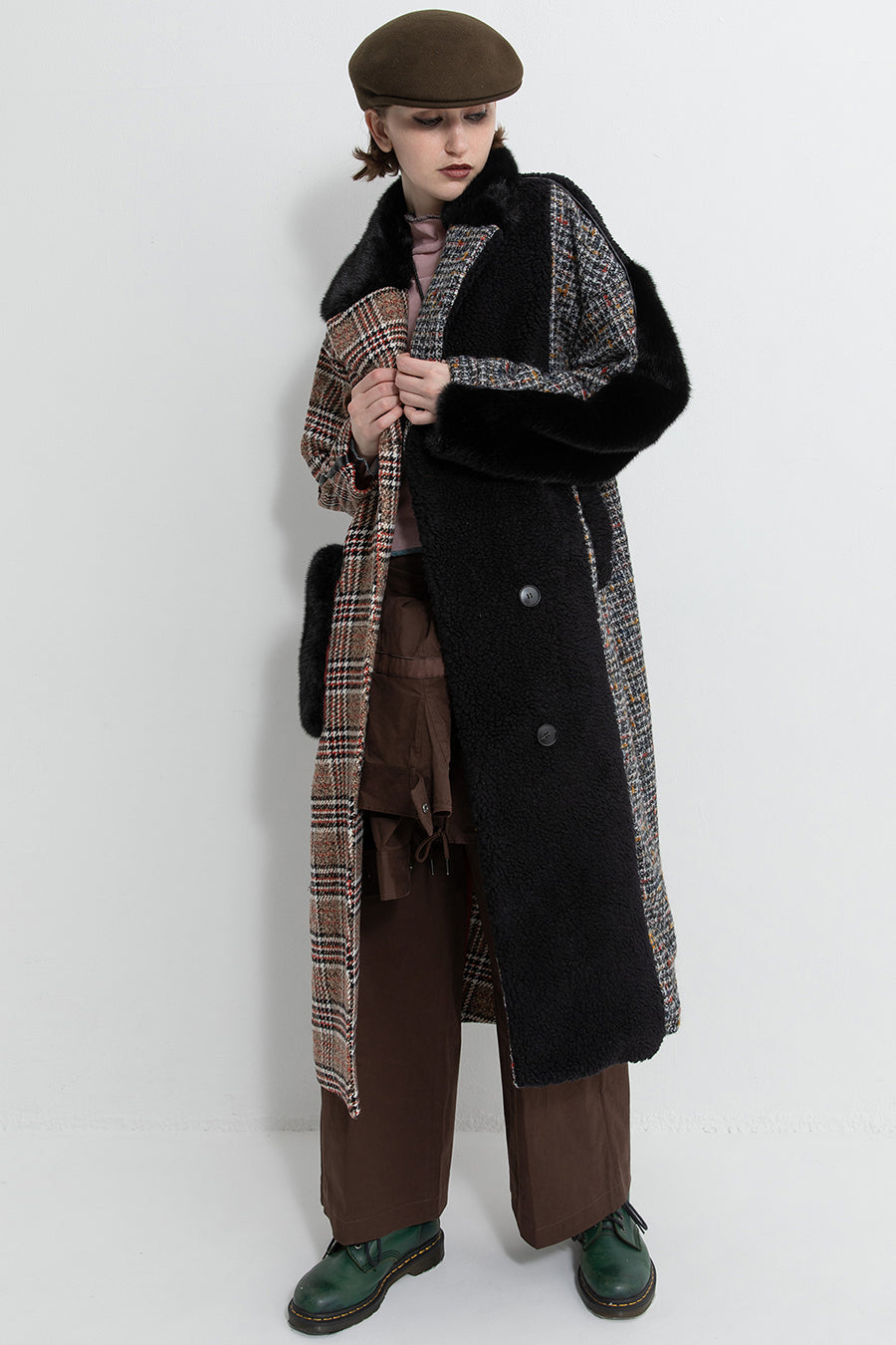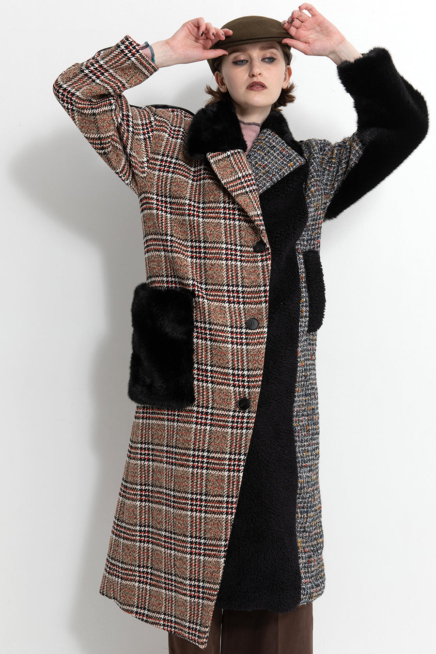 ツイードチェック、ヘリンボーンツイード、シャギー、ロービングなどと、異素材のエコファーやボアの4素材をコンビネーションしたロングコート。