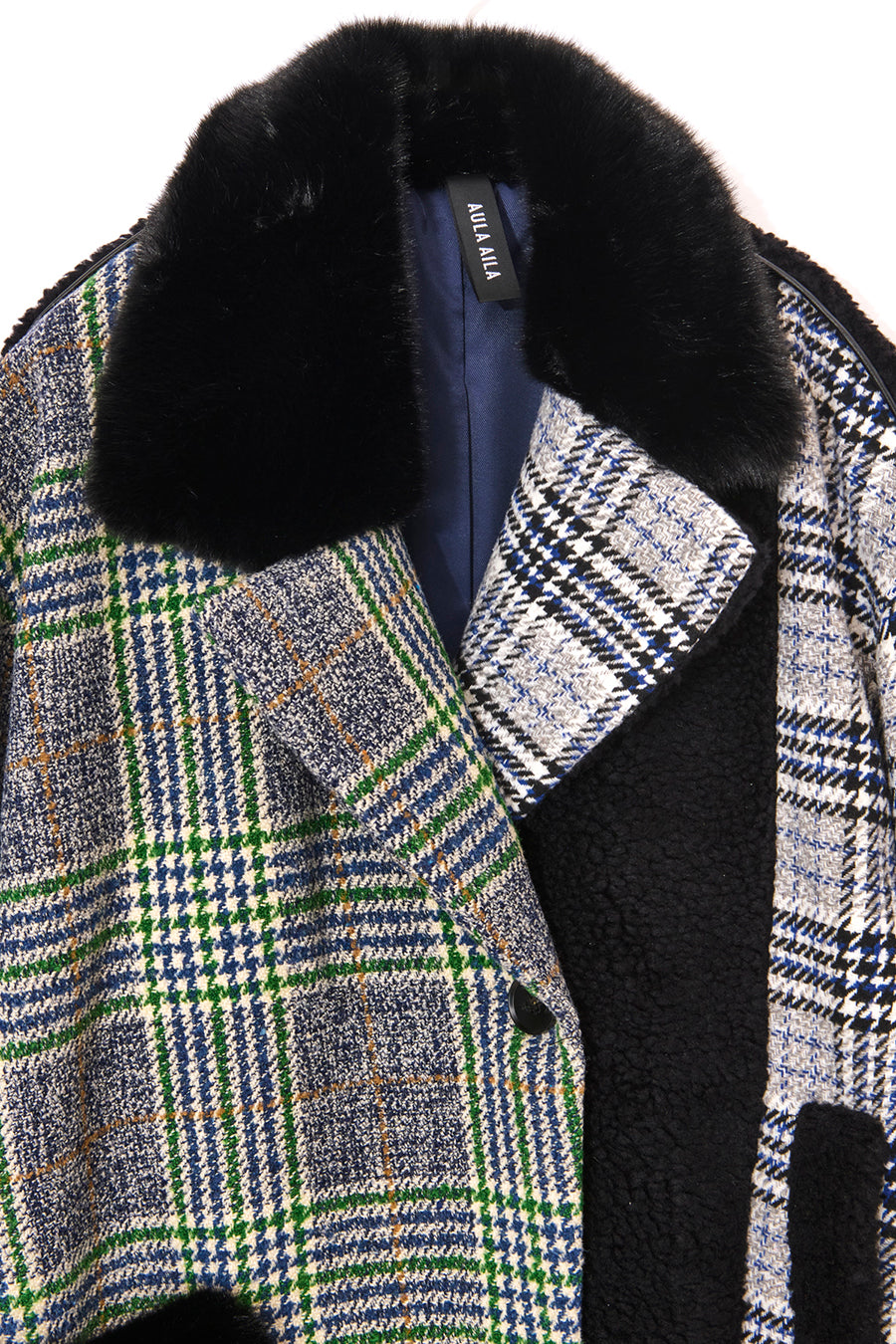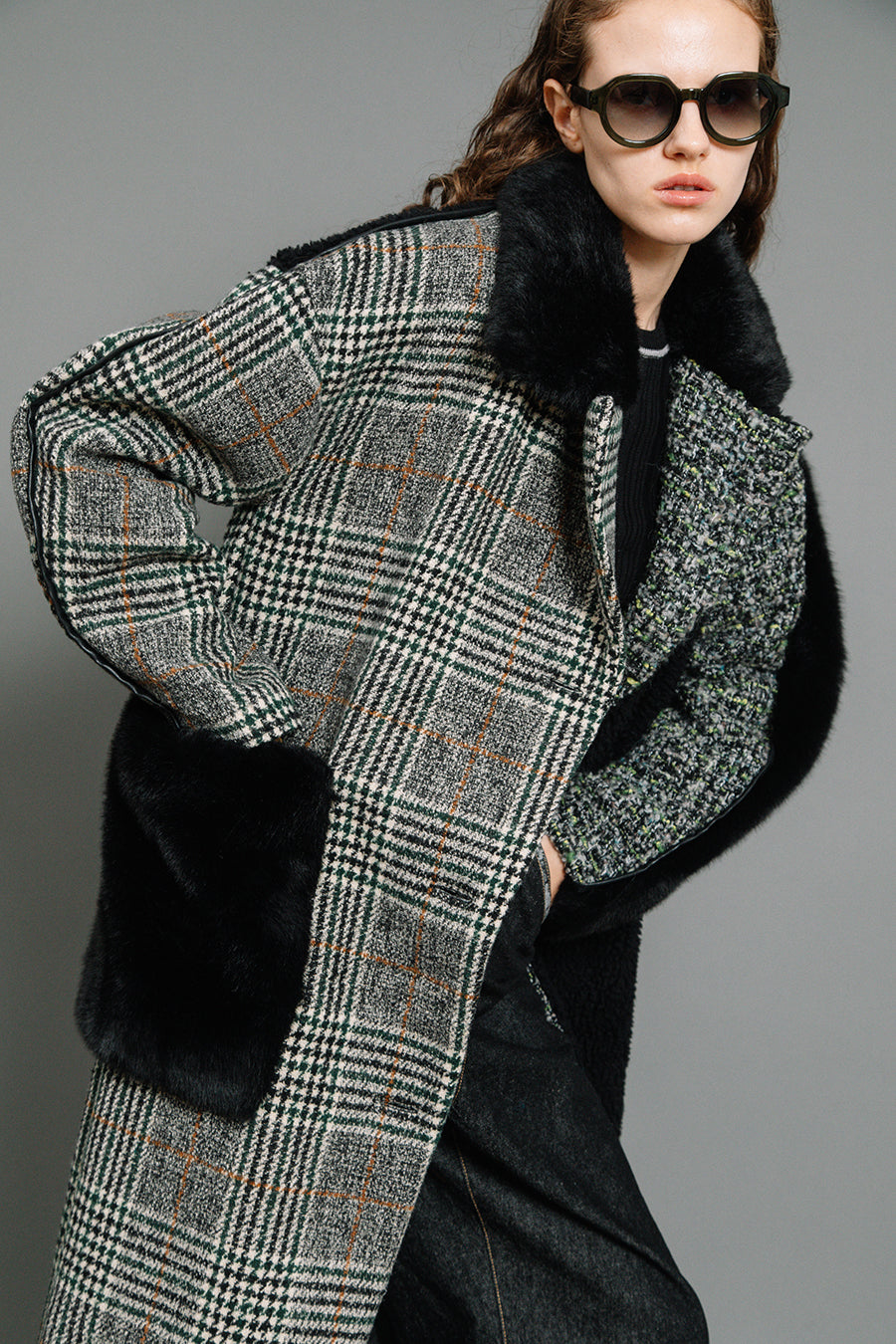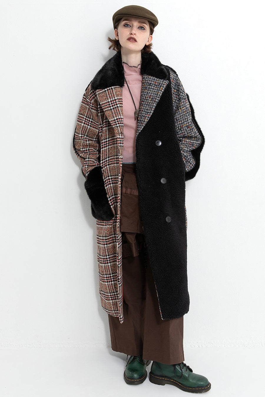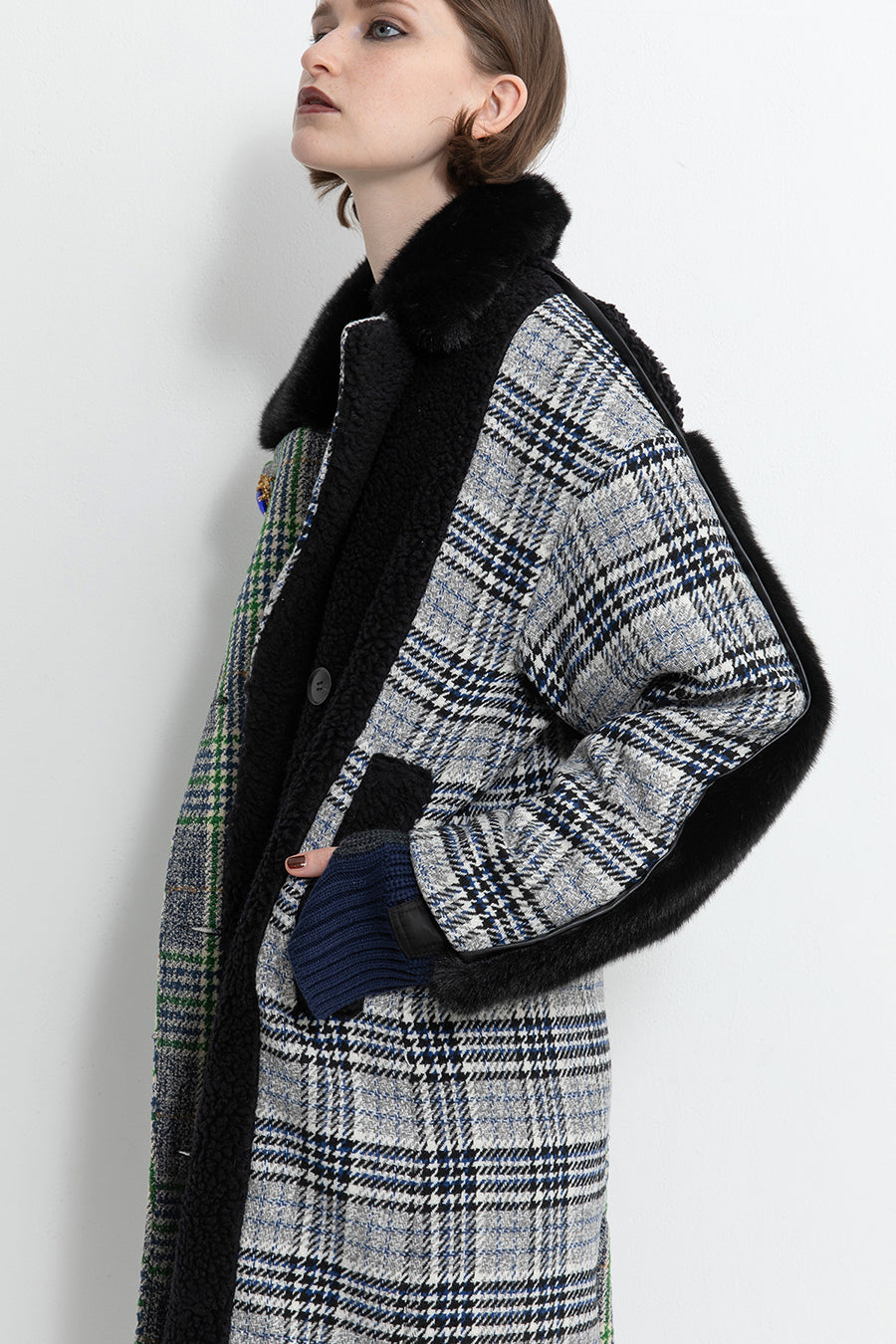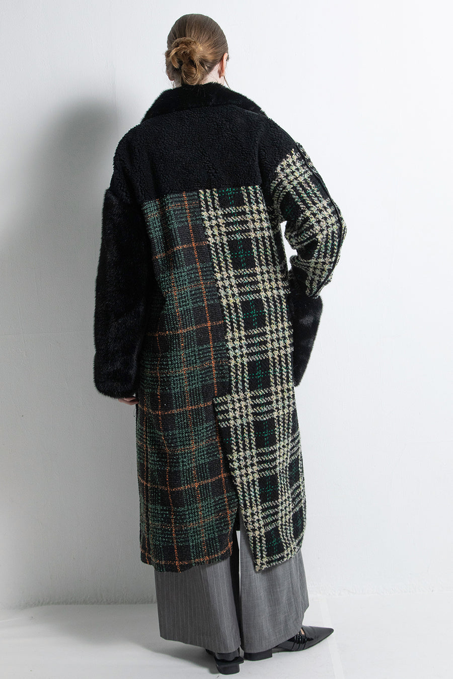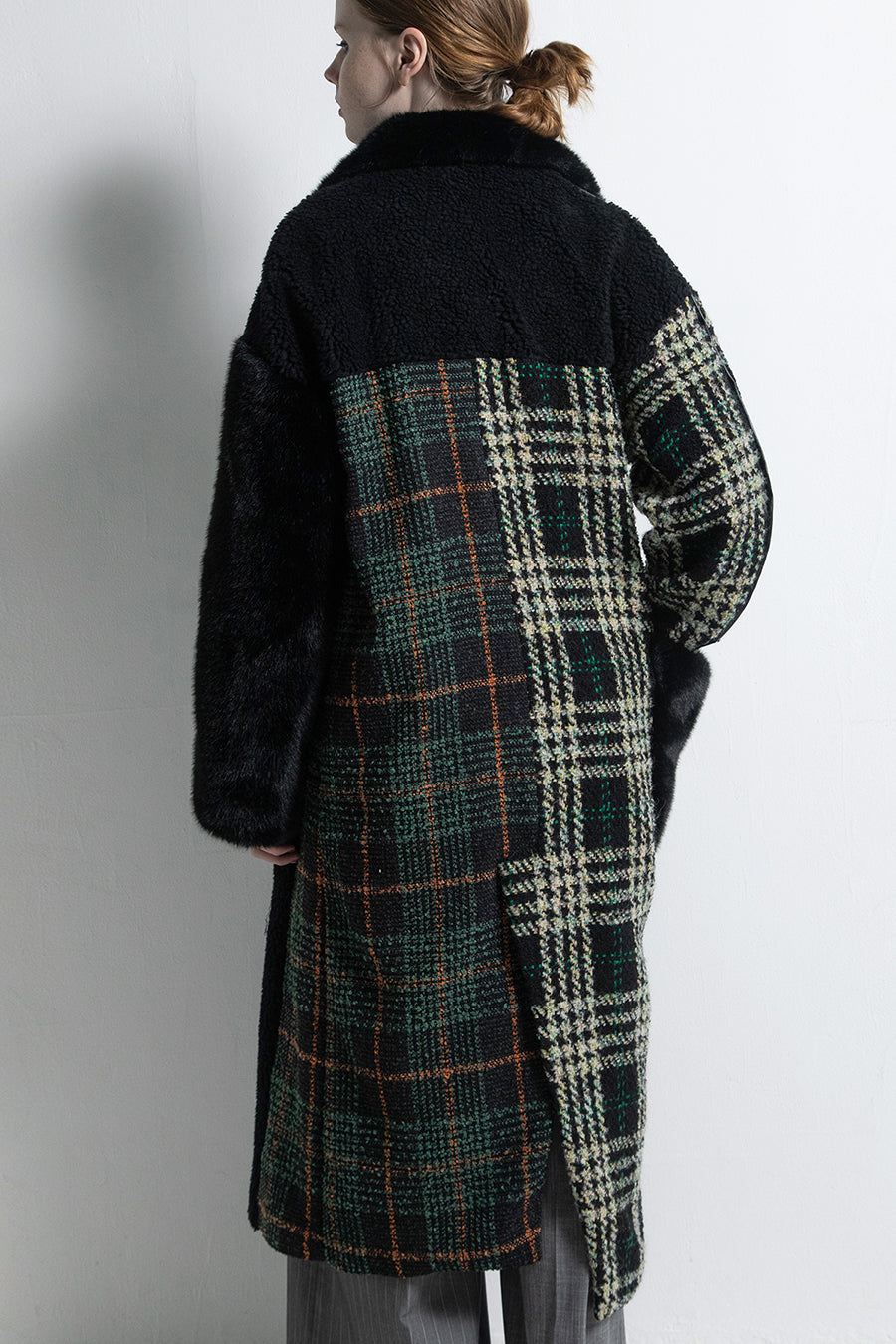 ツイードチェック、ヘリンボーンツイード、シャギー、ロービングなどと、異素材のエコファーやボアの4素材をコンビネーションしたロングコート。