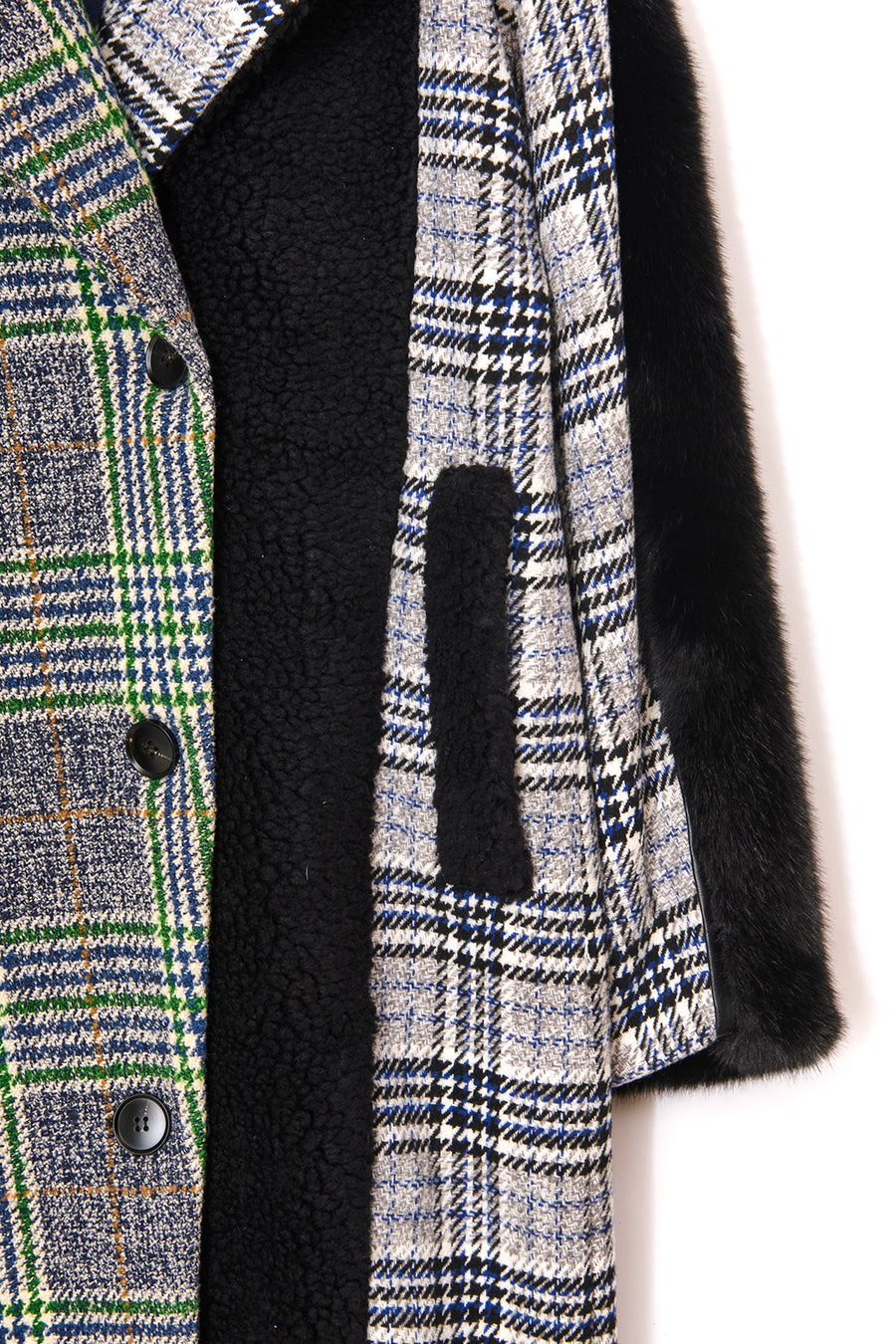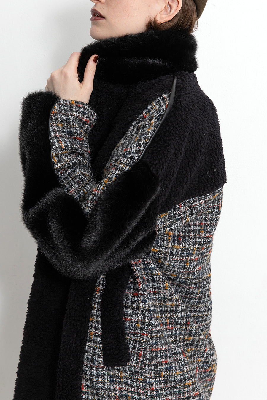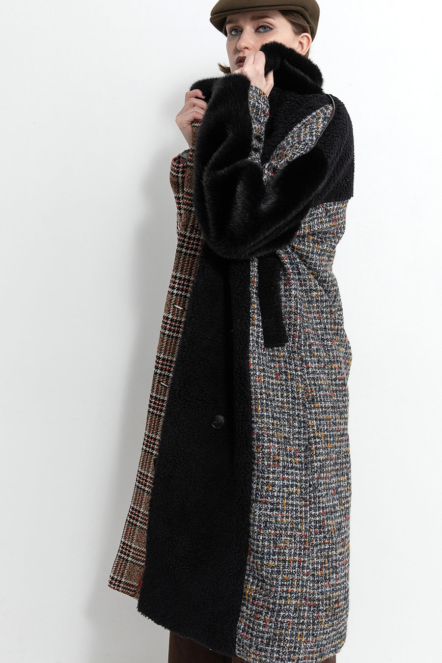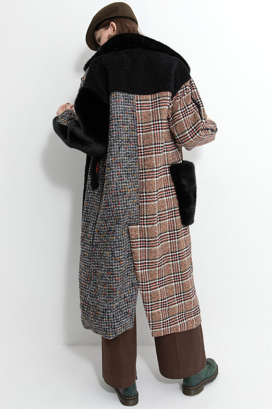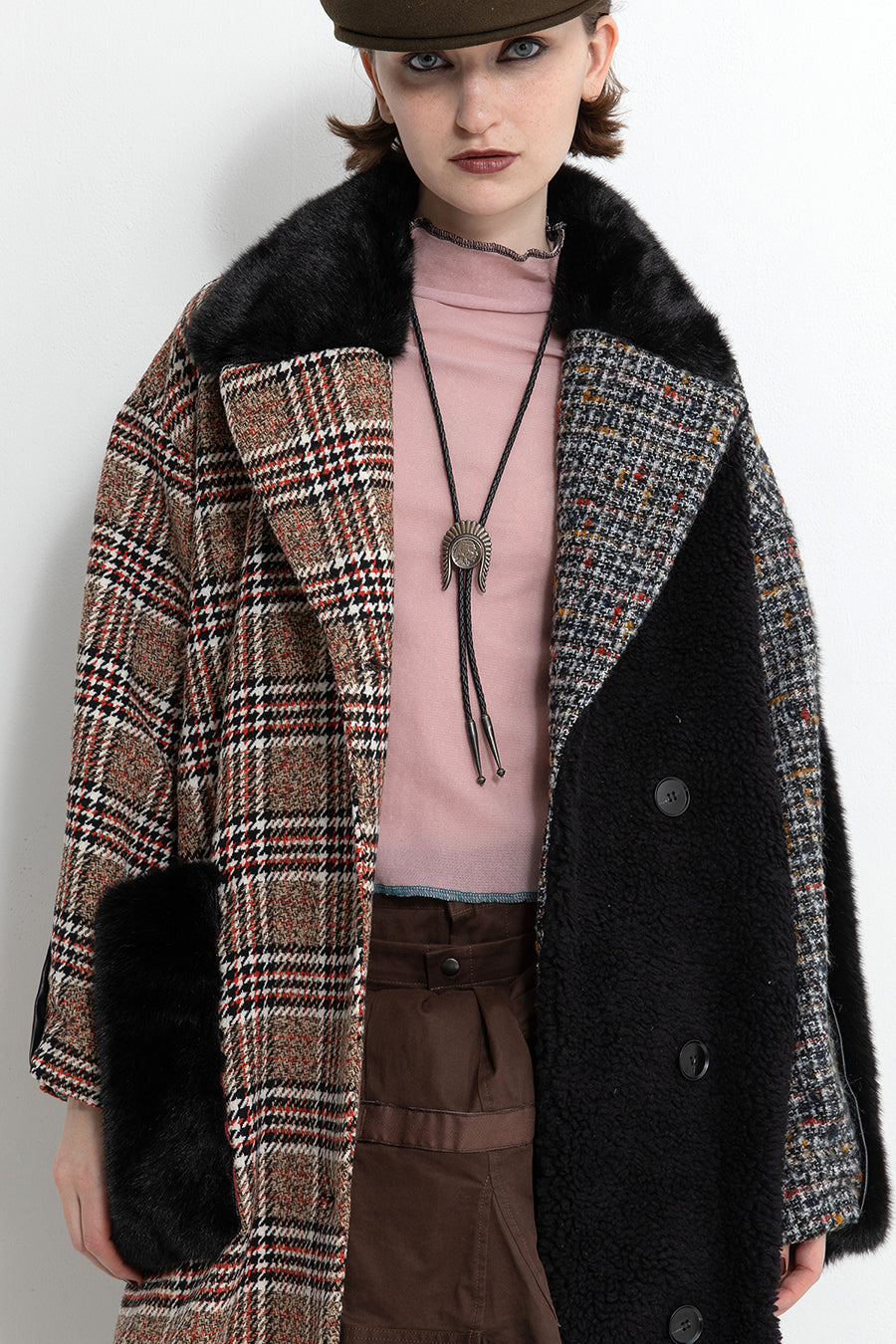ツイードチェック、ヘリンボーンツイード、シャギー、ロービングなどと、異素材のエコファーやボアの4素材をコンビネーションしたロングコート。