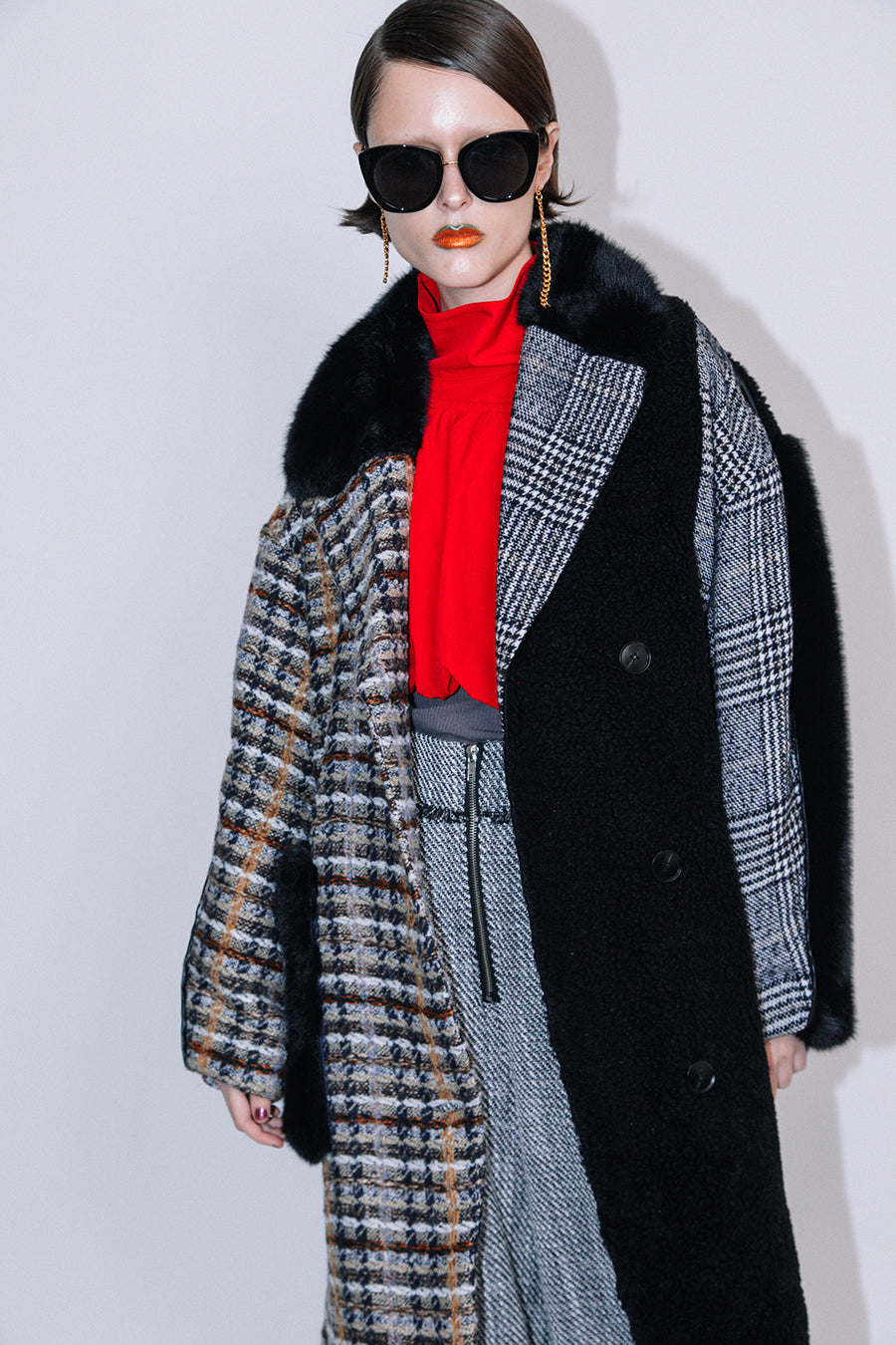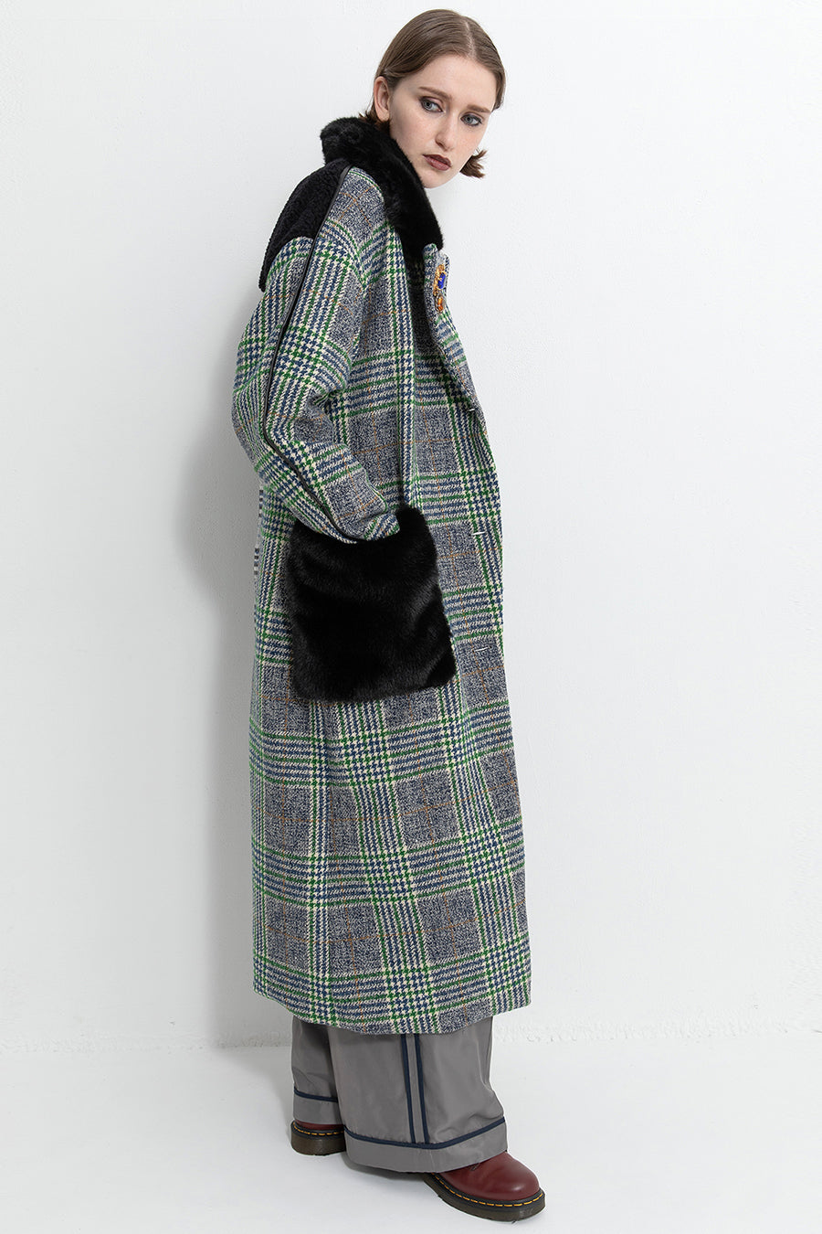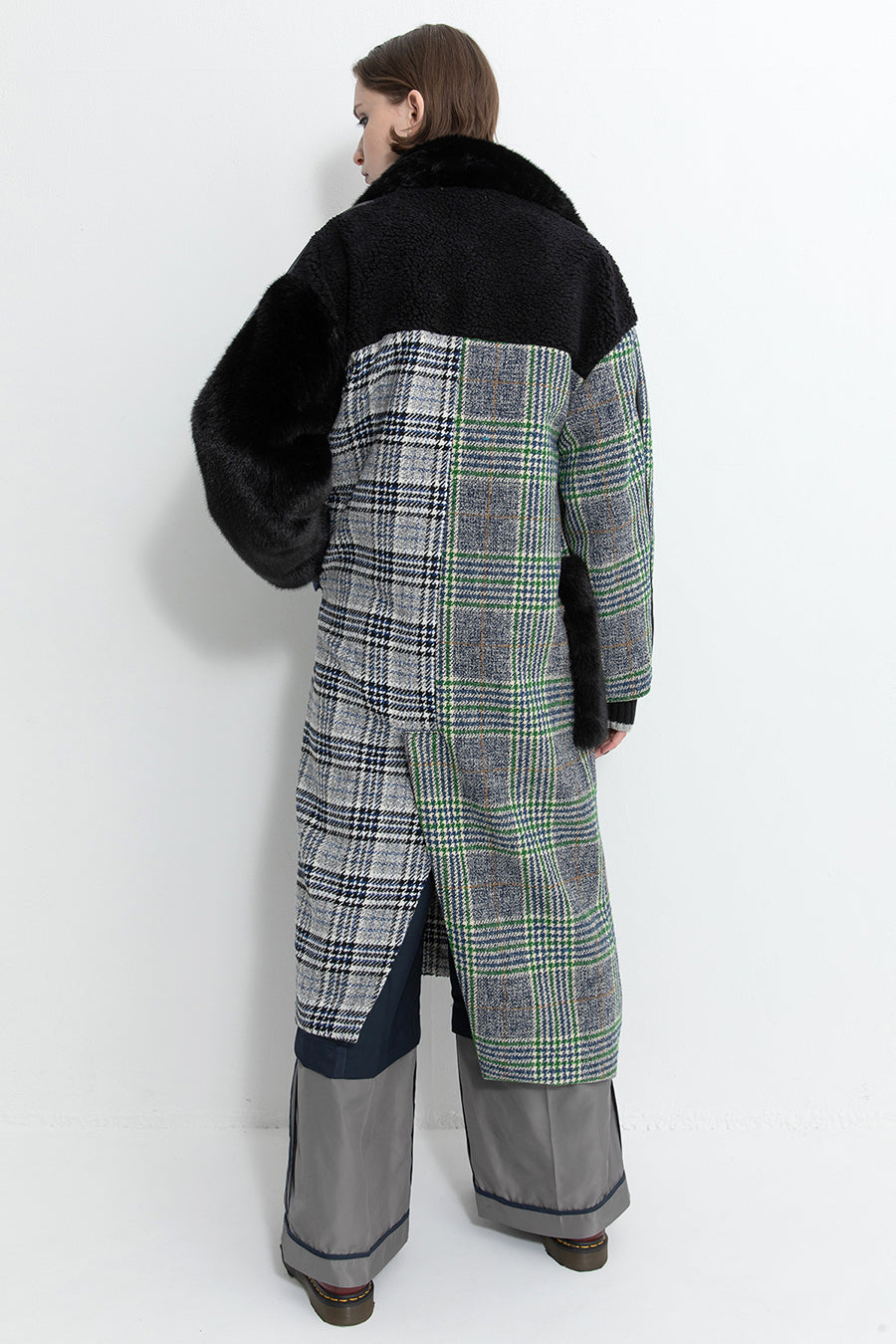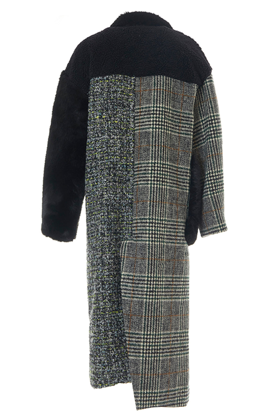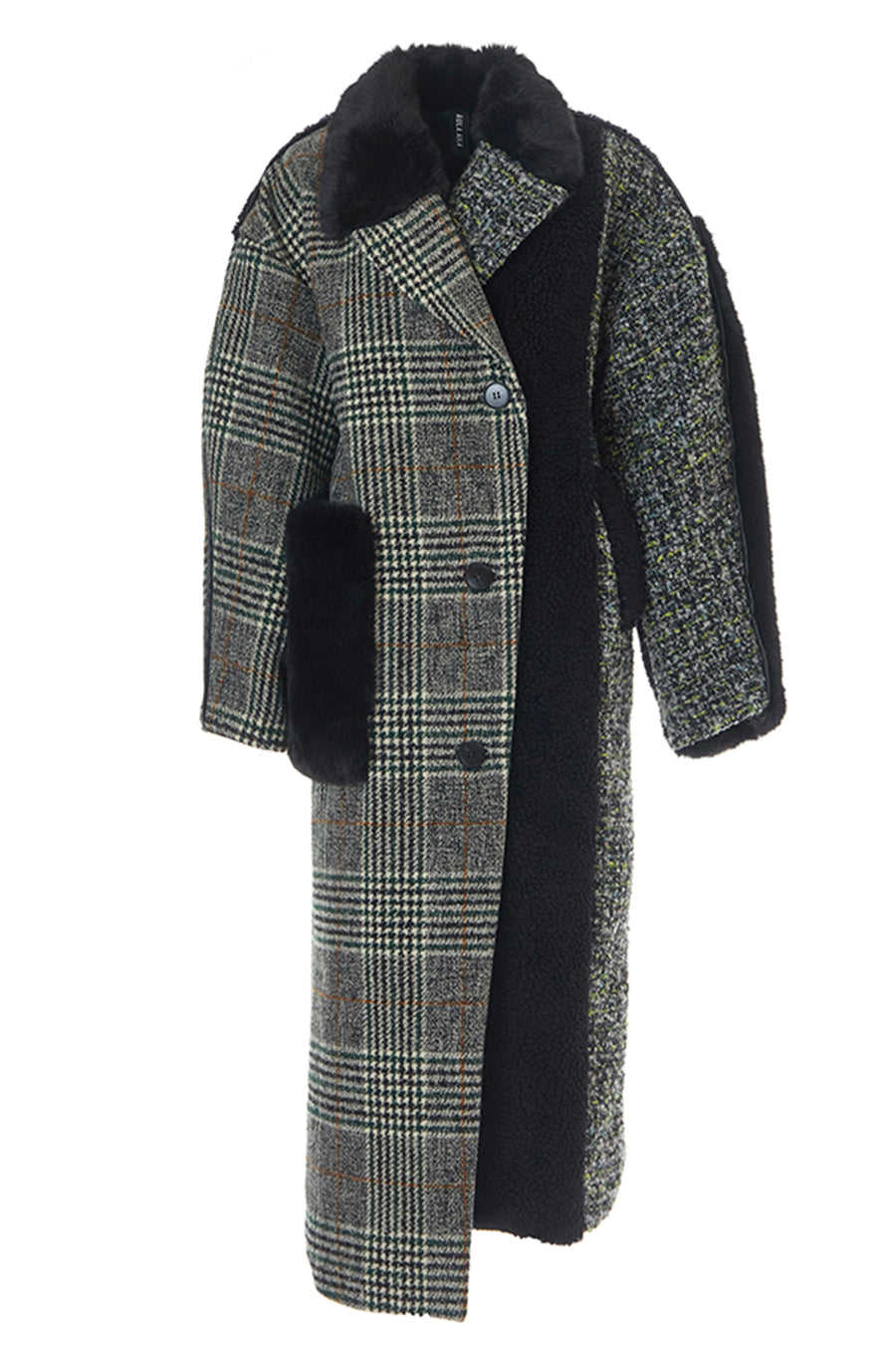 ツイードチェック、ヘリンボーンツイード、シャギー、ロービングなどと、異素材のエコファーやボアの4素材をコンビネーションしたロングコート。