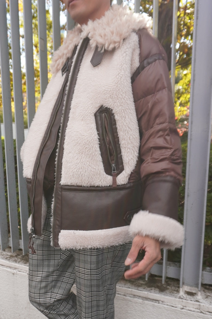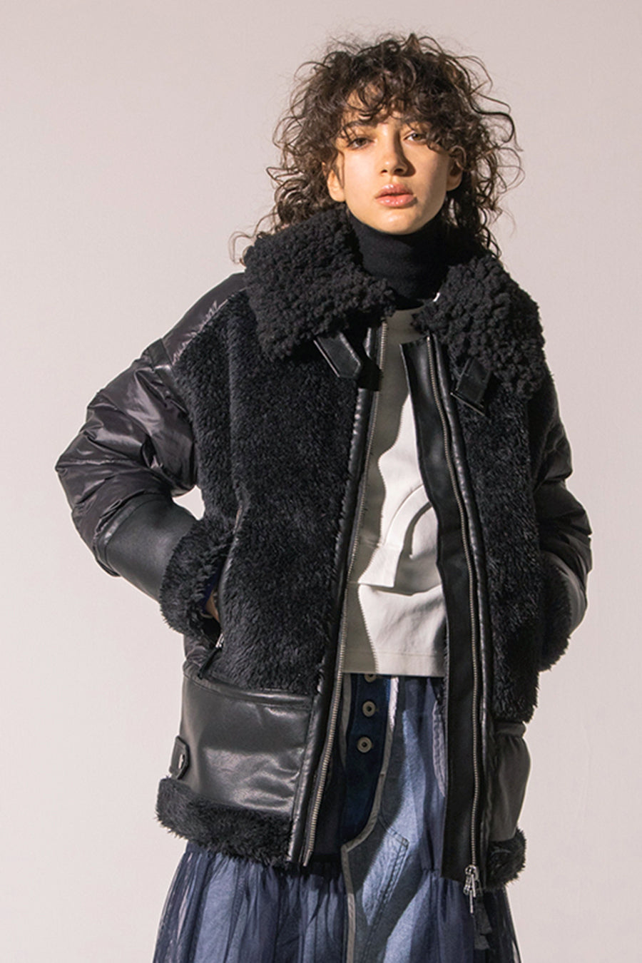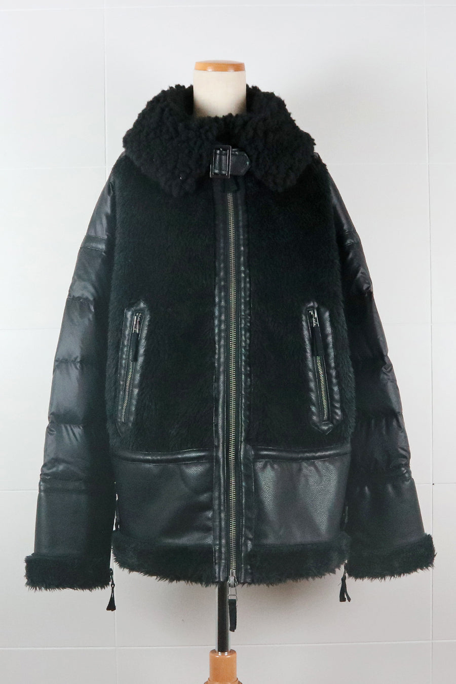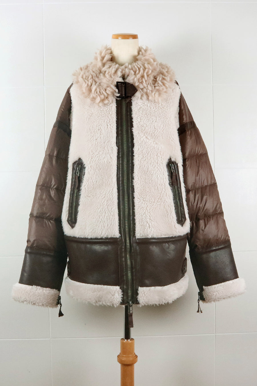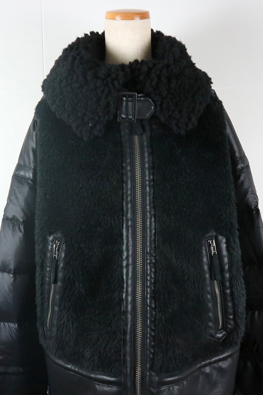レザーとボアをボンディング加工し、フェイクムートンとタフタダウンをコンビネーションしたB-3ジャケットです。