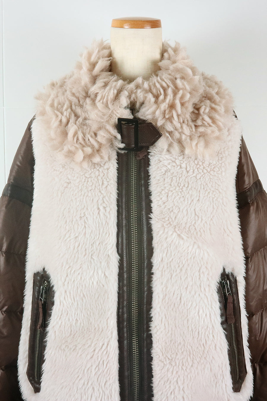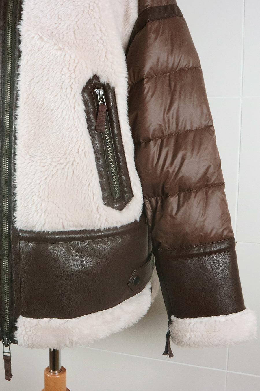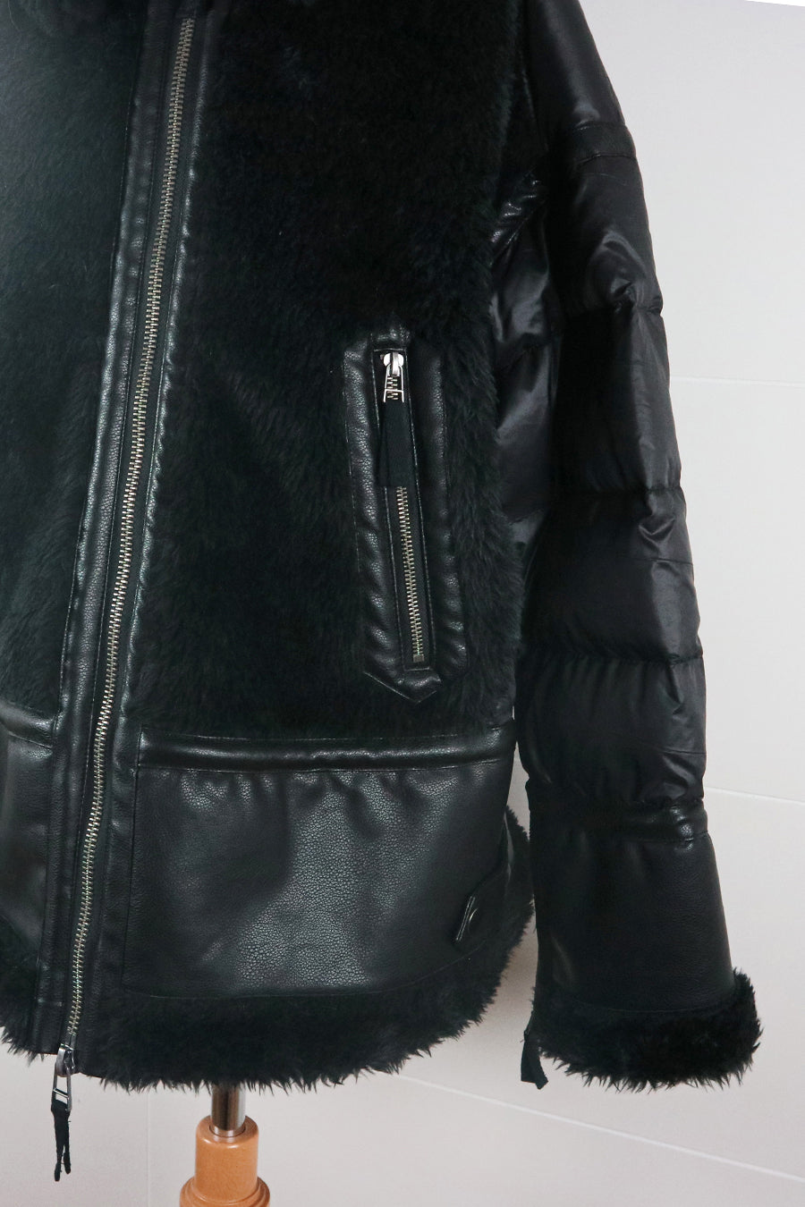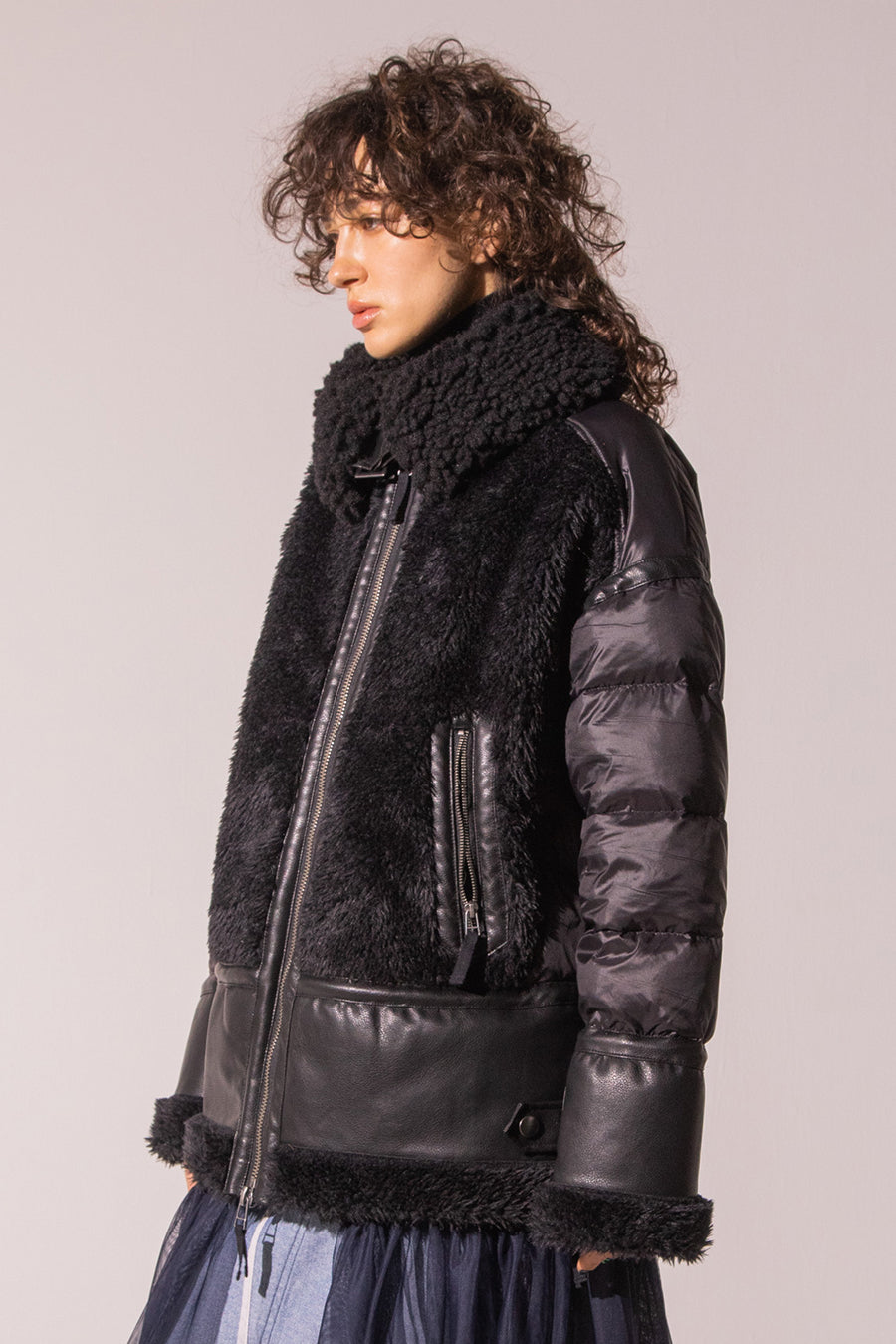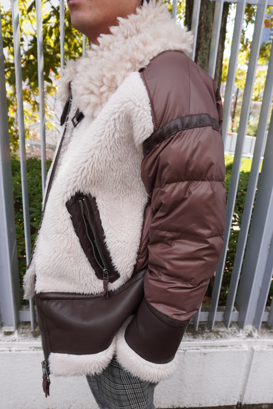 レザーとボアをボンディング加工し、フェイクムートンとタフタダウンをコンビネーションしたB-3ジャケットです。