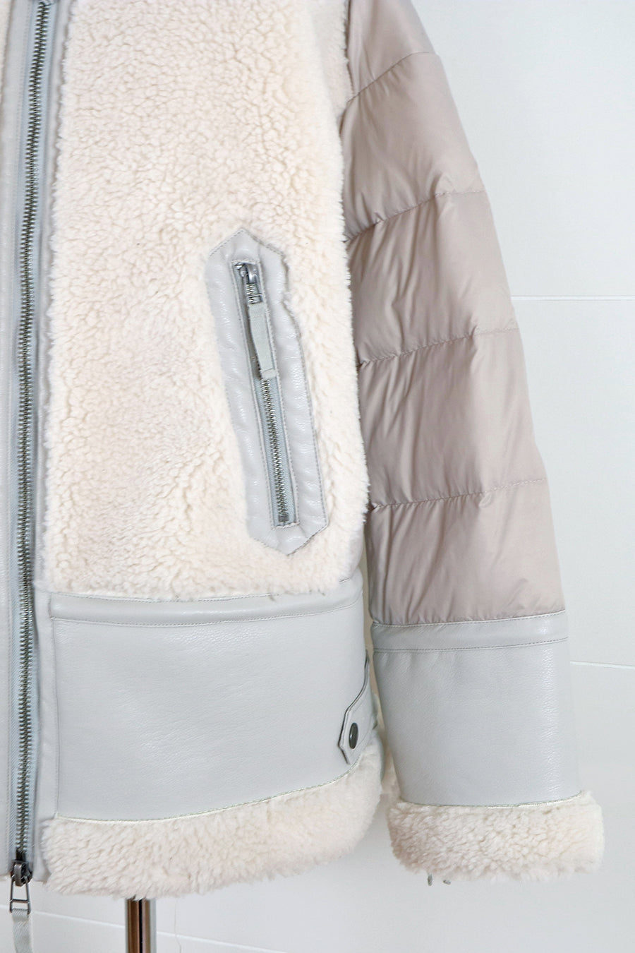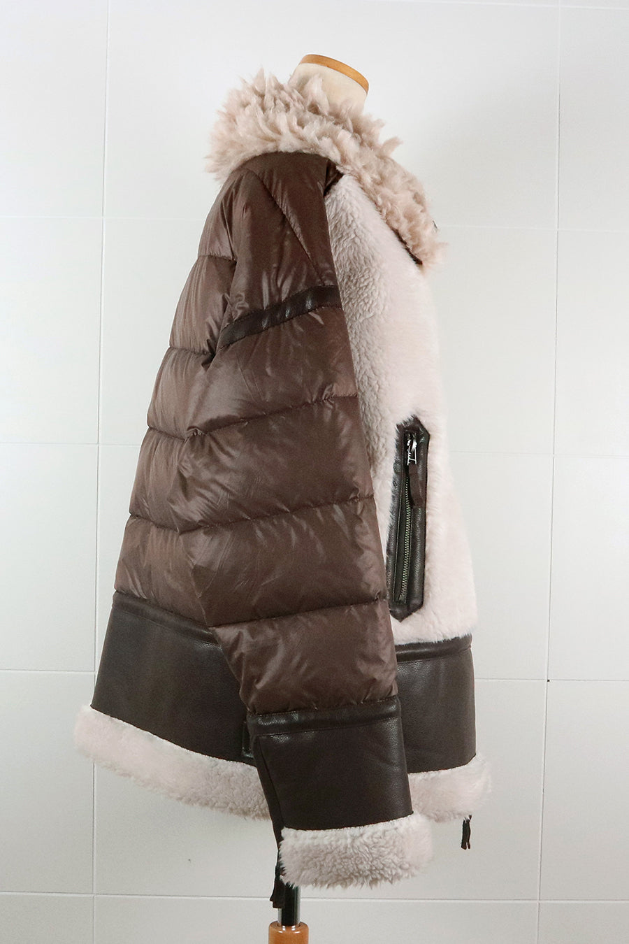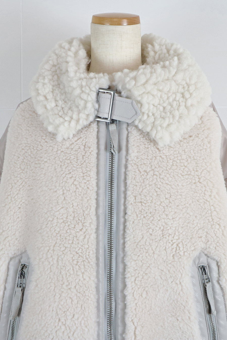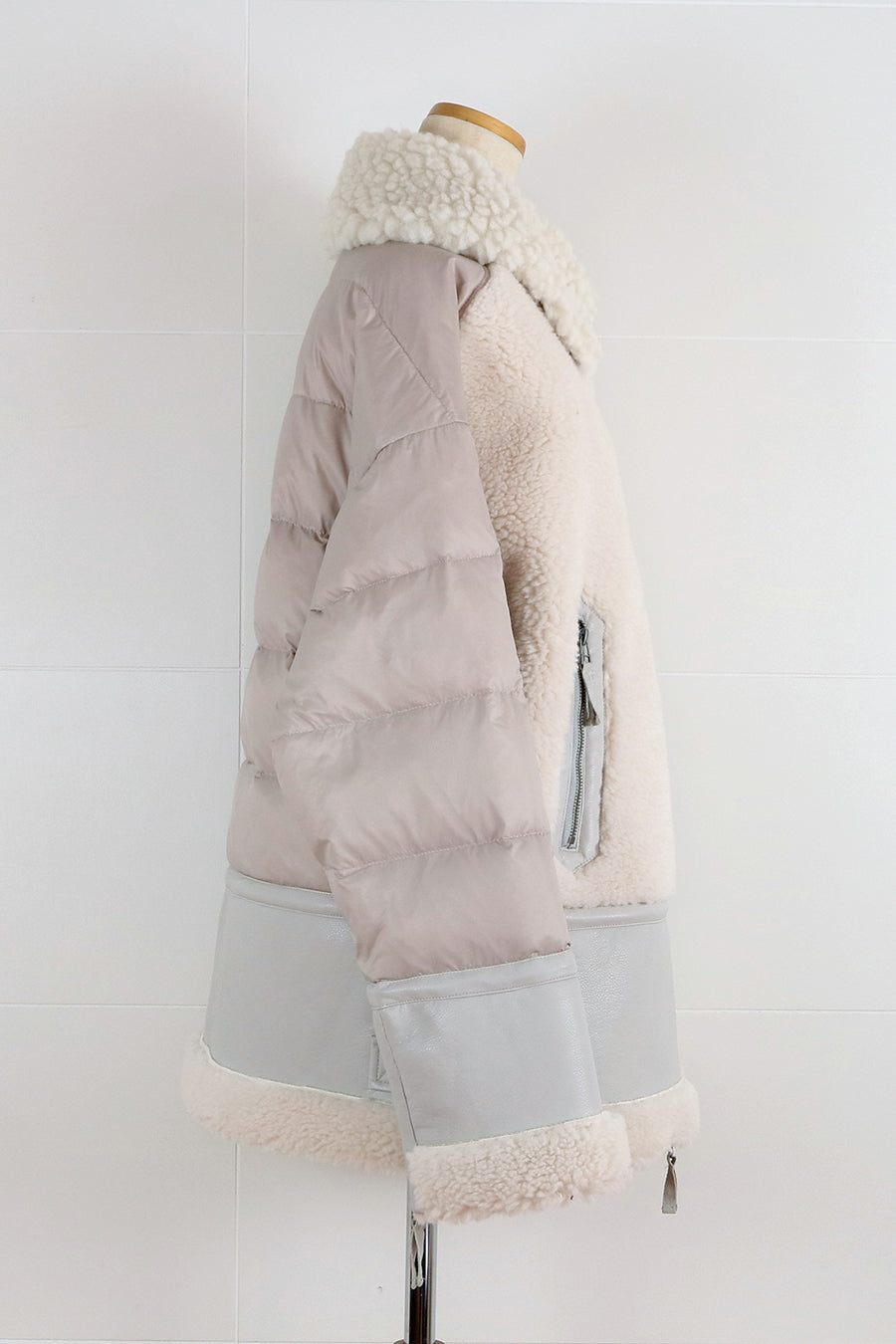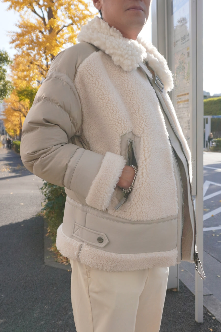 レザーとボアをボンディング加工し、フェイクムートンとタフタダウンをコンビネーションしたB-3ジャケットです。