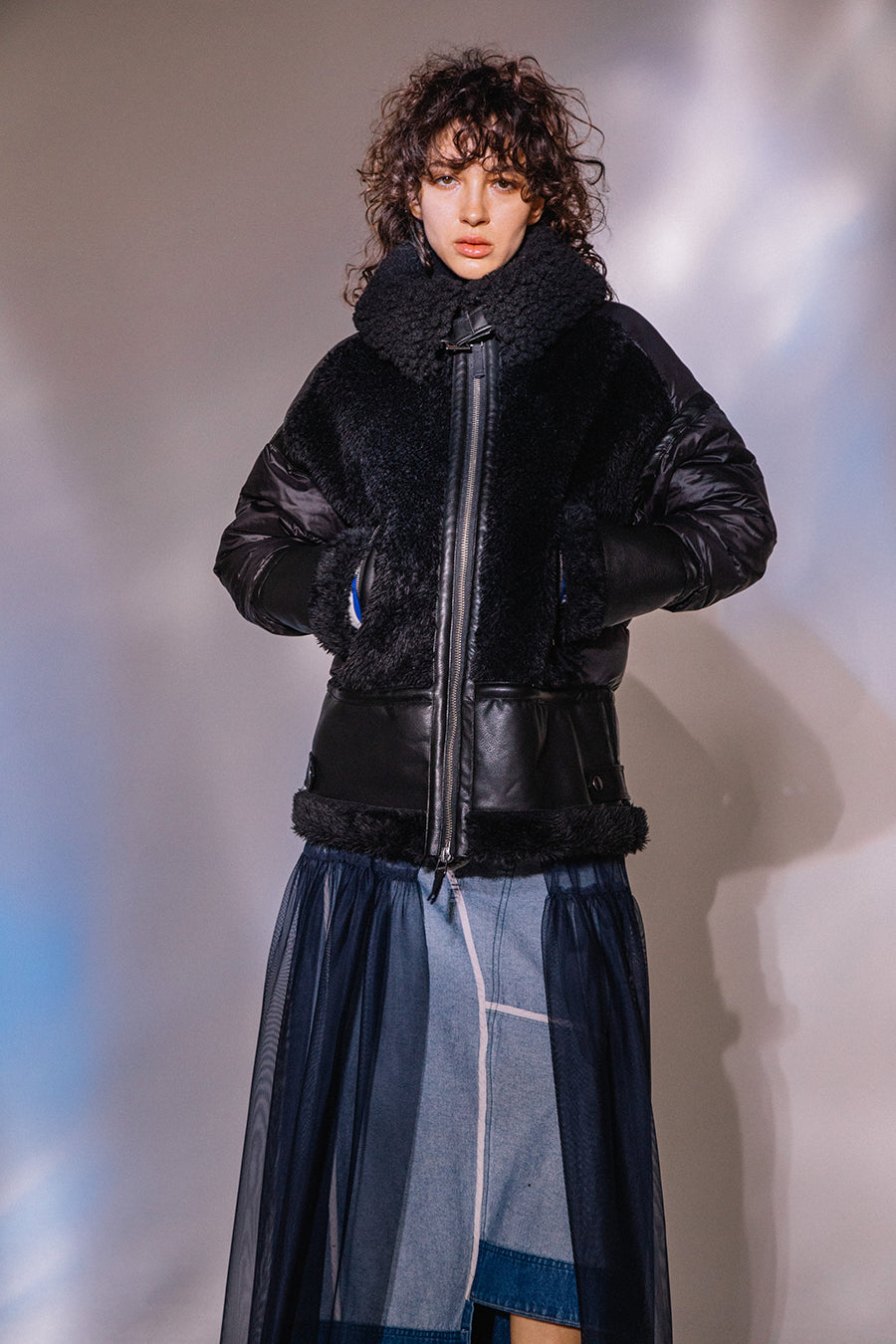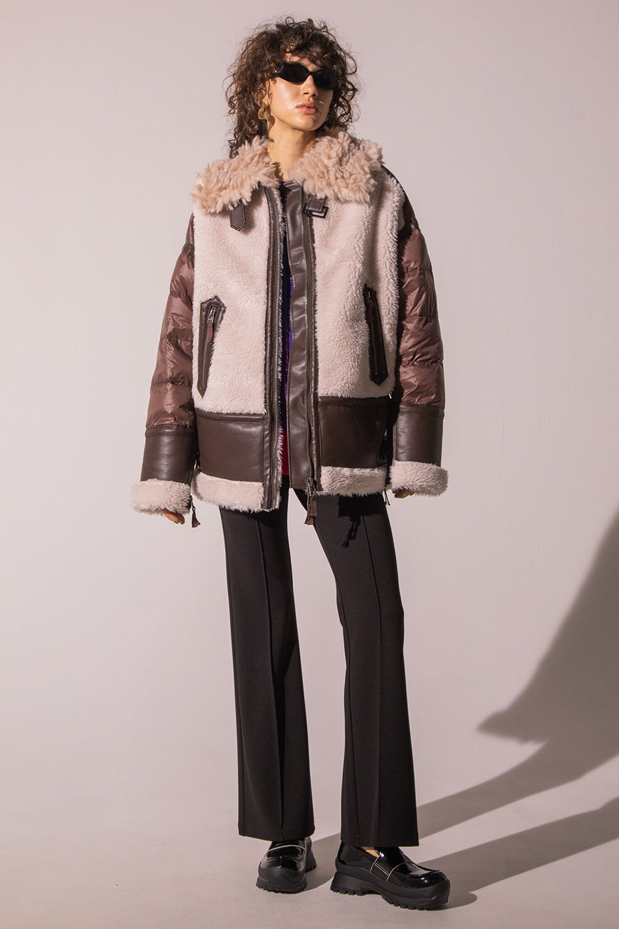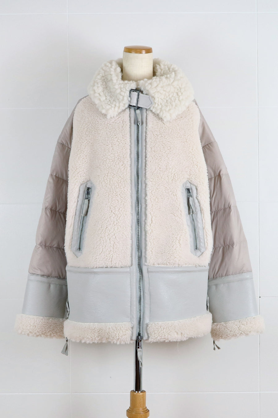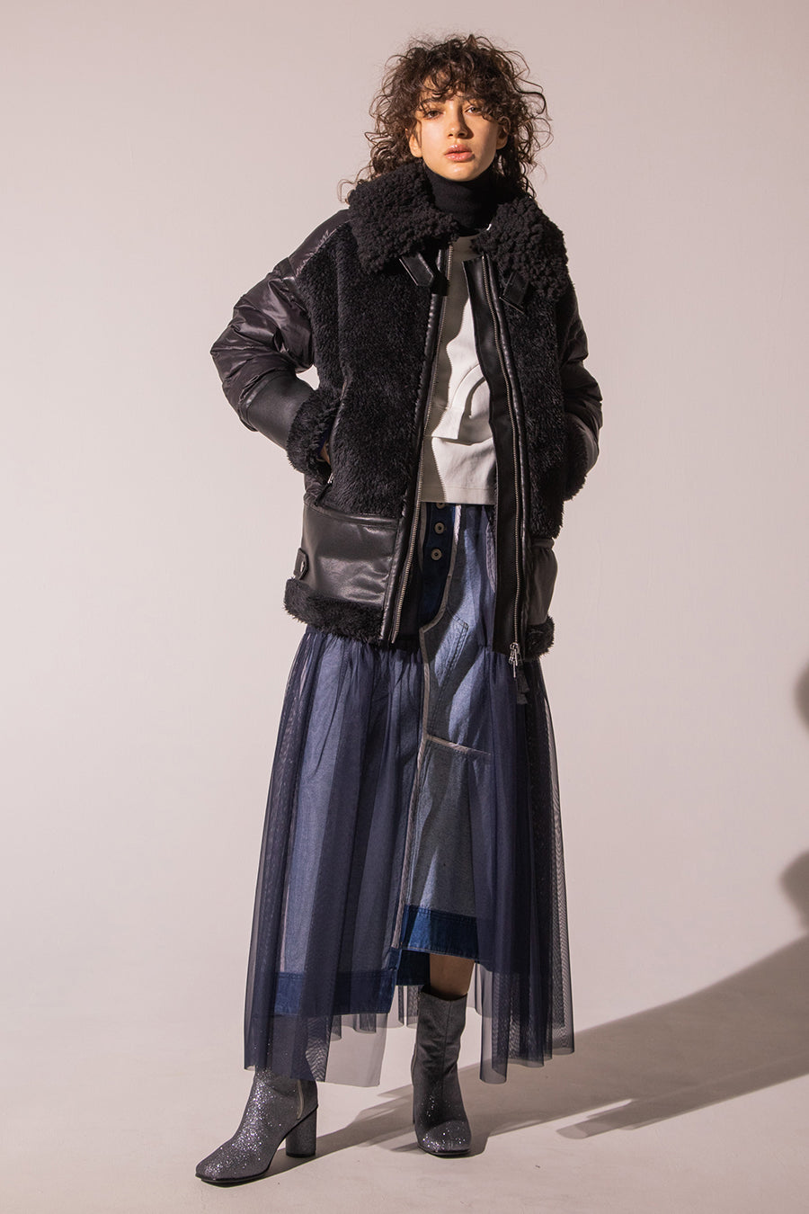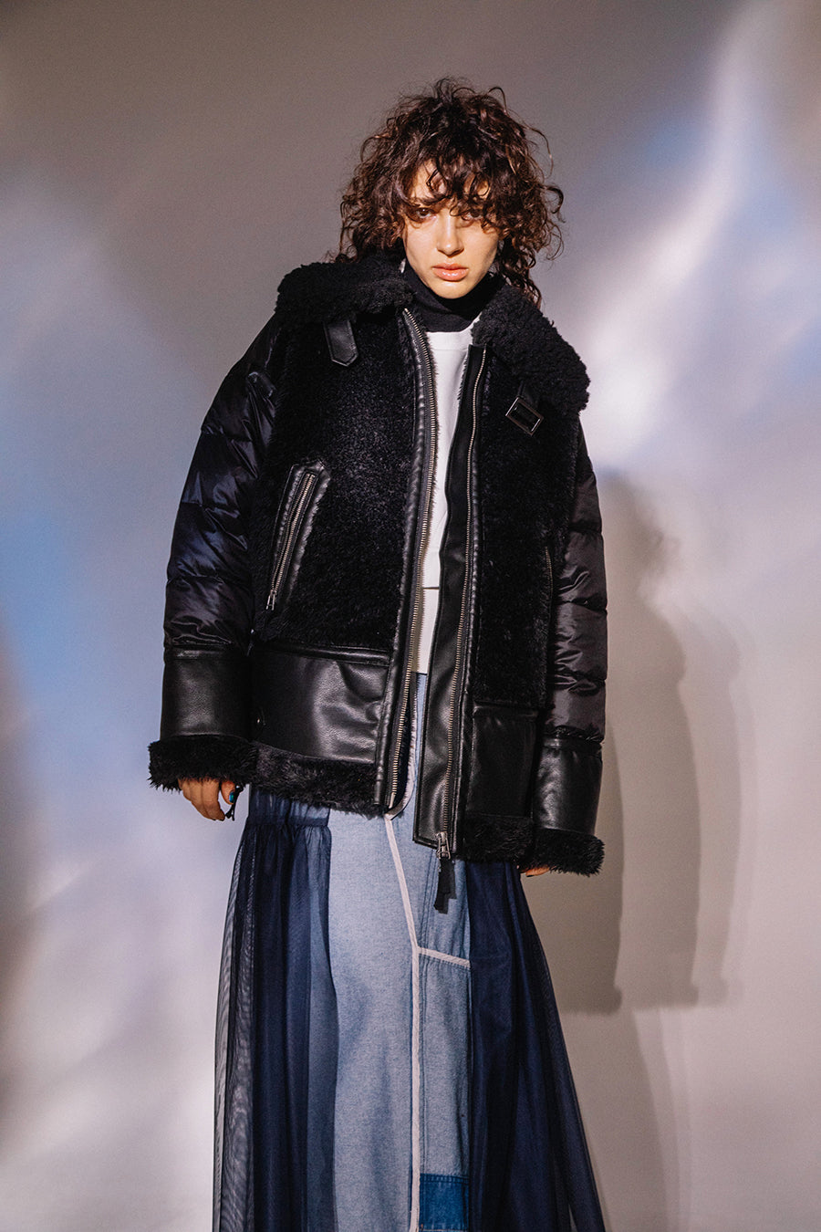 レザーとボアをボンディング加工し、フェイクムートンとタフタダウンをコンビネーションしたB-3ジャケットです。