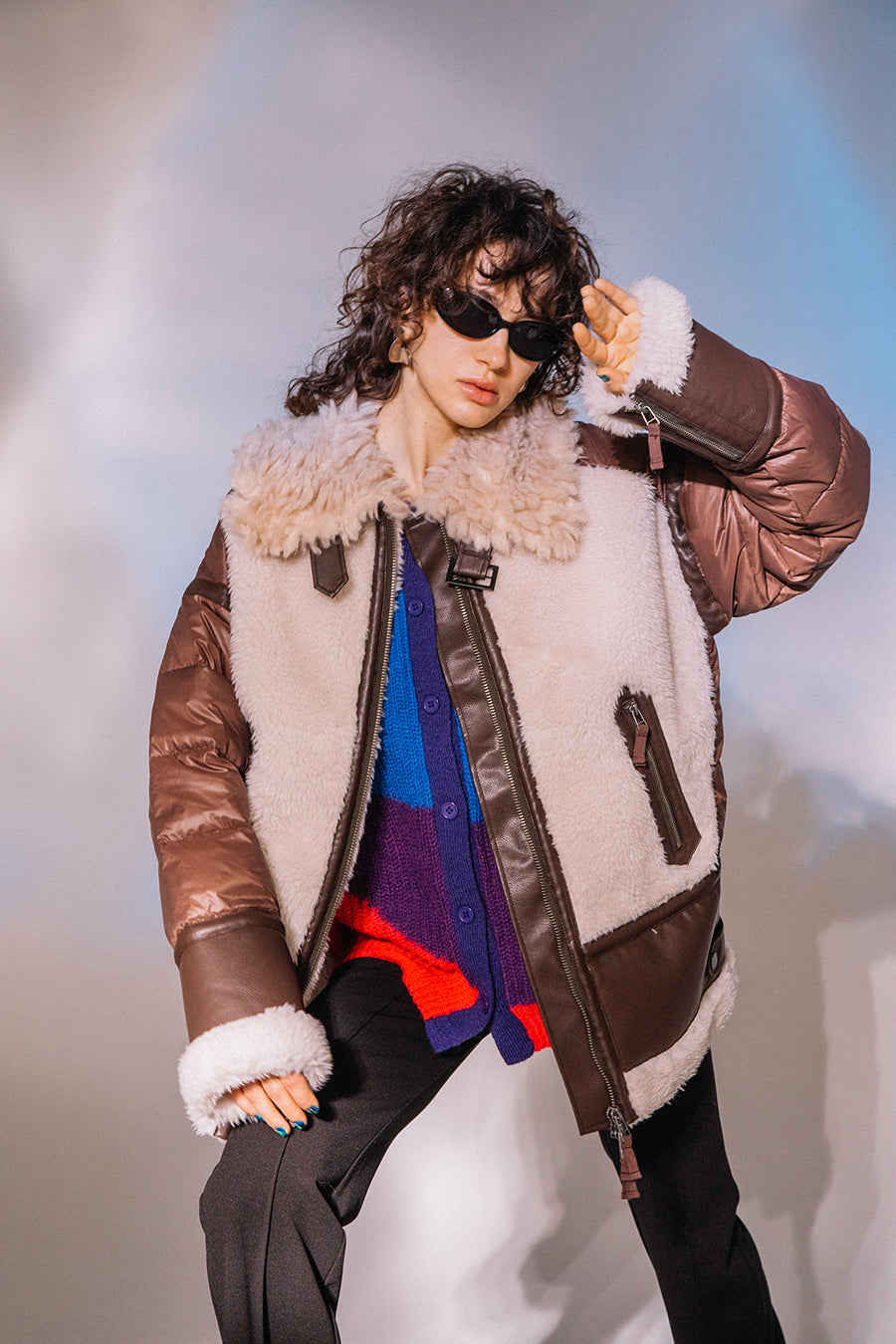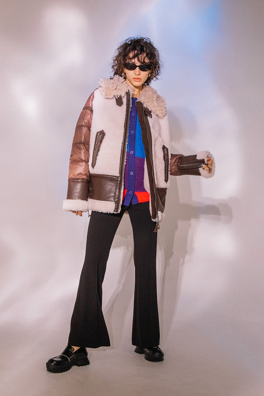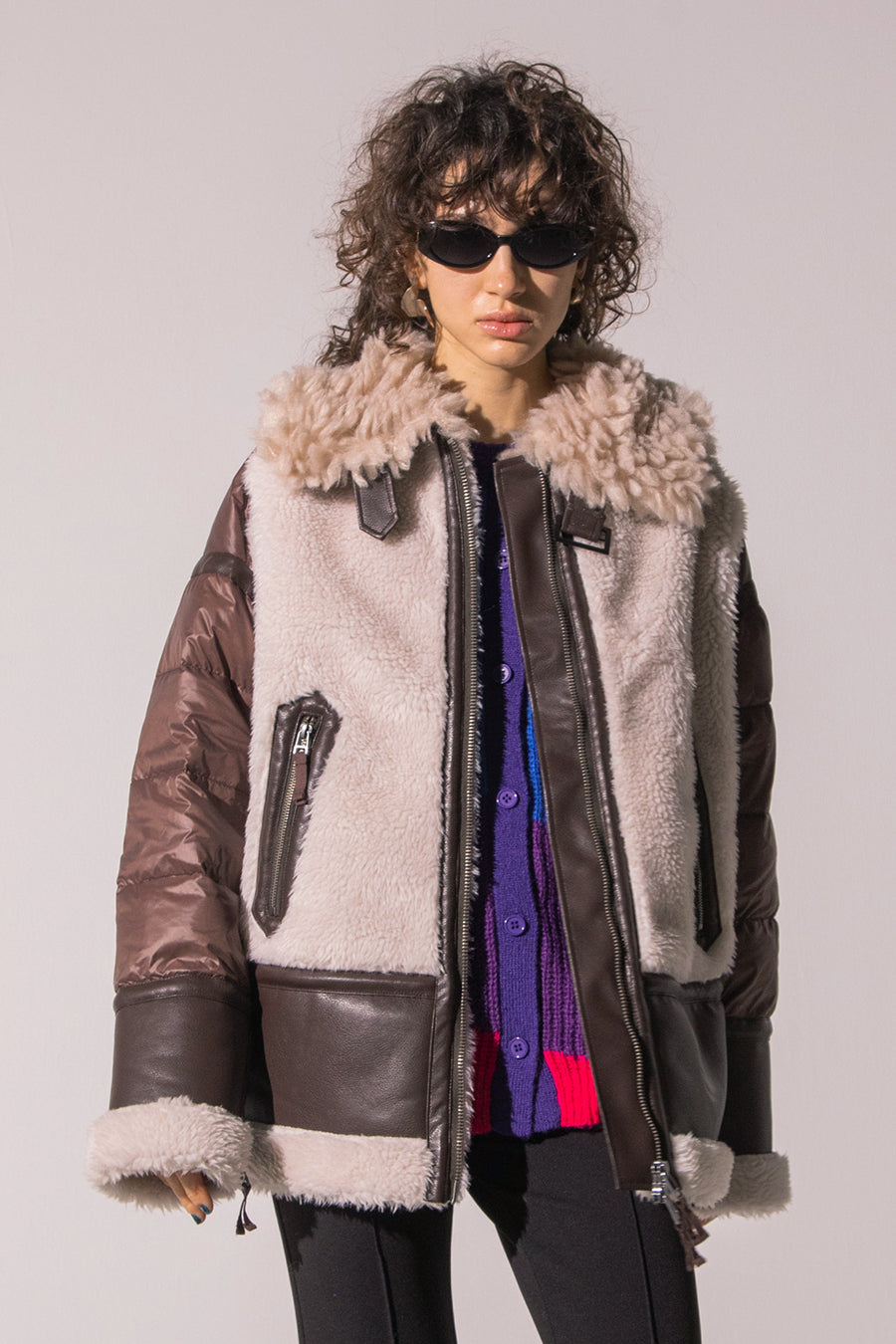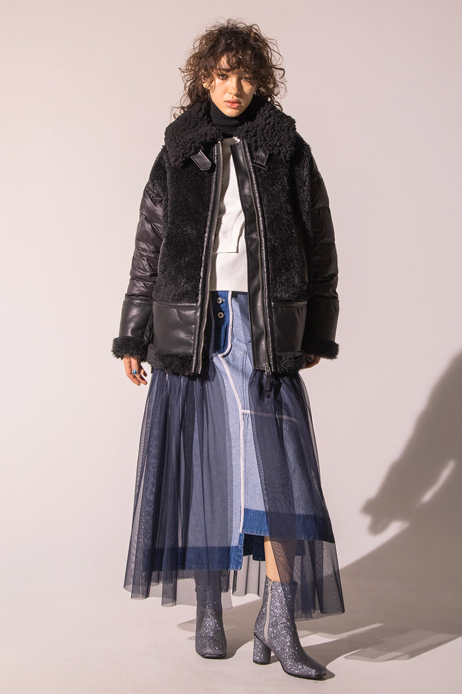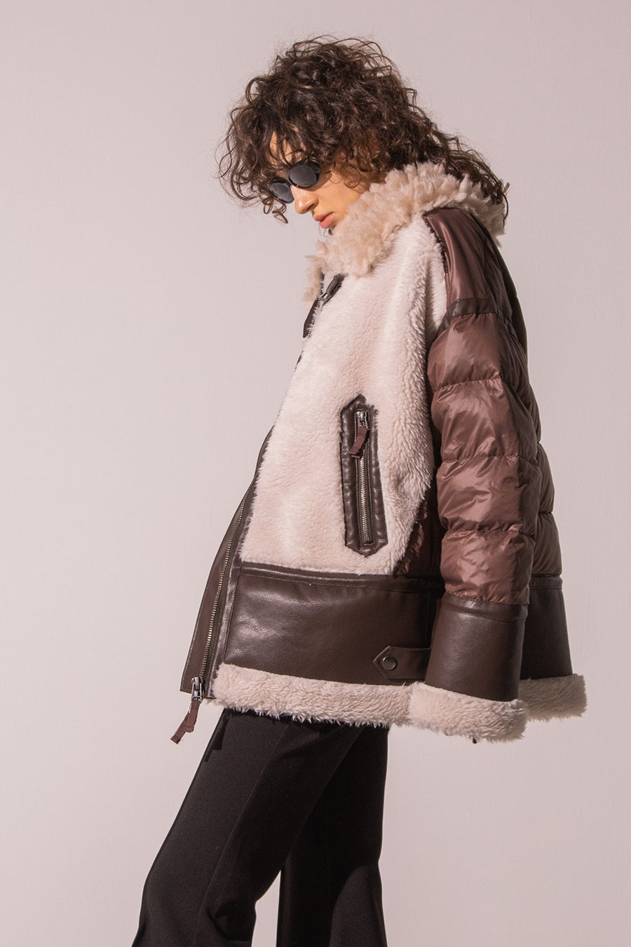 レザーとボアをボンディング加工し、フェイクムートンとタフタダウンをコンビネーションしたB-3ジャケットです。
