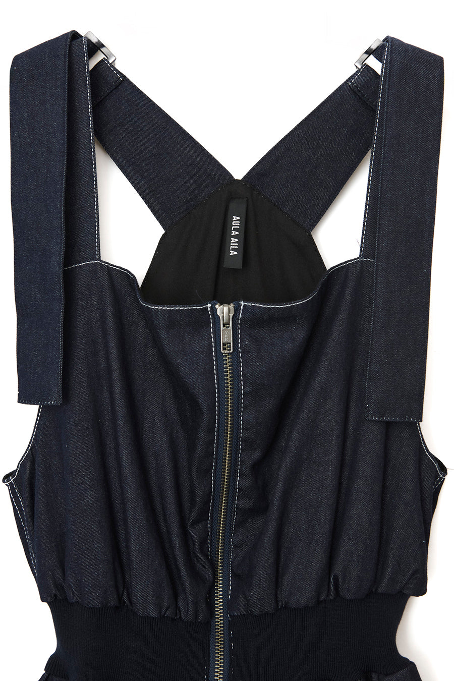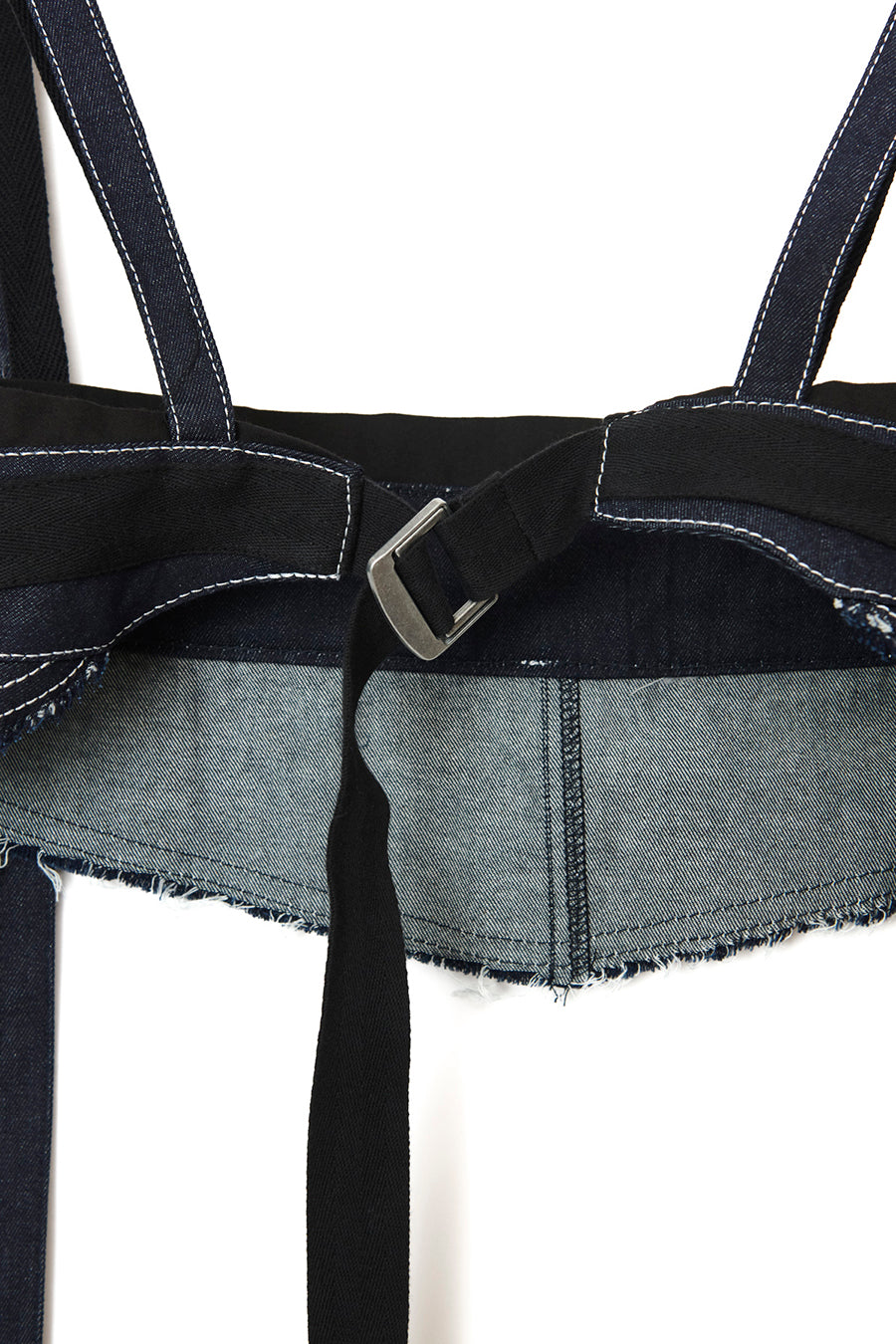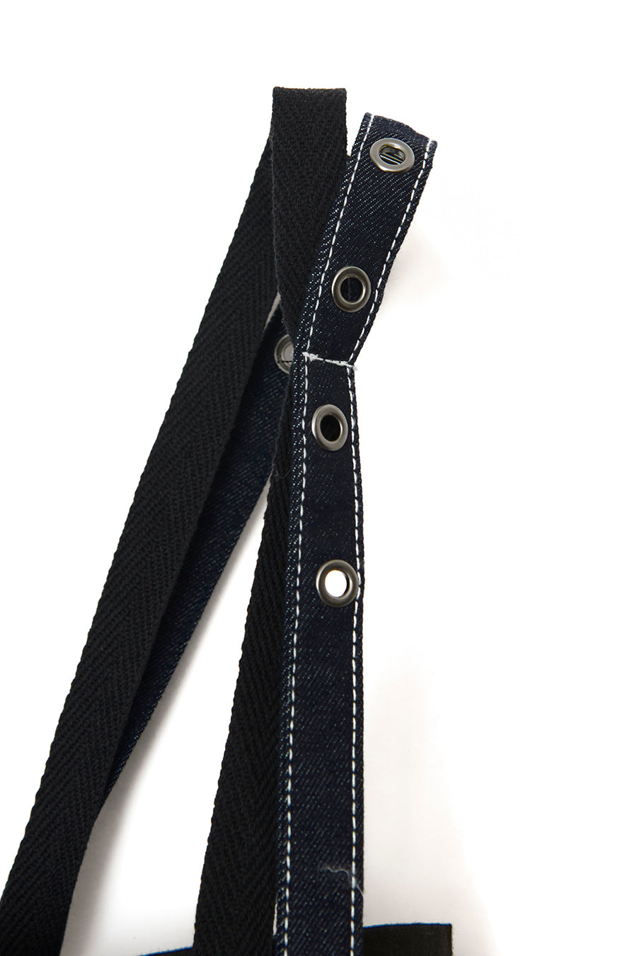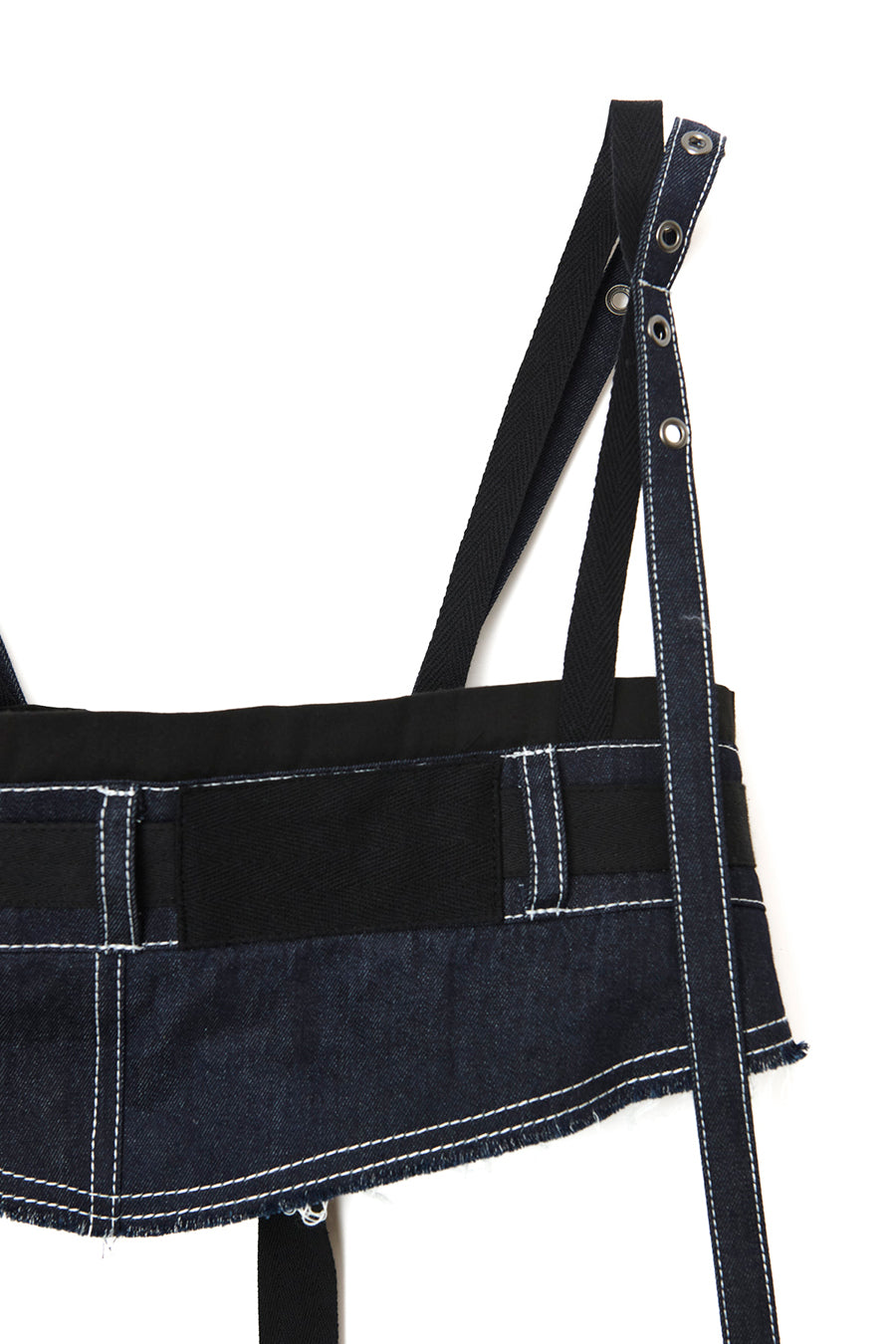 ニムを洗い加工して、配色の綾テープがベルトやパッチ、肩紐内側に使用されてデザインのポイントに。後ろベルトは、バックルでサイズ調整可能。ジャンス