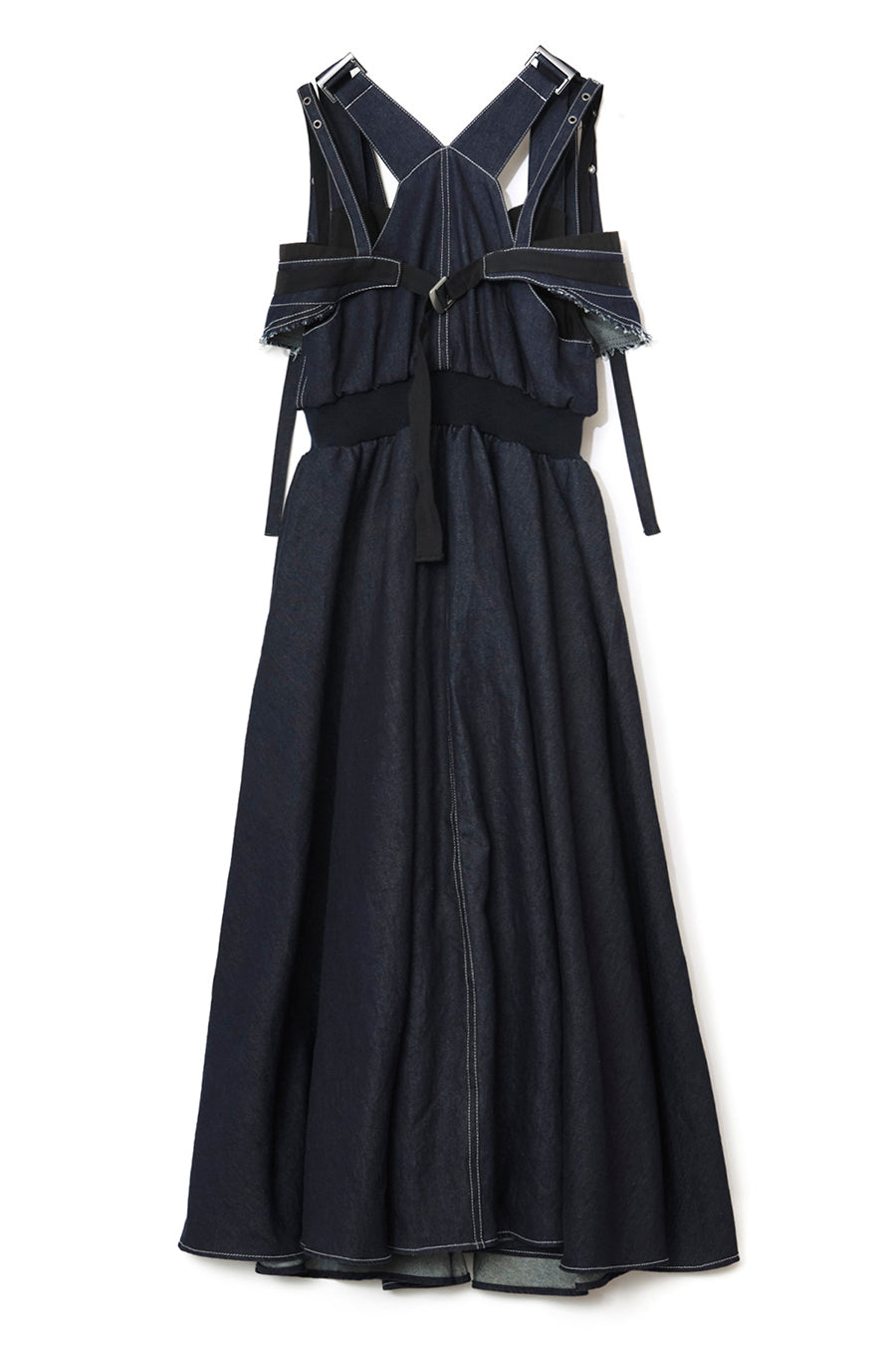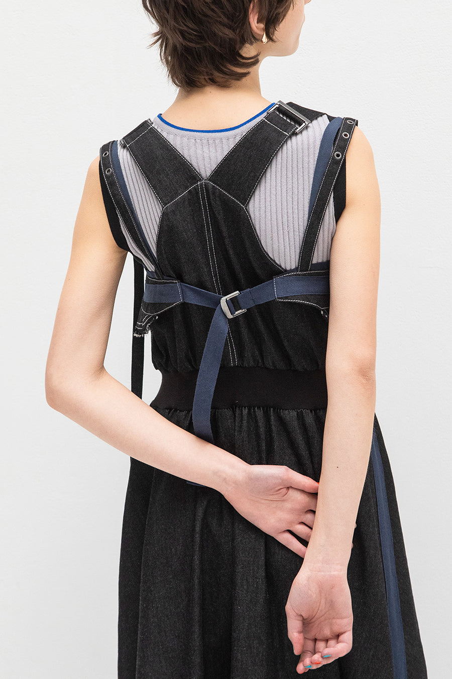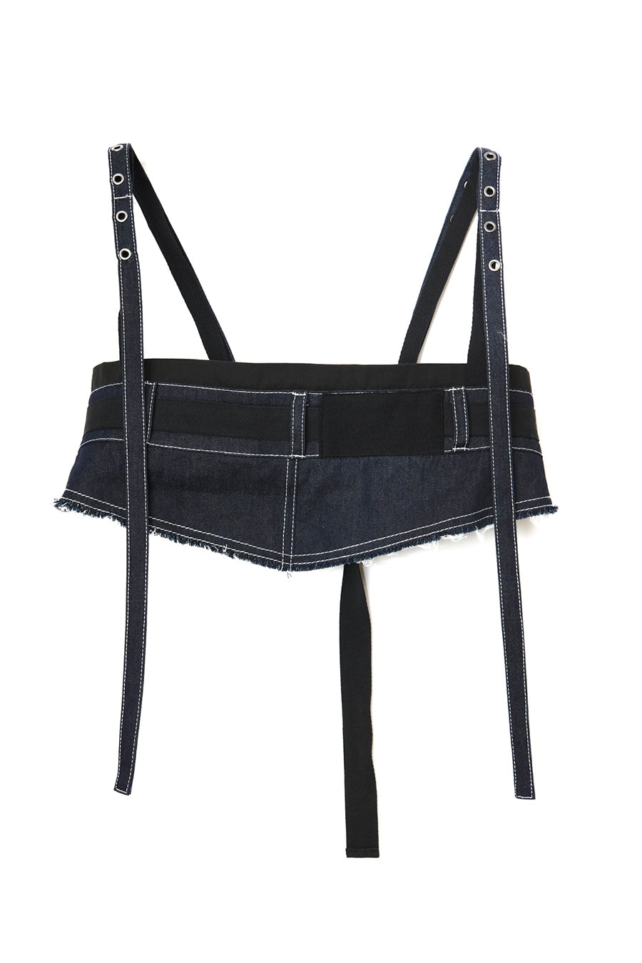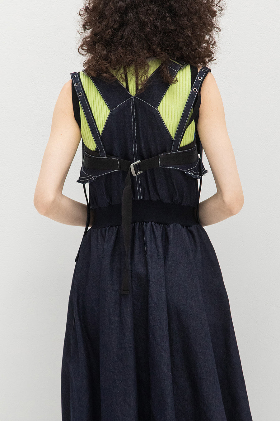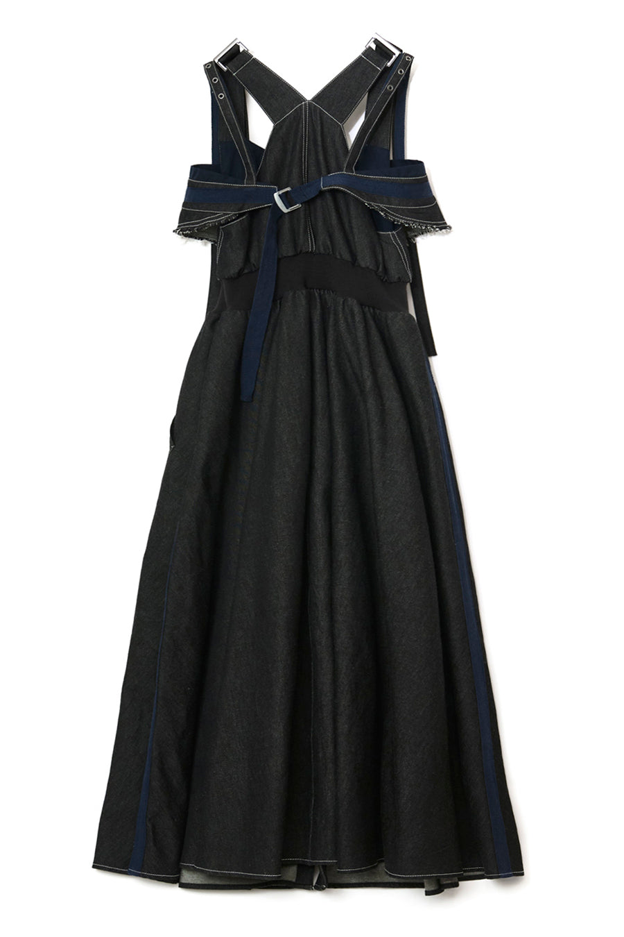 ニムを洗い加工して、配色の綾テープがベルトやパッチ、肩紐内側に使用されてデザインのポイントに。後ろベルトは、バックルでサイズ調整可能。ジャンス