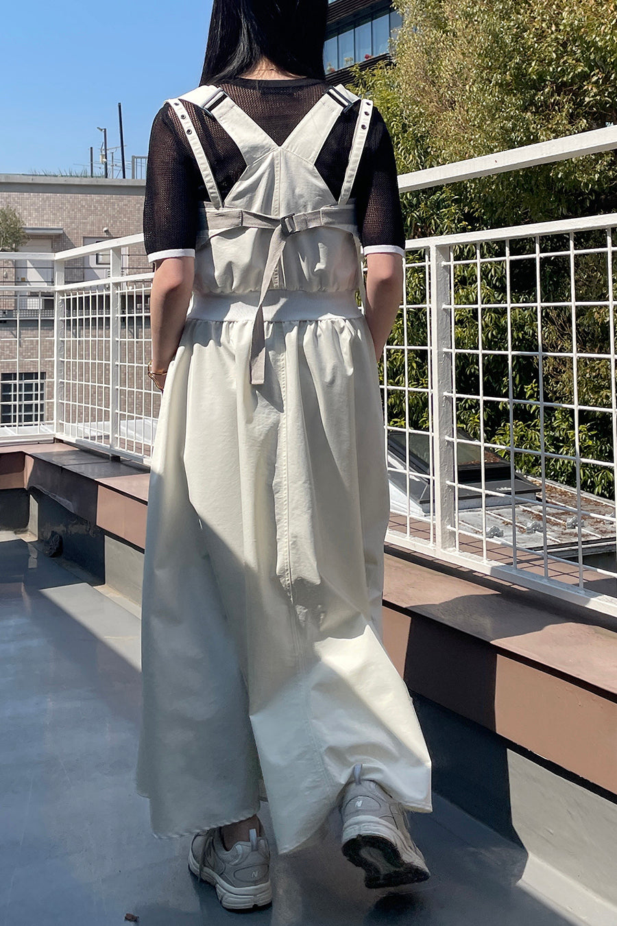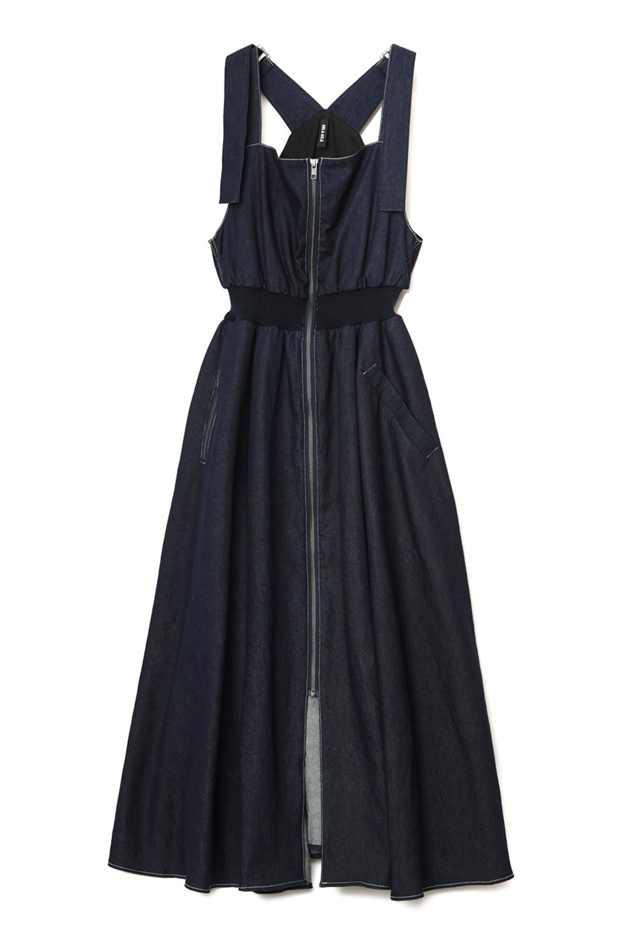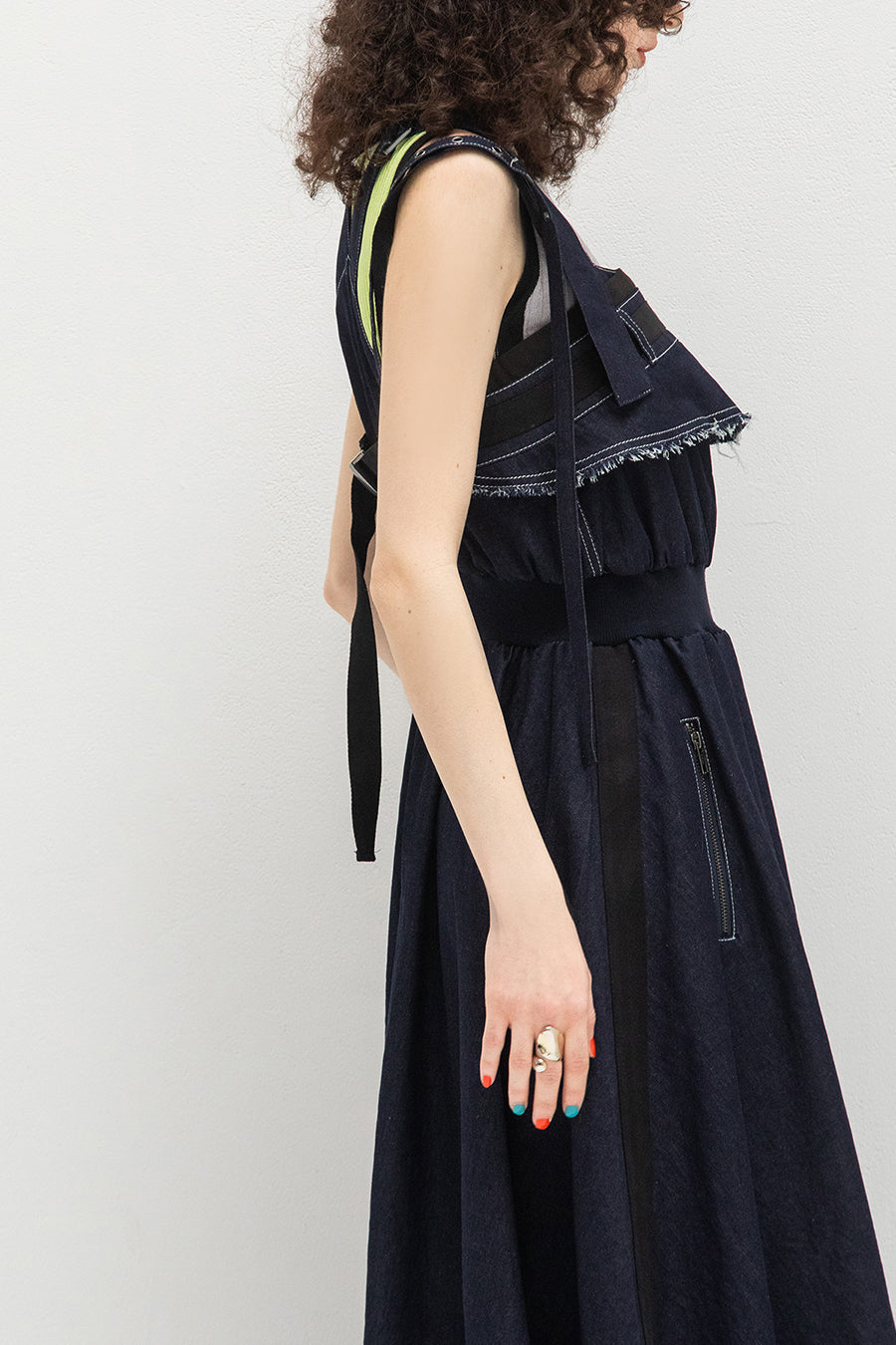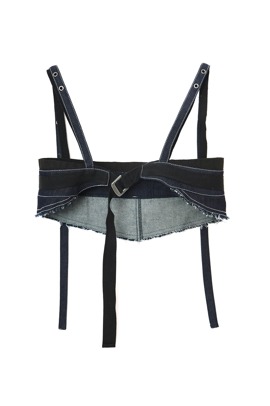 ニムを洗い加工して、配色の綾テープがベルトやパッチ、肩紐内側に使用されてデザインのポイントに。後ろベルトは、バックルでサイズ調整可能。ジャンス