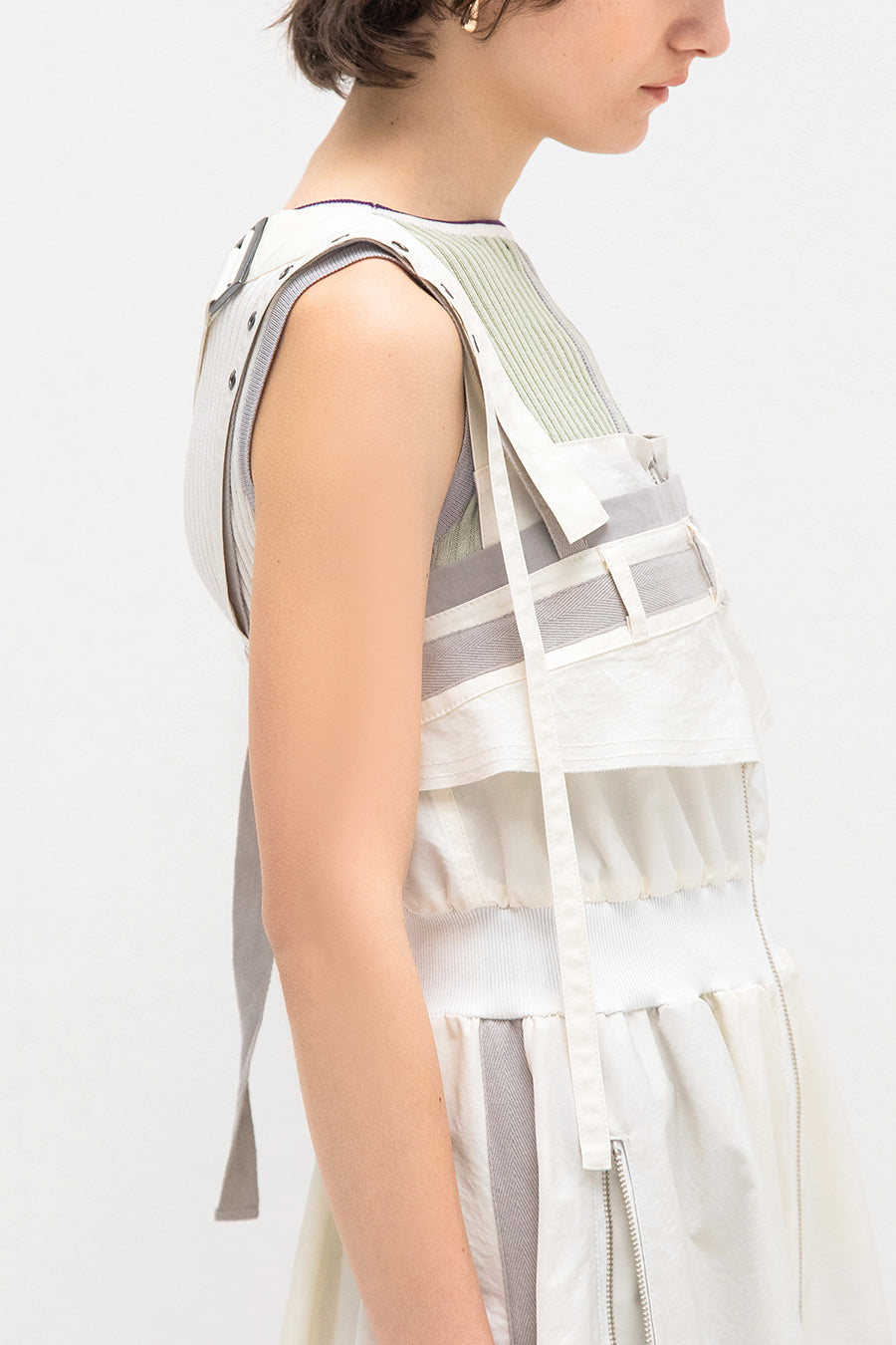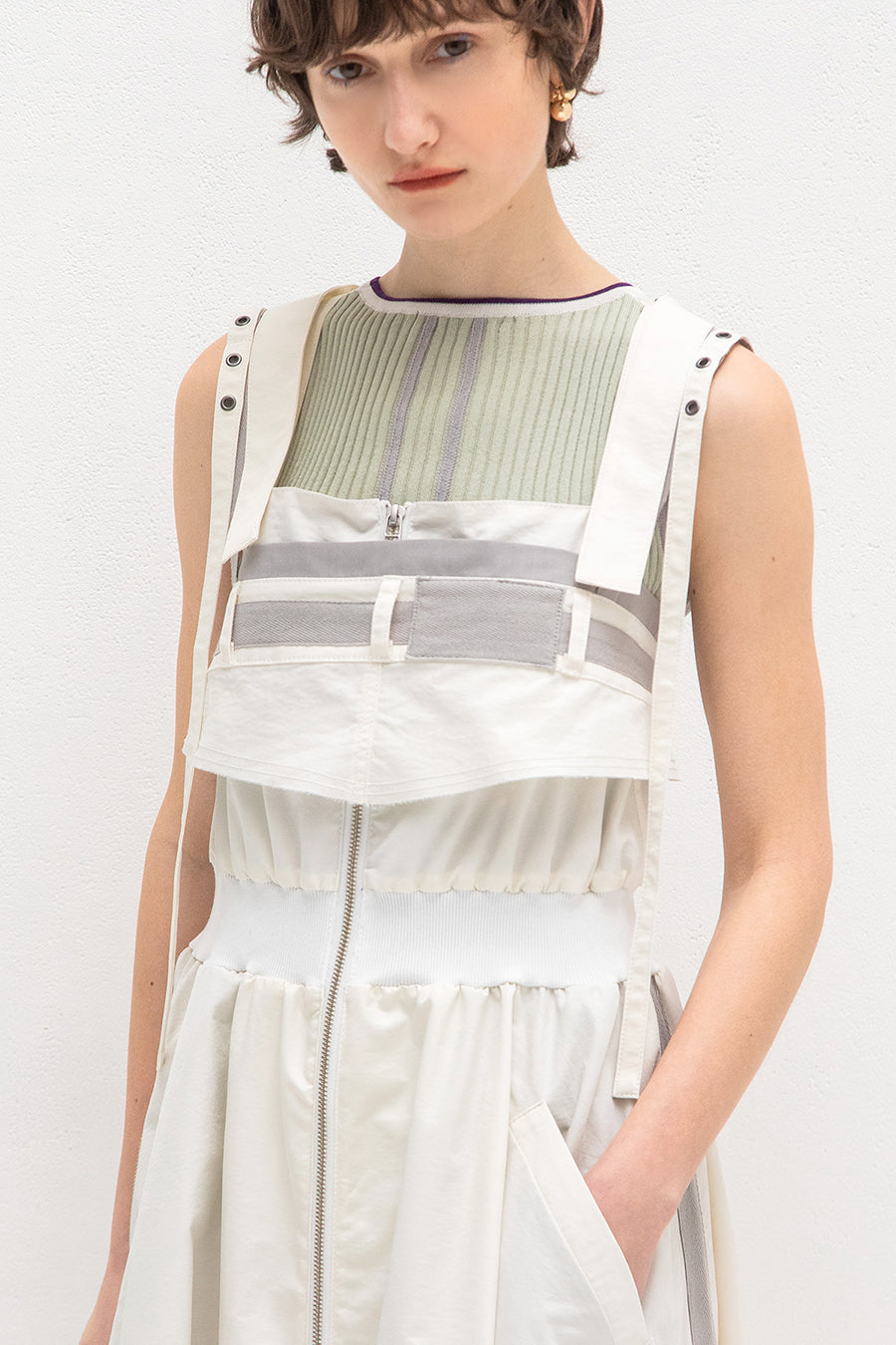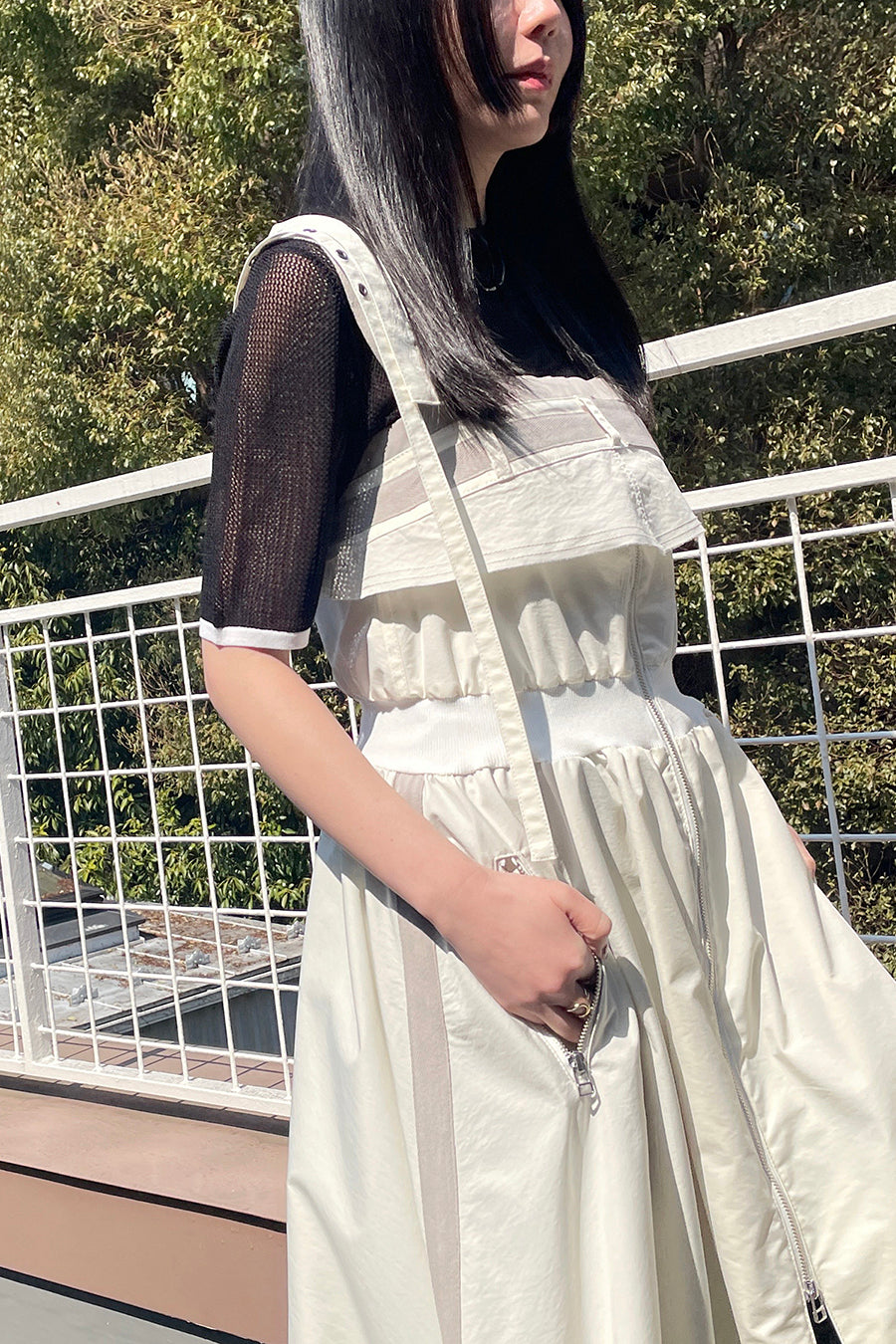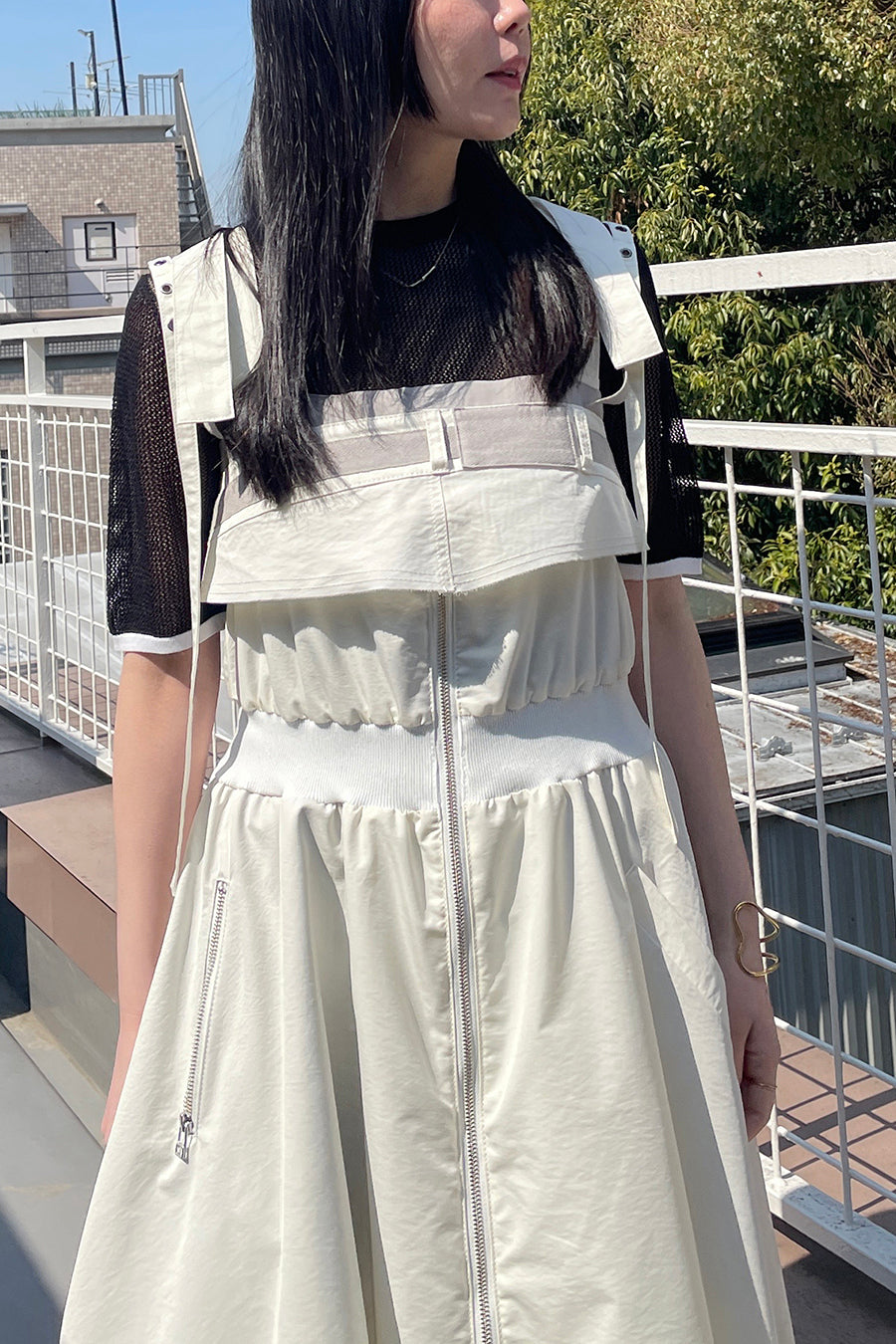 も◎肩紐は長さをバックルで調節が出来き、フロントはダブルジップアップなので、裾を開けてボトムやレギンスをレイヤードしてジレ風にも着用可能。ホワイ