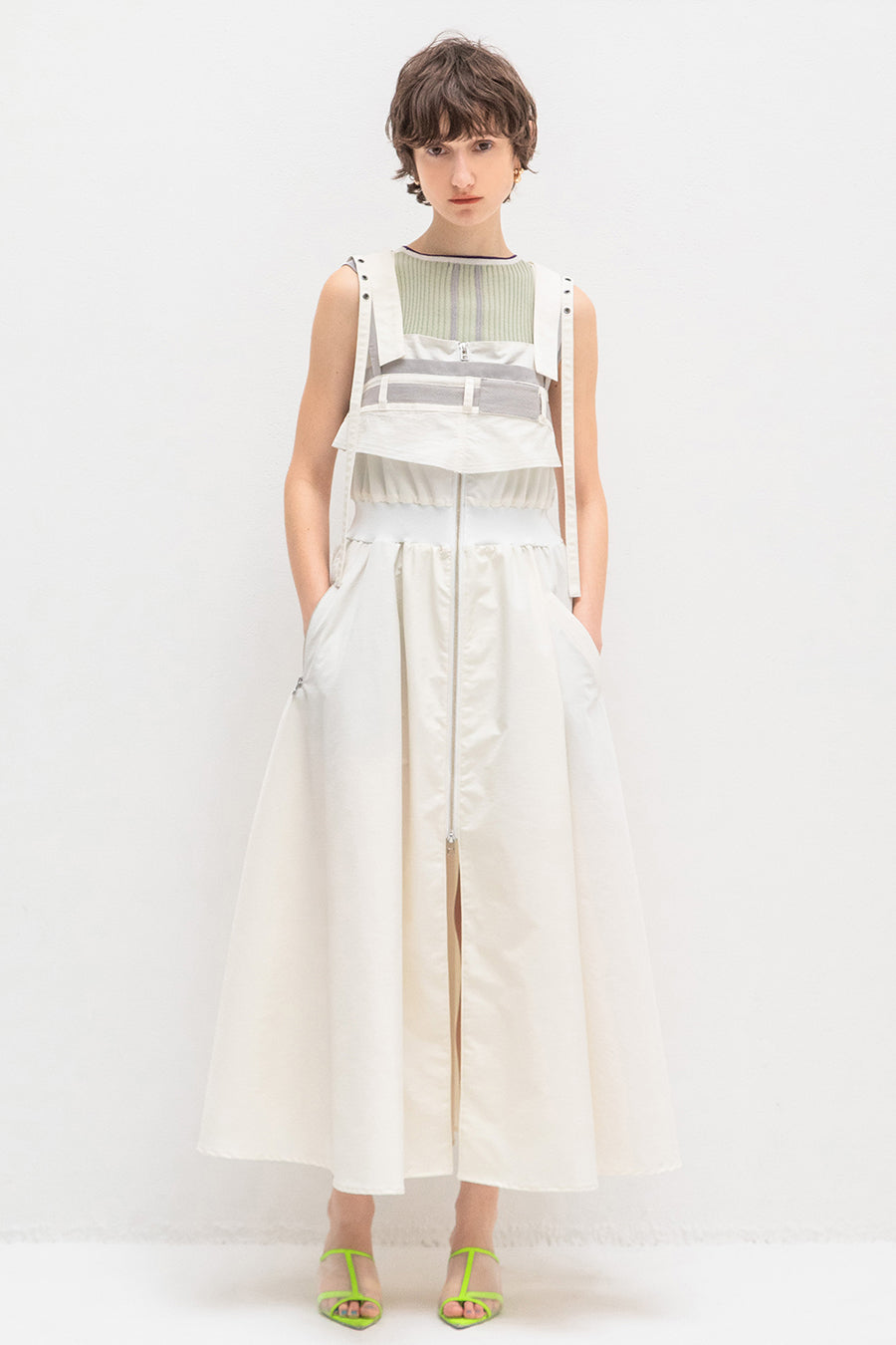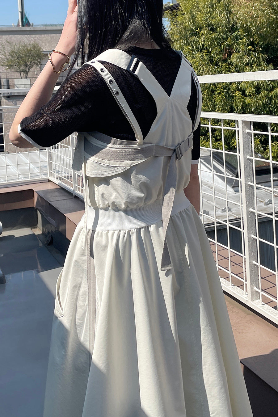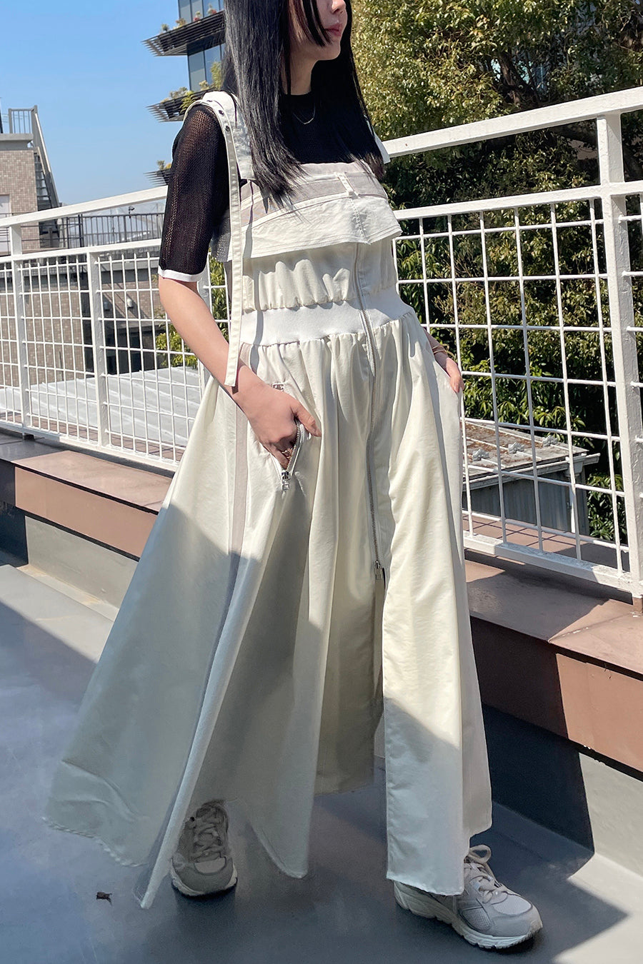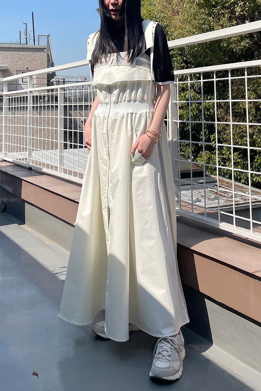 も◎肩紐は長さをバックルで調節が出来き、フロントはダブルジップアップなので、裾を開けてボトムやレギンスをレイヤードしてジレ風にも着用可能。ホワイ