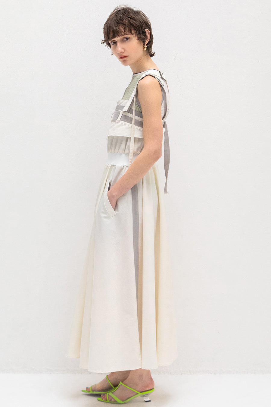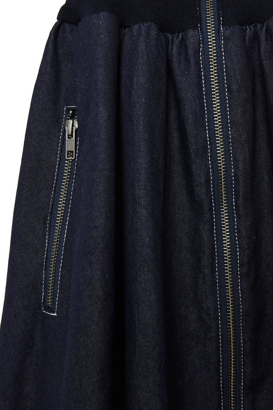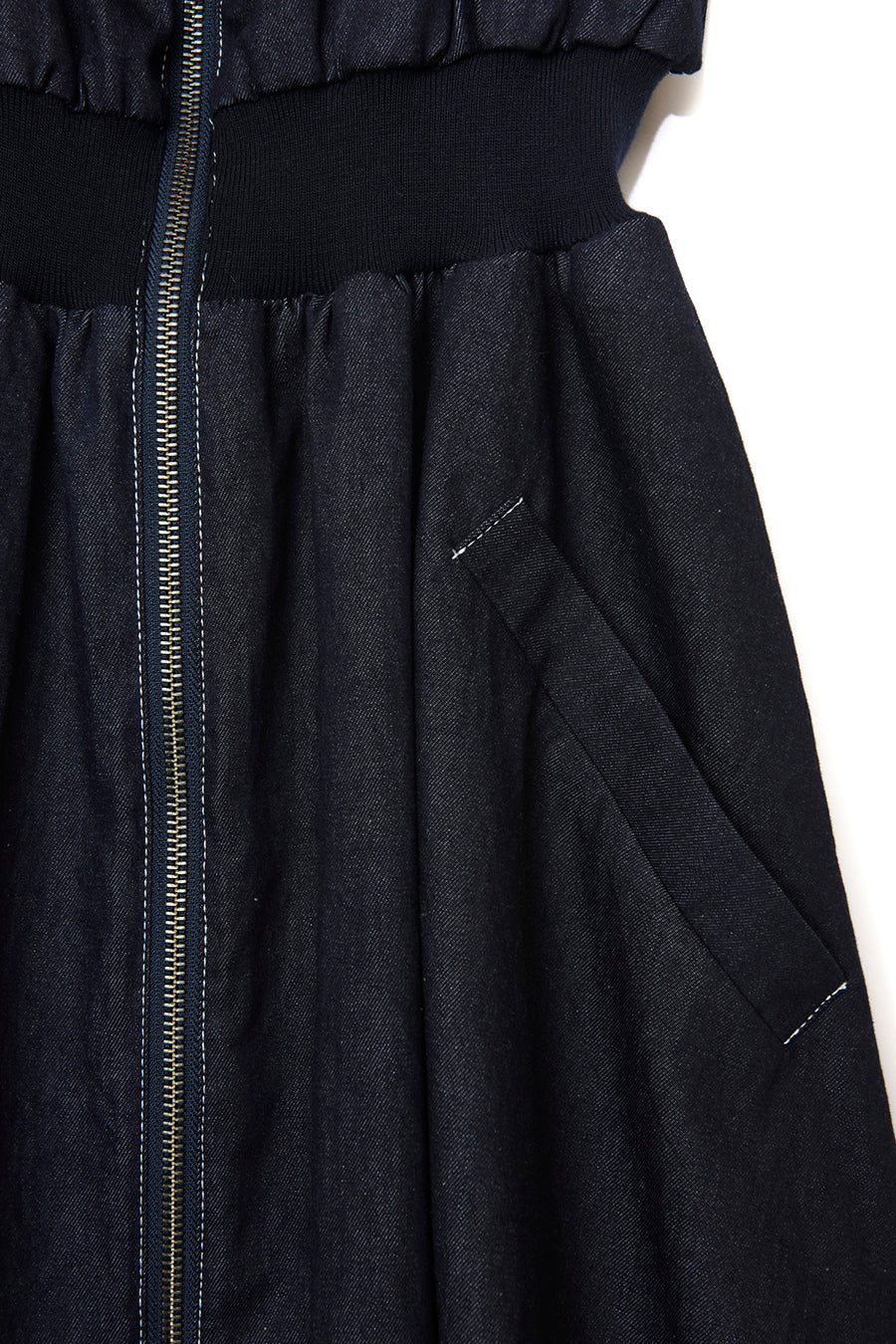 カのウエストはリブニットで絞られ、女性らしいフィット&フレアーライン。スカートの両脇には、配色綾テープを叩いているので縦長見えしスタイルアップ効果