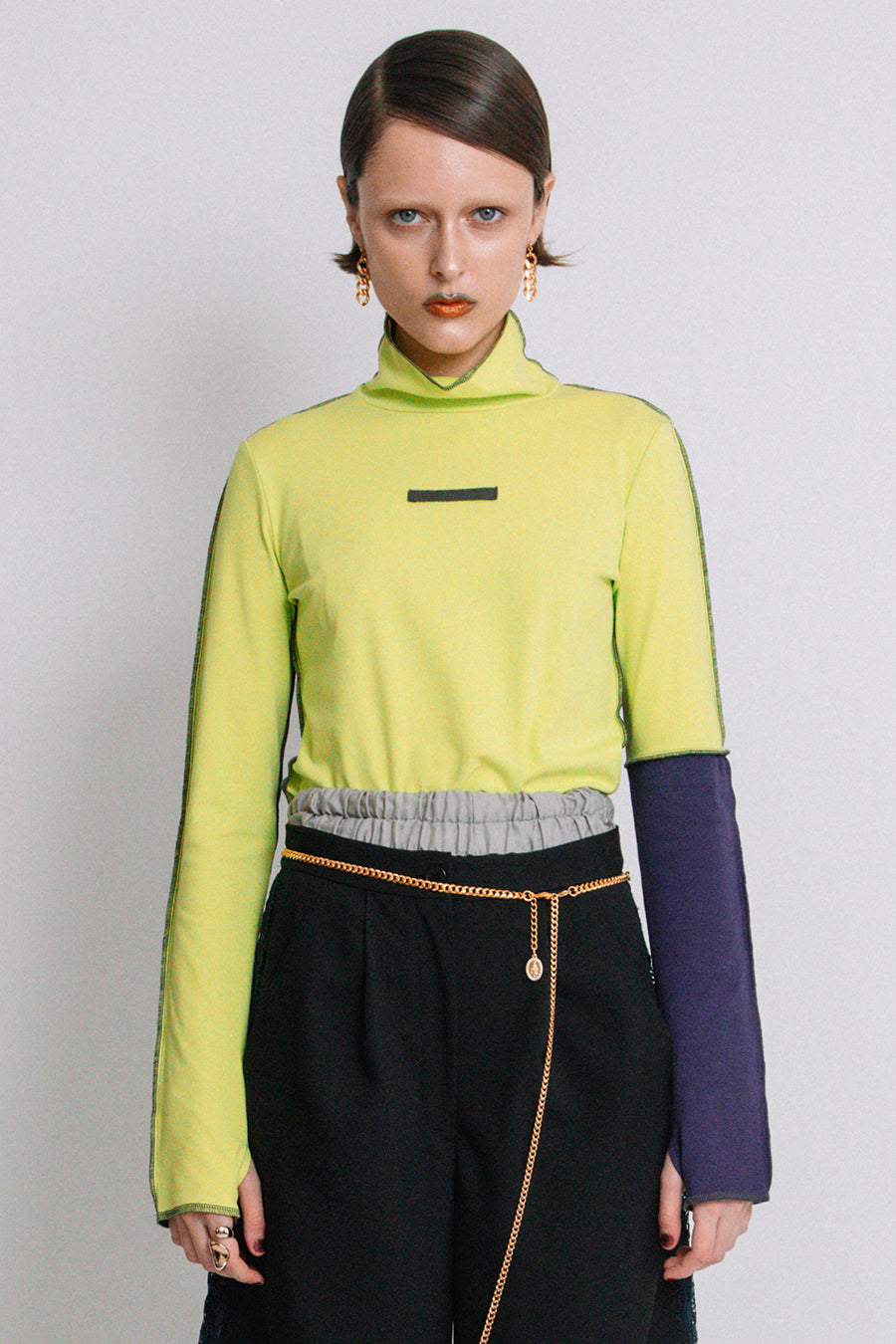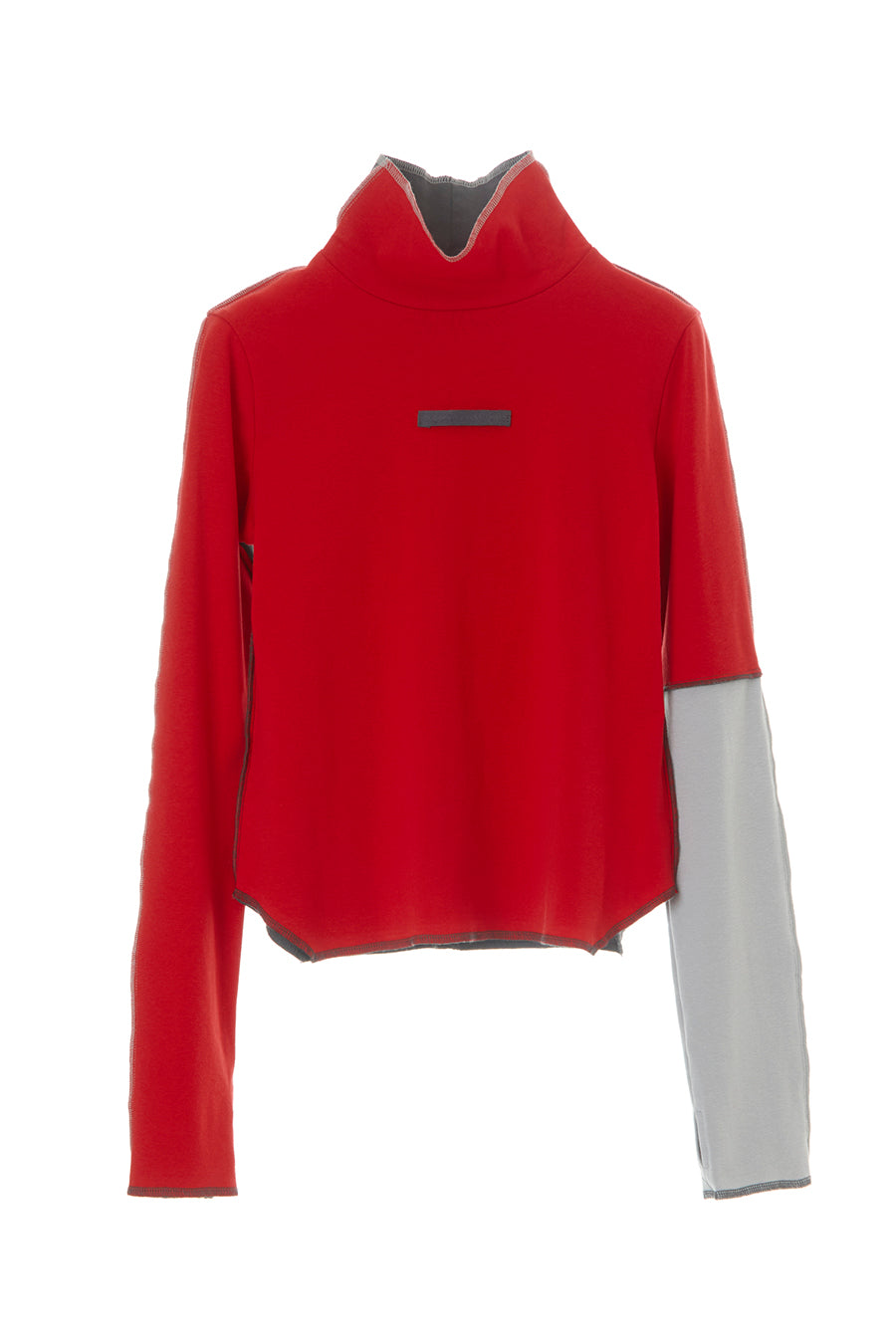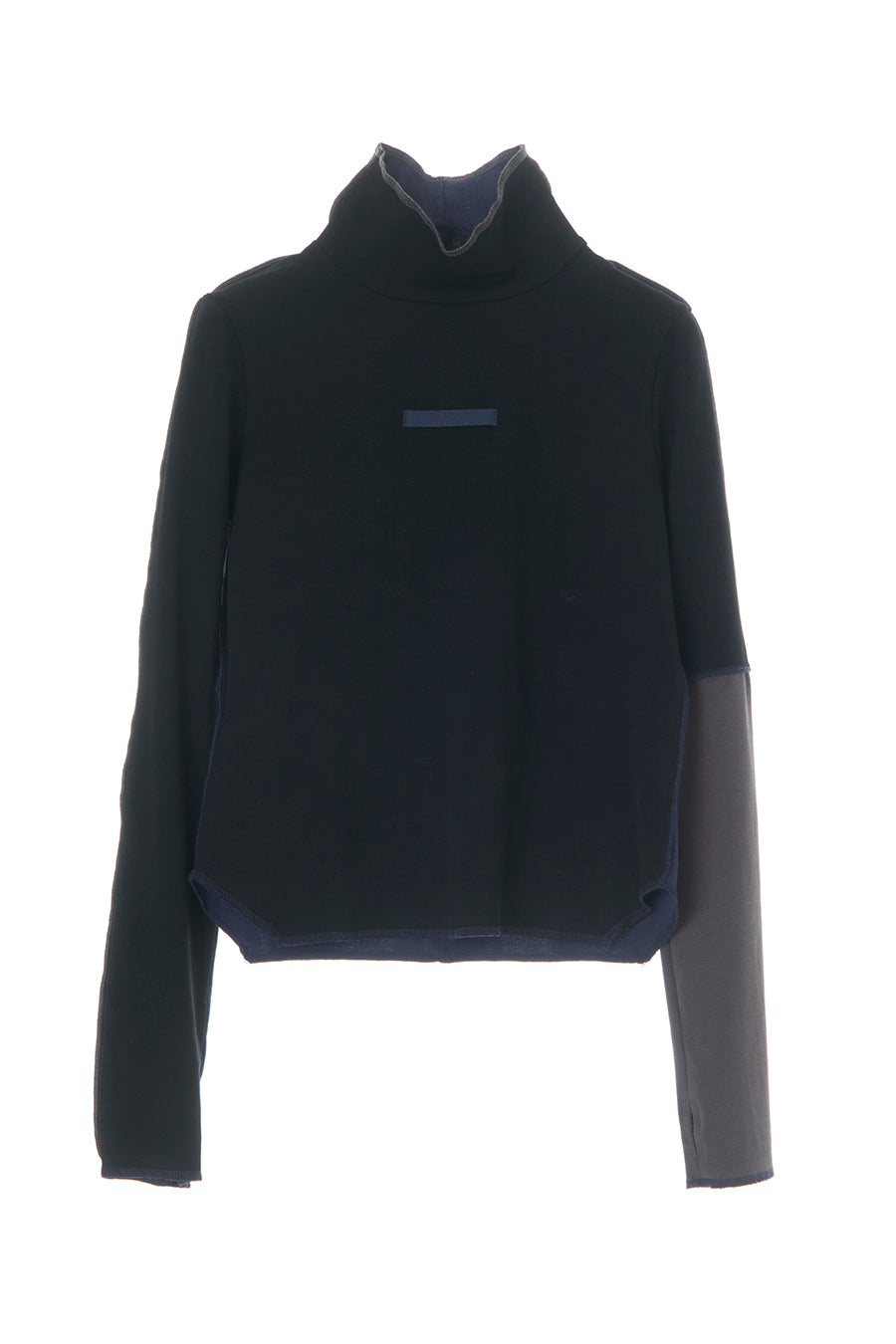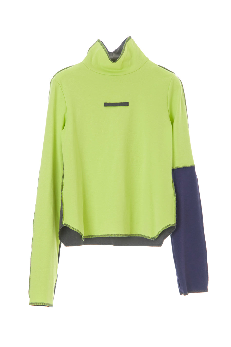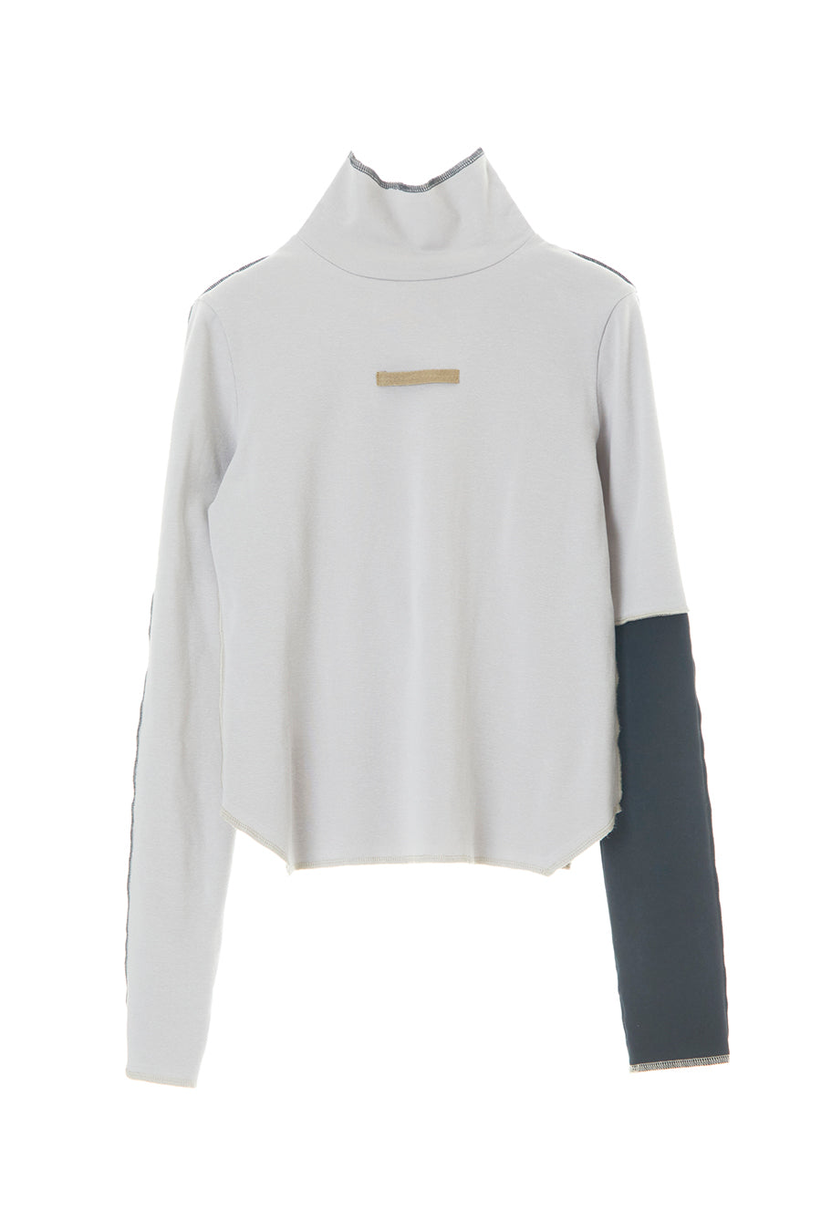 形はベーシックなハイネック長袖インナーながらも、大胆なカラー配色が目を惹き、レイヤードしてもスタイリングのポイントに。