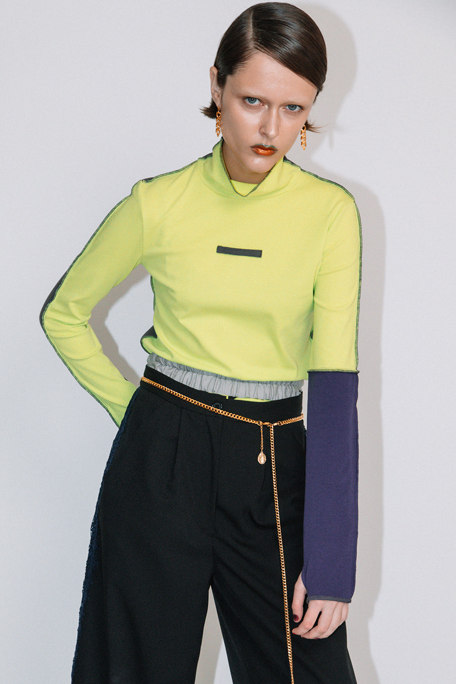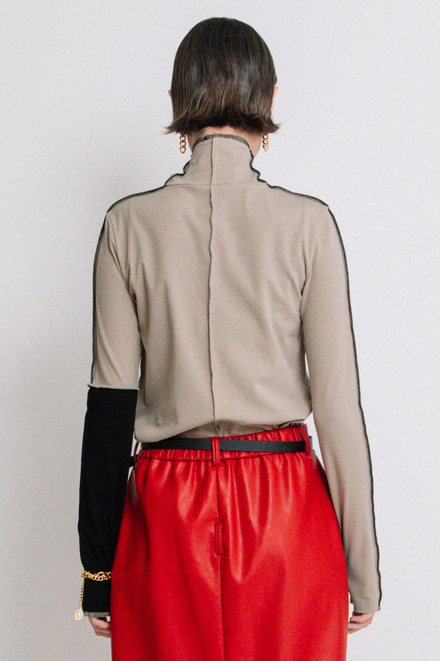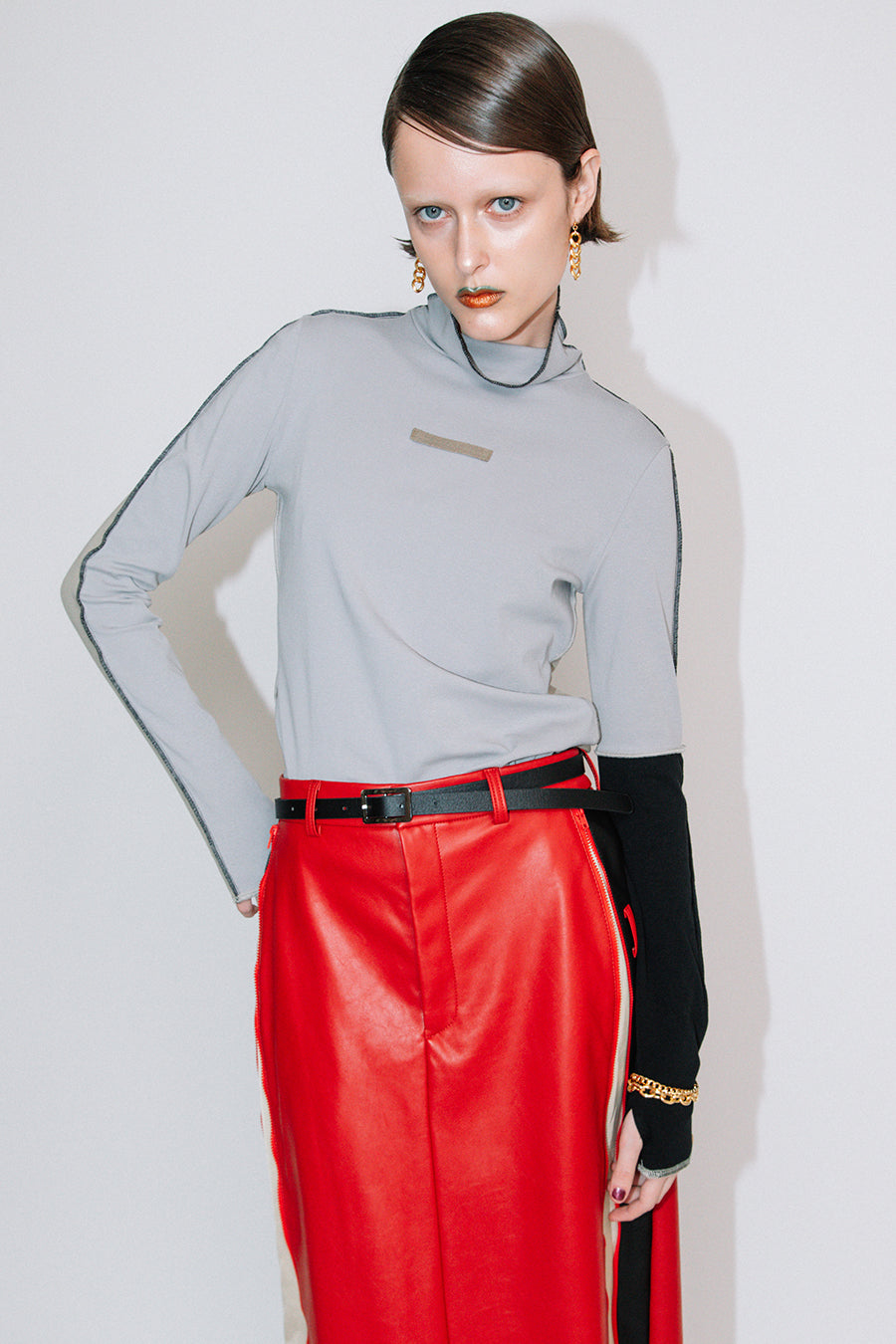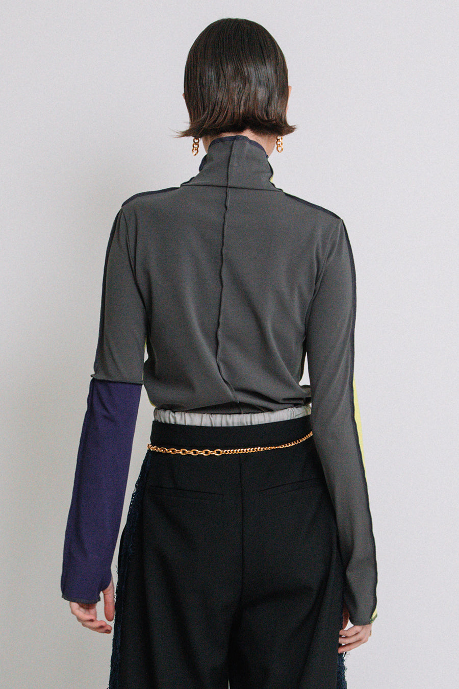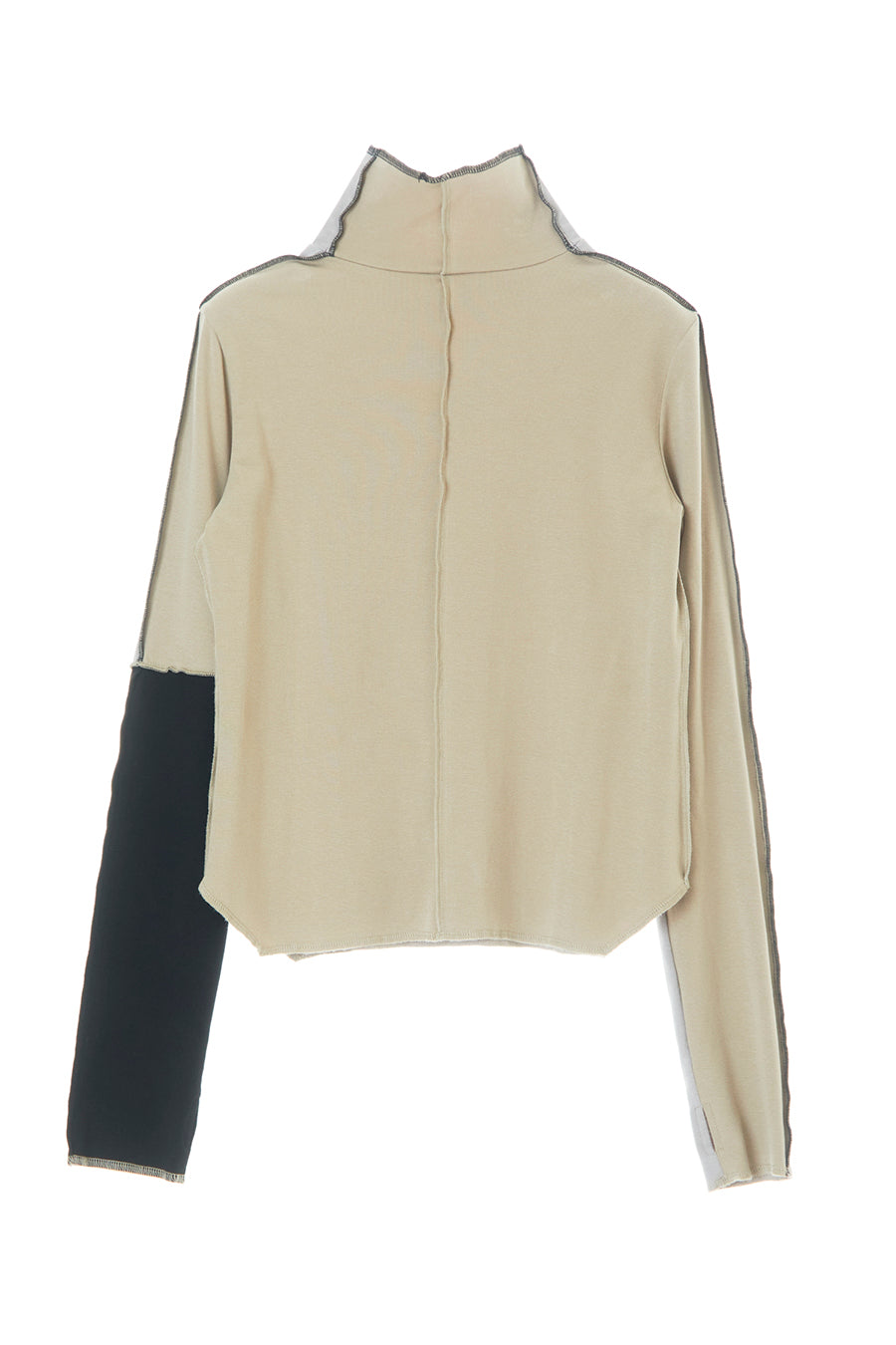 形はベーシックなハイネック長袖インナーながらも、大胆なカラー配色が目を惹き、レイヤードしてもスタイリングのポイントに。