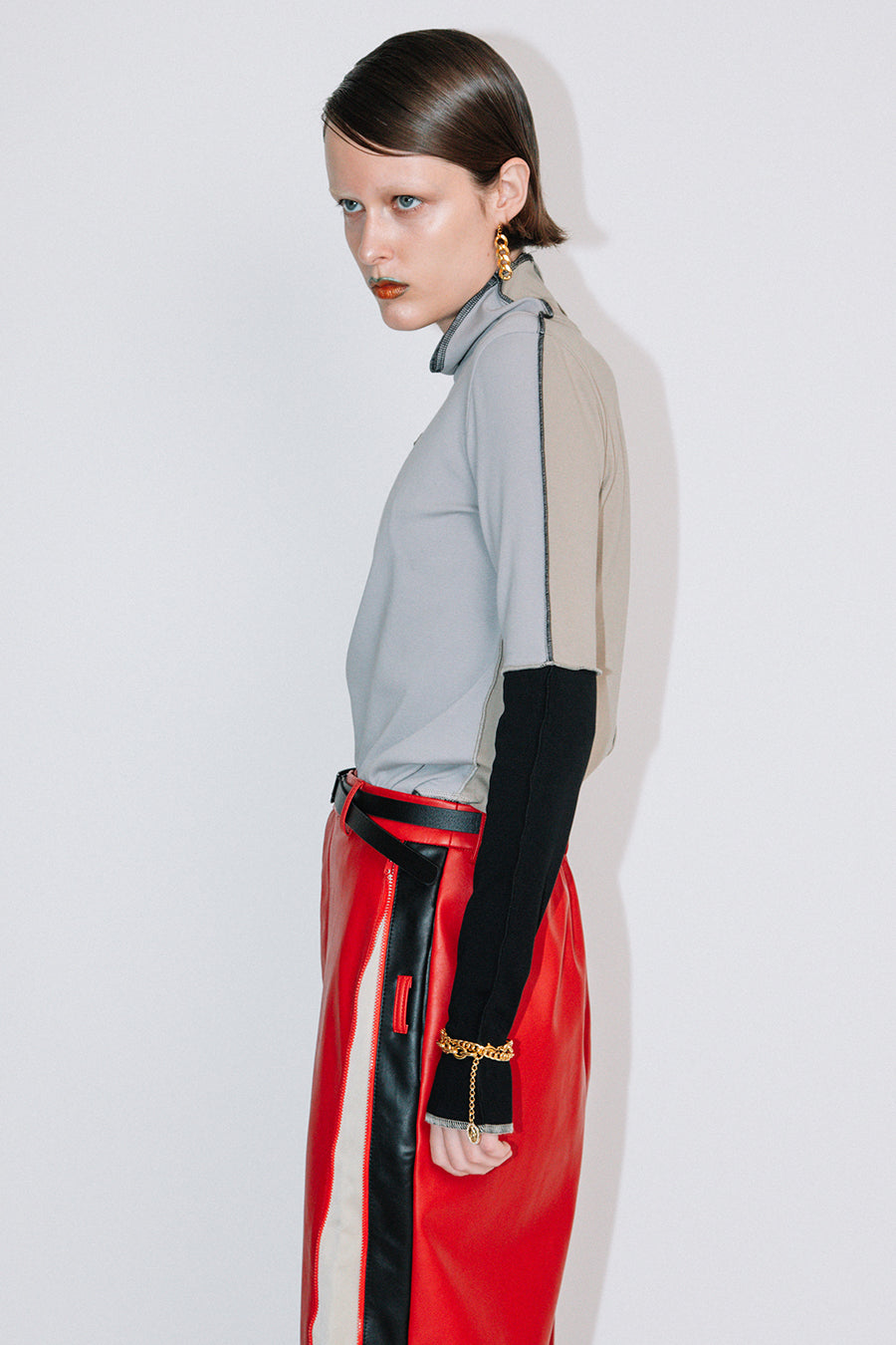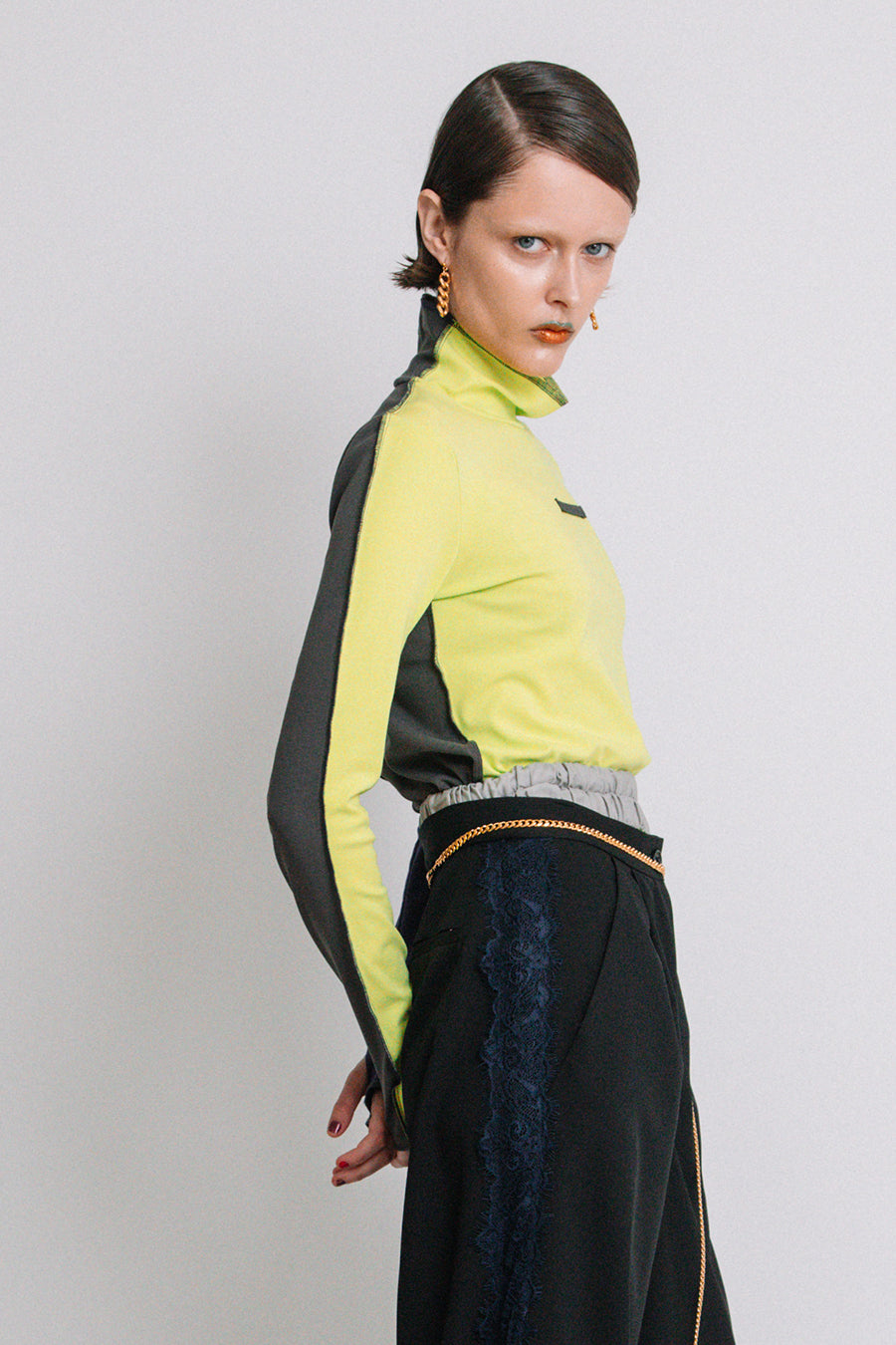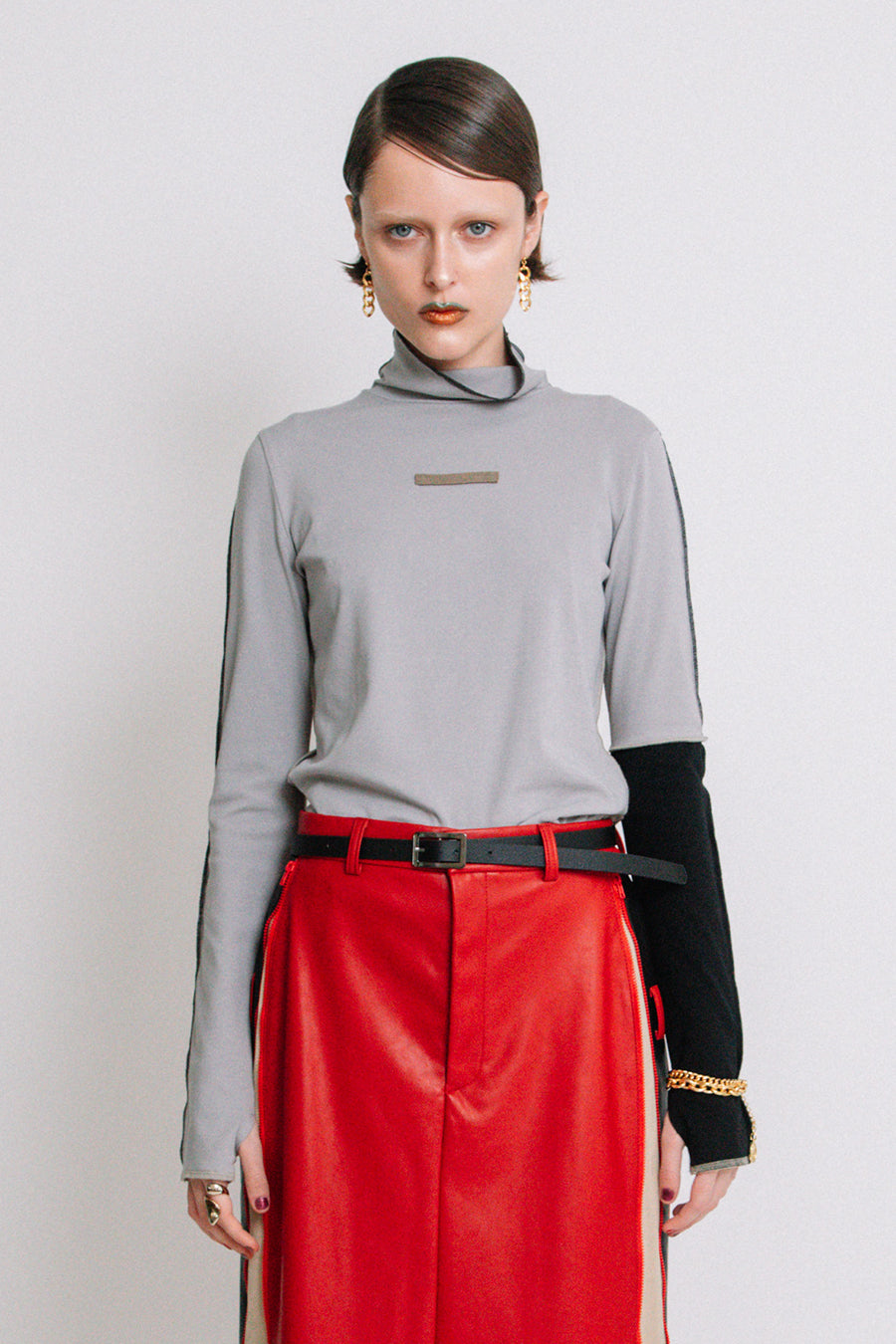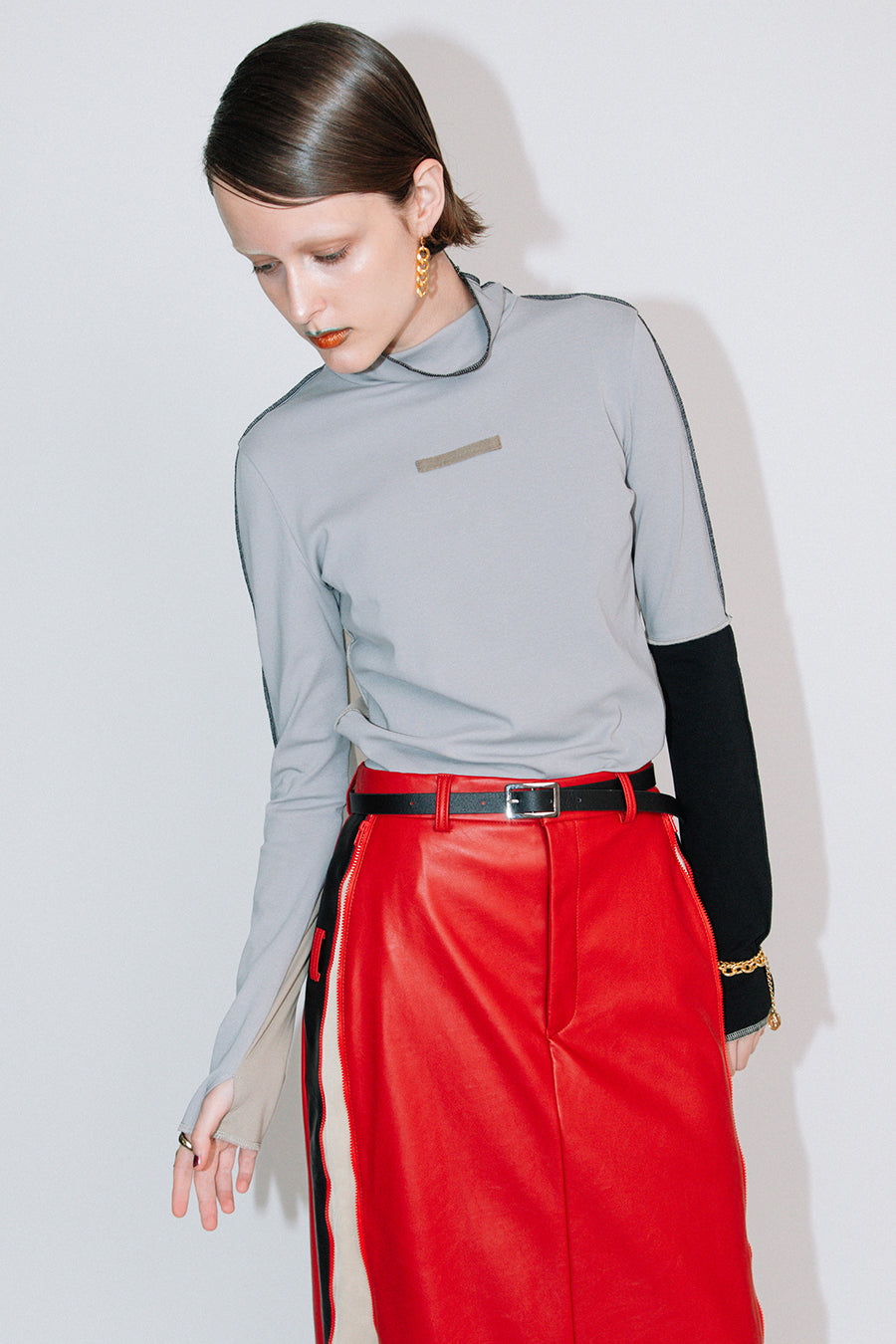 形はベーシックなハイネック長袖インナーながらも、大胆なカラー配色が目を惹き、レイヤードしてもスタイリングのポイントに。
