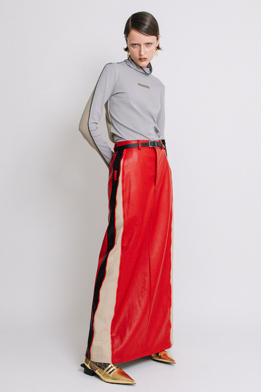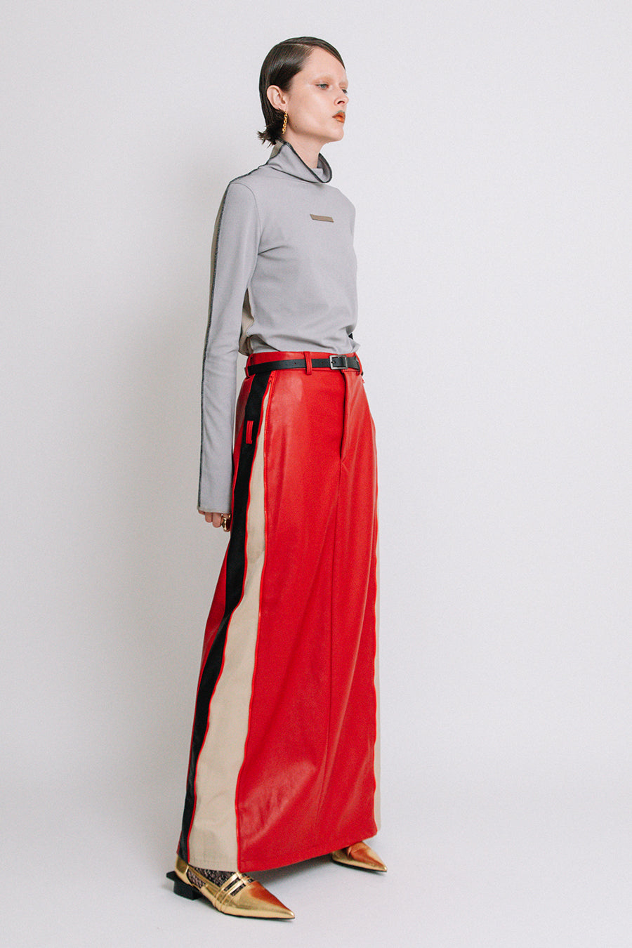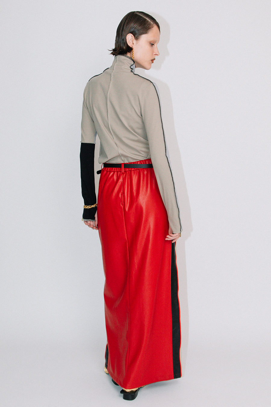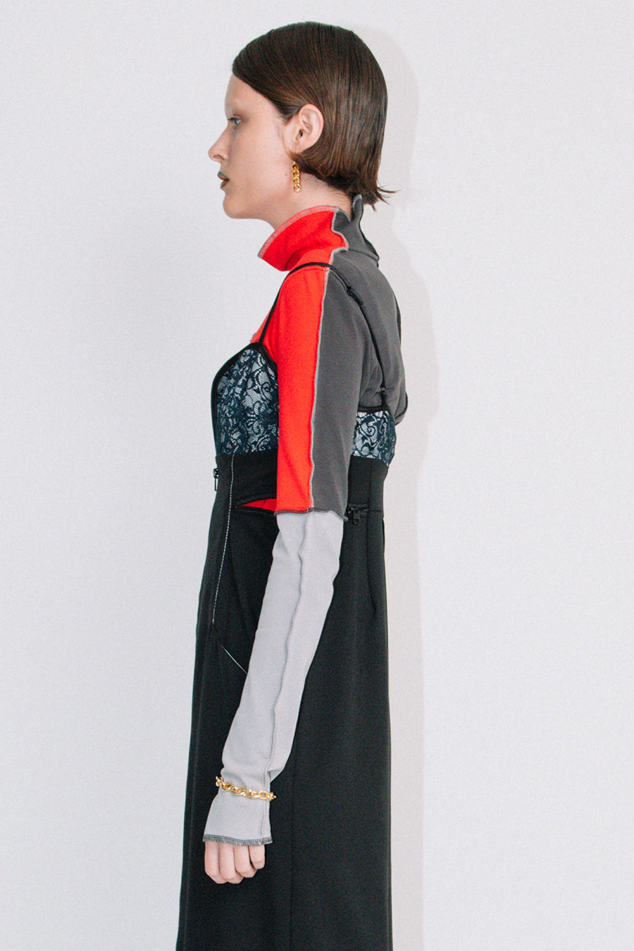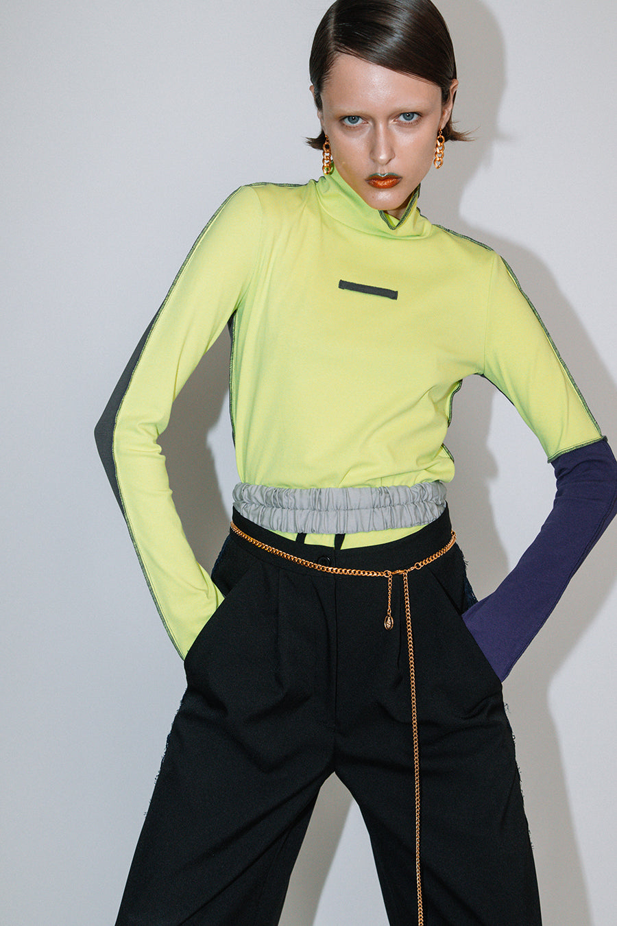 形はベーシックなハイネック長袖インナーながらも、大胆なカラー配色が目を惹き、レイヤードしてもスタイリングのポイントに。