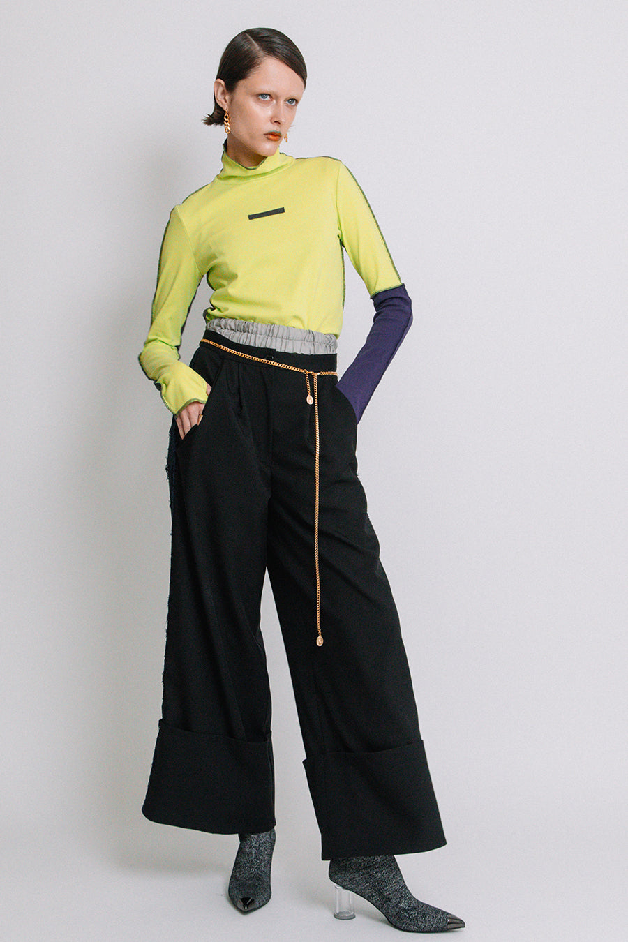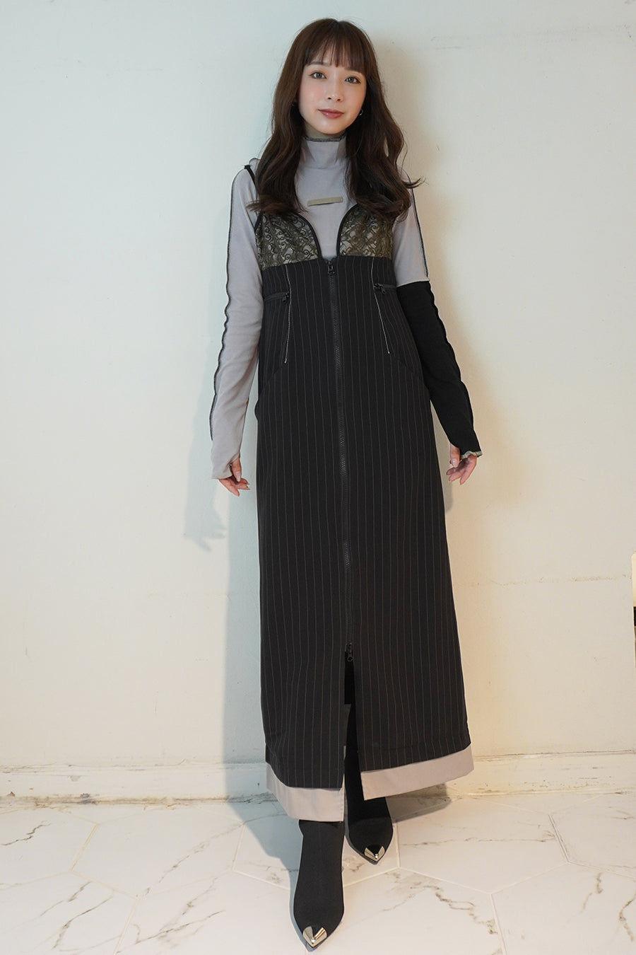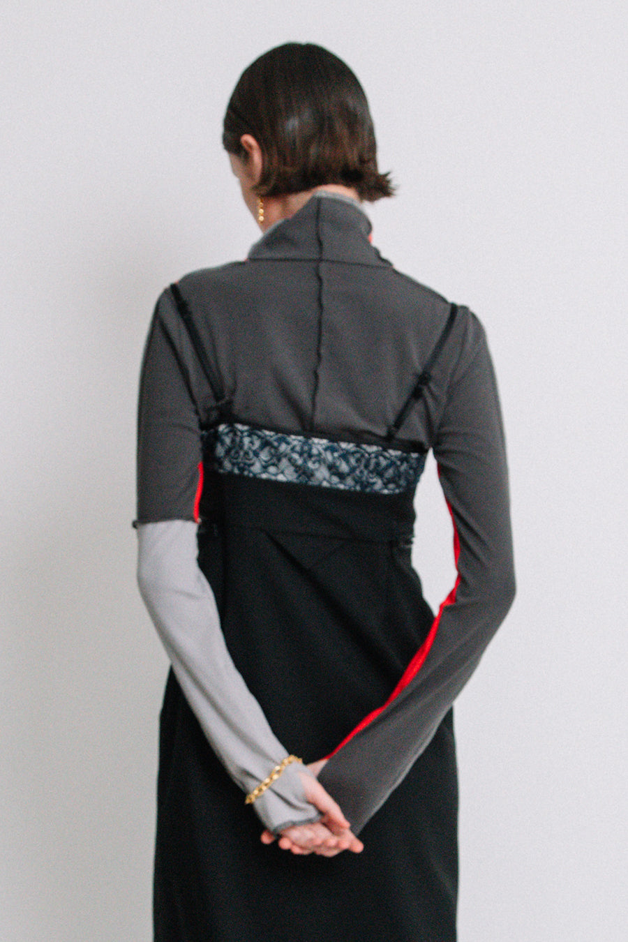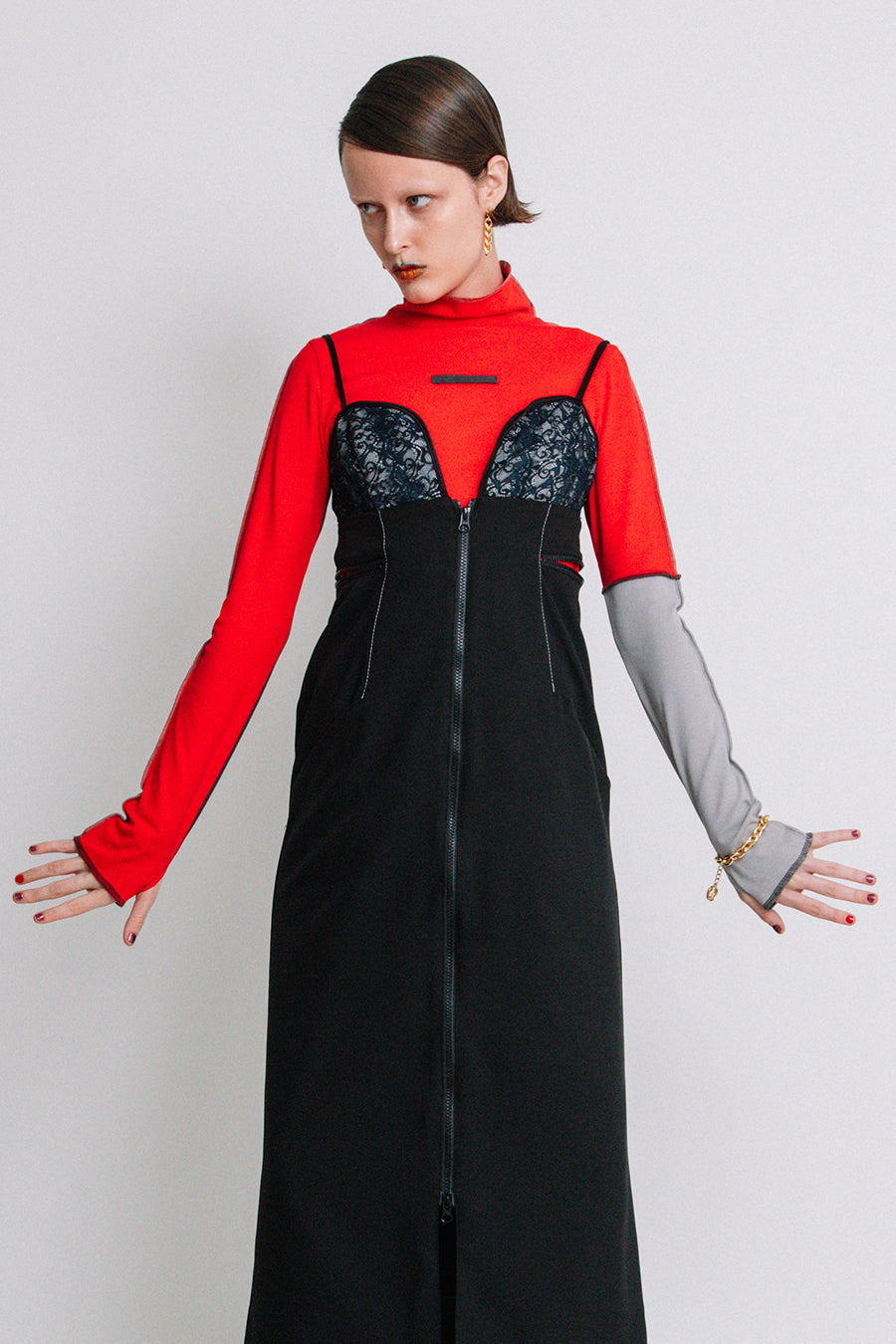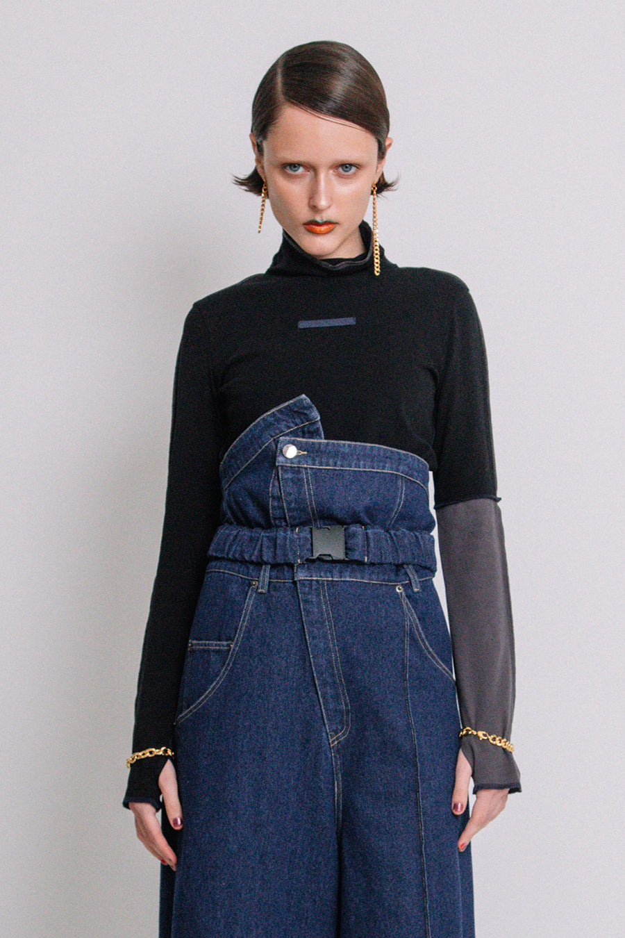 形はベーシックなハイネック長袖インナーながらも、大胆なカラー配色が目を惹き、レイヤードしてもスタイリングのポイントに。