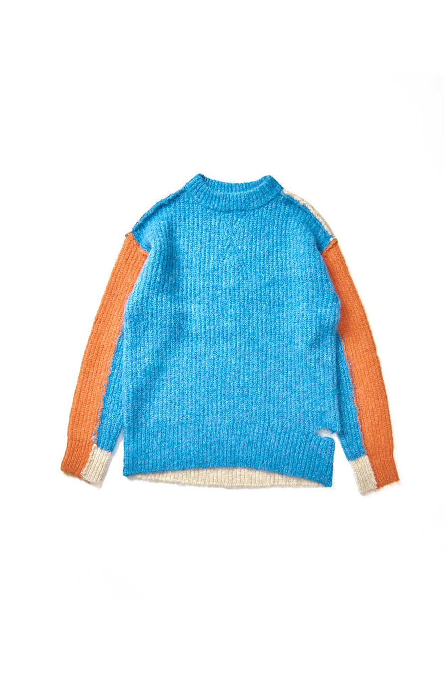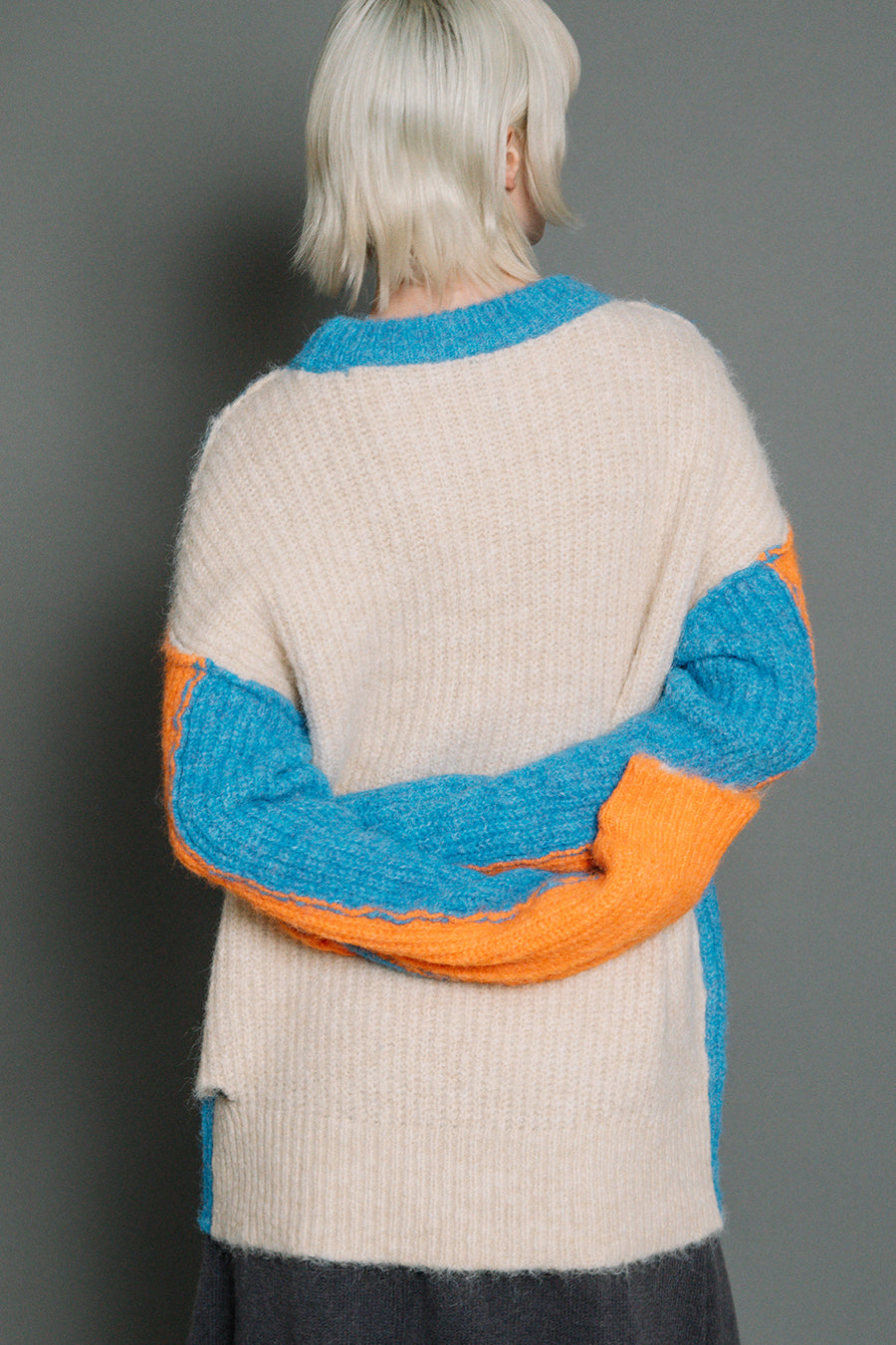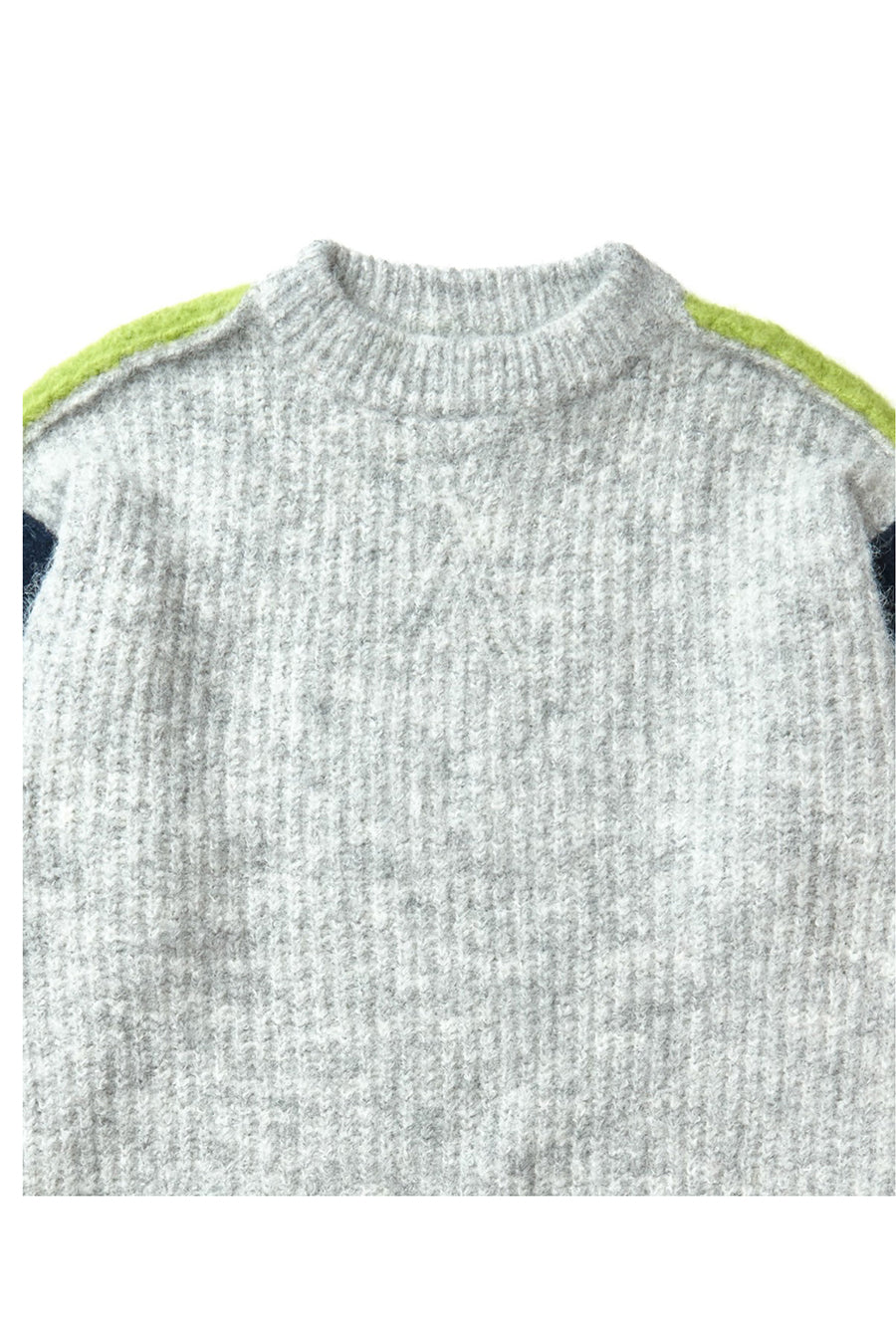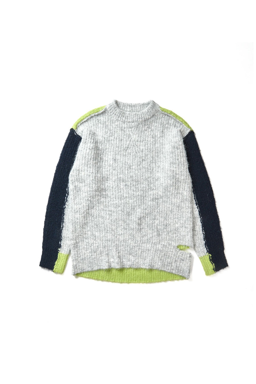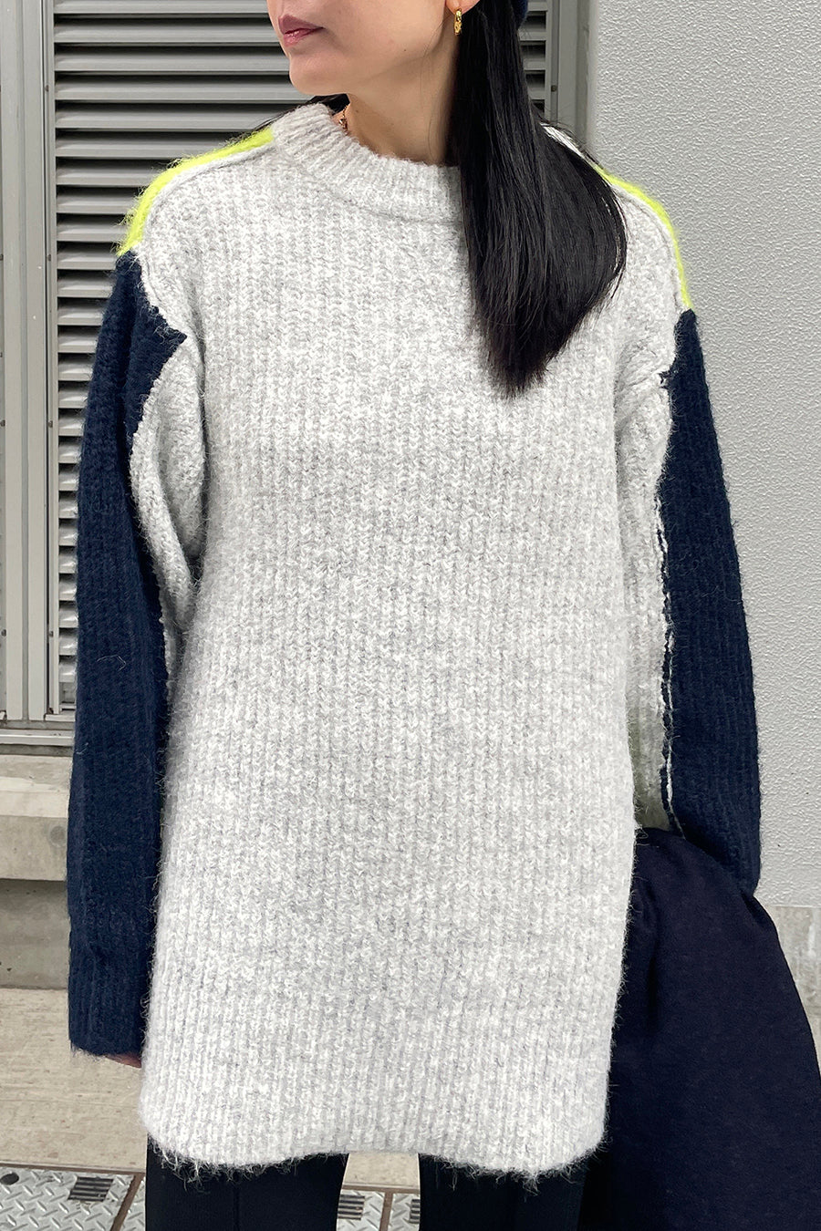 ベーシックなクルーネックのロングプルオーバーながらも、大胆な3色の配色カラーブロックが人目を惹くアイテム。