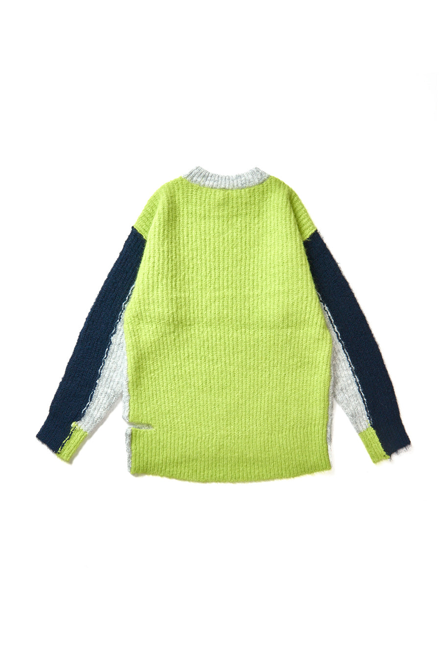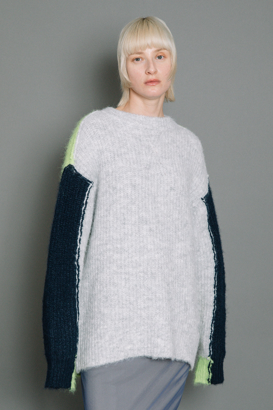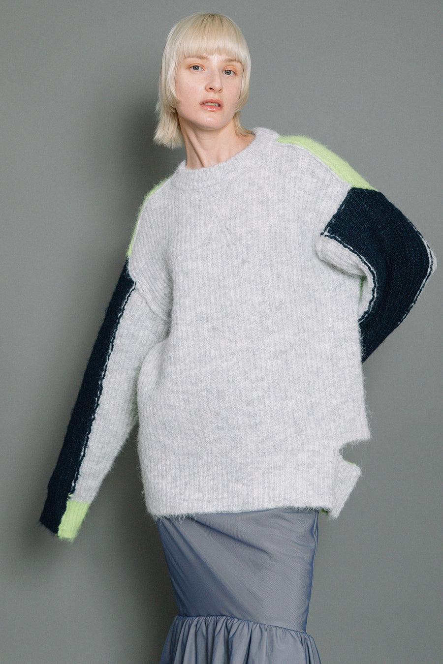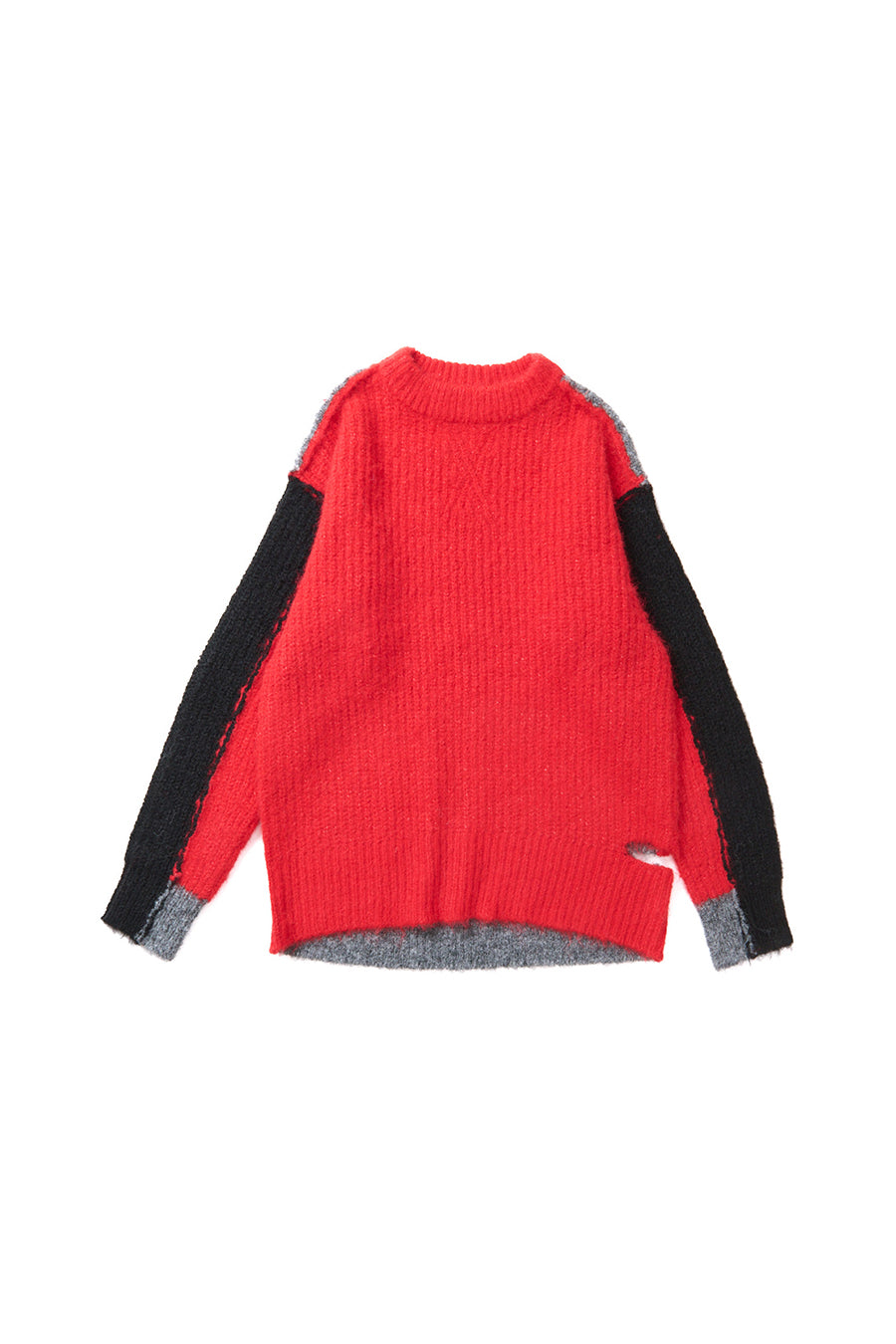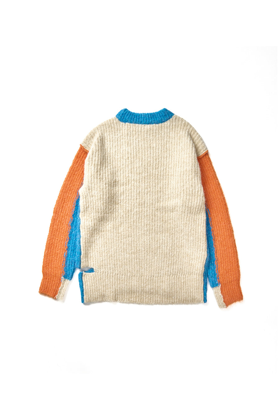 ベーシックなクルーネックのロングプルオーバーながらも、大胆な3色の配色カラーブロックが人目を惹くアイテム。