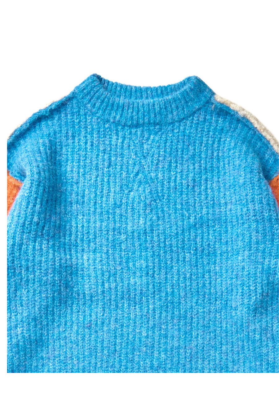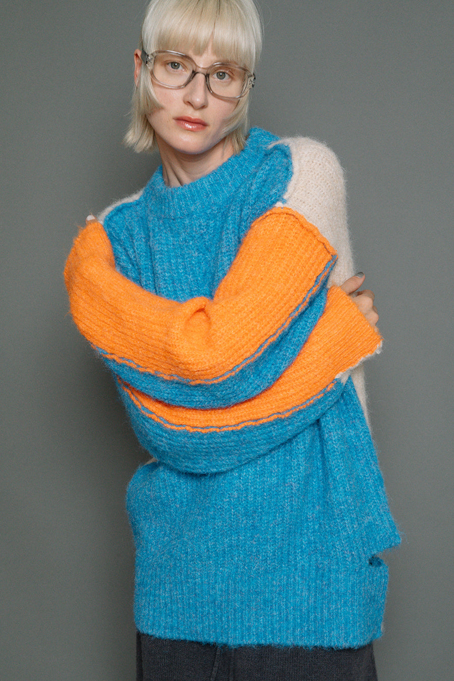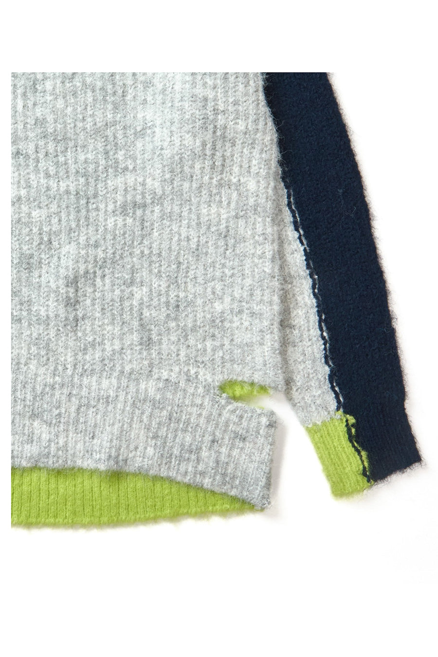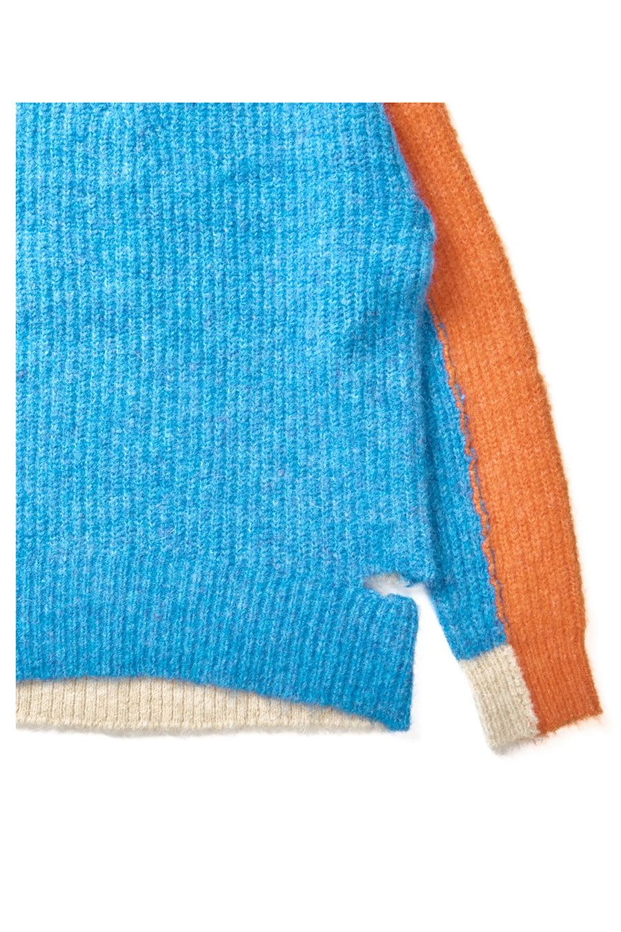 ベーシックなクルーネックのロングプルオーバーながらも、大胆な3色の配色カラーブロックが人目を惹くアイテム。