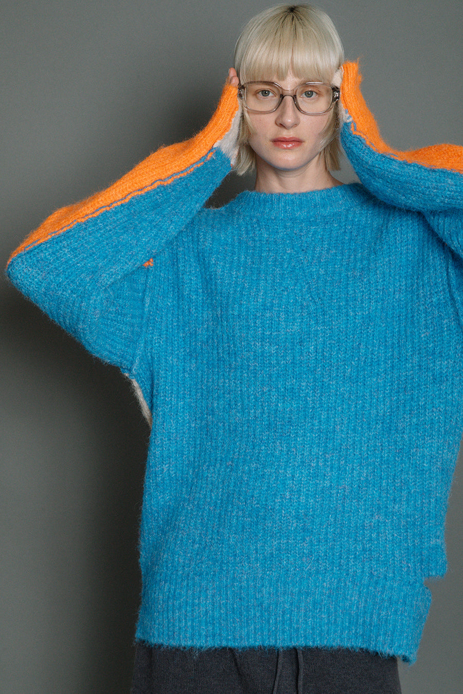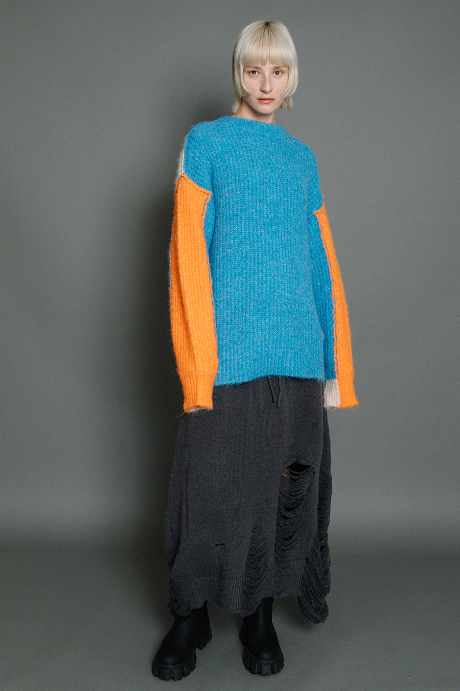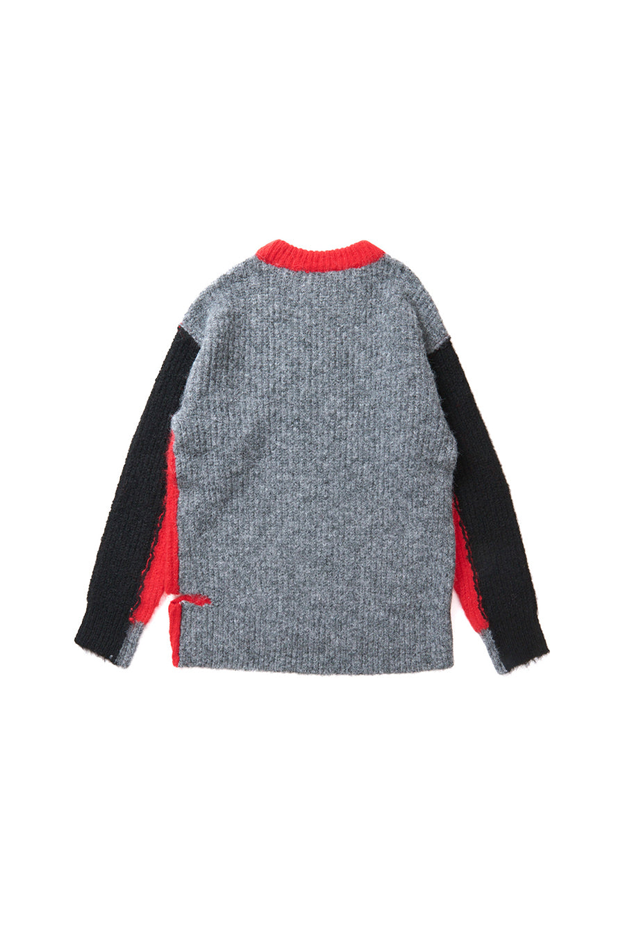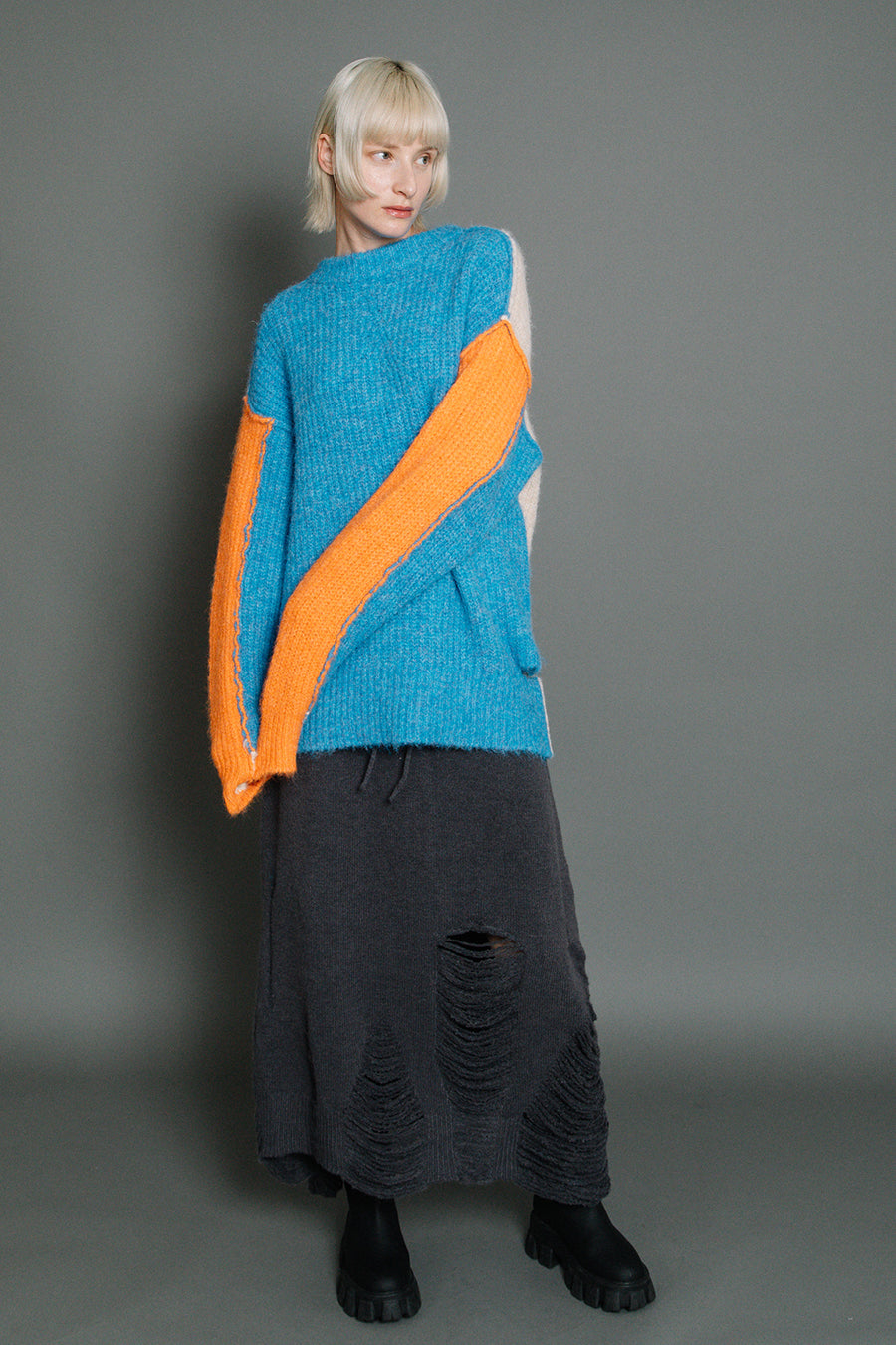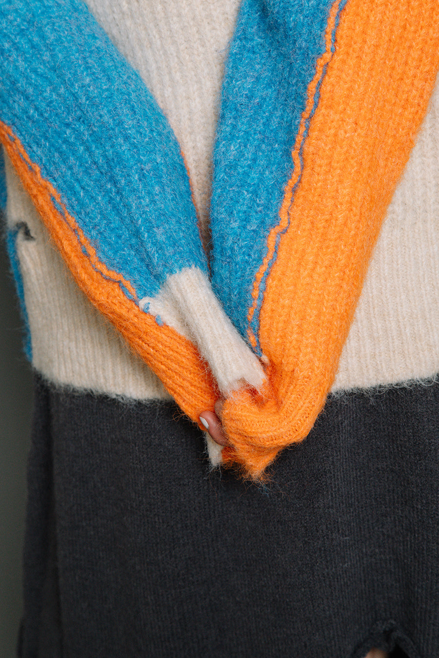 ベーシックなクルーネックのロングプルオーバーながらも、大胆な3色の配色カラーブロックが人目を惹くアイテム。