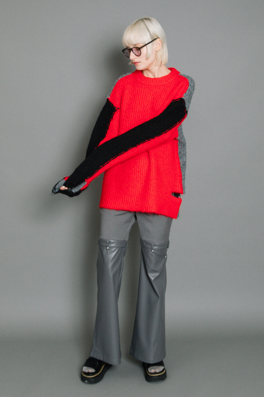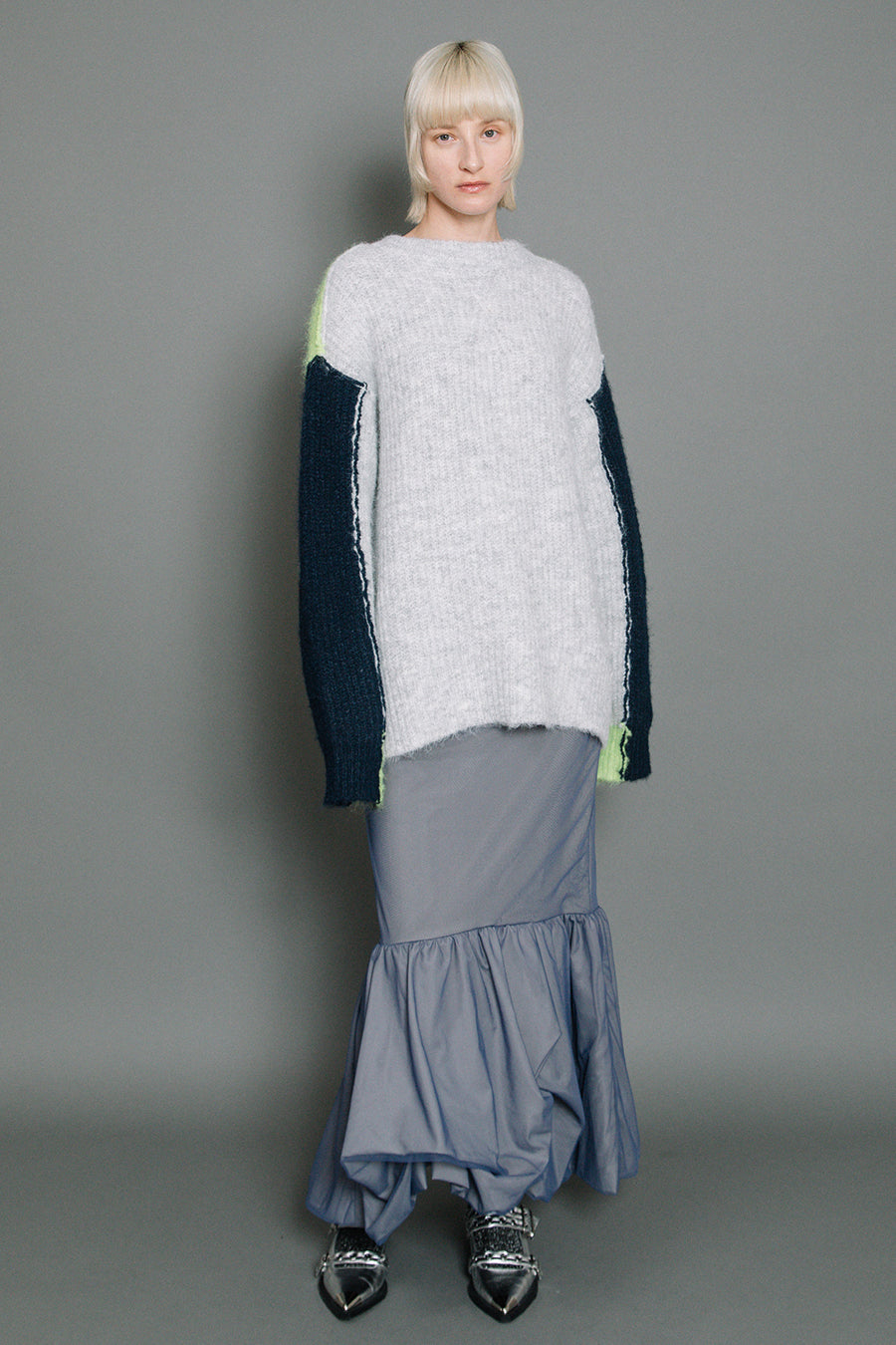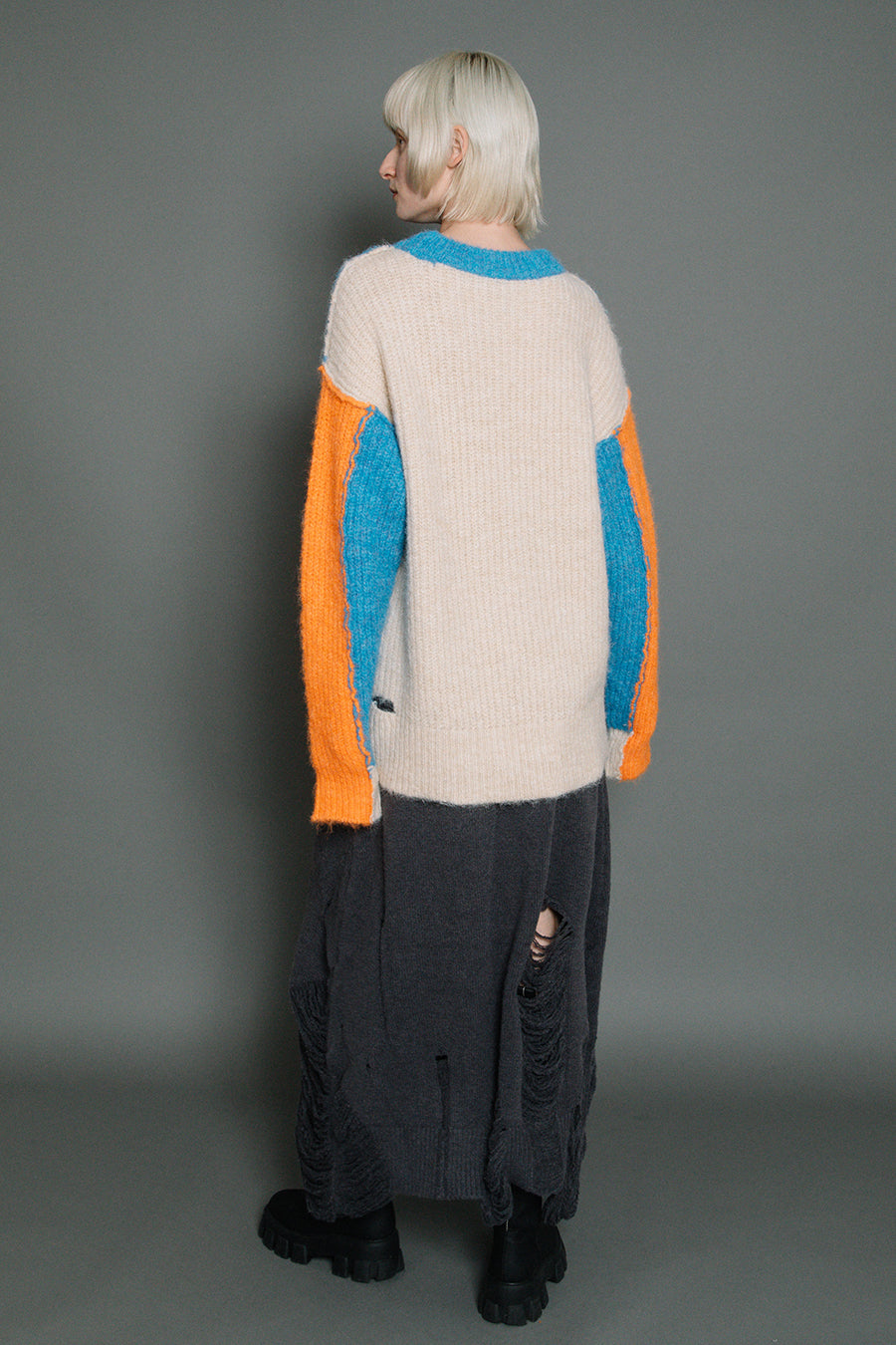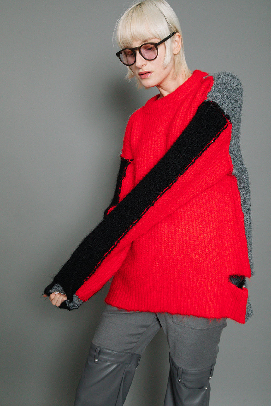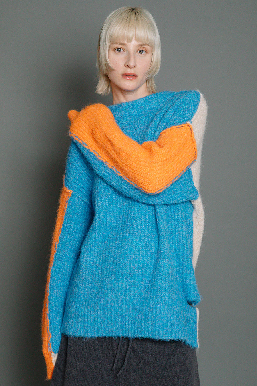 ベーシックなクルーネックのロングプルオーバーながらも、大胆な3色の配色カラーブロックが人目を惹くアイテム。