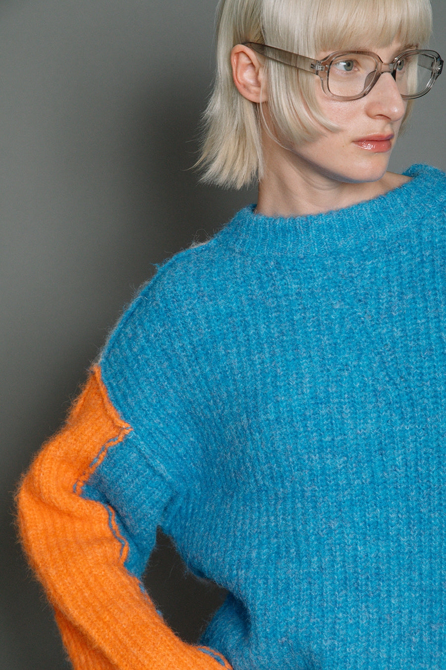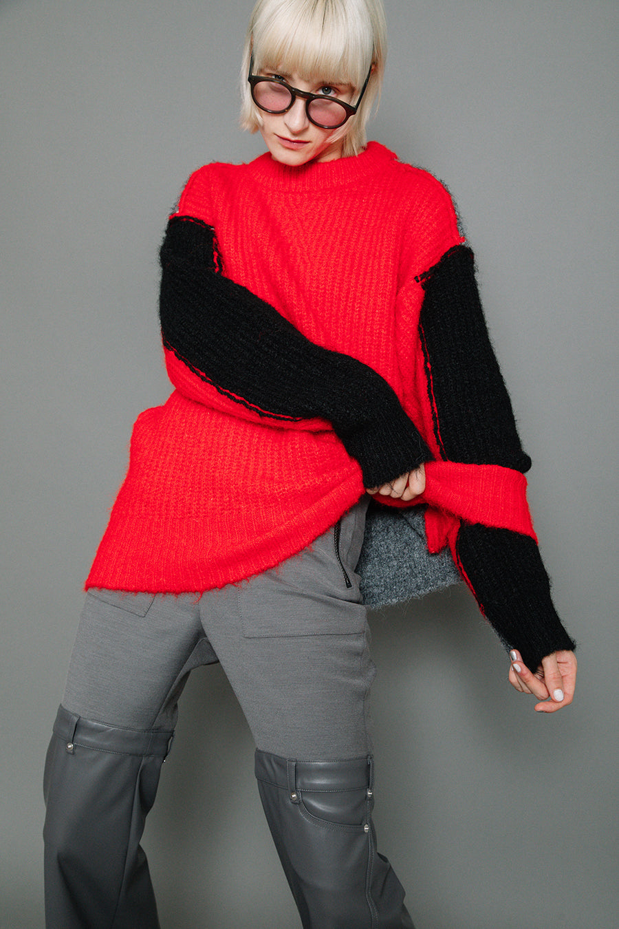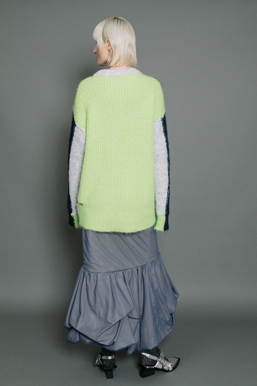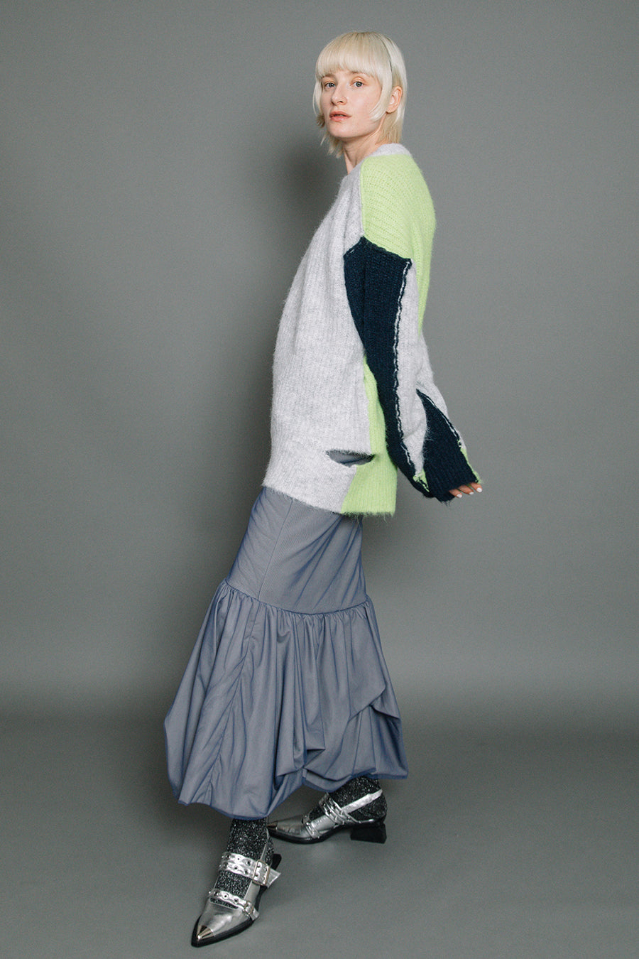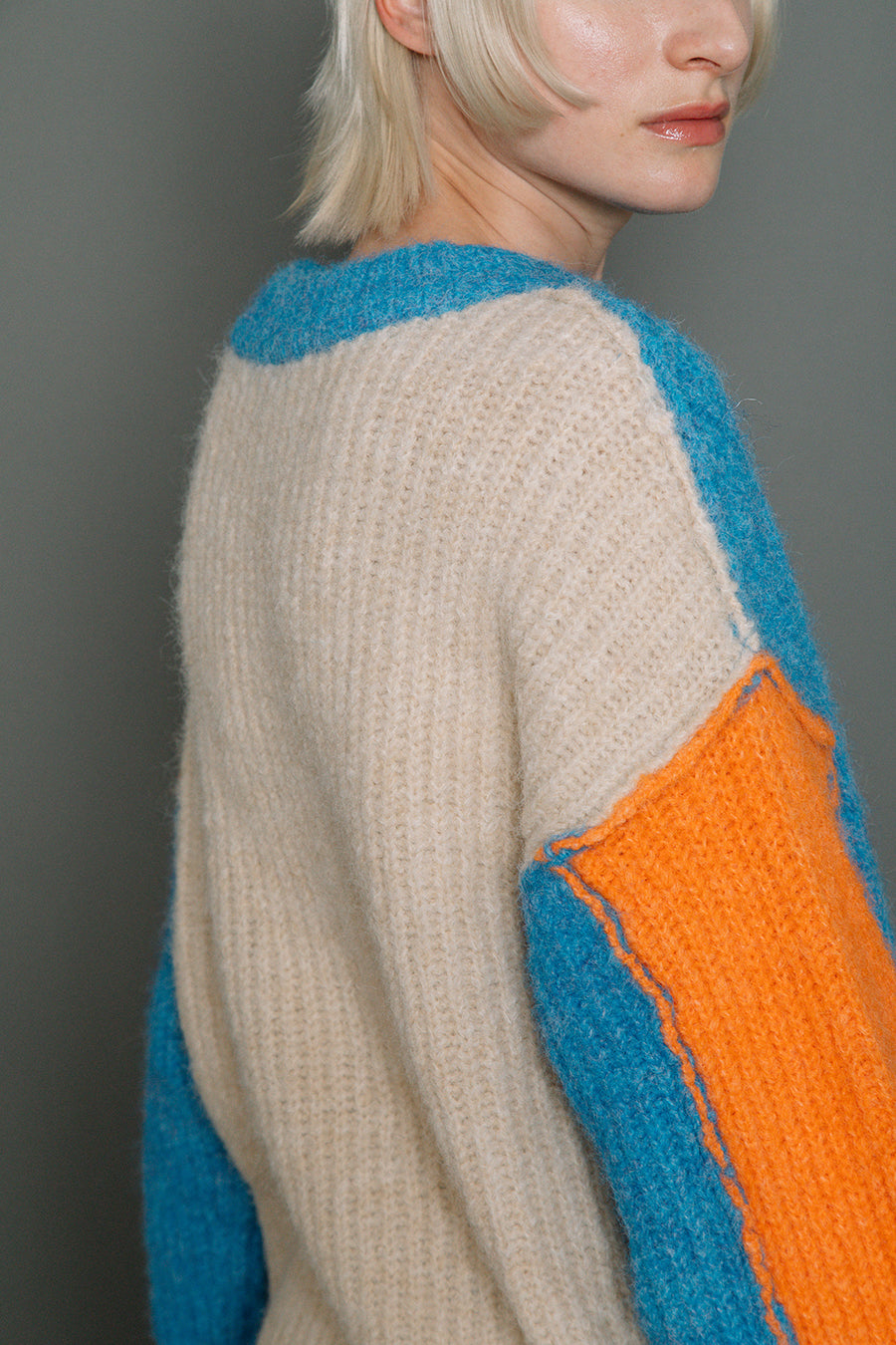 ベーシックなクルーネックのロングプルオーバーながらも、大胆な3色の配色カラーブロックが人目を惹くアイテム。