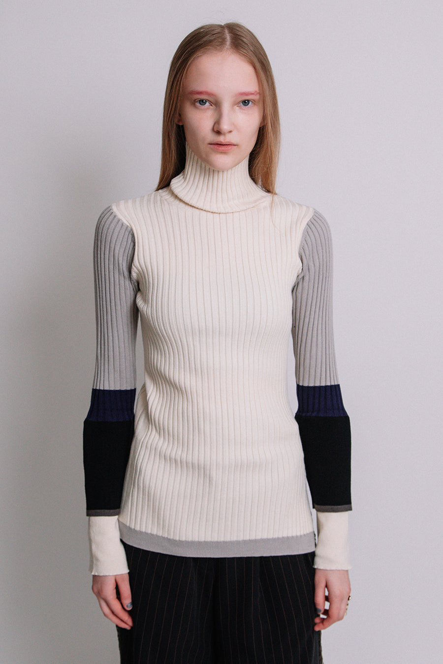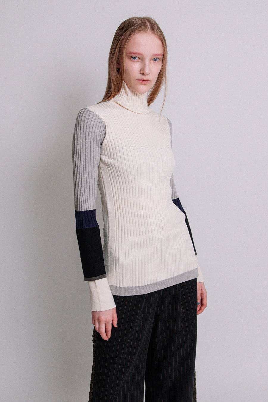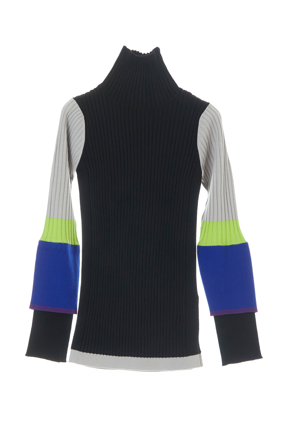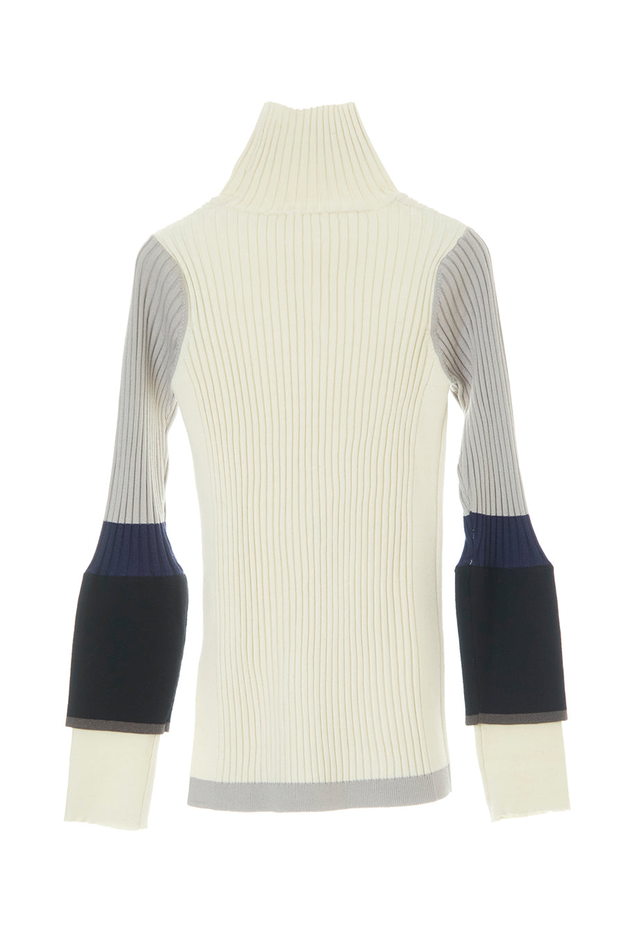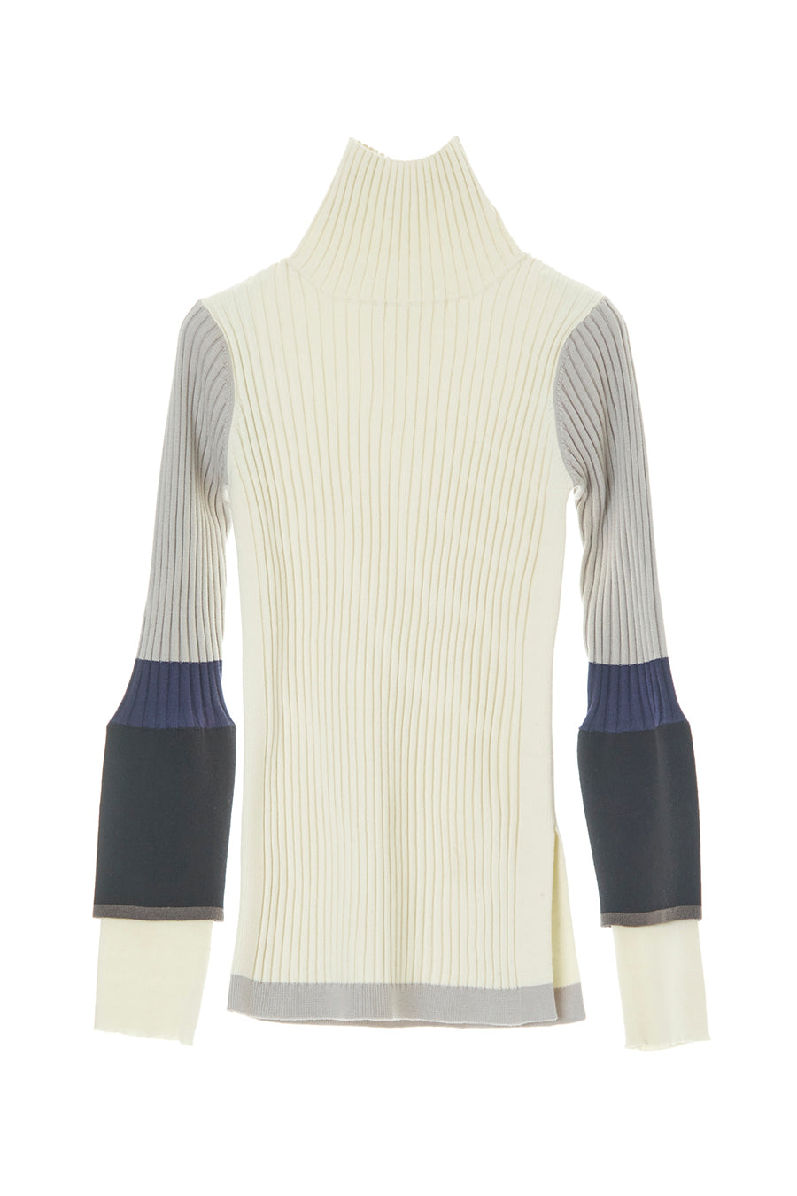 袖のカラーブロックのレイヤードデザインが目を惹くハイネックリブニット。