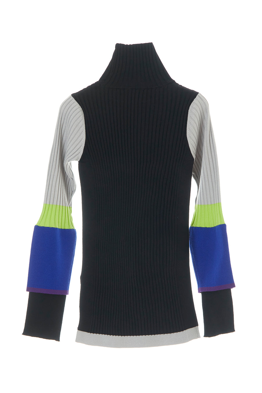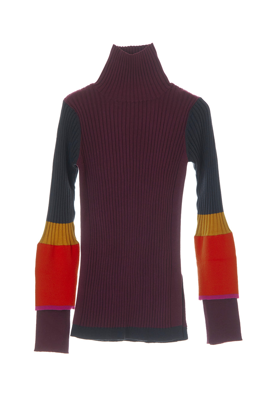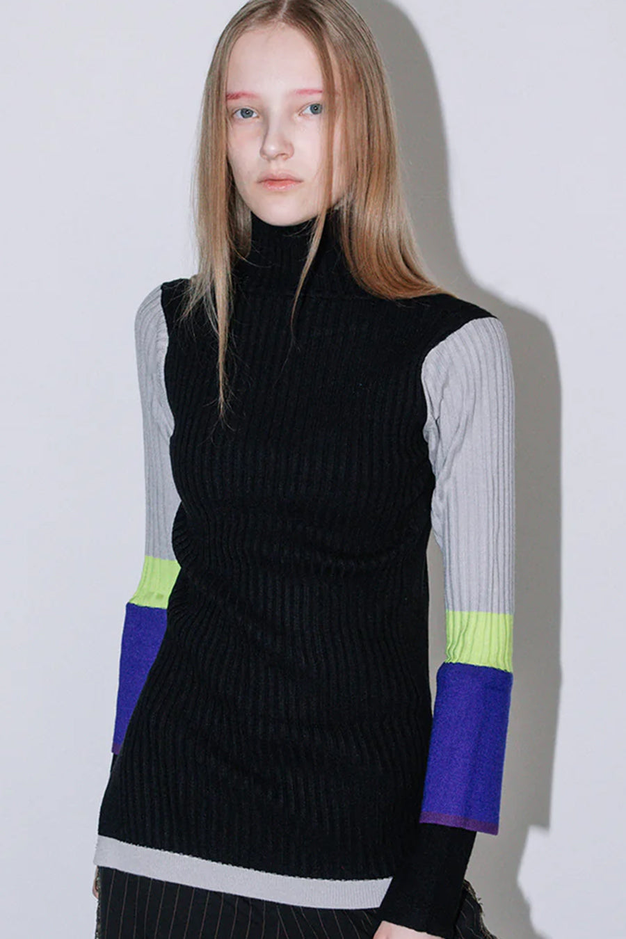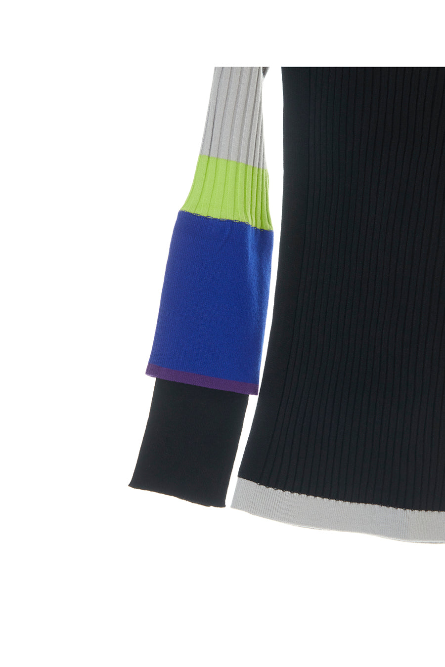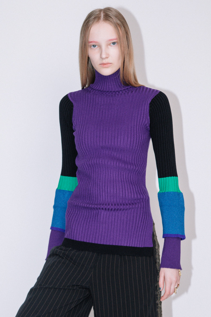 袖のカラーブロックのレイヤードデザインが目を惹くハイネックリブニット。