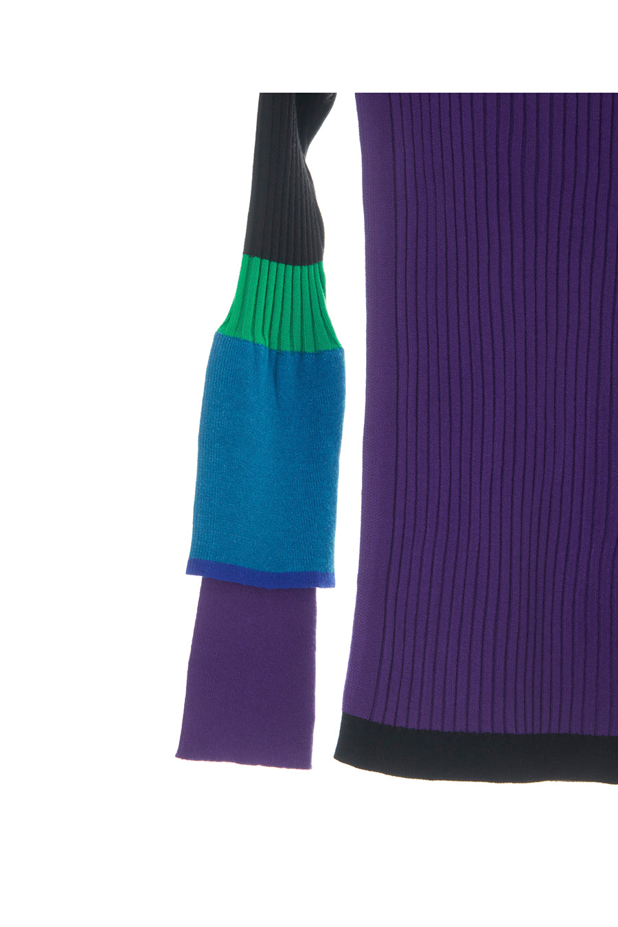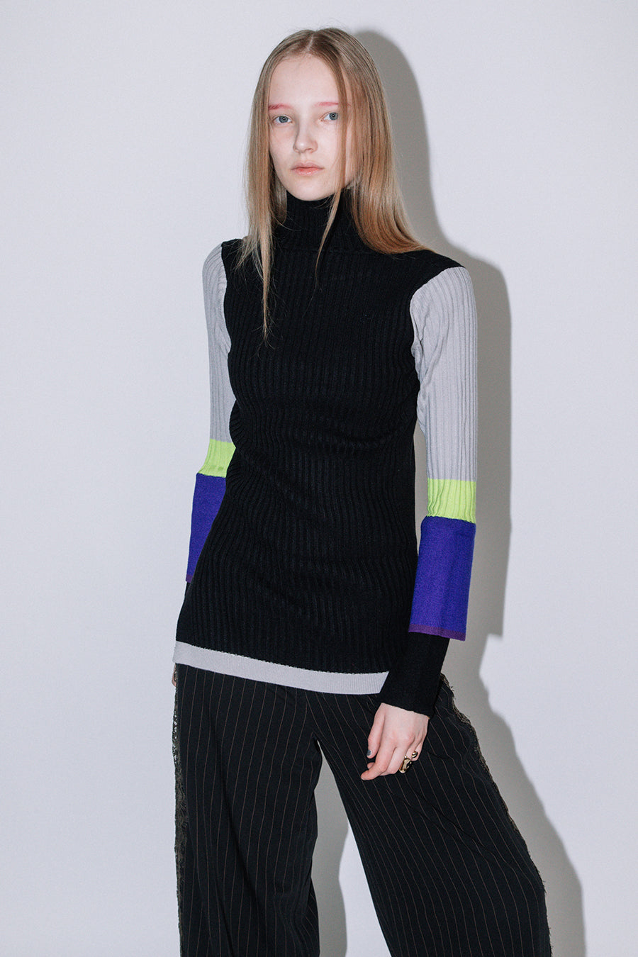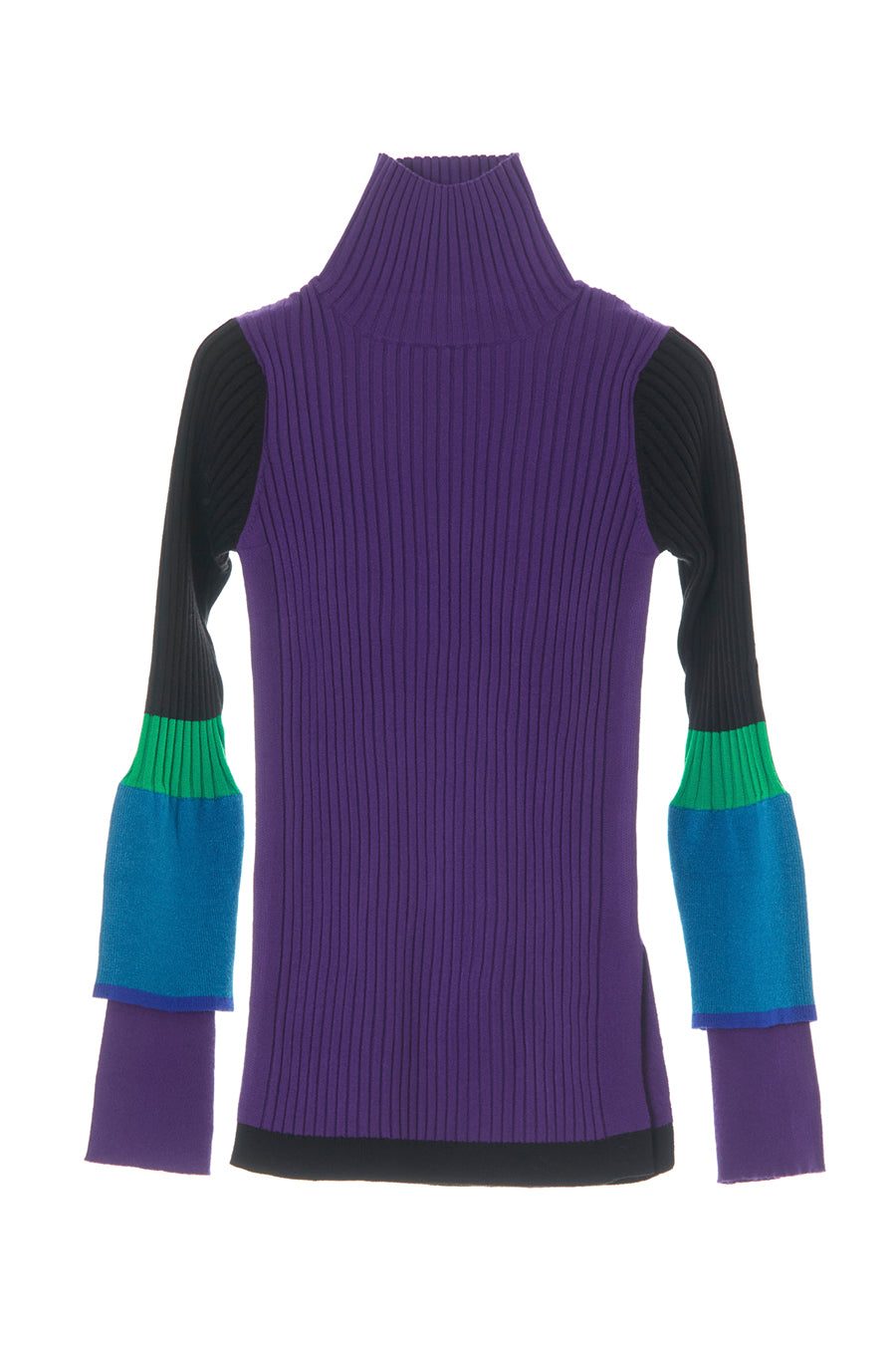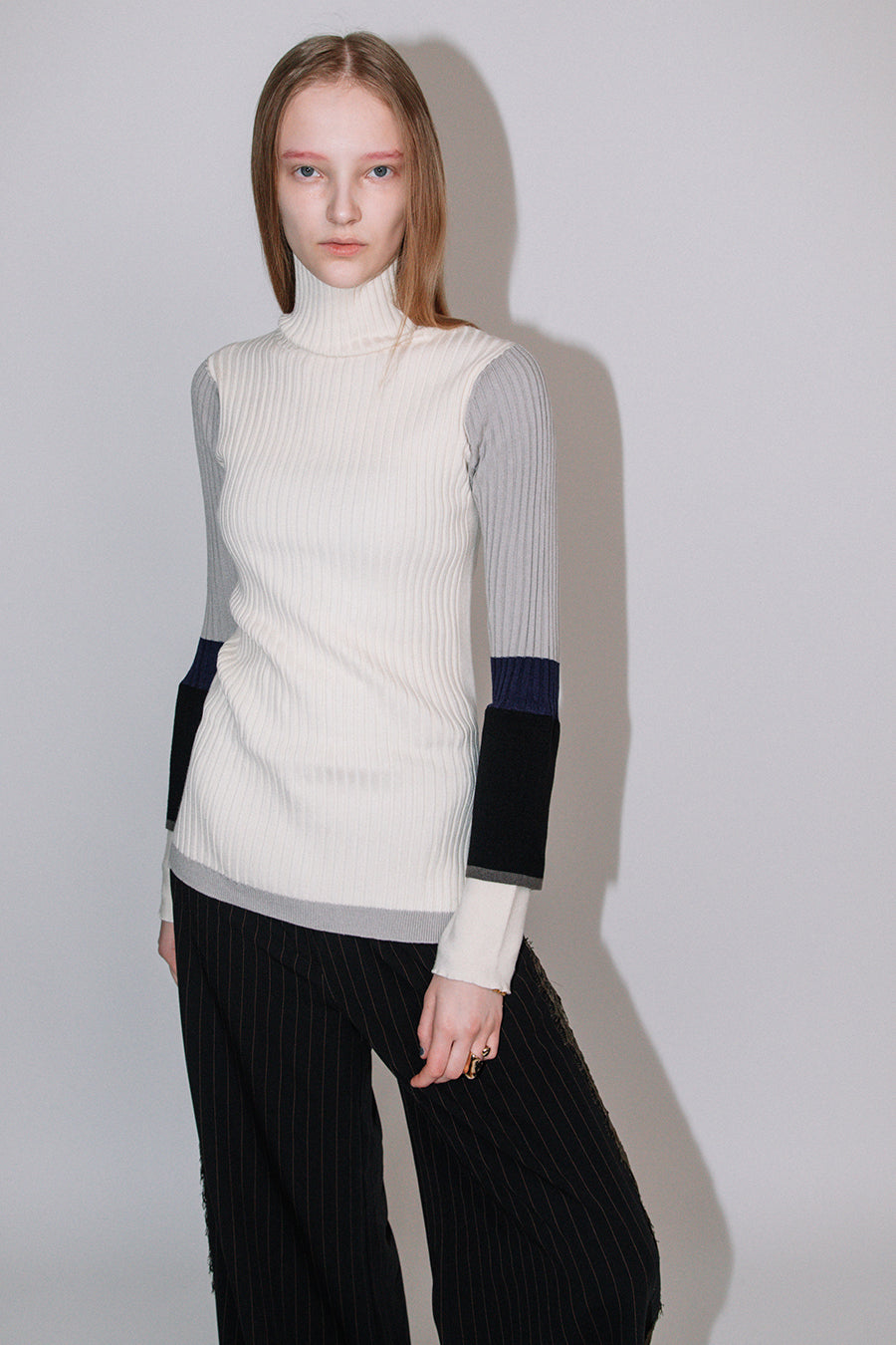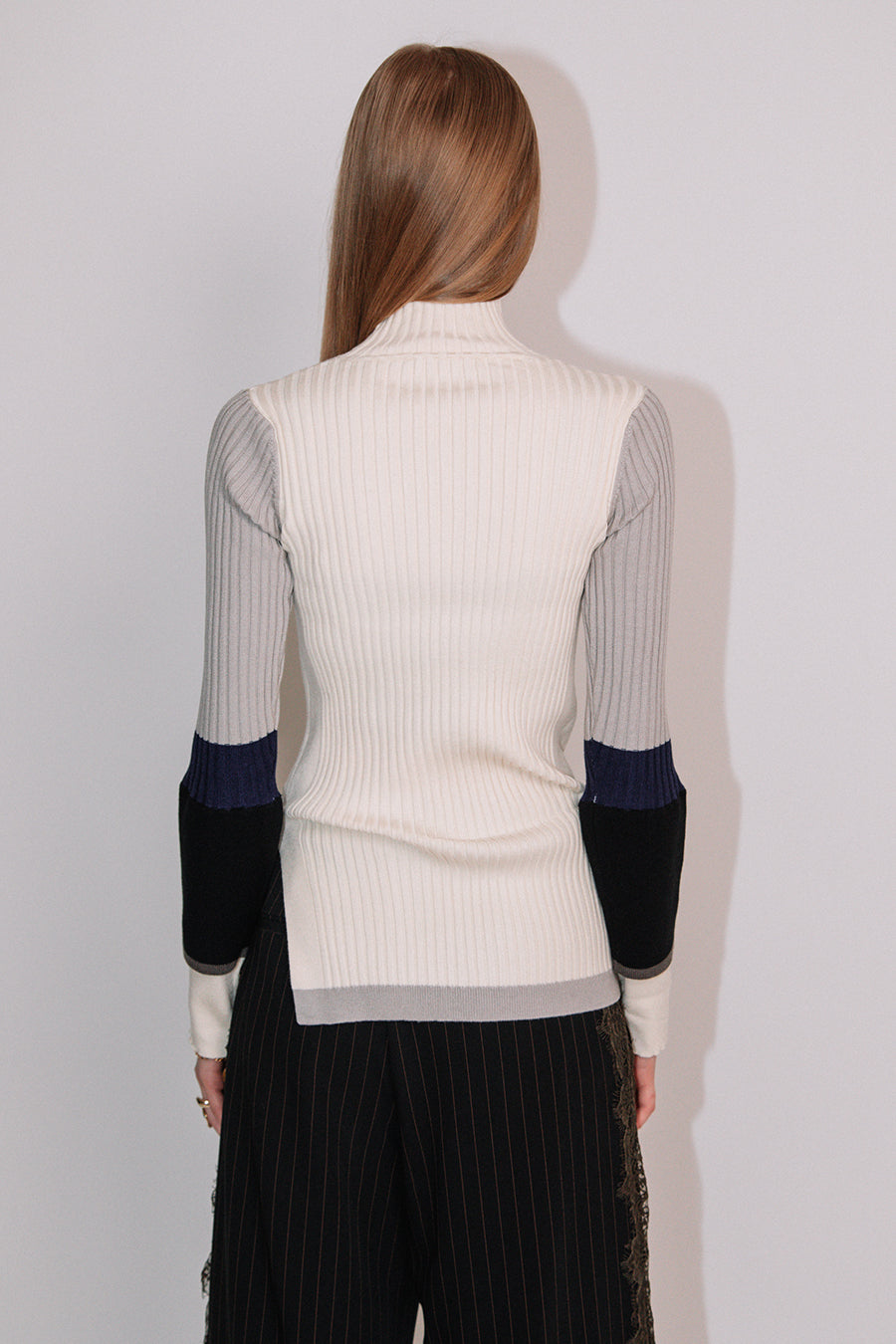 袖のカラーブロックのレイヤードデザインが目を惹くハイネックリブニット。