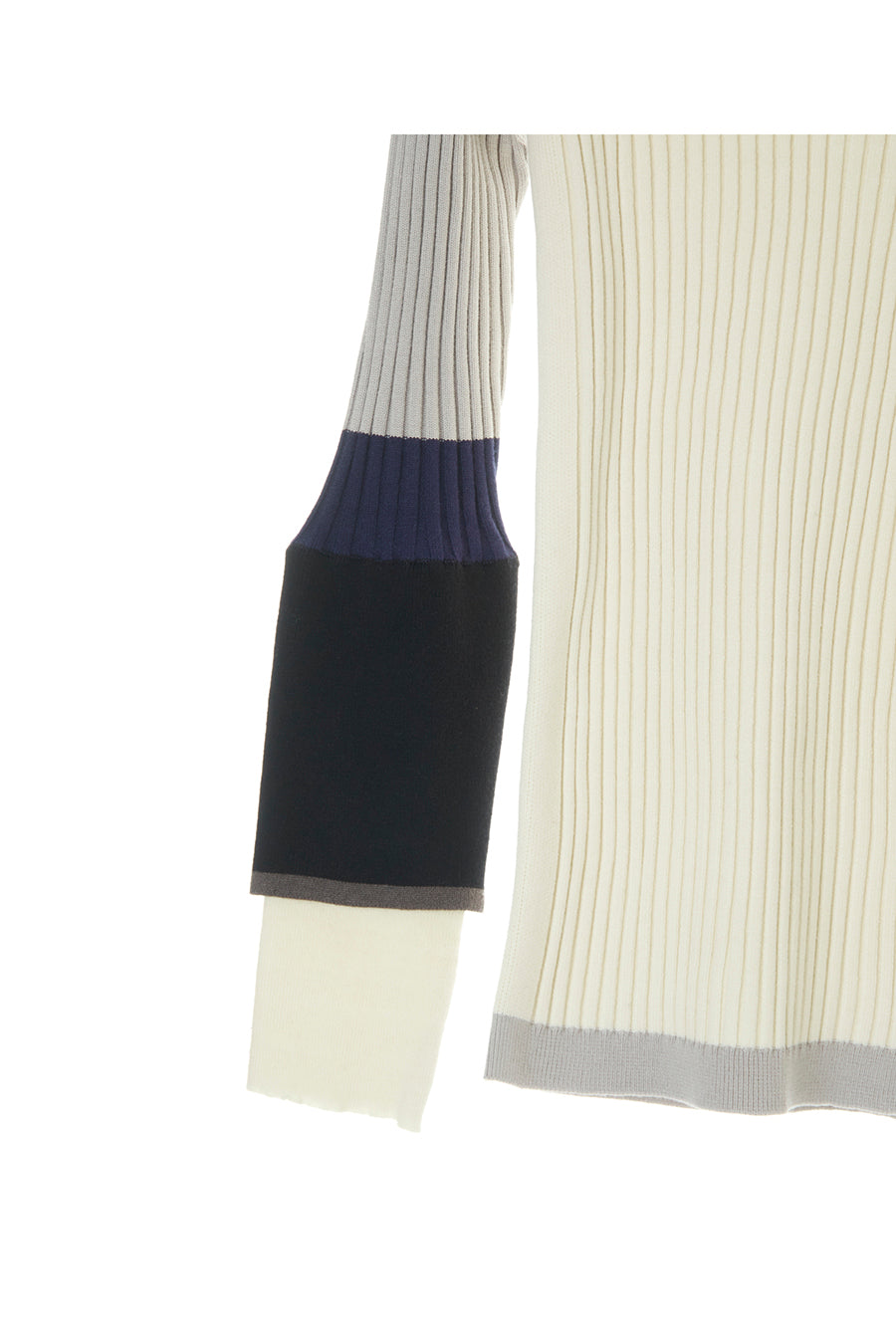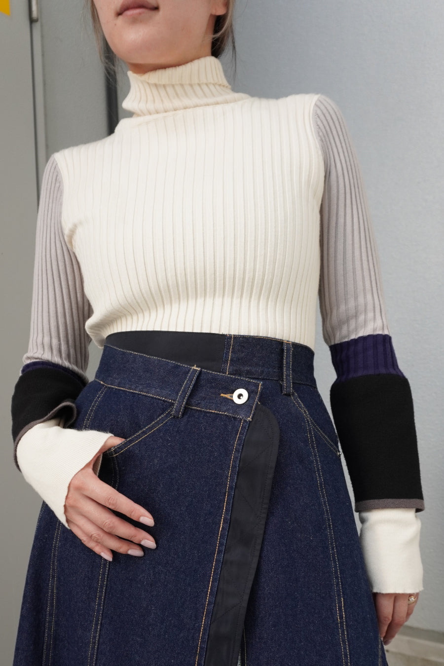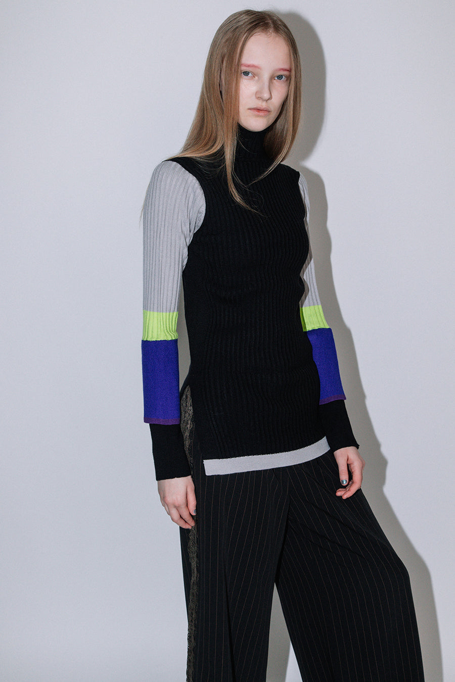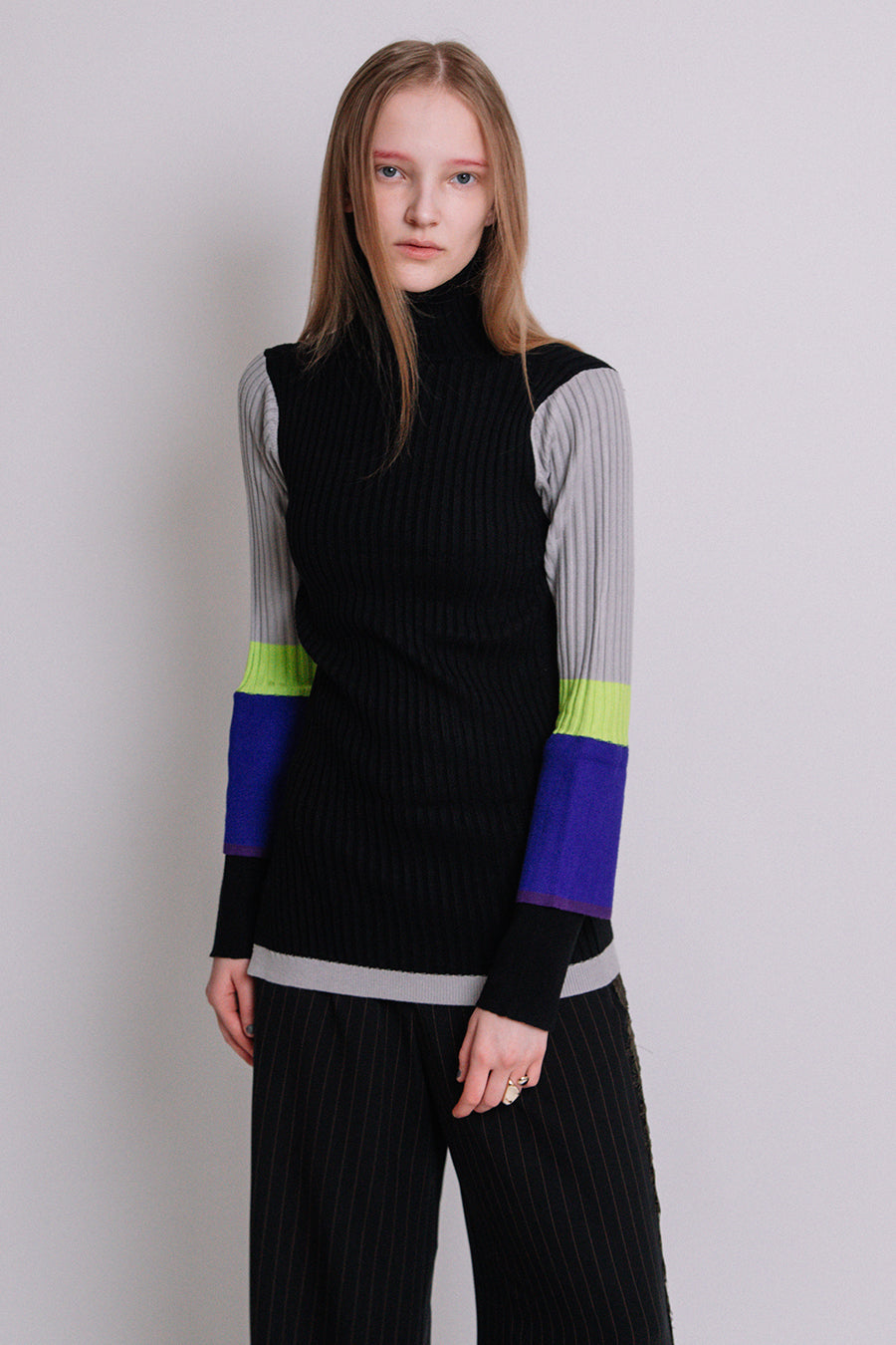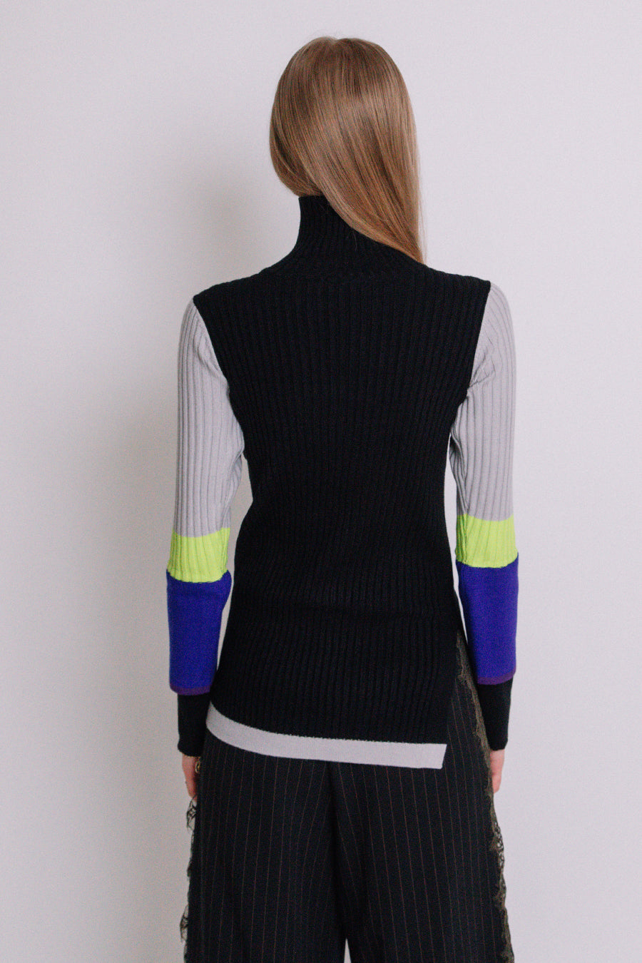 袖のカラーブロックのレイヤードデザインが目を惹くハイネックリブニット。