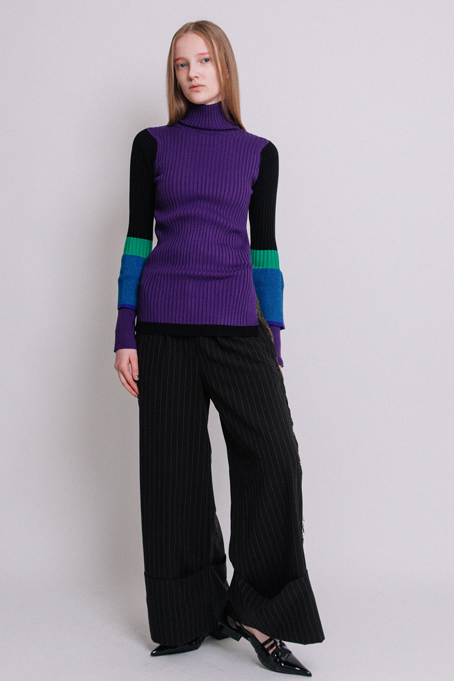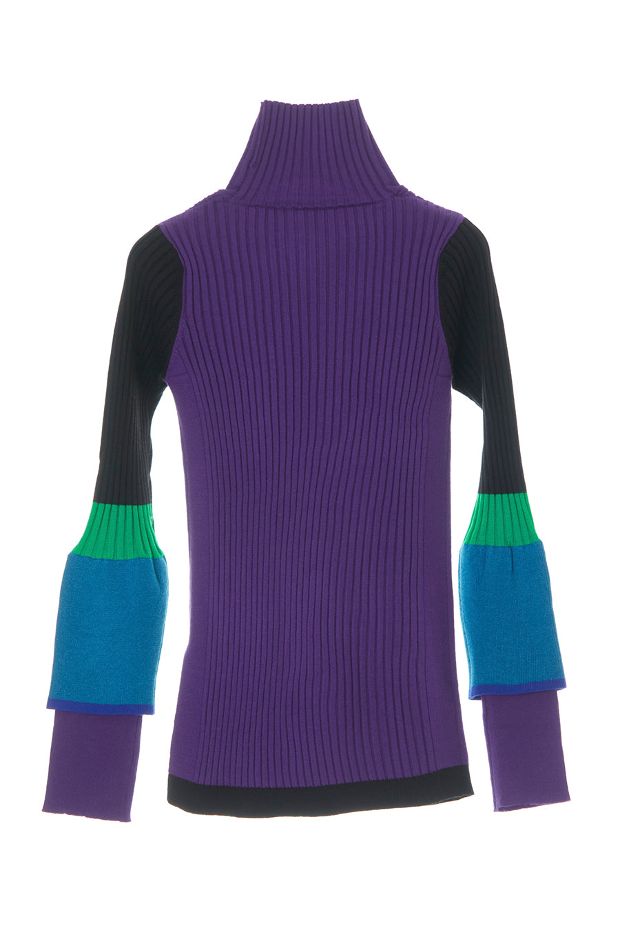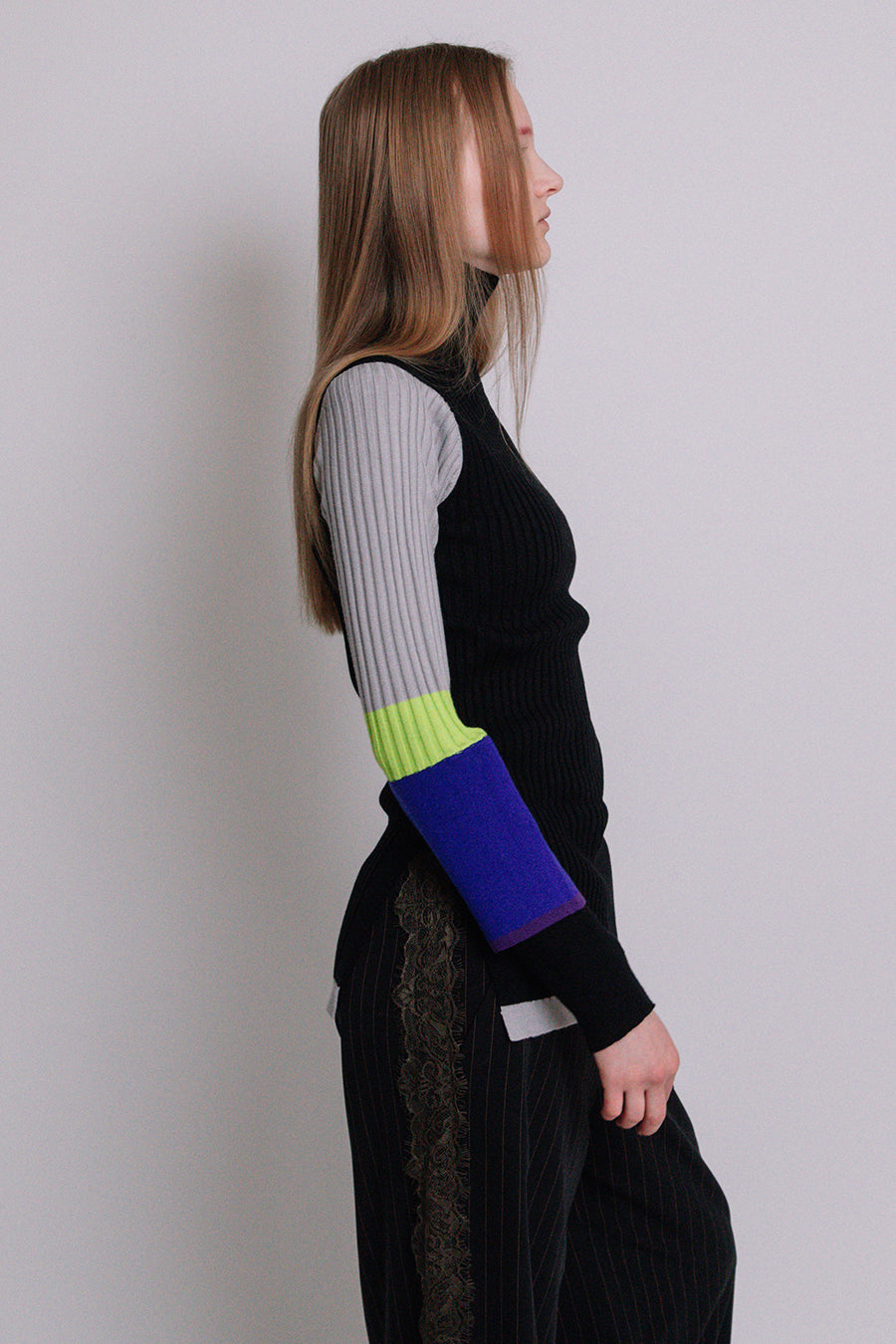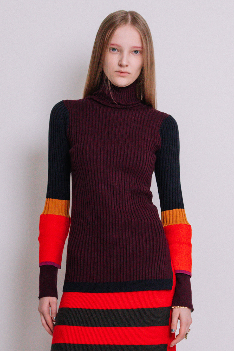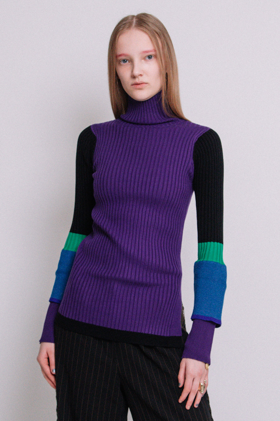 袖のカラーブロックのレイヤードデザインが目を惹くハイネックリブニット。