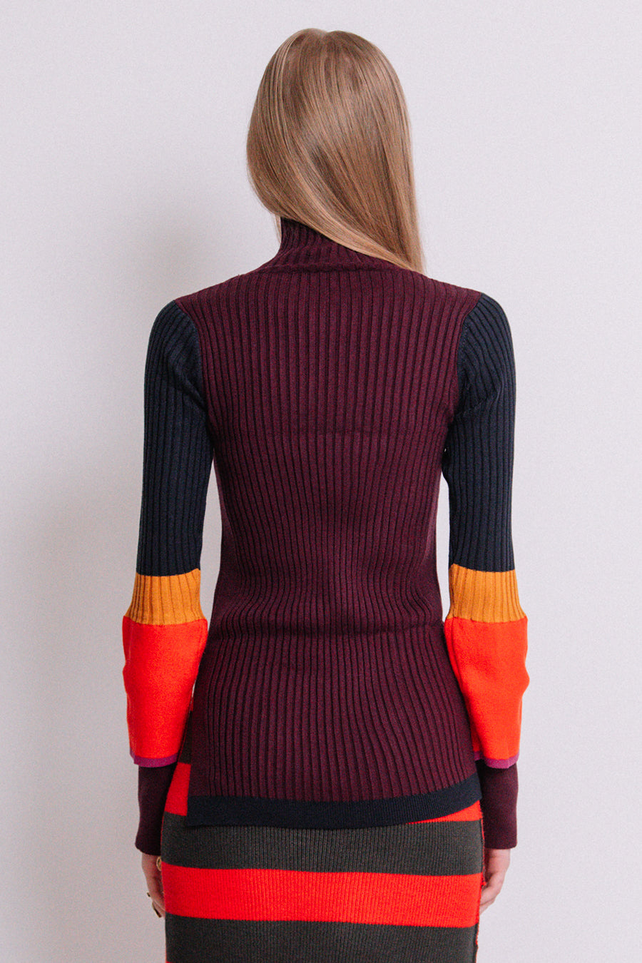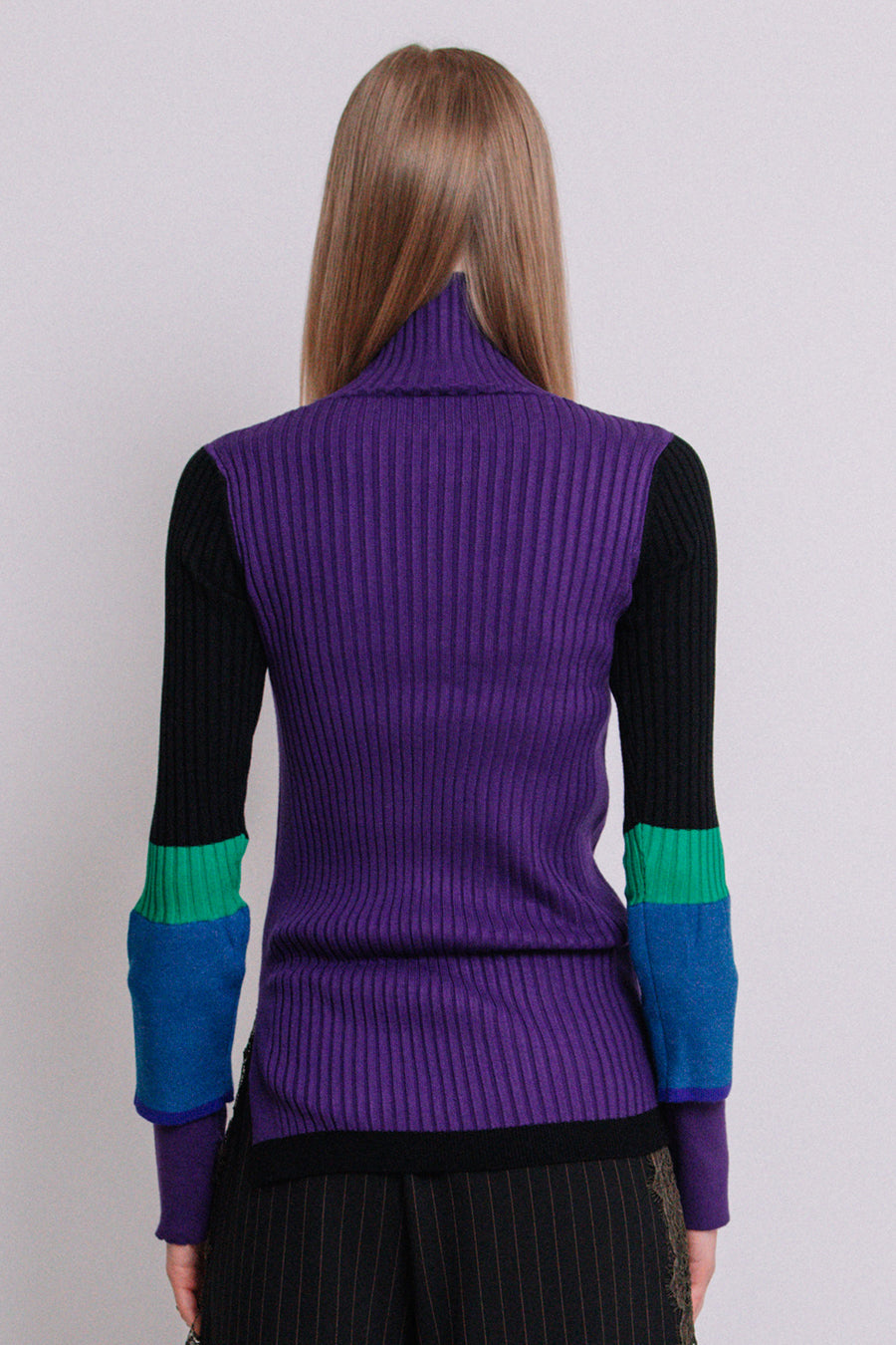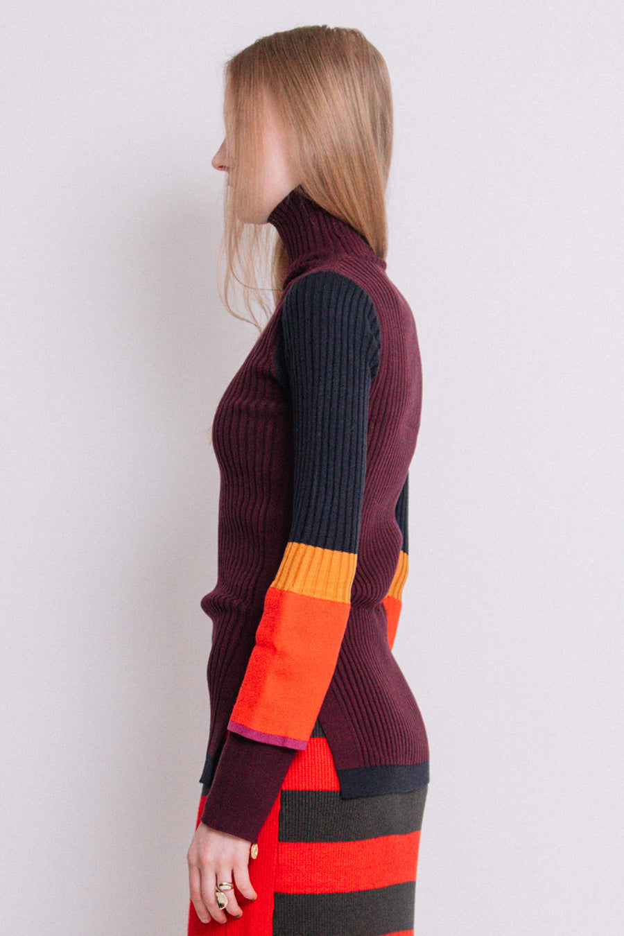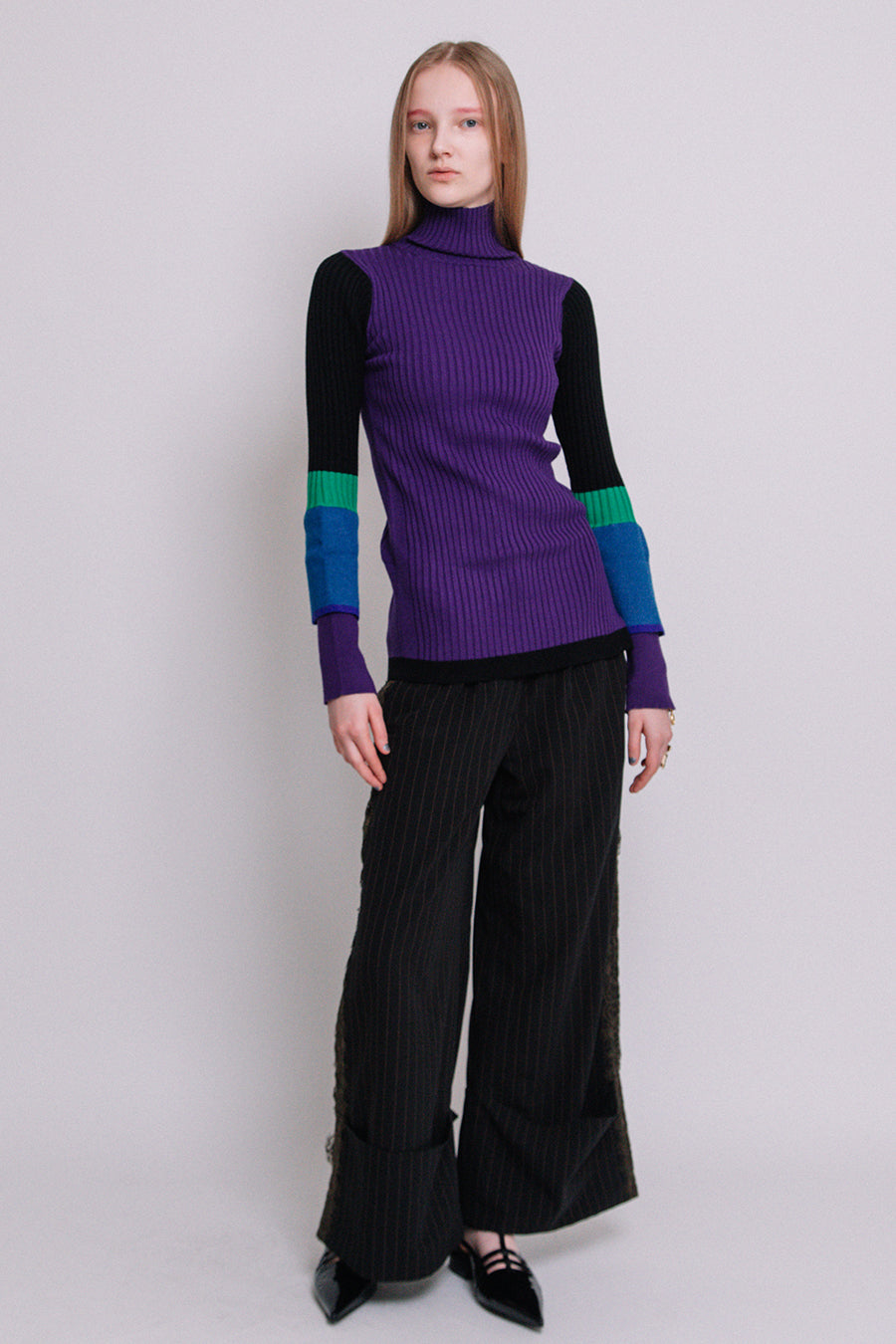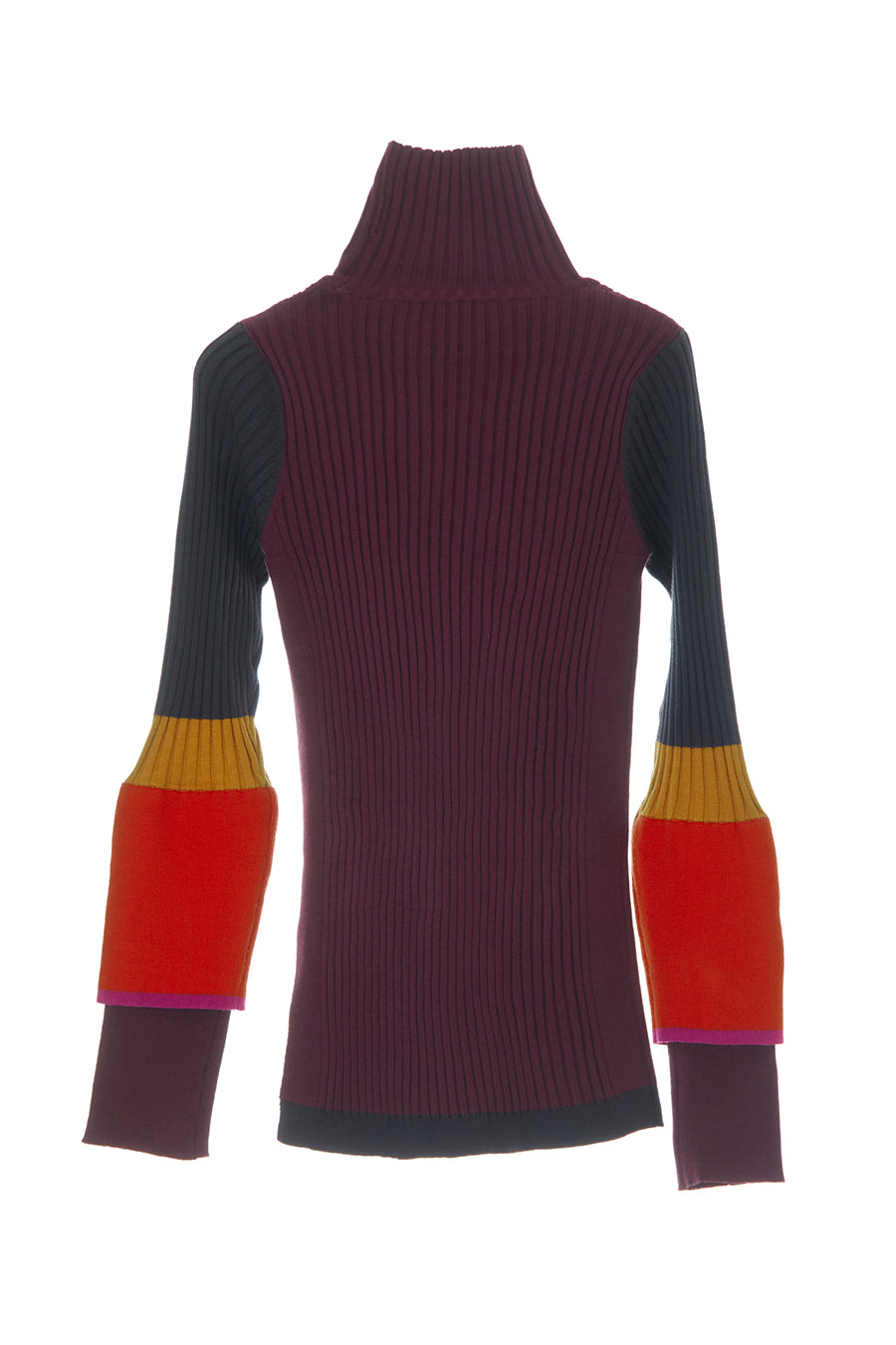 袖のカラーブロックのレイヤードデザインが目を惹くハイネックリブニット。