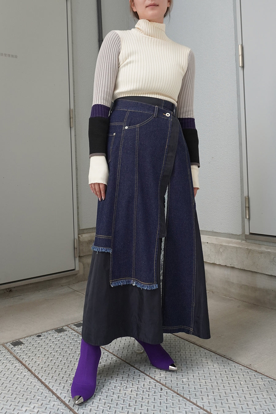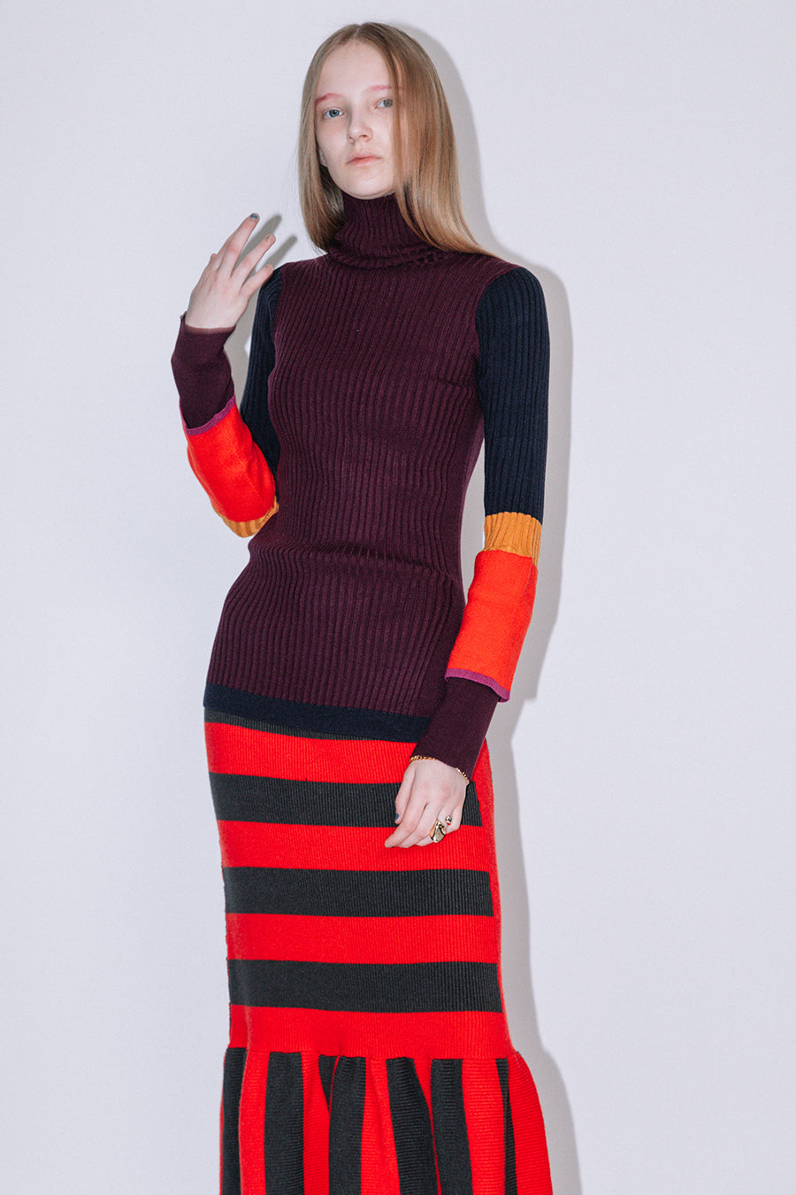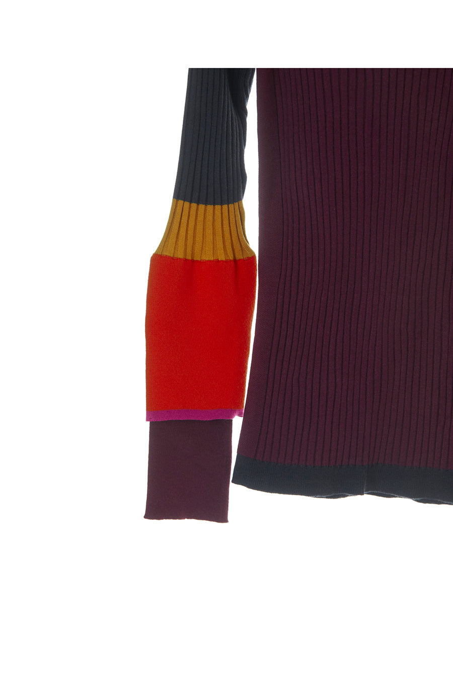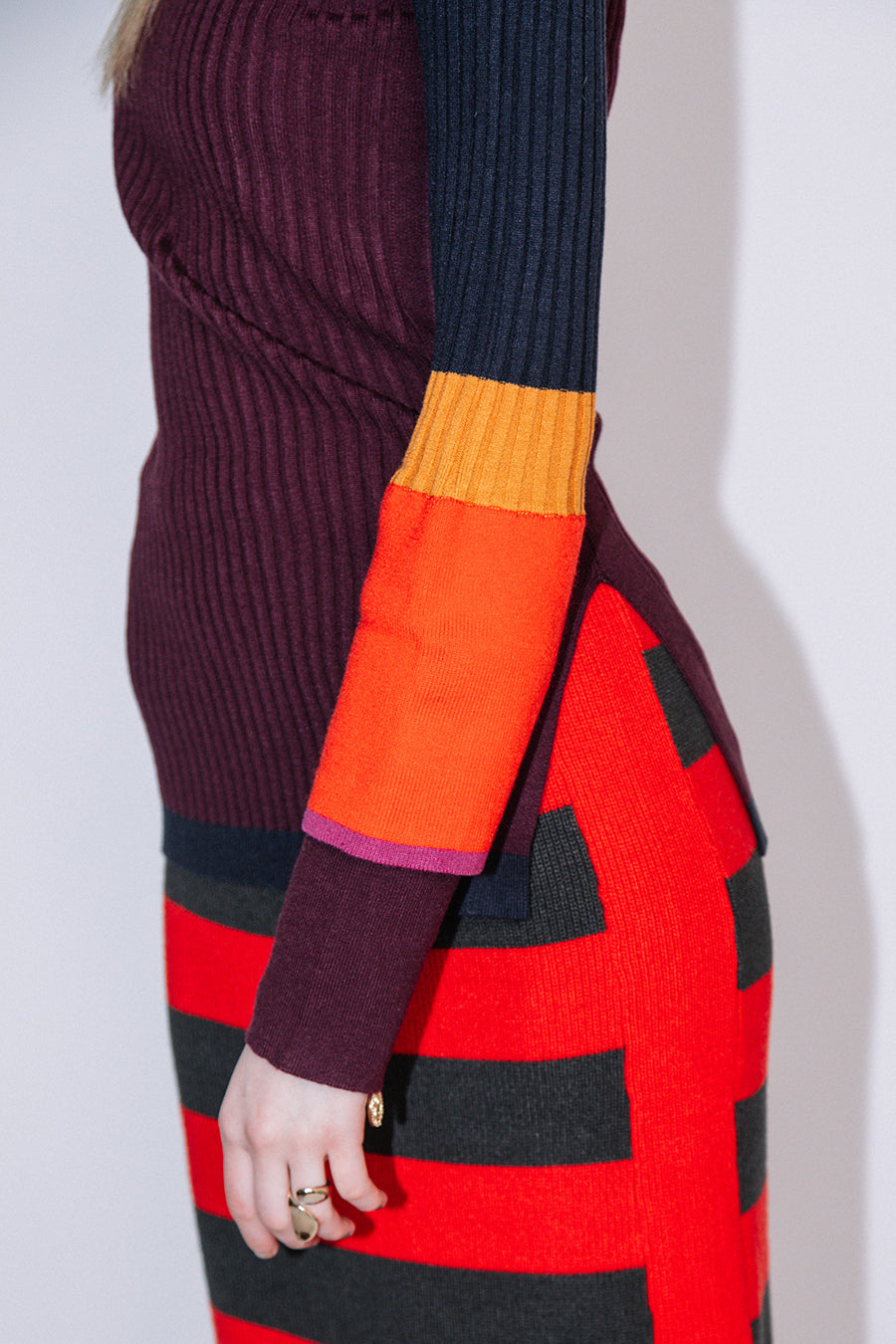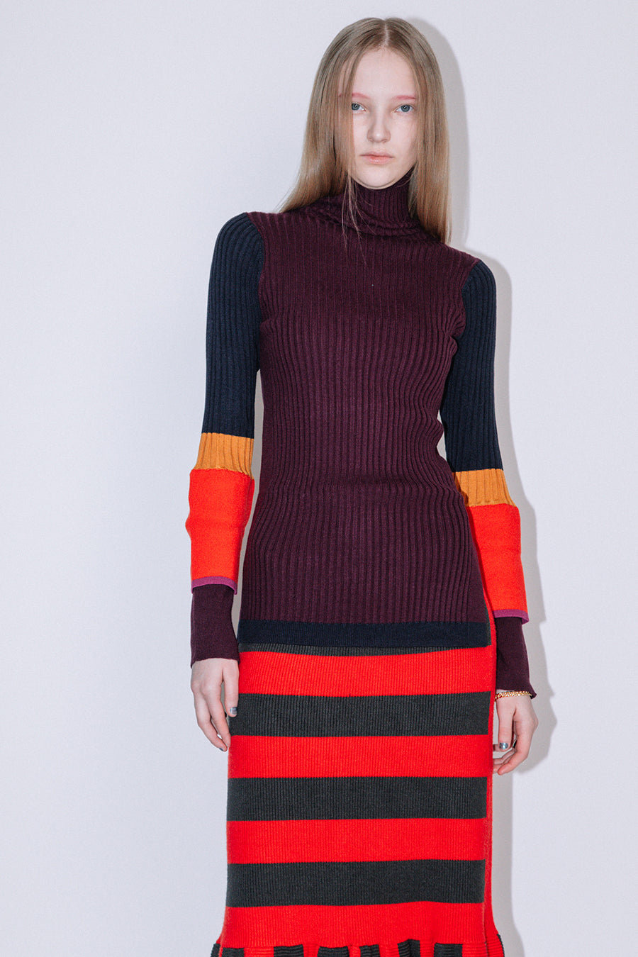 袖のカラーブロックのレイヤードデザインが目を惹くハイネックリブニット。