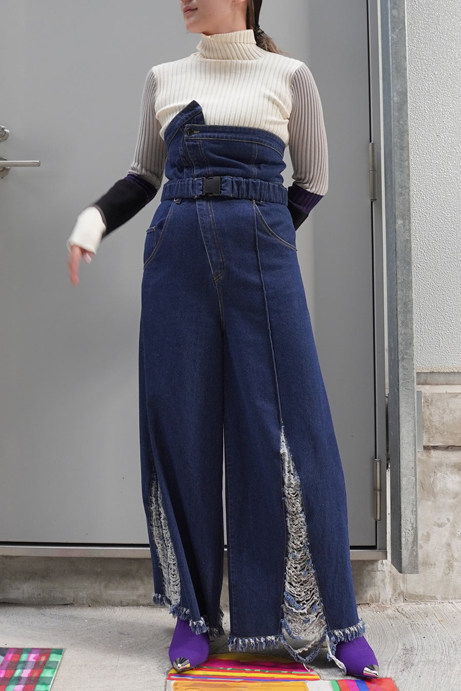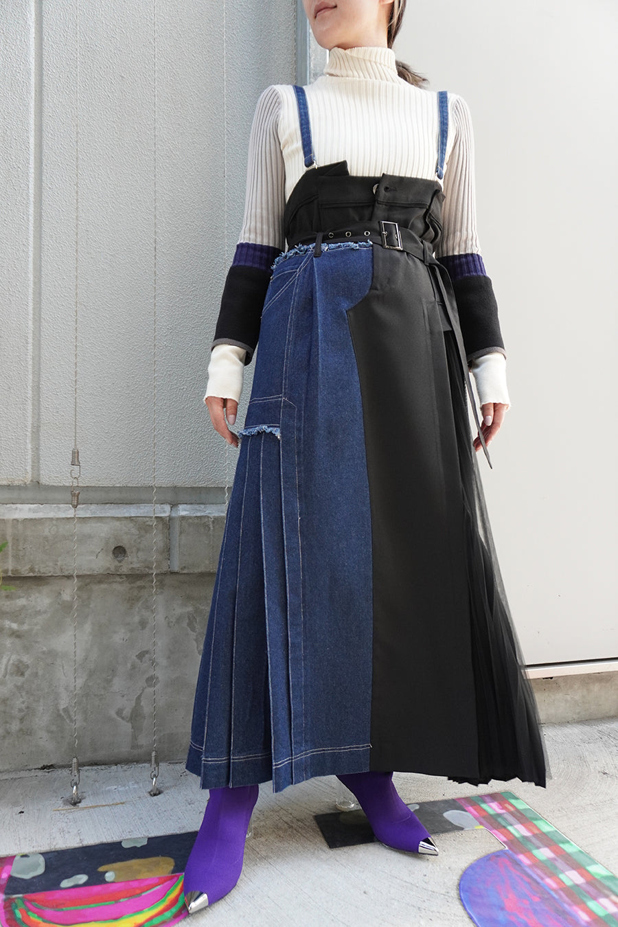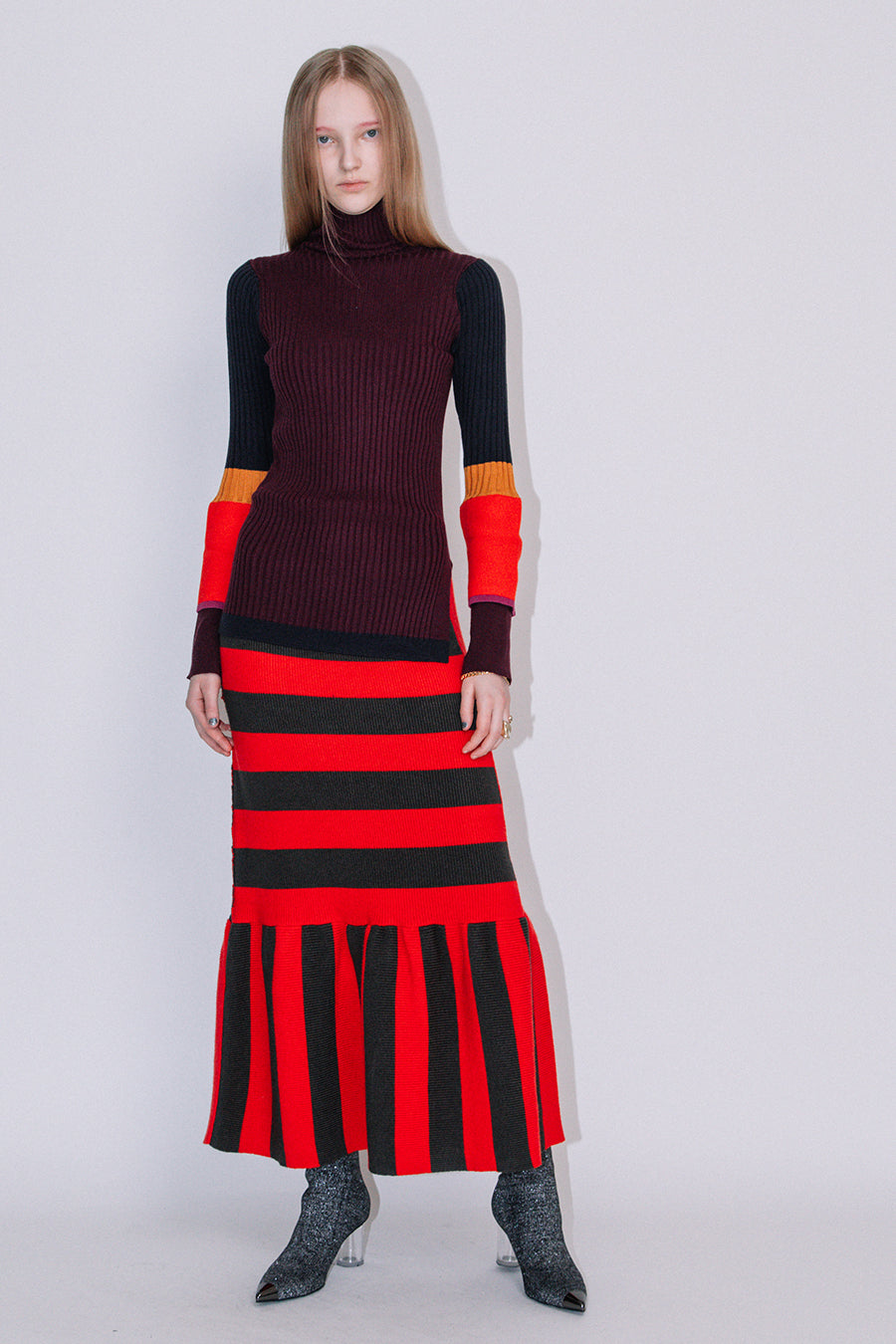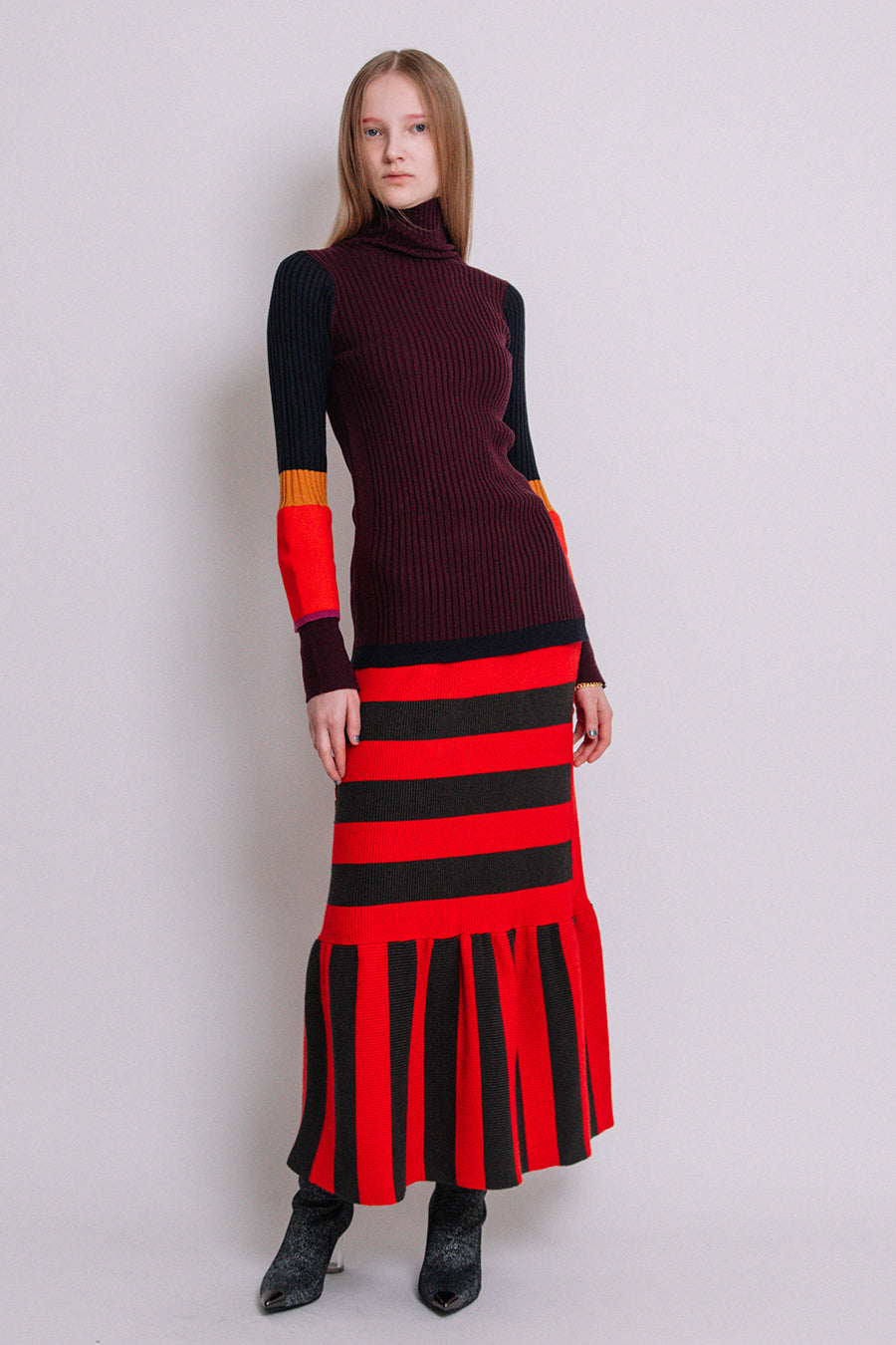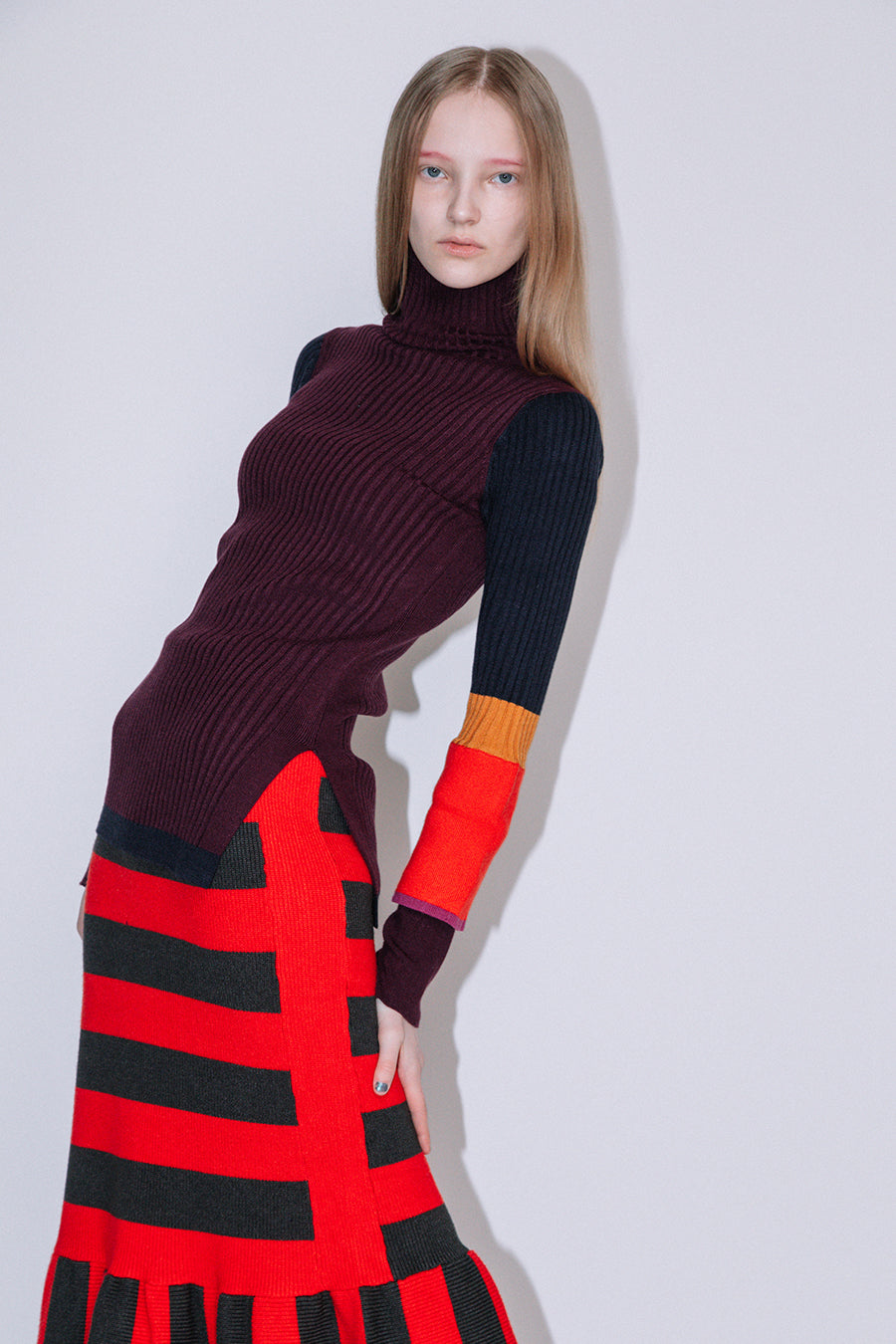 袖のカラーブロックのレイヤードデザインが目を惹くハイネックリブニット。