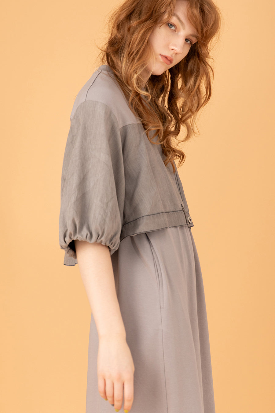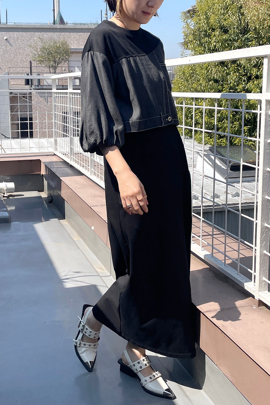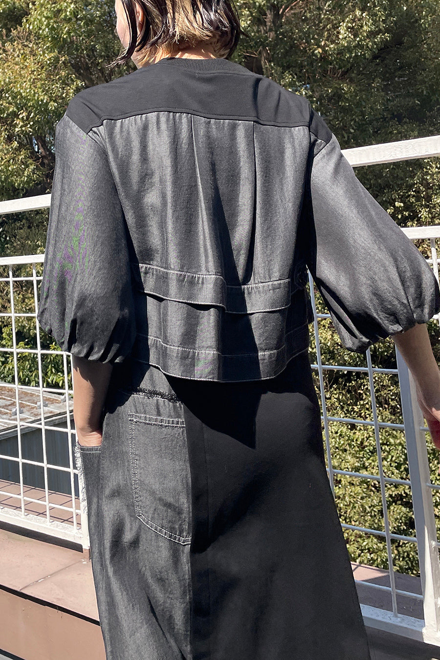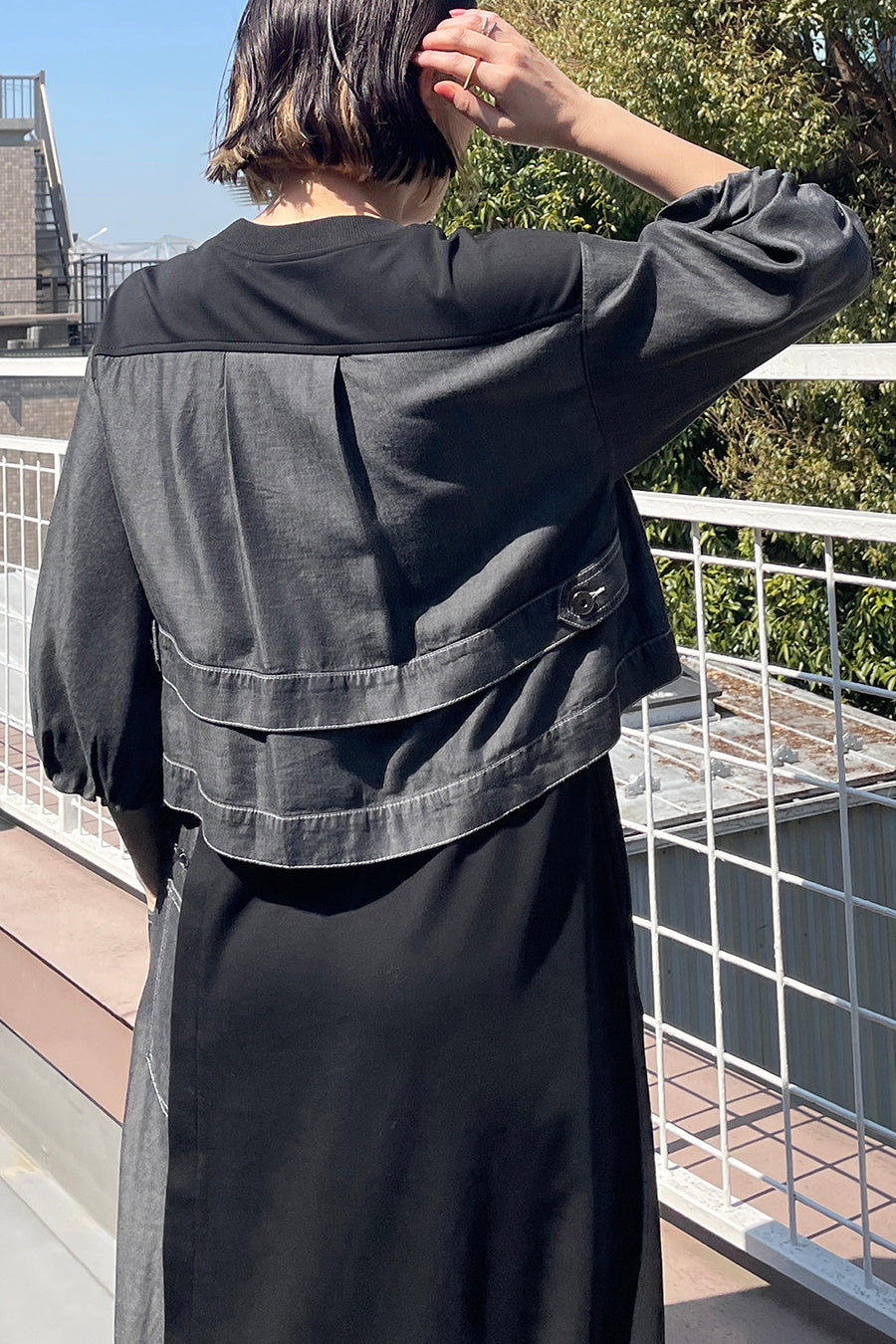 ライトオンスのテンセルデニムとコットンスムースのコンビネーションワンピース。落ち感のある柔らかいデニムを使用しているため、デニムながらも軽やかで着心地の良いワンピースに仕上げた1枚。デニムパンツやGジャンのディティールをアウラアイラらしくアシンメトリーに取り入れたアイテム。セットアップ風のレイヤードデザインが立体感を生み出し、トップス部分のフレアーシルエットがレディライクな印象に。スカートパーツはストレートに落ちるシルエットで、ヒップまわりをすっきりと見せてくれる。表から見えない位置にウエストドロストを通しているので、お好みでフレアシルエットにも調整可能。上身頃の裏側は伸縮のあるメッシュ素材で風通しが良く、夏まで快適に着用できところも◎。両側ポケットあり。裏地なし。