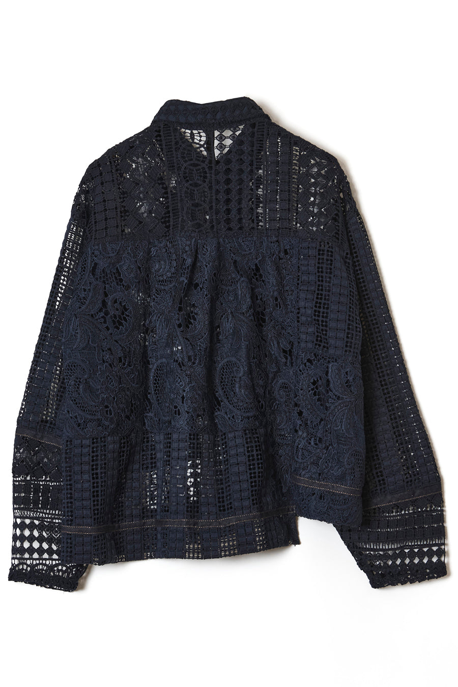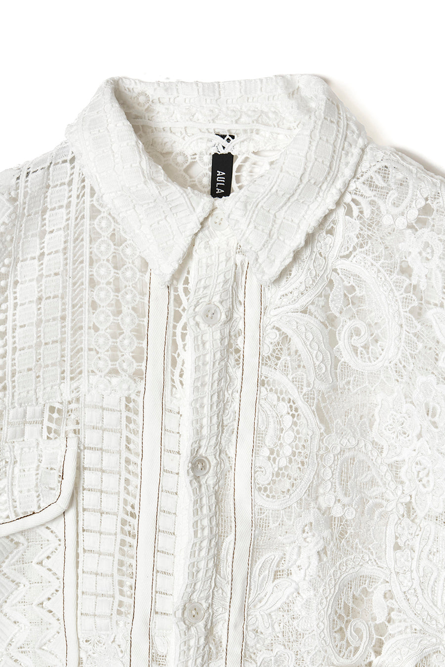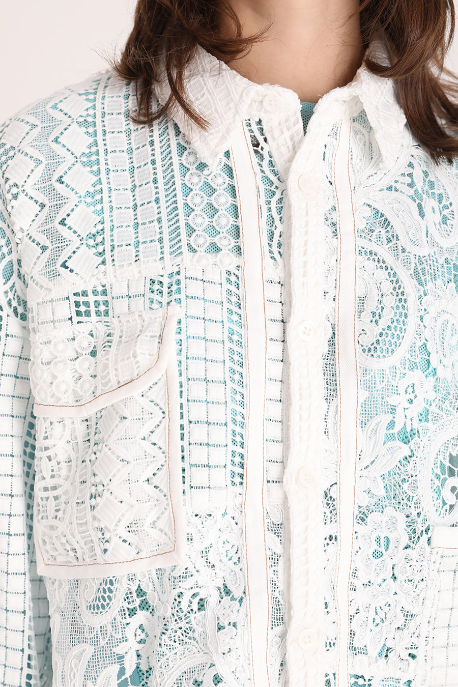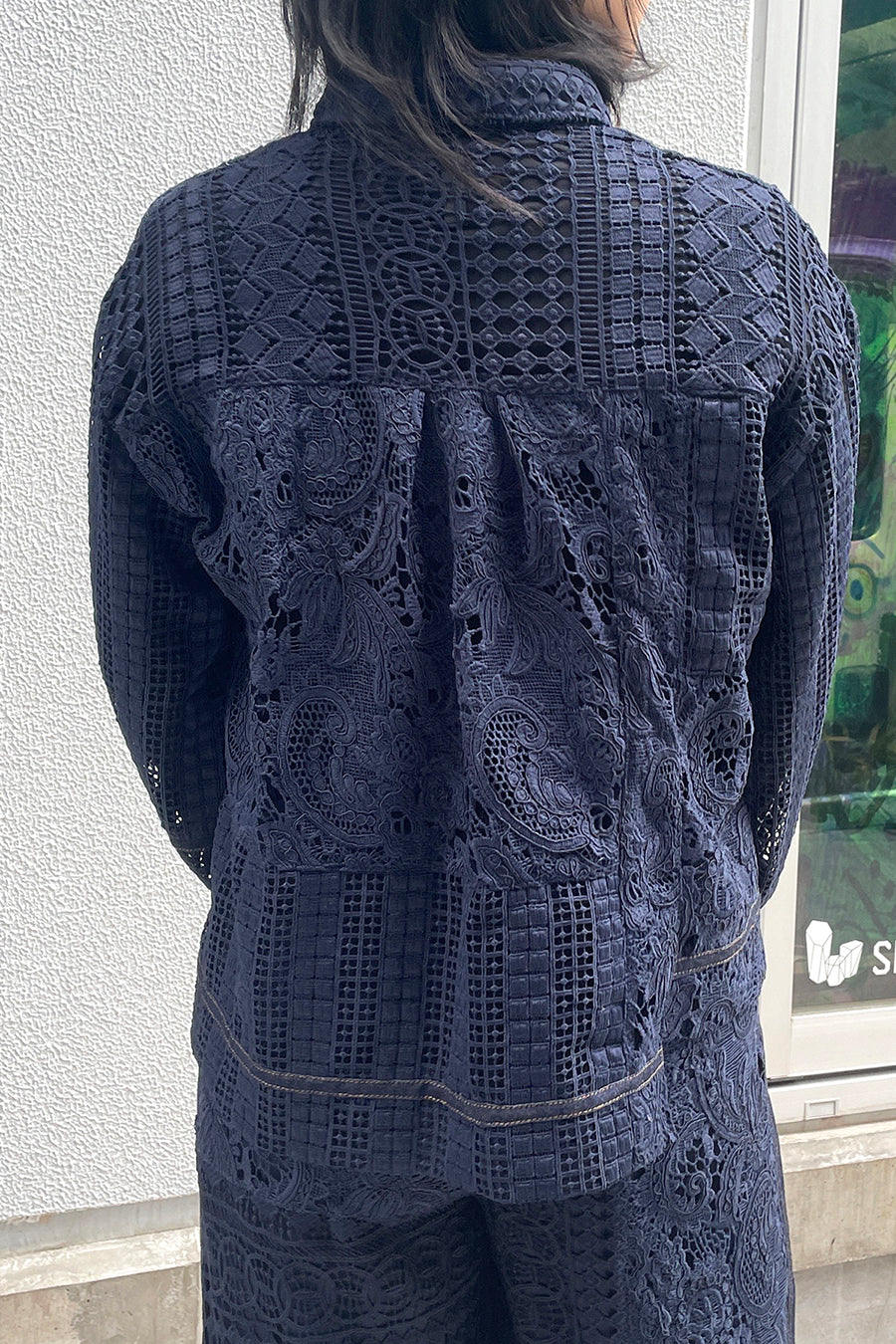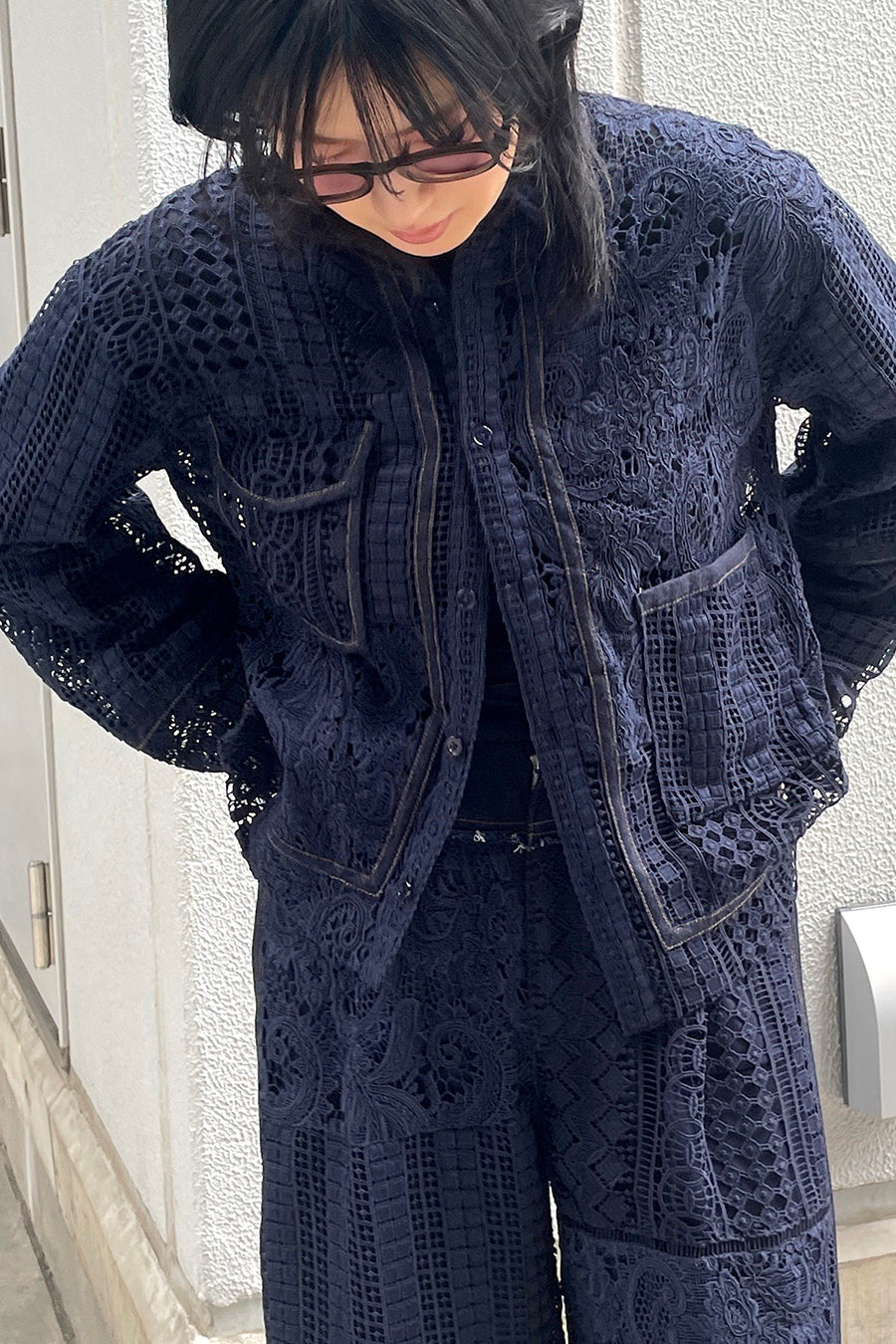 3種類のレースをコンビネーションしたオーバーシャツ。配色ステッチのさりげないデニムパイピングがアクセントに。幾何学柄とボタニカル柄レースをアシンメトリーに切り替え、スタイリングに合わせやすいまとまりのある絶妙な配置にこだわった1枚。透け感が涼しげで春から夏にかけてロングシーズン活躍できる万能シャツ。ゆとりのあるサイズ感なので、肌寒い時期はニットのインナートップスを中に合わせても◎夏はタンクトップの上にさらっと羽織りとしての着用もおすすめ。袖は丸みのあるカーヴィースリーブでレディライクなディティールに。右胸にはフラップポケットにデニムパイピング、左には非対称にパッチポケットを配置した細部まで拘ったアイテム。