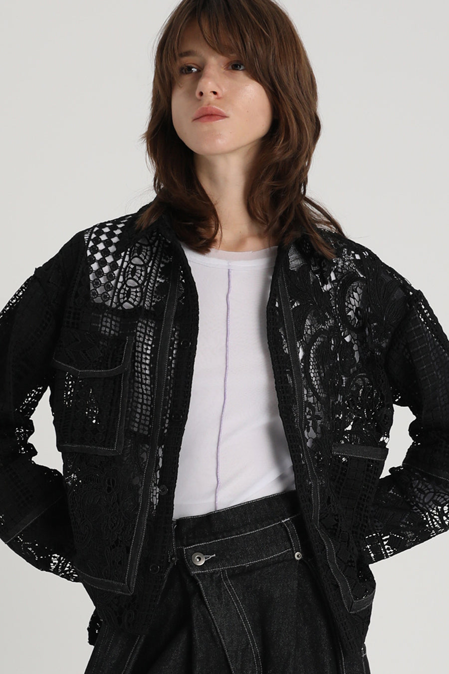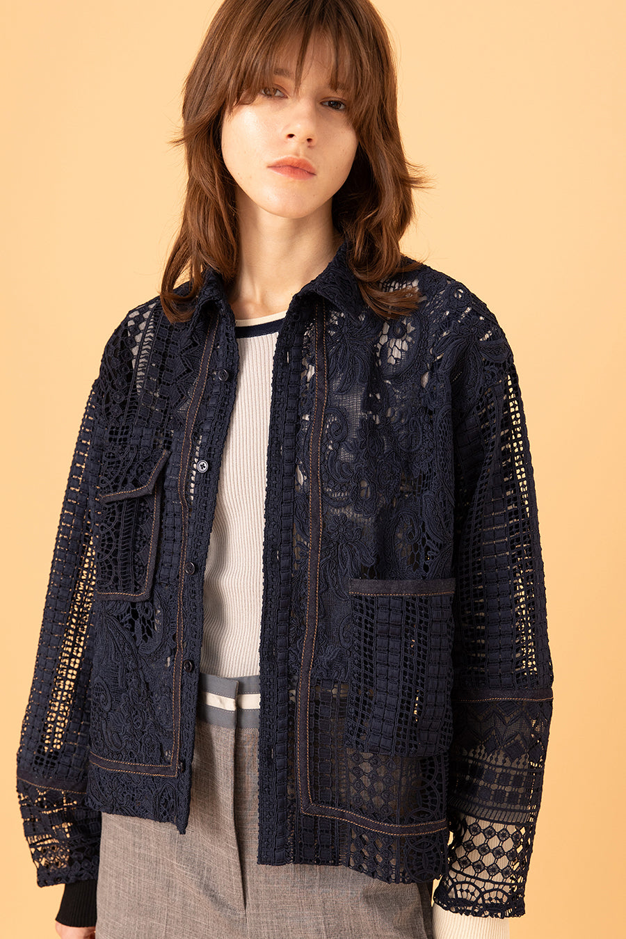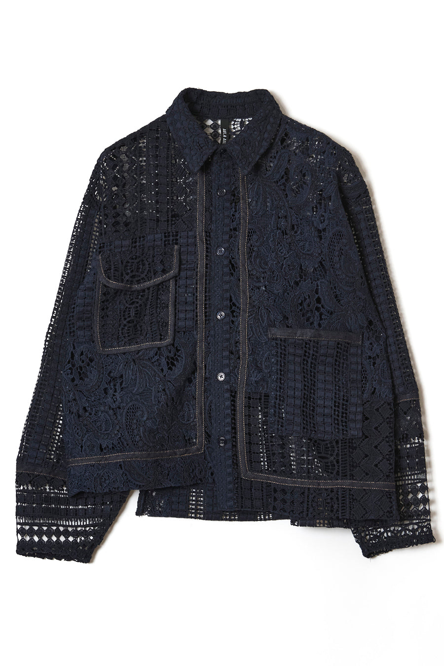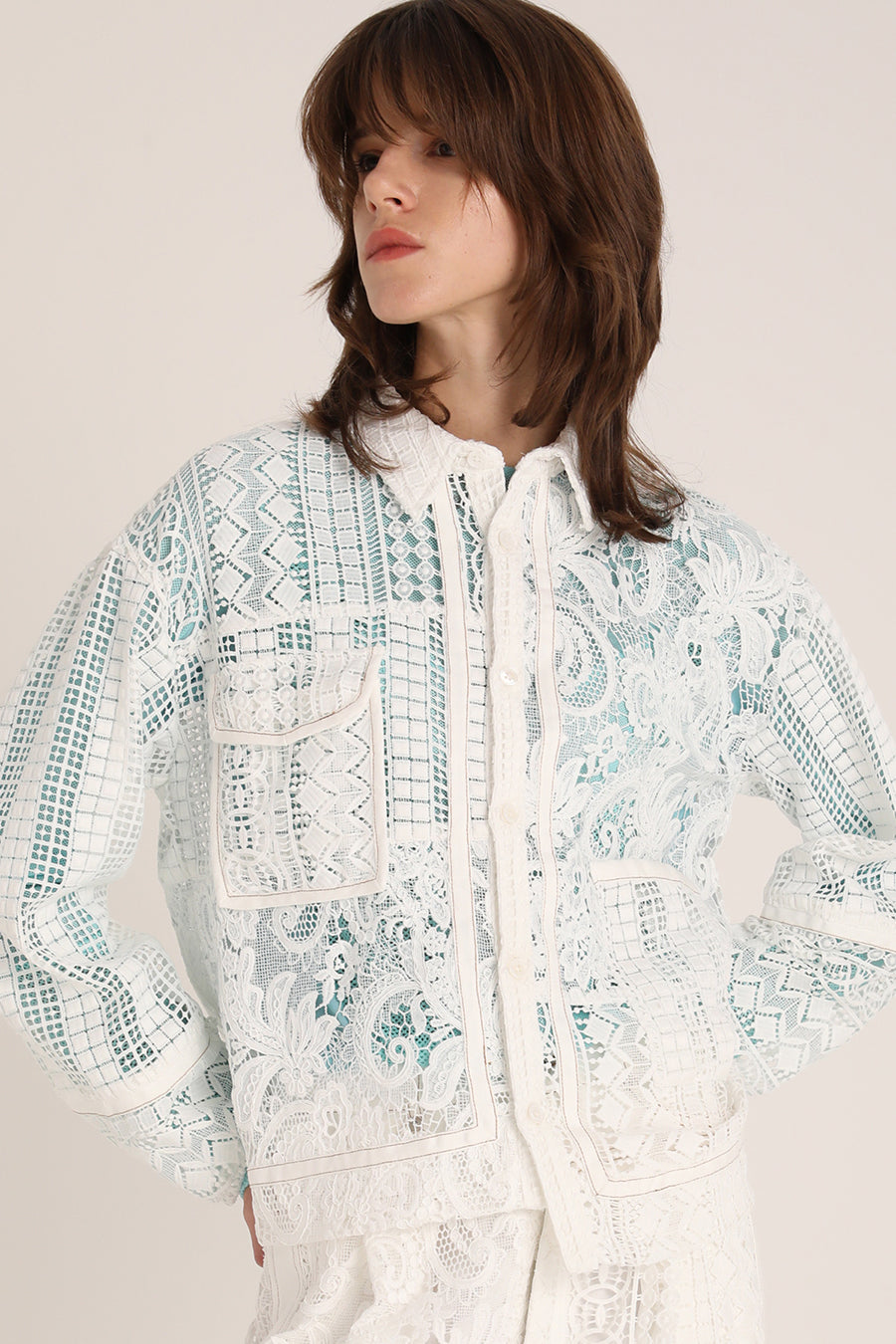 3種類のレースをコンビネーションしたオーバーシャツ。配色ステッチのさりげないデニムパイピングがアクセントに。幾何学柄とボタニカル柄レースをアシンメトリーに切り替え、スタイリングに合わせやすいまとまりのある絶妙な配置にこだわった1枚。透け感が涼しげで春から夏にかけてロングシーズン活躍できる万能シャツ。ゆとりのあるサイズ感なので、肌寒い時期はニットのインナートップスを中に合わせても◎夏はタンクトップの上にさらっと羽織りとしての着用もおすすめ。袖は丸みのあるカーヴィースリーブでレディライクなディティールに。右胸にはフラップポケットにデニムパイピング、左には非対称にパッチポケットを配置した細部まで拘ったアイテム。