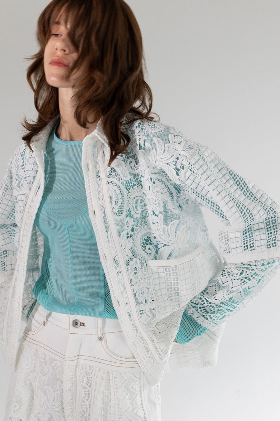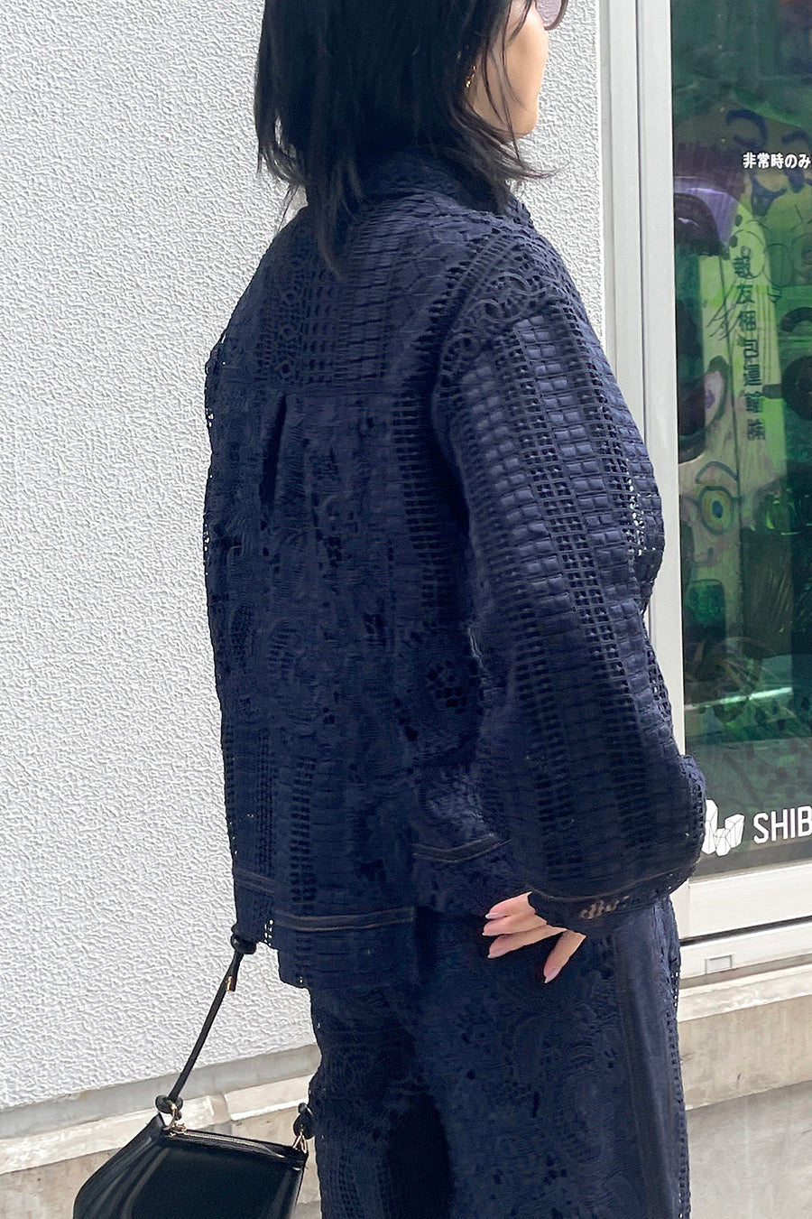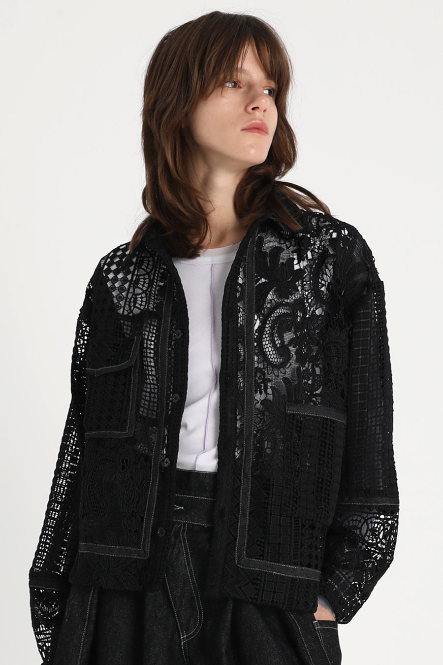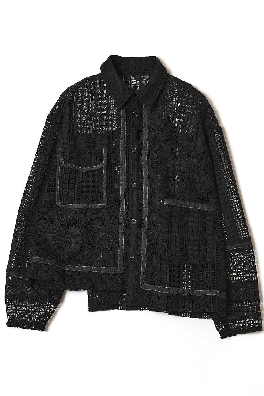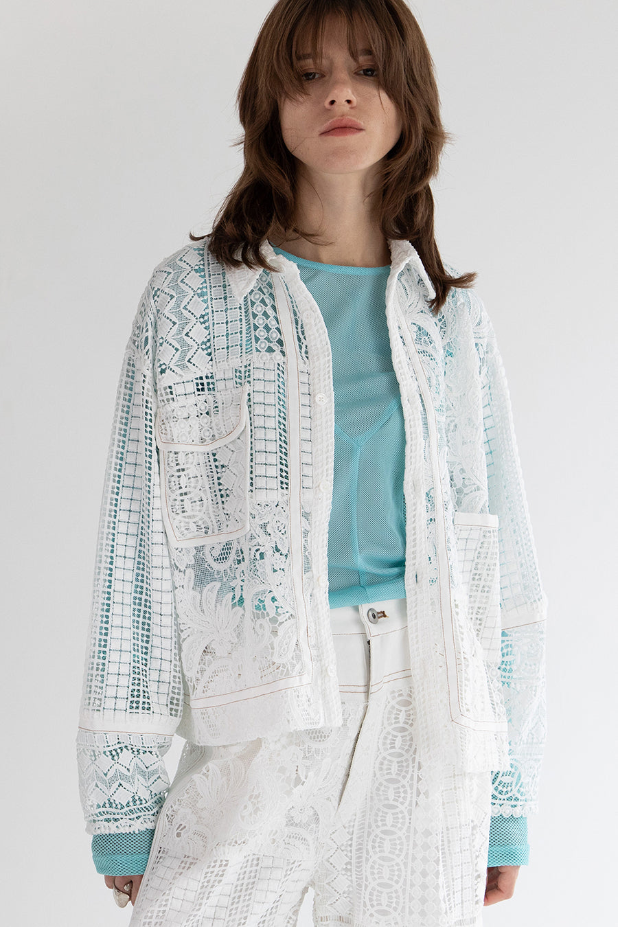 3種類のレースをコンビネーションしたオーバーシャツ。配色ステッチのさりげないデニムパイピングがアクセントに。幾何学柄とボタニカル柄レースをアシンメトリーに切り替え、スタイリングに合わせやすいまとまりのある絶妙な配置にこだわった1枚。透け感が涼しげで春から夏にかけてロングシーズン活躍できる万能シャツ。ゆとりのあるサイズ感なので、肌寒い時期はニットのインナートップスを中に合わせても◎夏はタンクトップの上にさらっと羽織りとしての着用もおすすめ。袖は丸みのあるカーヴィースリーブでレディライクなディティールに。右胸にはフラップポケットにデニムパイピング、左には非対称にパッチポケットを配置した細部まで拘ったアイテム。
