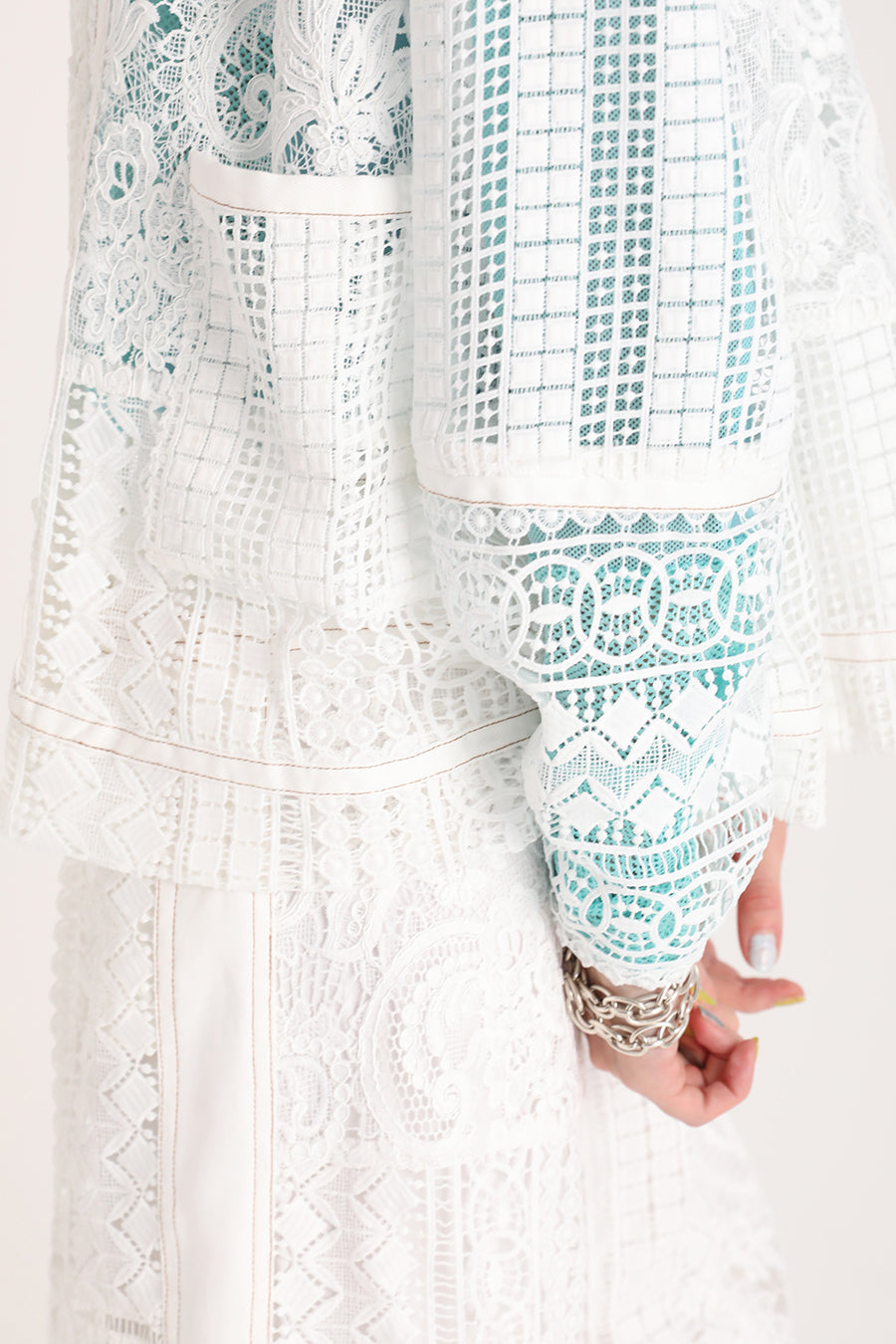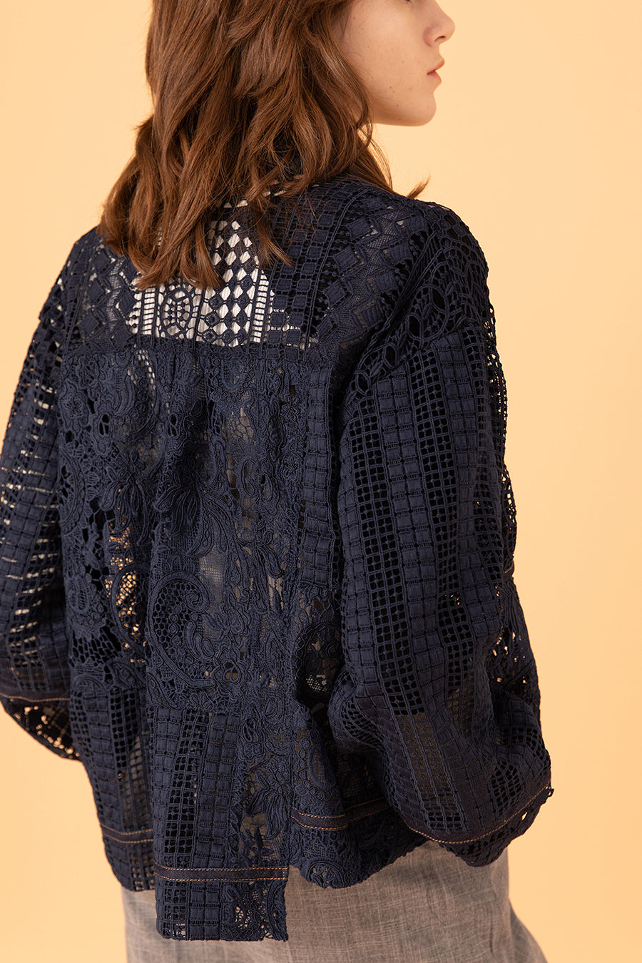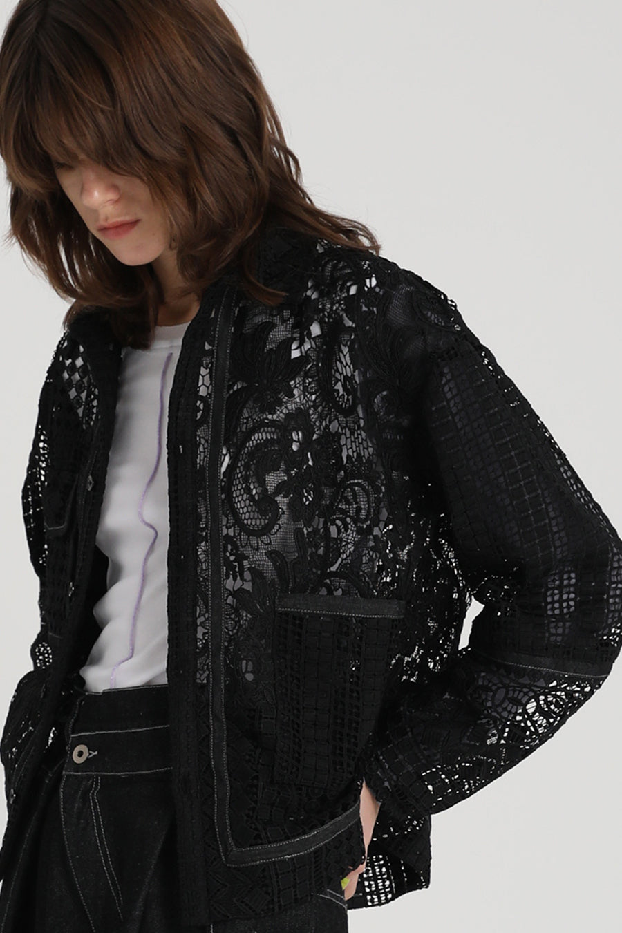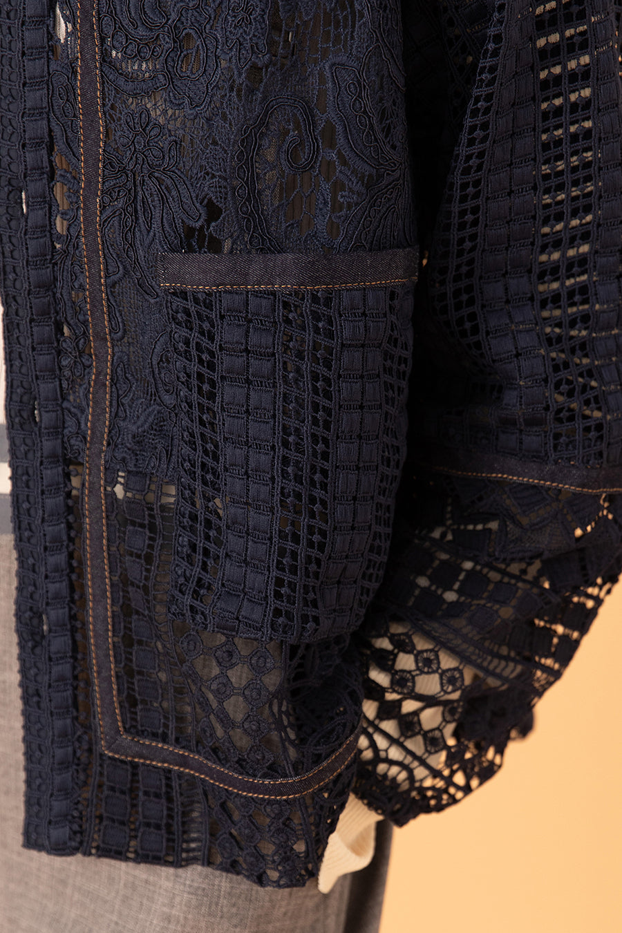 3種類のレースをコンビネーションしたオーバーシャツ。配色ステッチのさりげないデニムパイピングがアクセントに。幾何学柄とボタニカル柄レースをアシンメトリーに切り替え、スタイリングに合わせやすいまとまりのある絶妙な配置にこだわった1枚。透け感が涼しげで春から夏にかけてロングシーズン活躍できる万能シャツ。ゆとりのあるサイズ感なので、肌寒い時期はニットのインナートップスを中に合わせても◎夏はタンクトップの上にさらっと羽織りとしての着用もおすすめ。袖は丸みのあるカーヴィースリーブでレディライクなディティールに。右胸にはフラップポケットにデニムパイピング、左には非対称にパッチポケットを配置した細部まで拘ったアイテム。