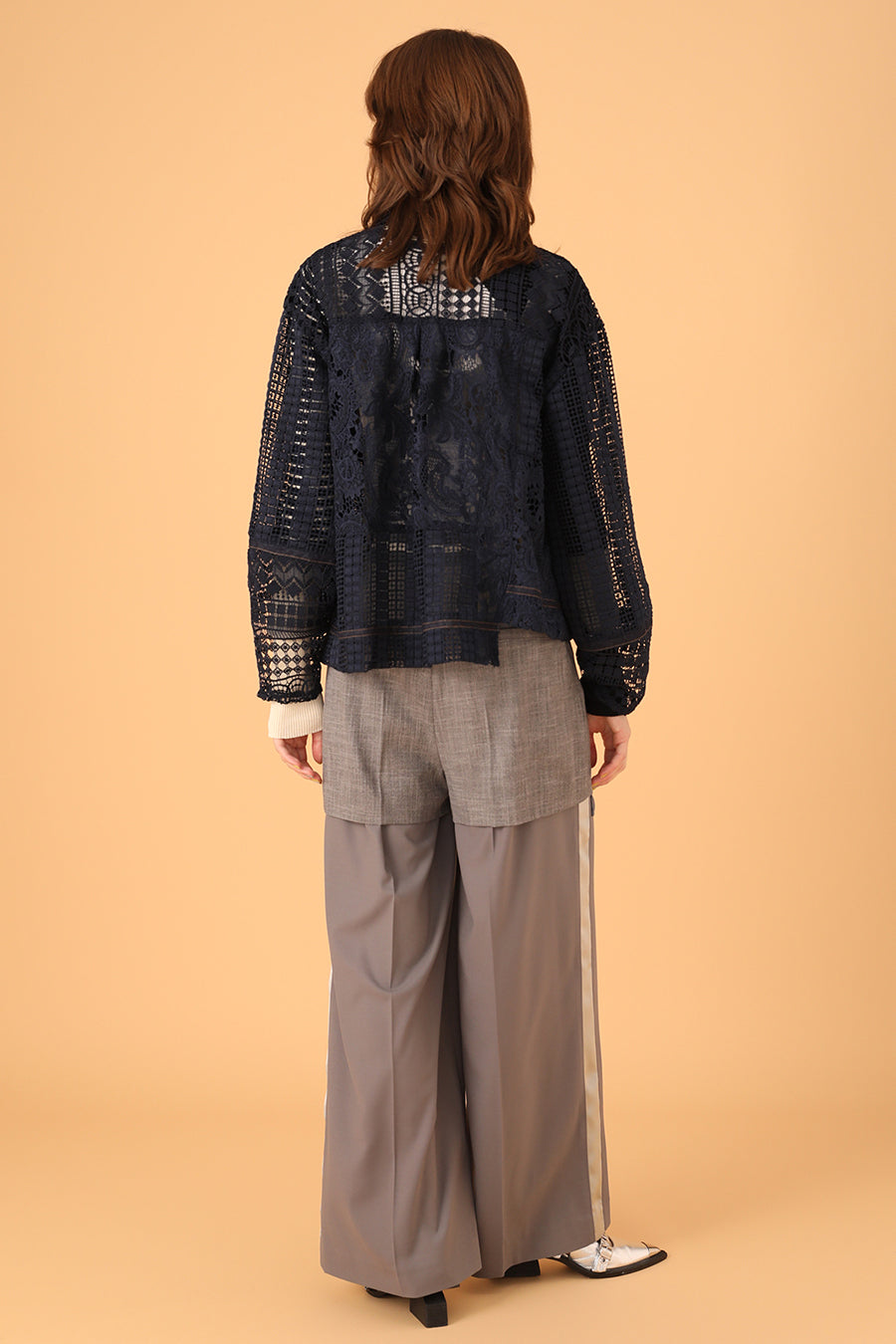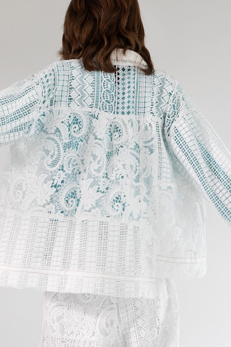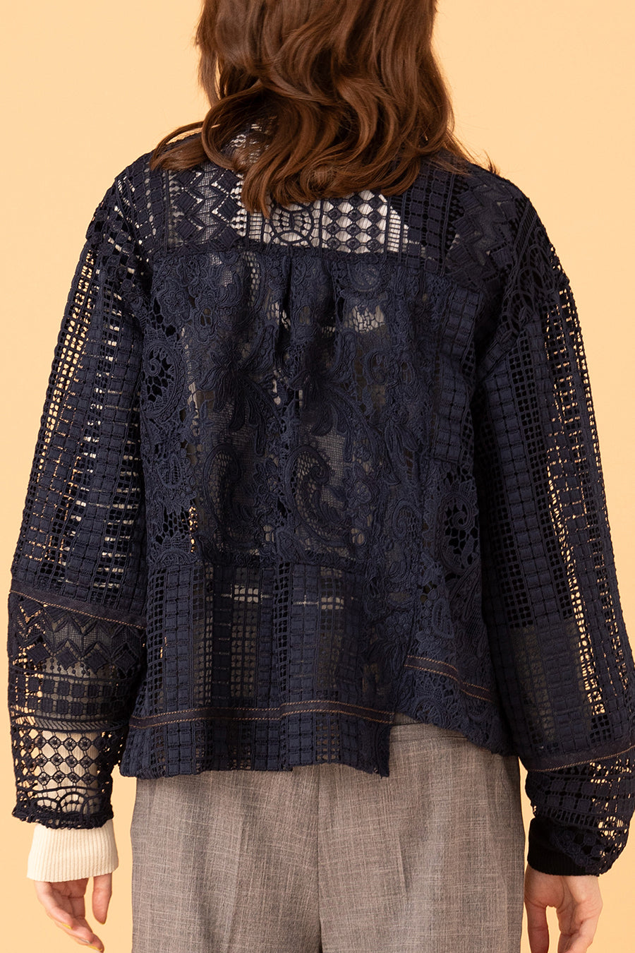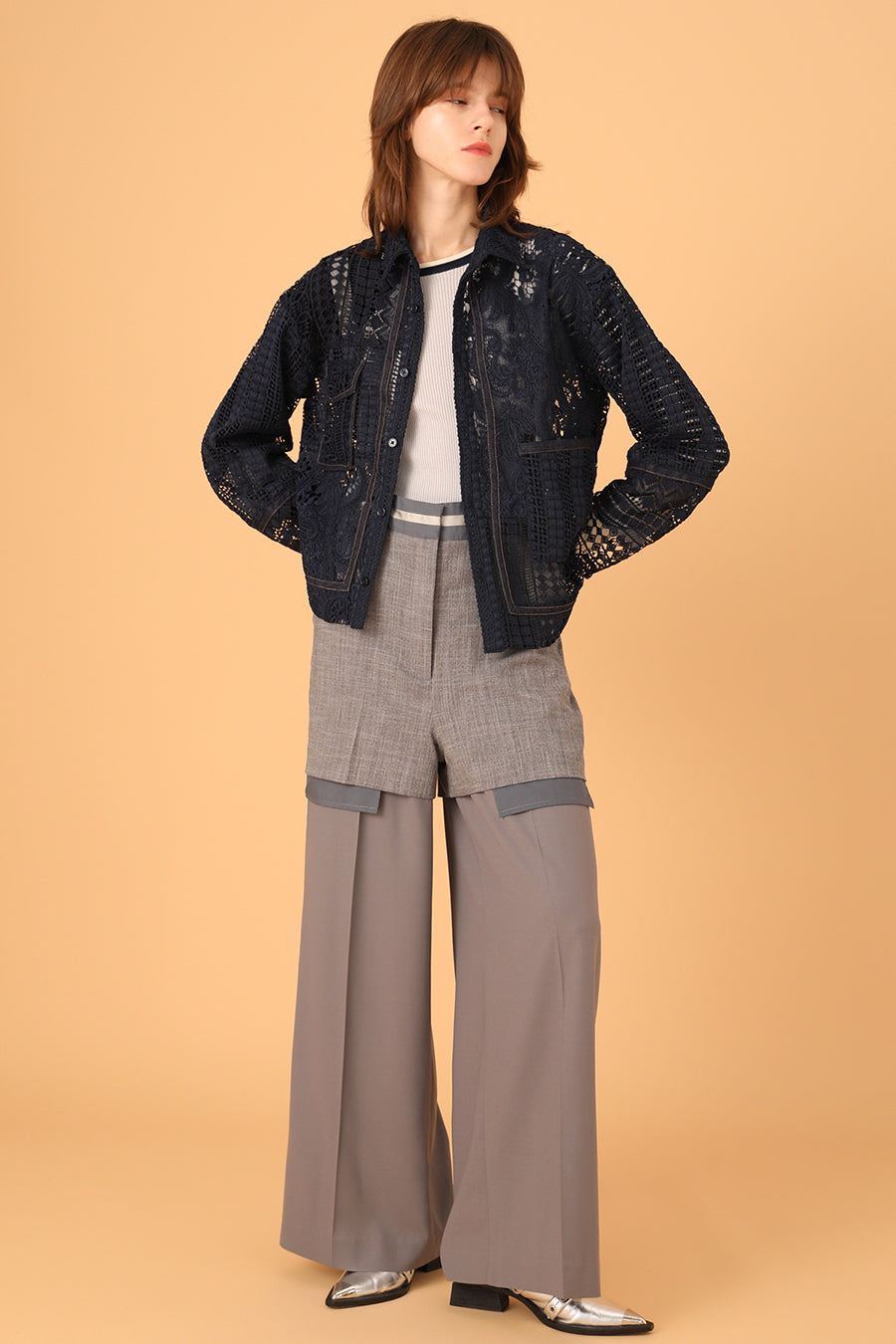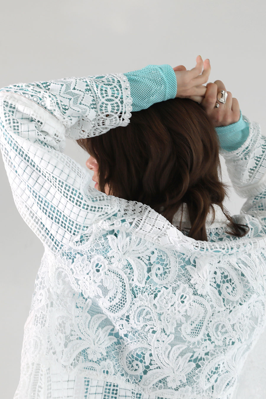 3種類のレースをコンビネーションしたオーバーシャツ。配色ステッチのさりげないデニムパイピングがアクセントに。幾何学柄とボタニカル柄レースをアシンメトリーに切り替え、スタイリングに合わせやすいまとまりのある絶妙な配置にこだわった1枚。透け感が涼しげで春から夏にかけてロングシーズン活躍できる万能シャツ。ゆとりのあるサイズ感なので、肌寒い時期はニットのインナートップスを中に合わせても◎夏はタンクトップの上にさらっと羽織りとしての着用もおすすめ。袖は丸みのあるカーヴィースリーブでレディライクなディティールに。右胸にはフラップポケットにデニムパイピング、左には非対称にパッチポケットを配置した細部まで拘ったアイテム。