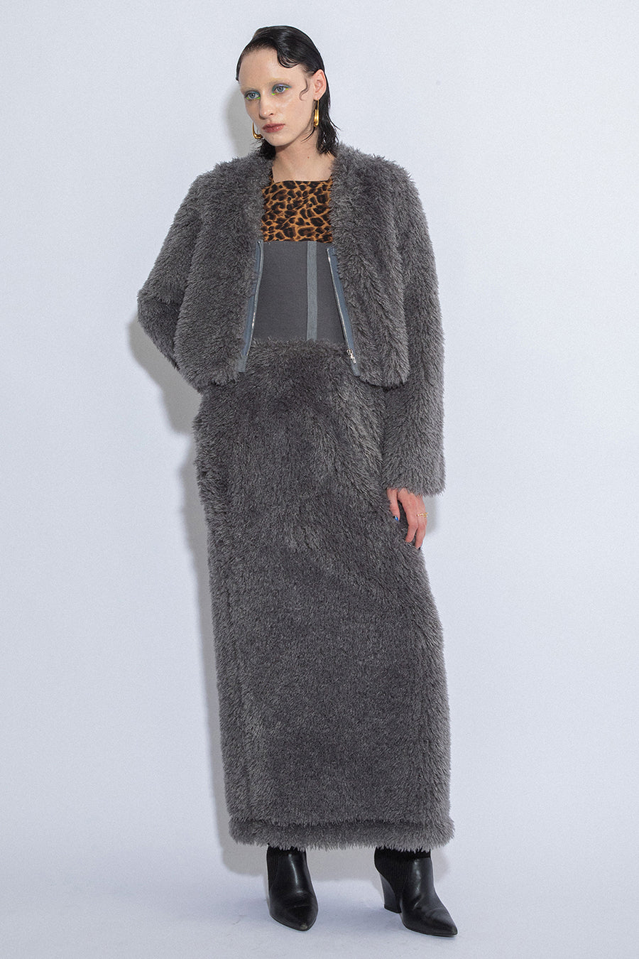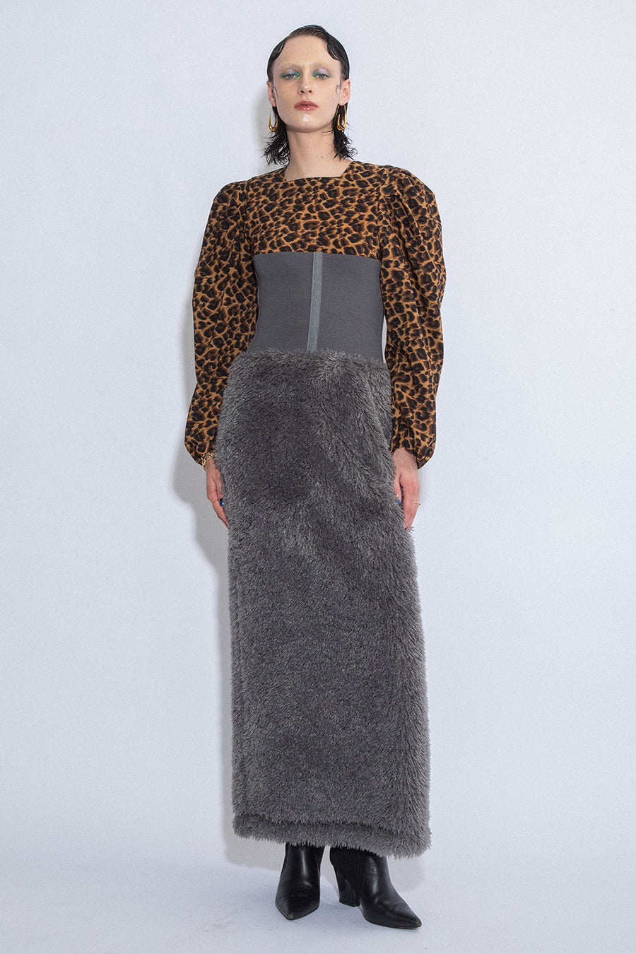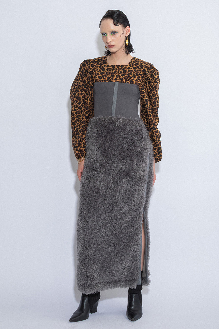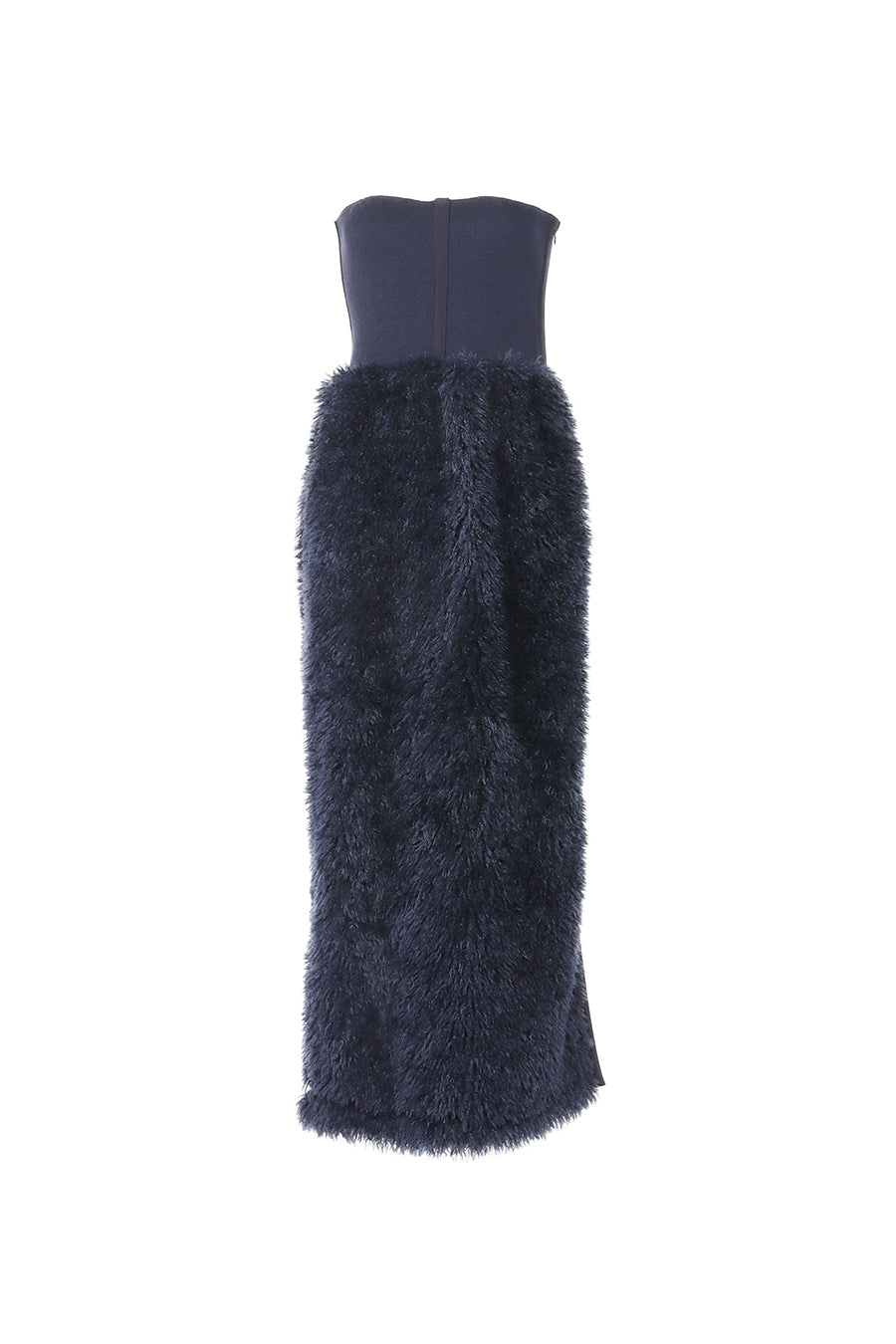 シープファーのようなカールしたファーが目を惹く、秋冬アイテムらしいボリューミーで温もり感がたっぷりなベアワンピース。胸のリブと左脇のポンチ素材の切り替えが身体にフィットし、ファーとのシルエットに強弱をつけたカービーラインで女性らしい印象に。