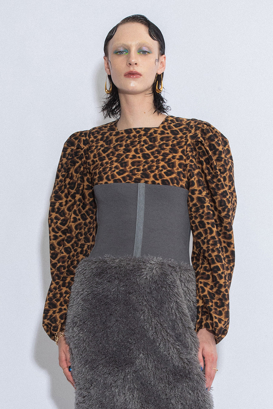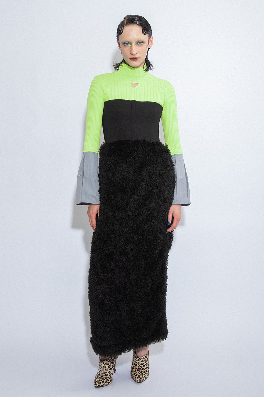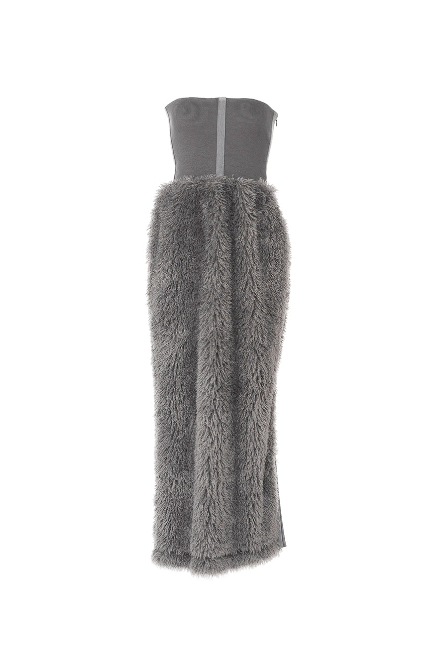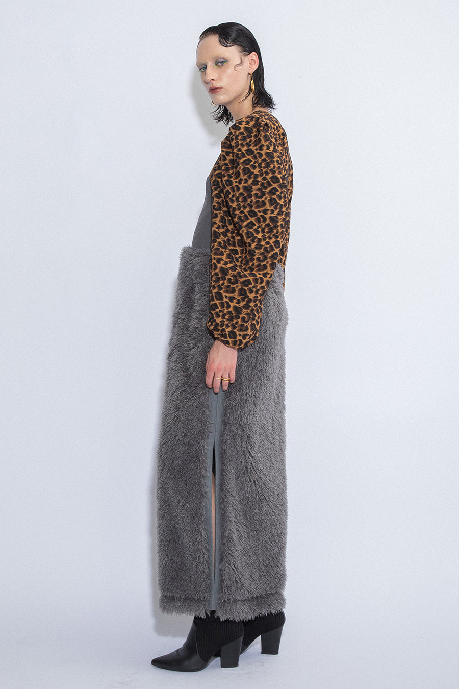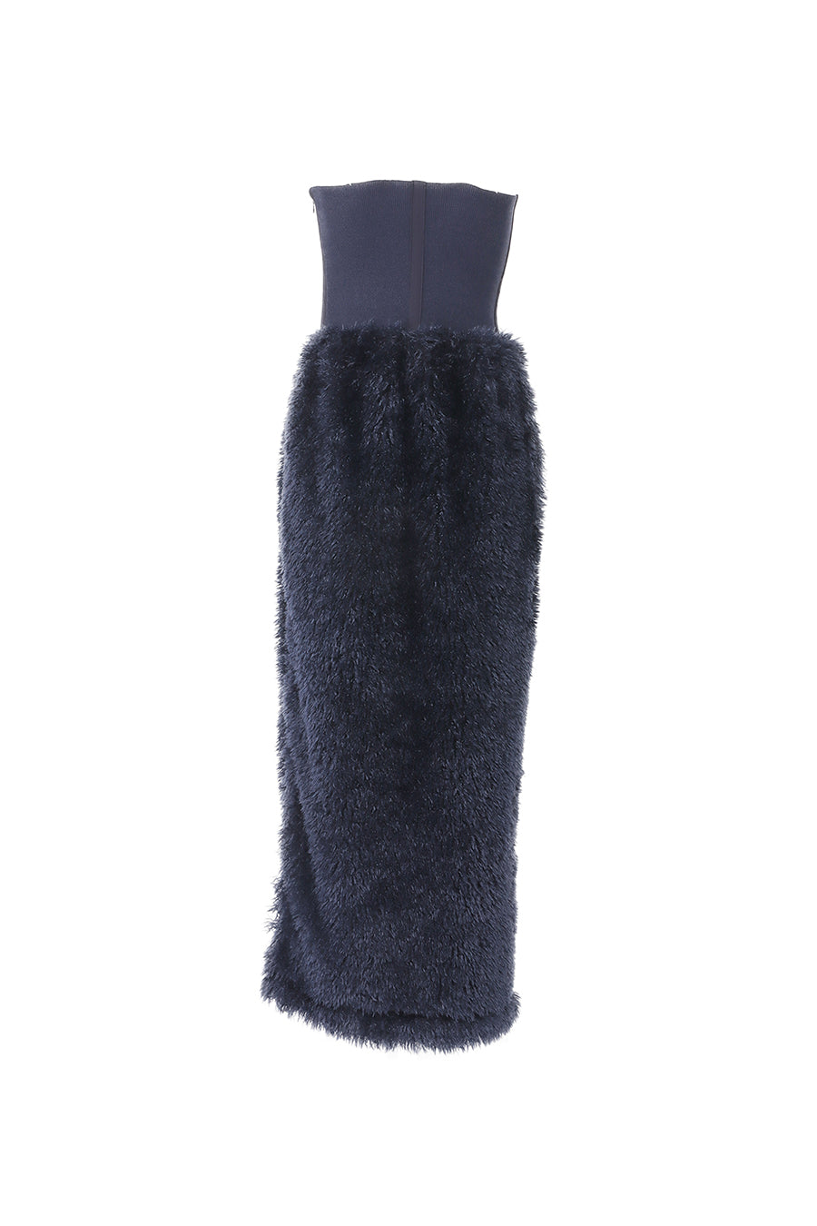 シープファーのようなカールしたファーが目を惹く、秋冬アイテムらしいボリューミーで温もり感がたっぷりなベアワンピース。胸のリブと左脇のポンチ素材の切り替えが身体にフィットし、ファーとのシルエットに強弱をつけたカービーラインで女性らしい印象に。
