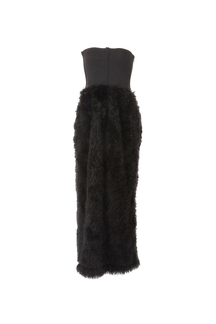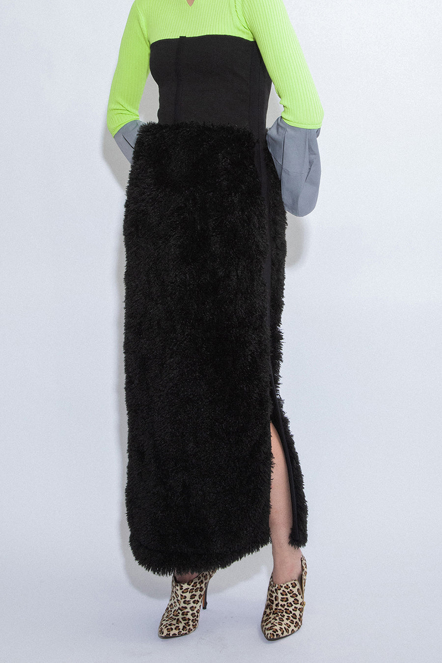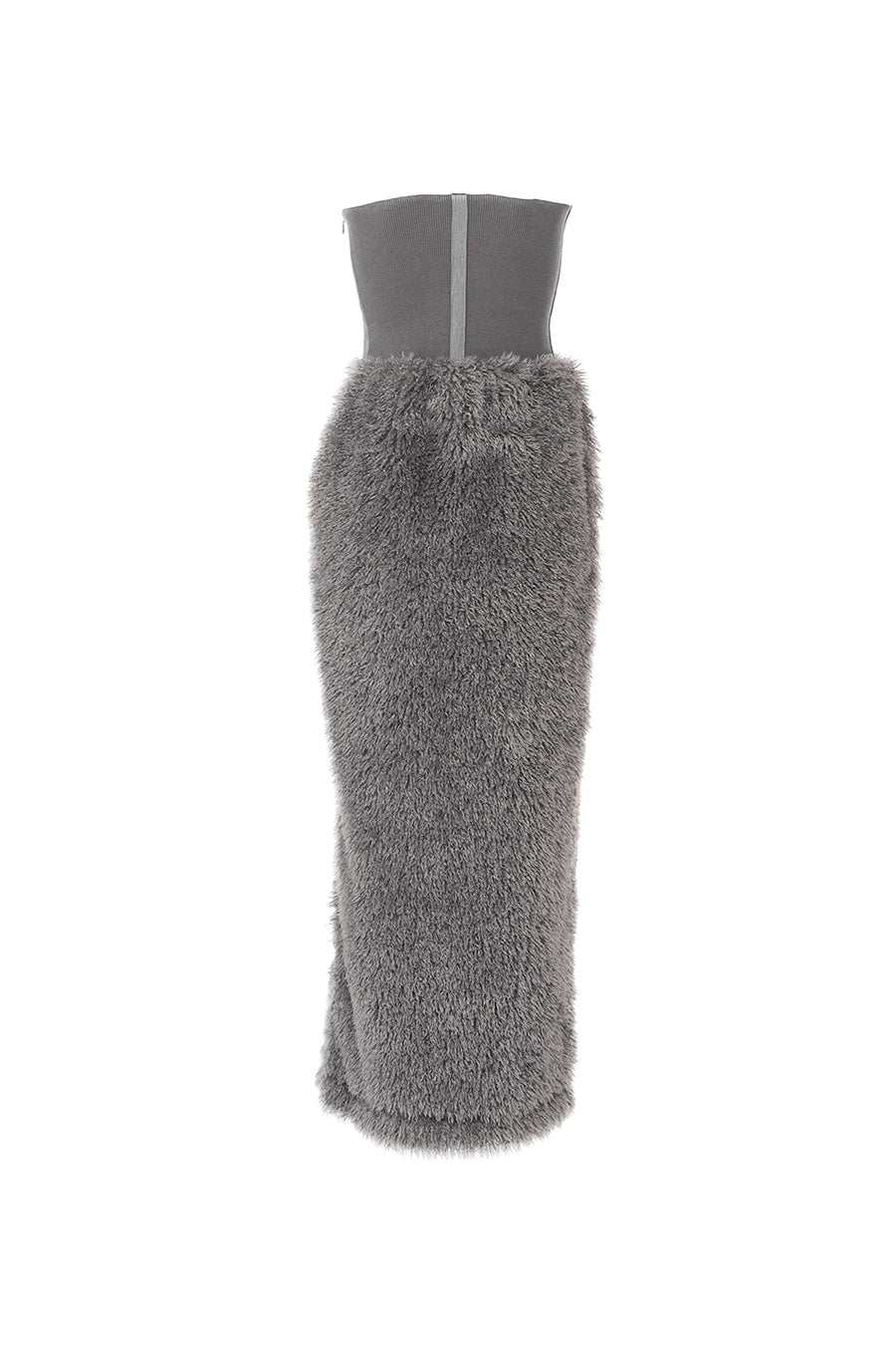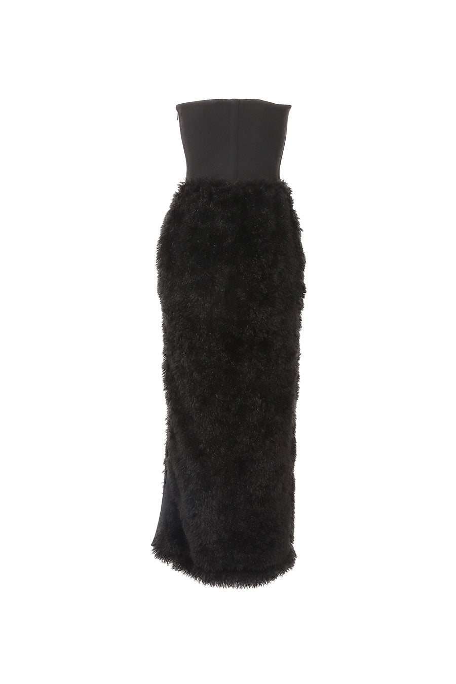 シープファーのようなカールしたファーが目を惹く、秋冬アイテムらしいボリューミーで温もり感がたっぷりなベアワンピース。胸のリブと左脇のポンチ素材の切り替えが身体にフィットし、ファーとのシルエットに強弱をつけたカービーラインで女性らしい印象に。