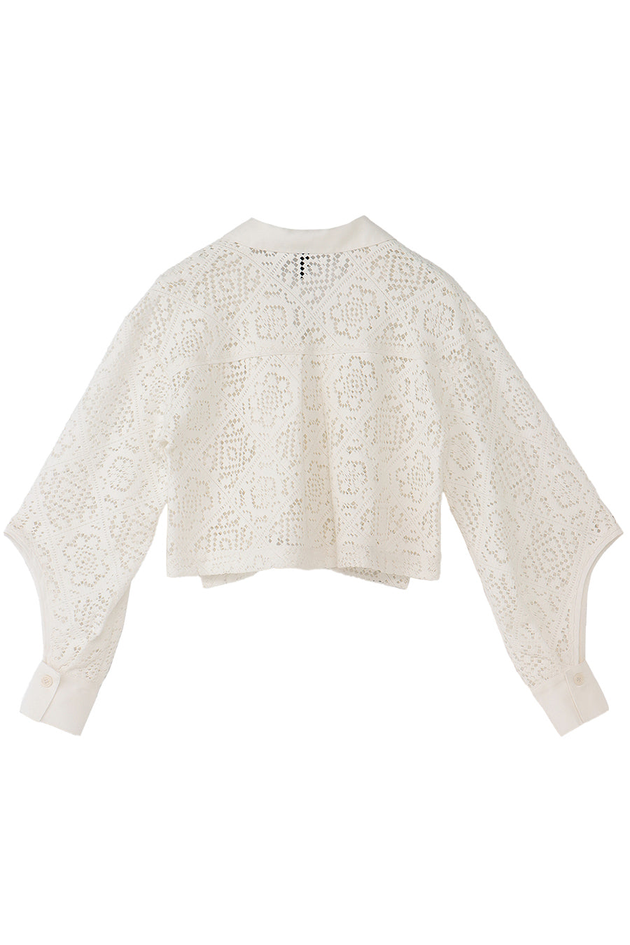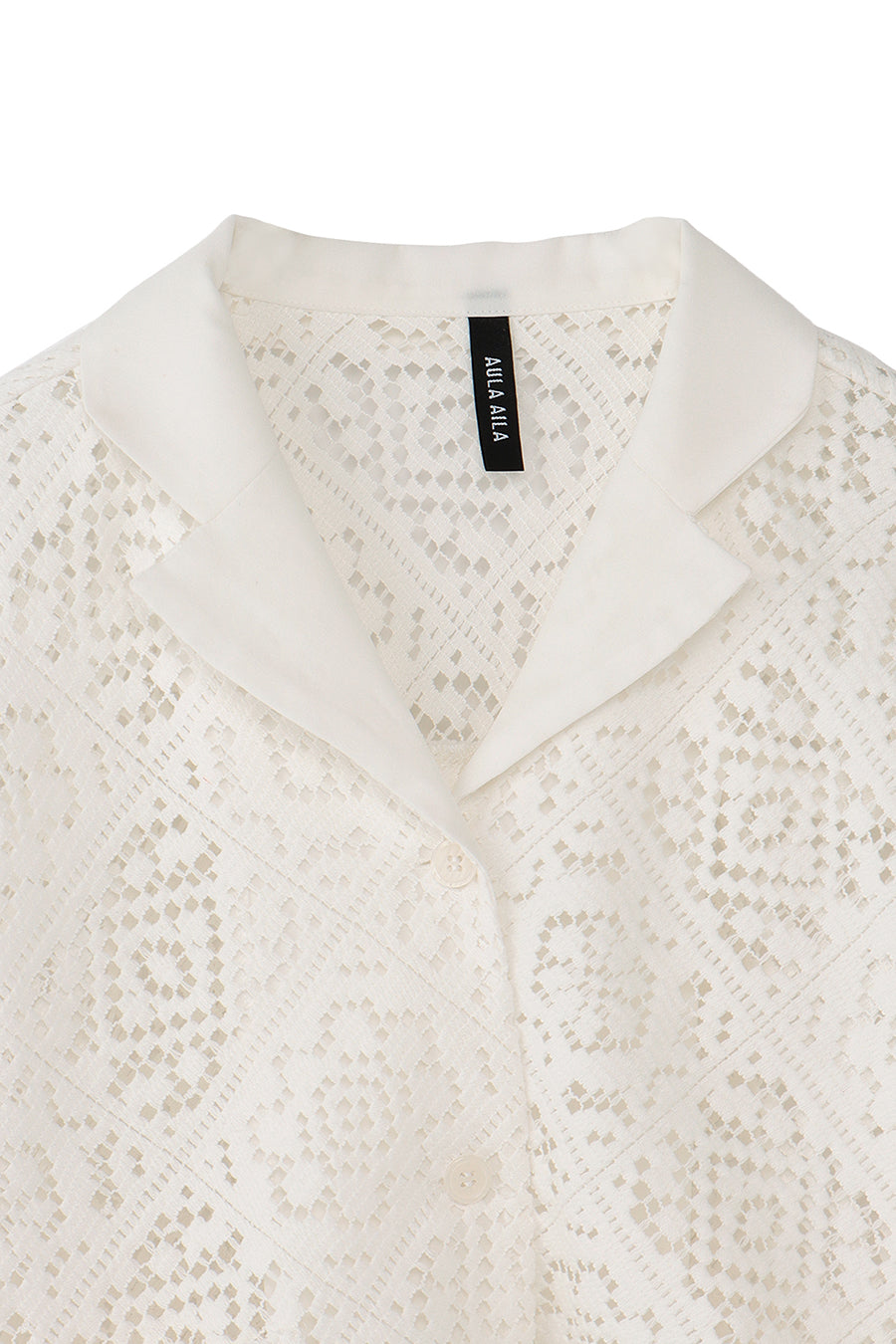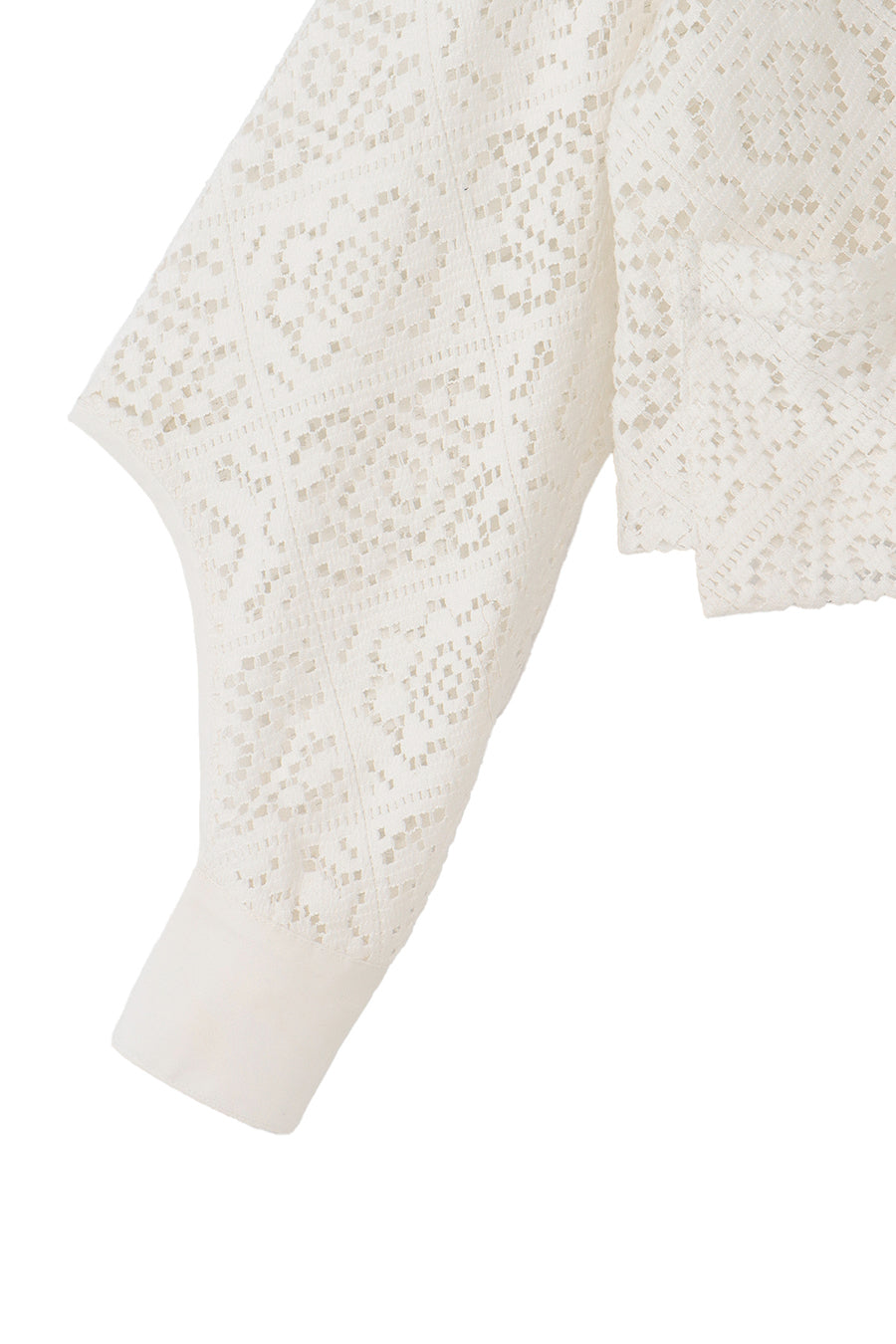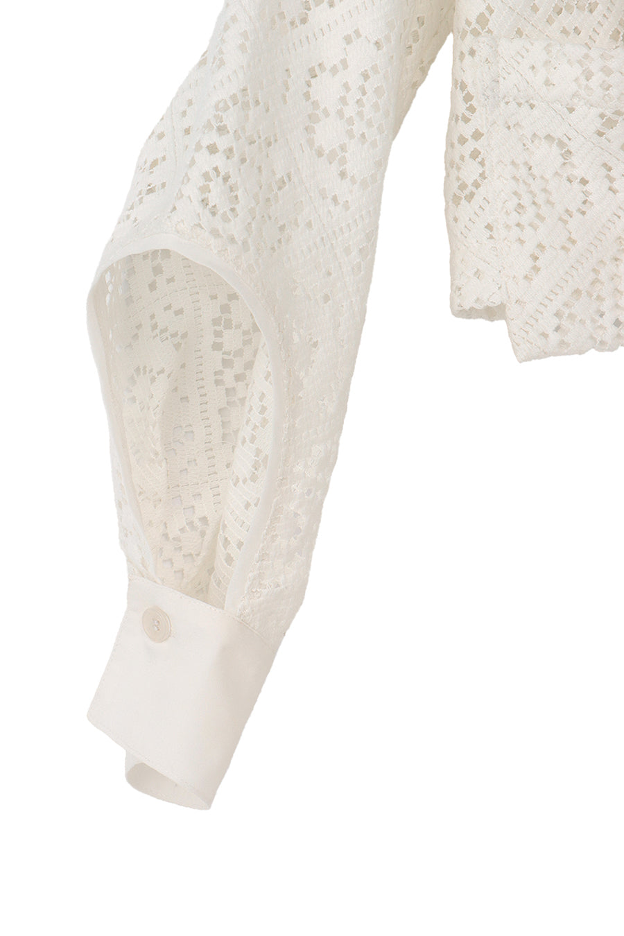 幾何学柄がスクエア状になっている透け感のあるレースを使用した春夏らしい涼し気なシャツ。