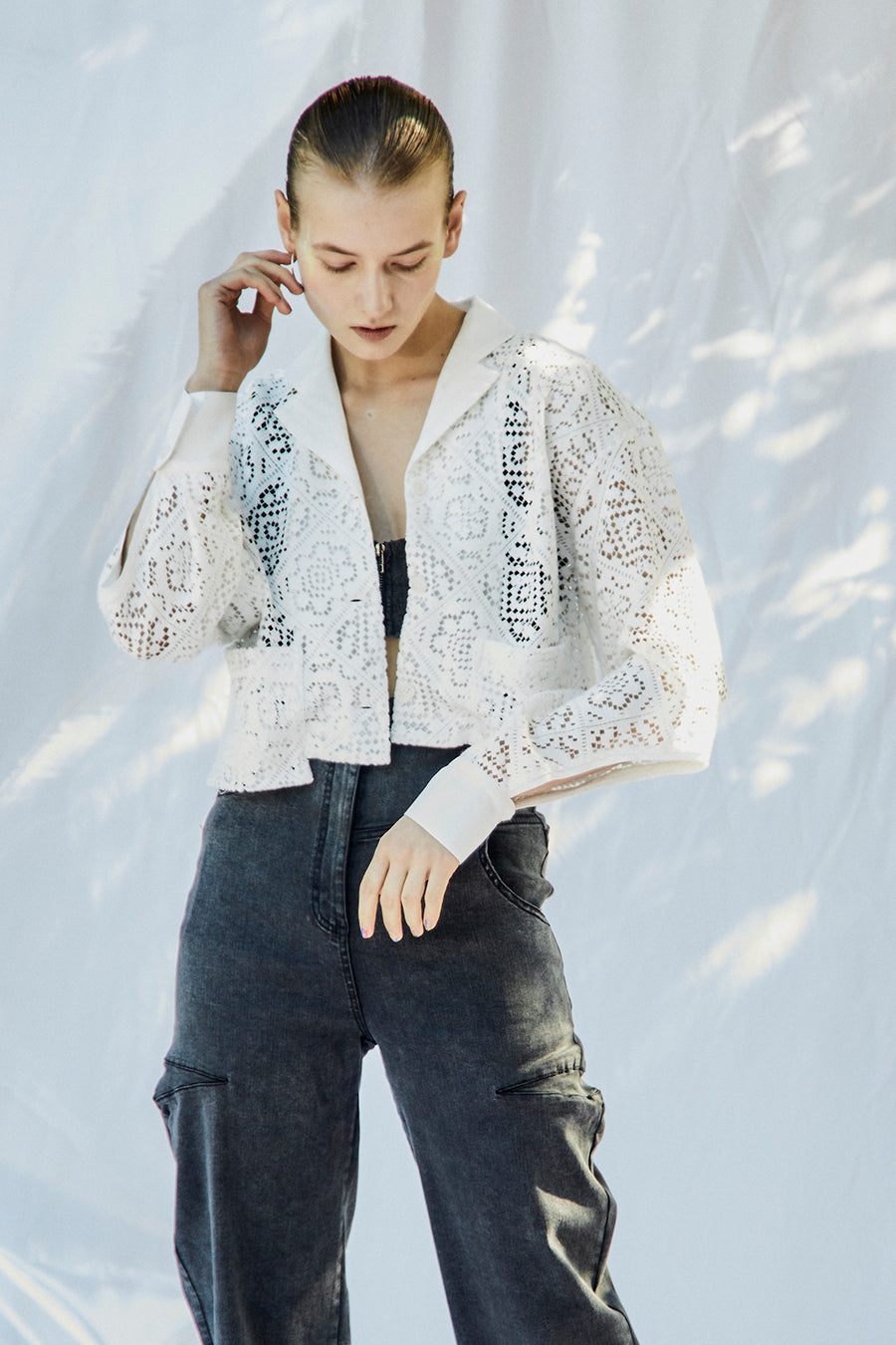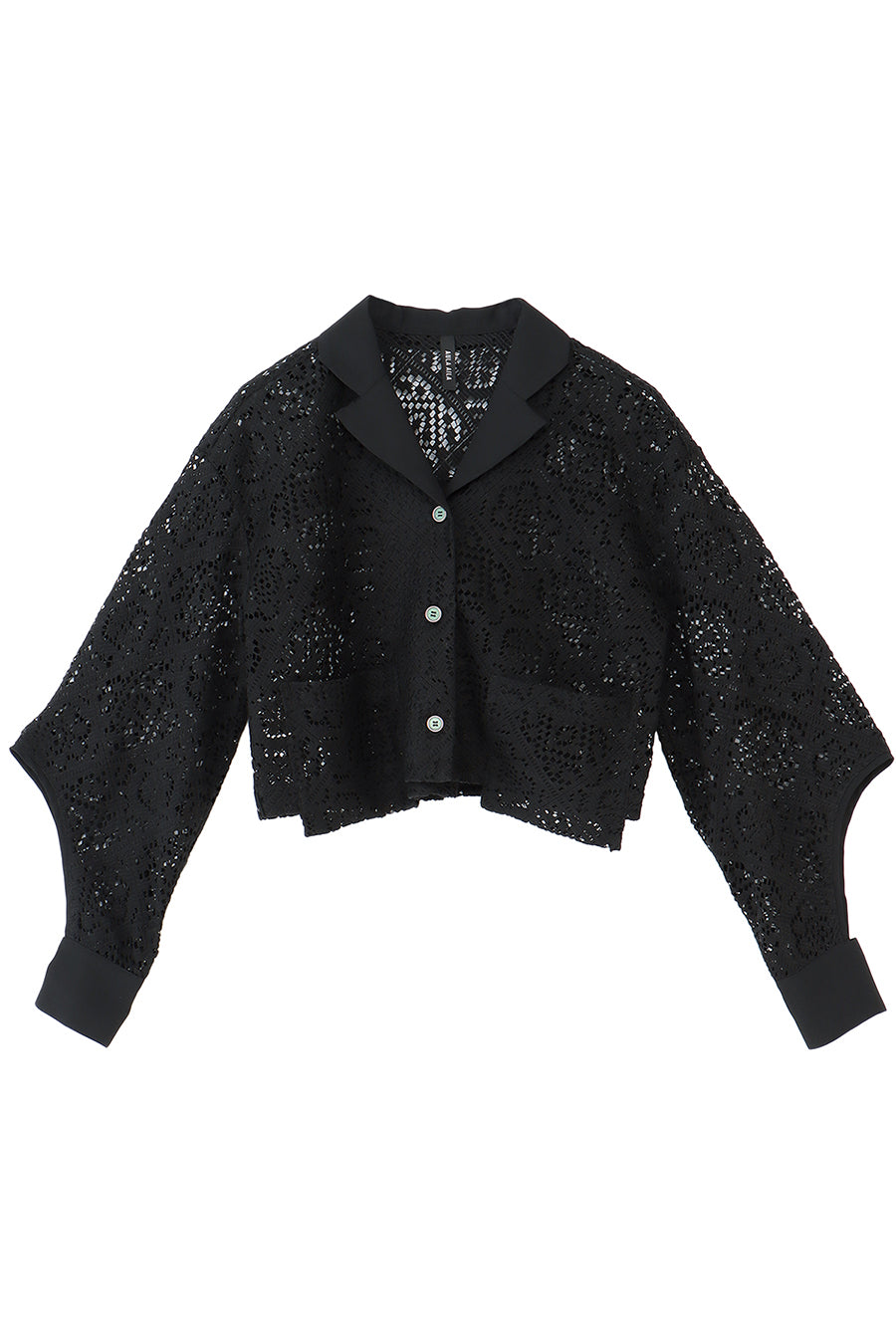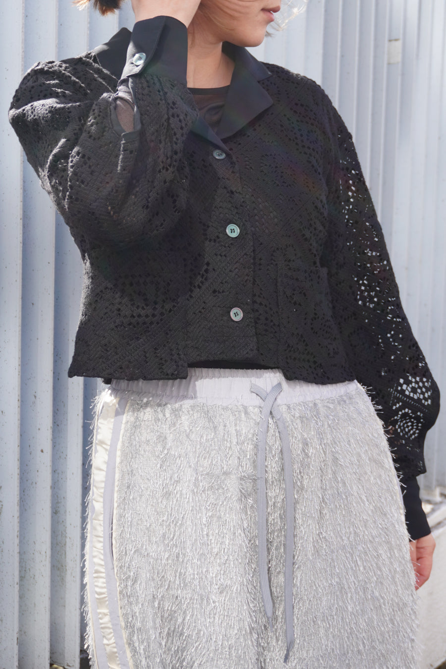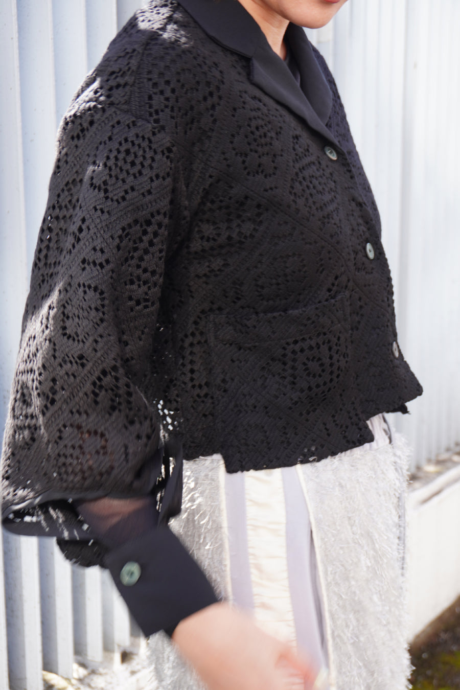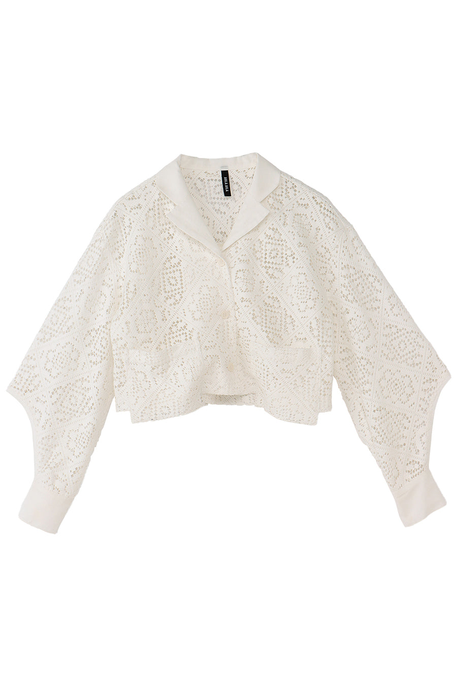 幾何学柄がスクエア状になっている透け感のあるレースを使用した春夏らしい涼し気なシャツ。