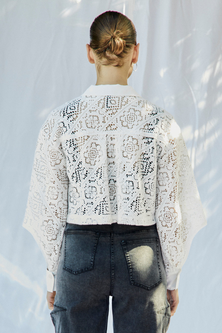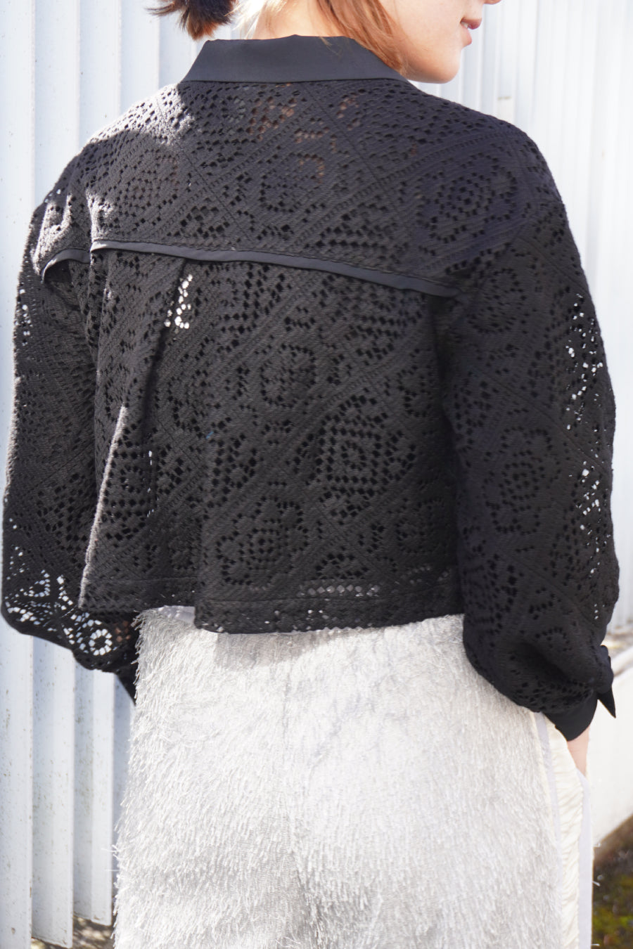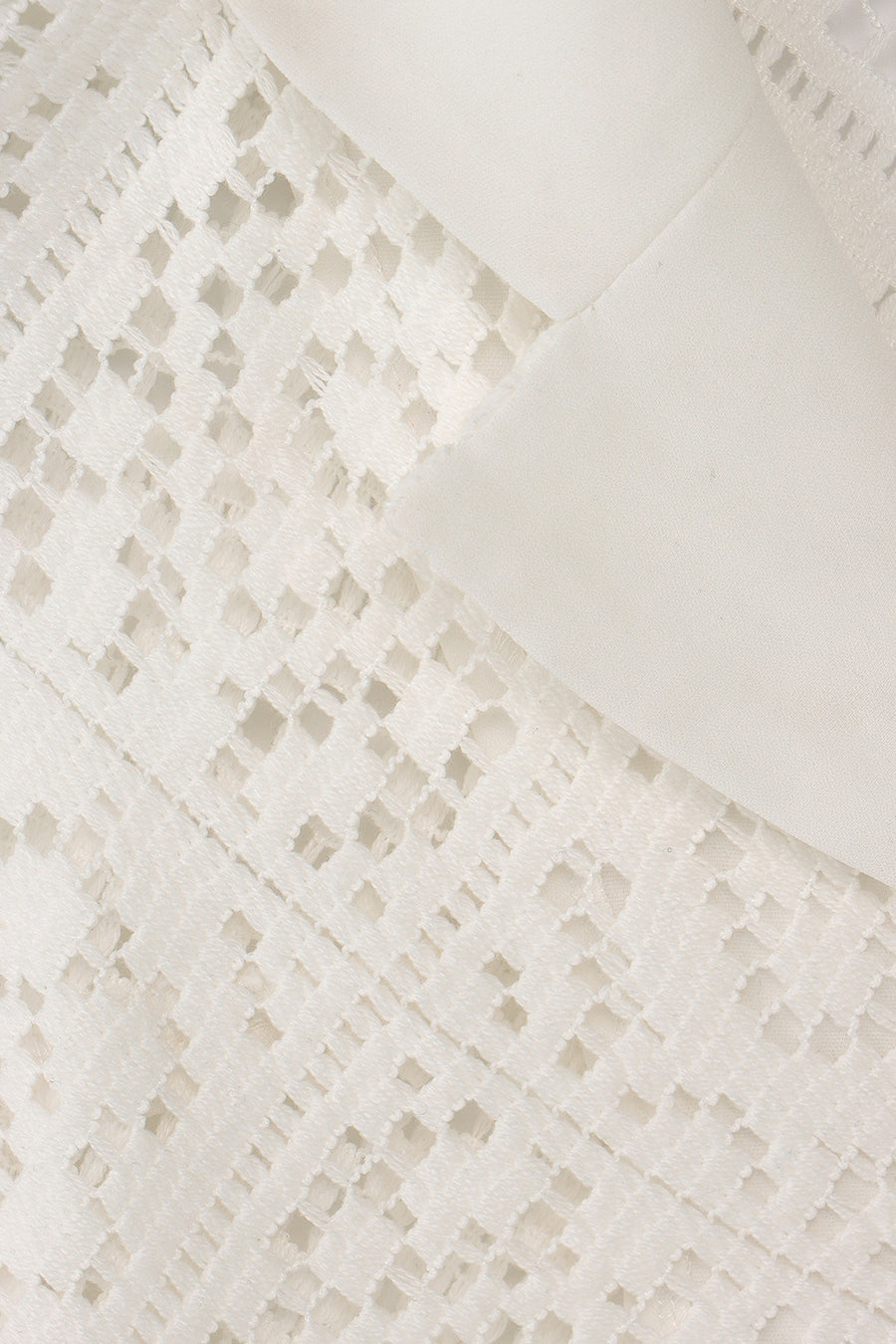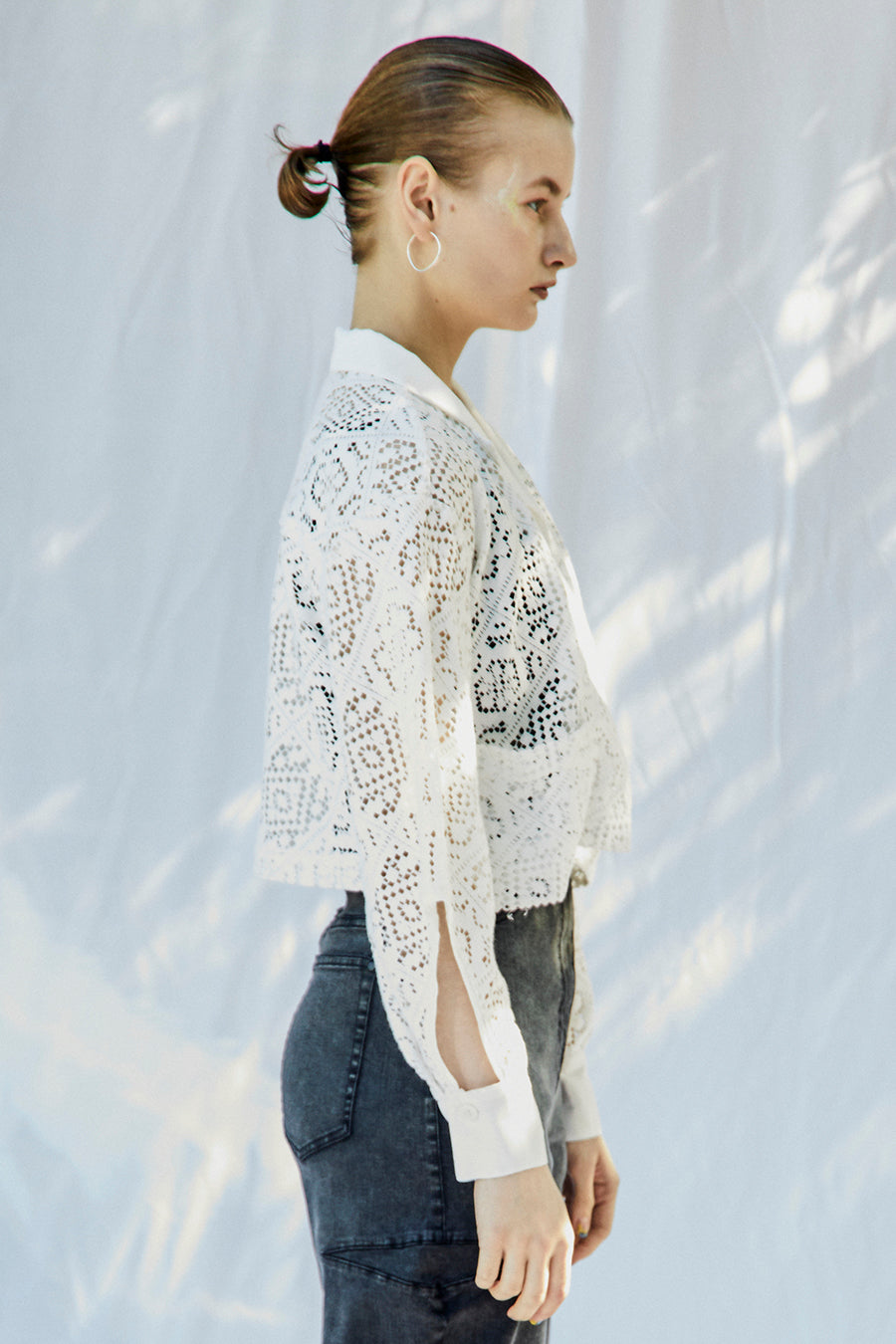幾何学柄がスクエア状になっている透け感のあるレースを使用した春夏らしい涼し気なシャツ。