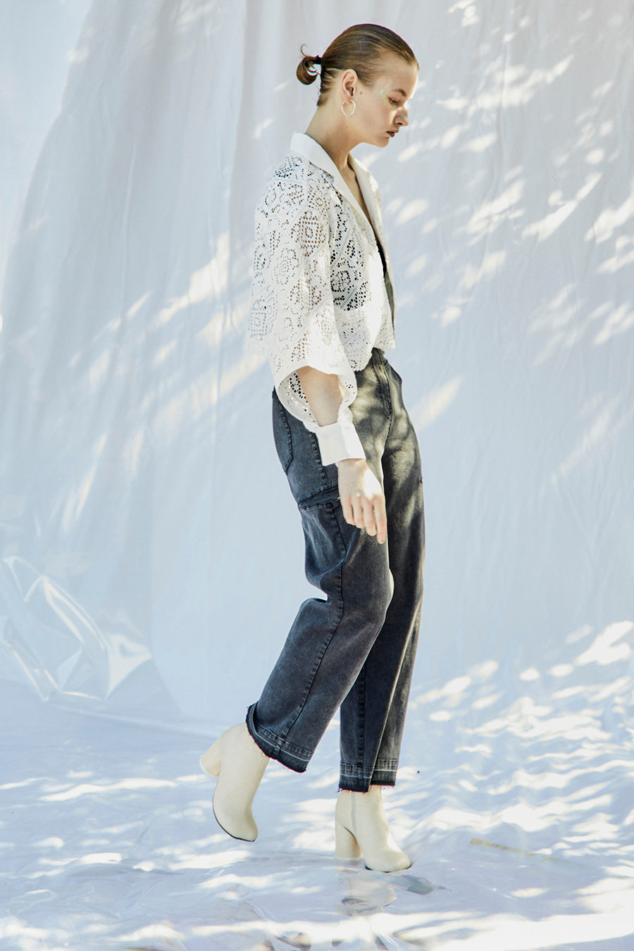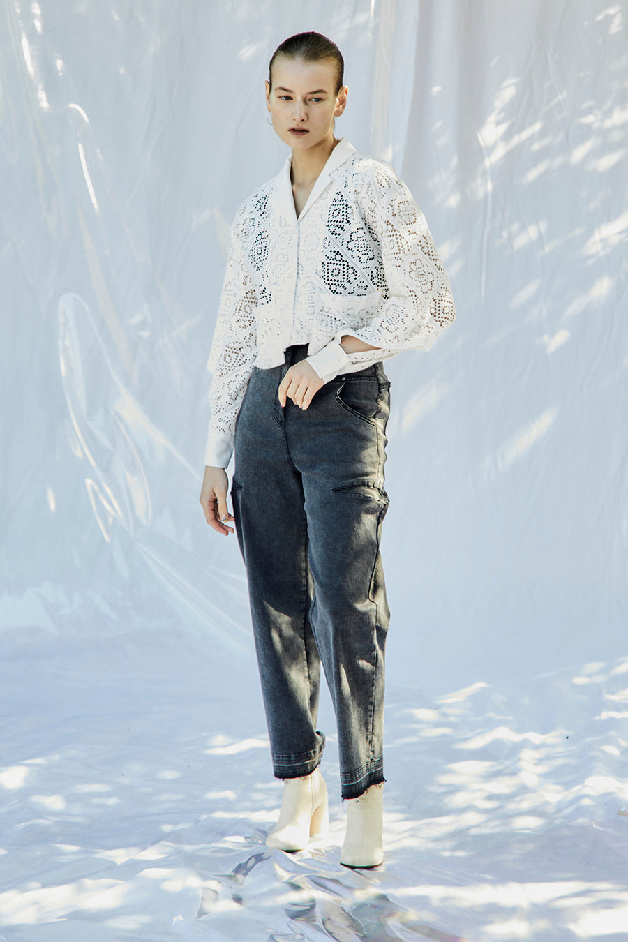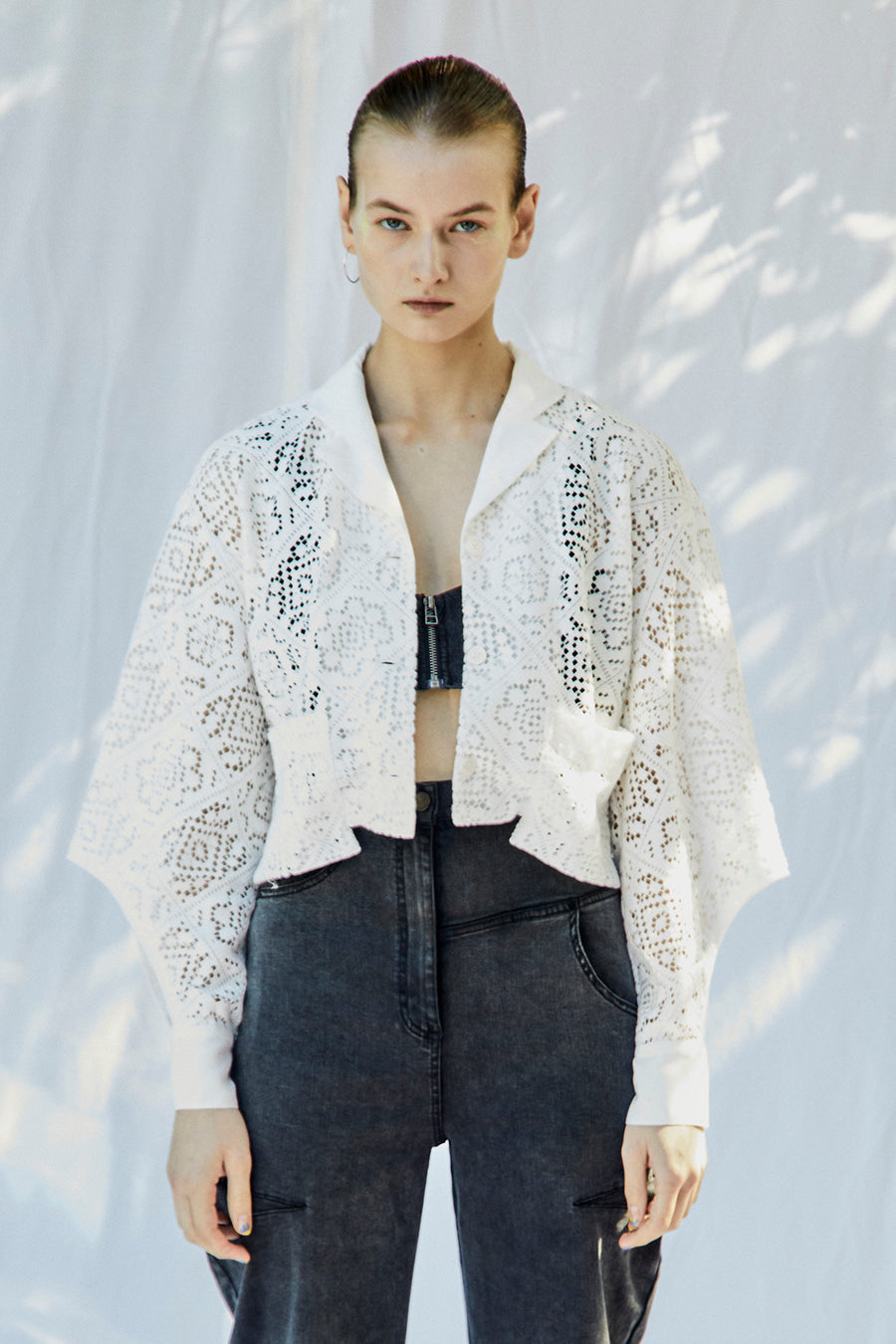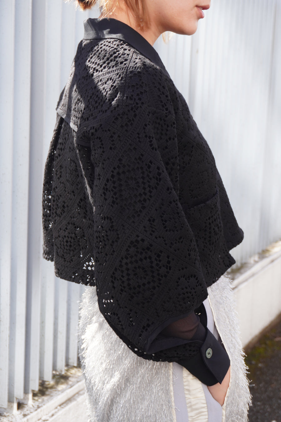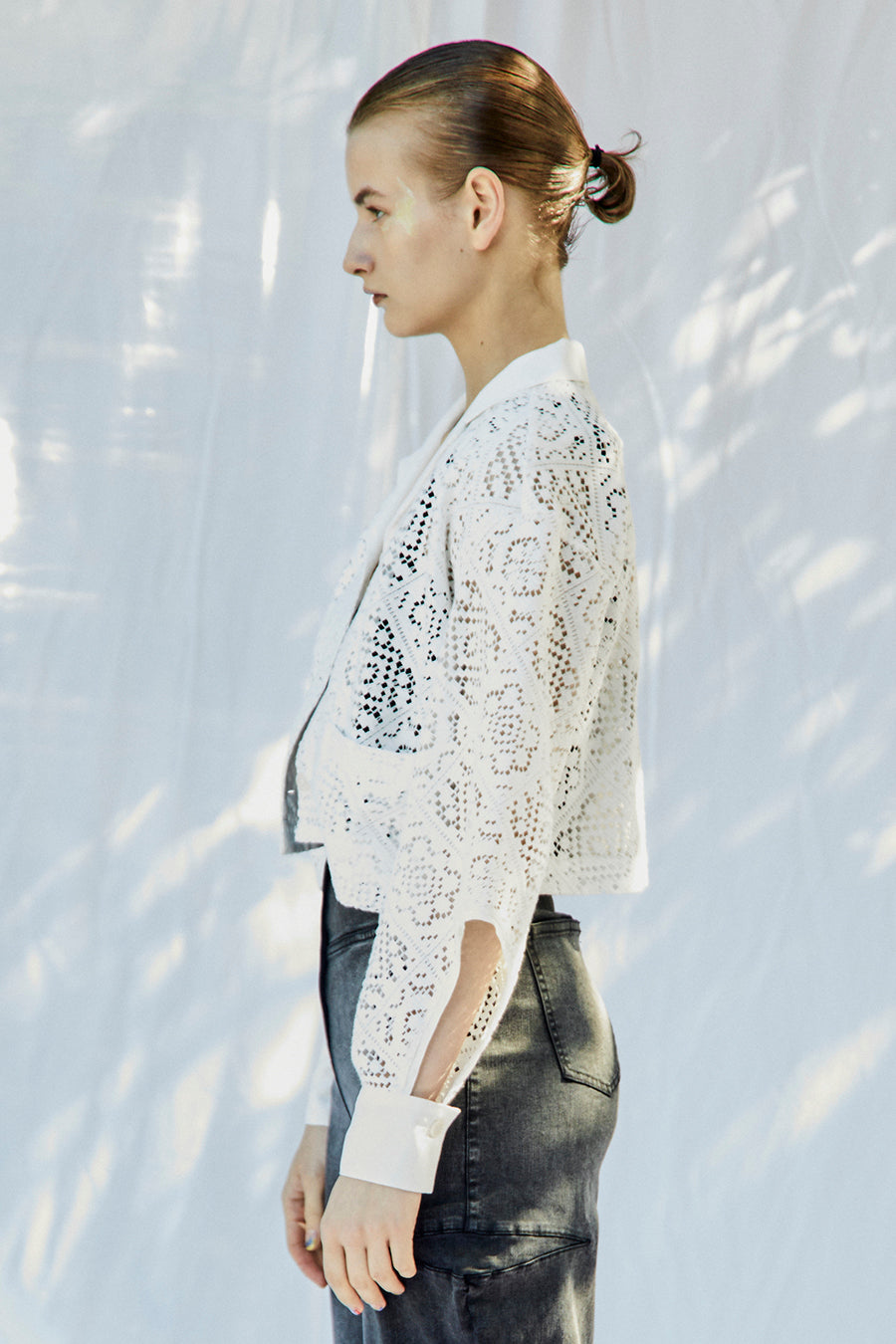 幾何学柄がスクエア状になっている透け感のあるレースを使用した春夏らしい涼し気なシャツ。